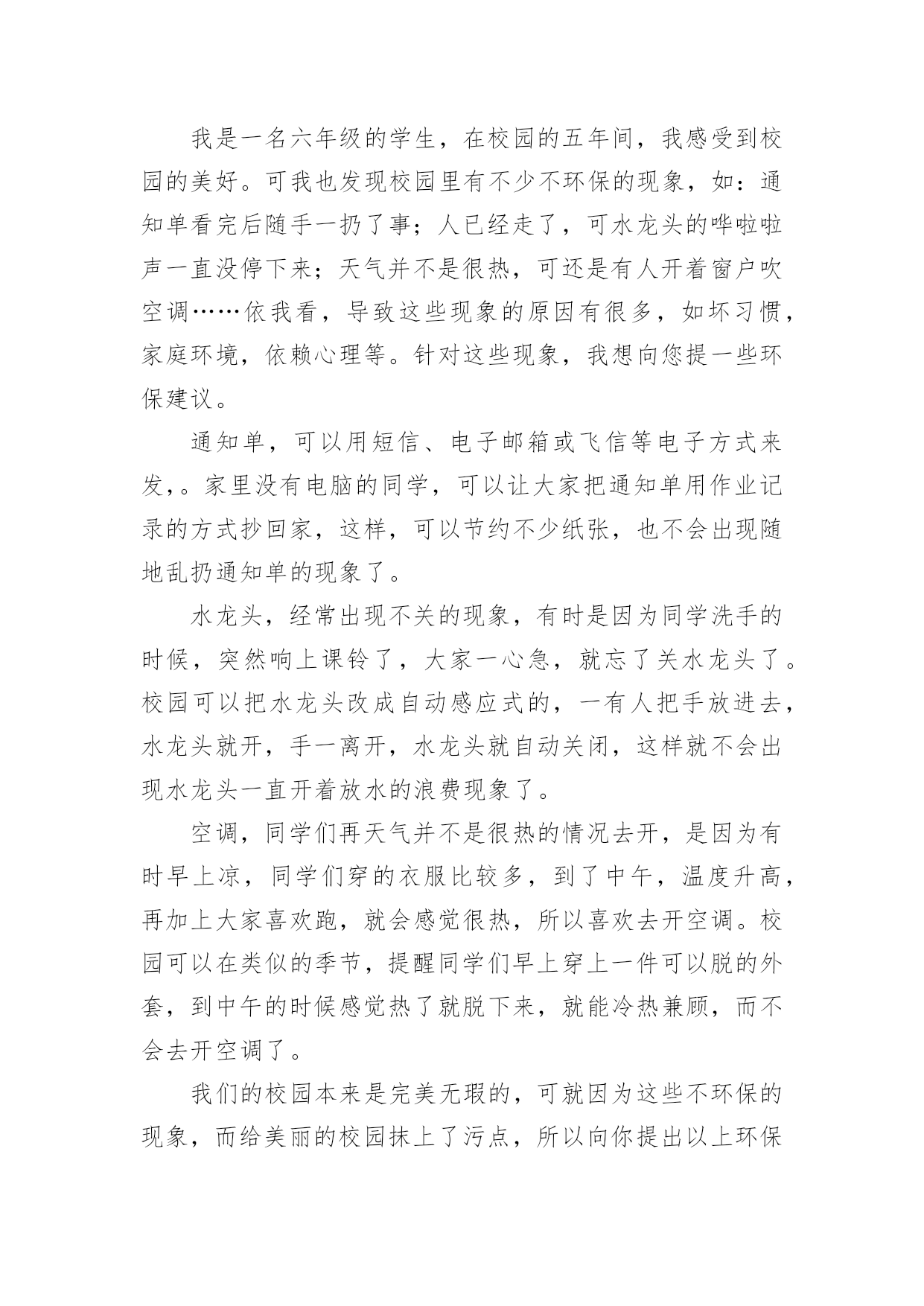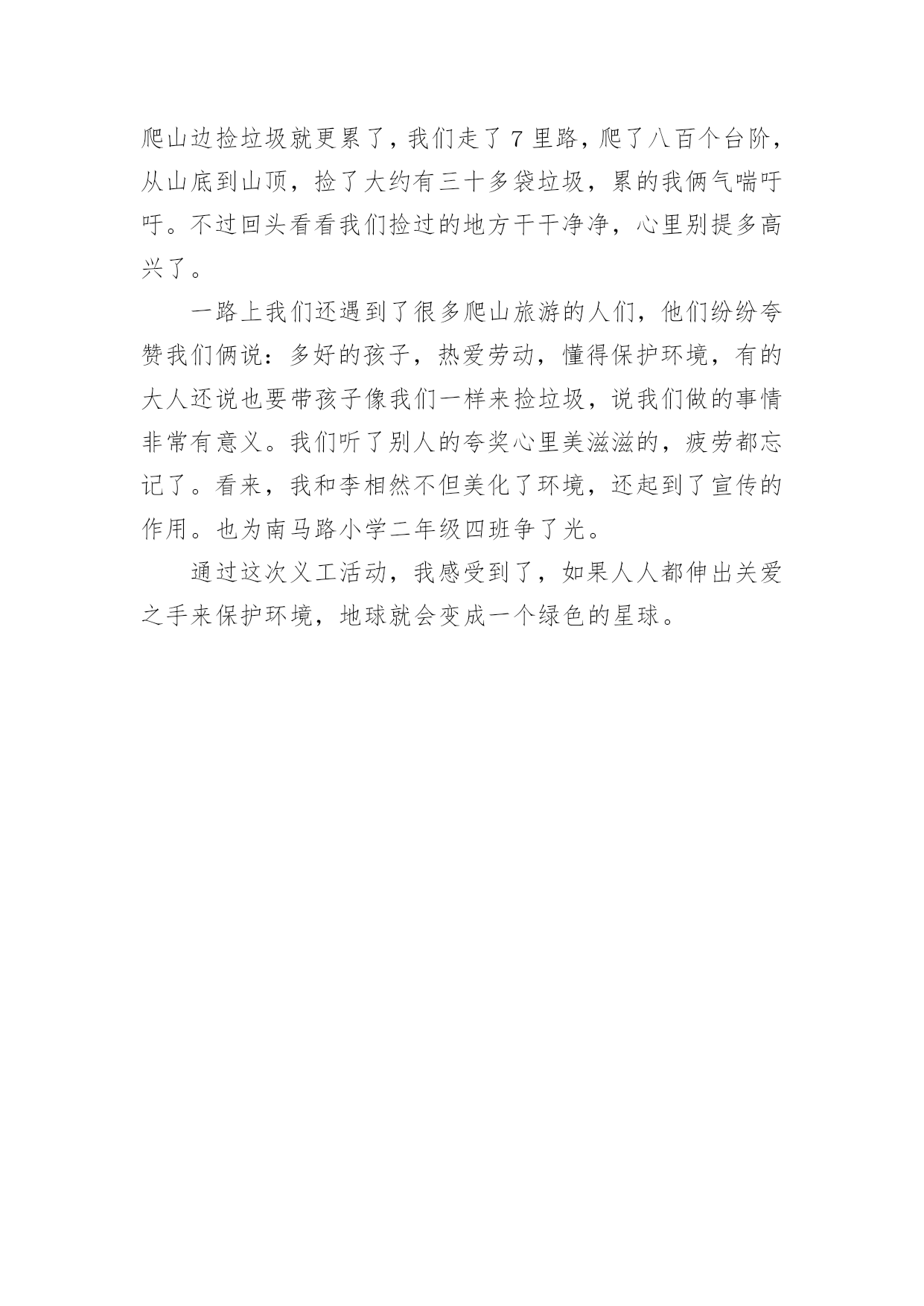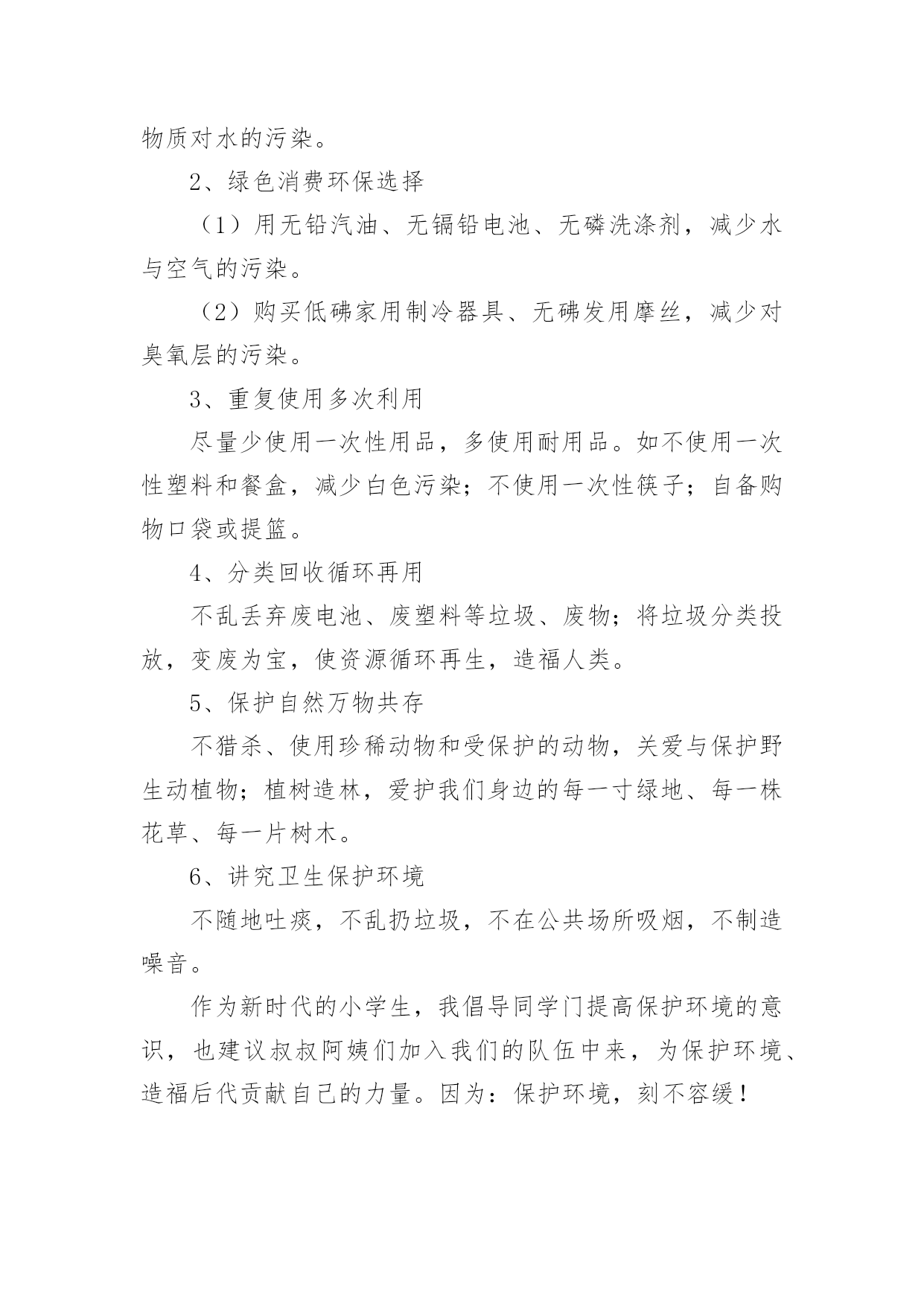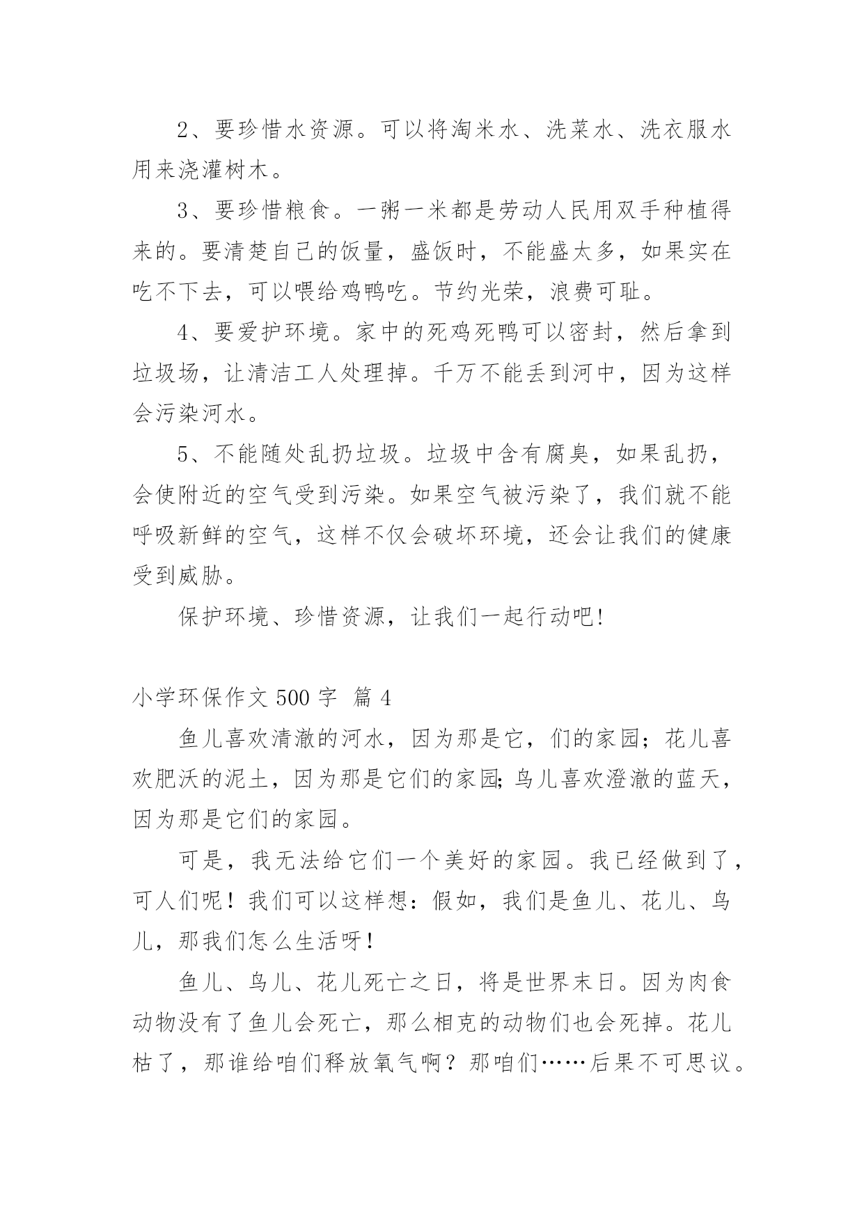 小学环保作文500字小学环保作文500字锦集七篇在日常学习、工作和生活中,许多人都写过作文吧,作文一定要做到主题集中,围绕同一主题作深入阐述,切忌东拉西扯,主题涣散甚至无主题。那么,怎么去写作文呢?以下是小编为大家整理的小学环保作文500字7篇,仅供参考,大家一起来看看吧。小学环保作文500字篇1举一个例子:我国的木兰溪,在50年代初本是一个清澈见底的河流,但现在它已是鱼虾绝迹的污河,又为我们的地球母亲添多一道疤痕。这,不是给人类重重地敲响了警钟吗?由此,我郑重地向仍未觉悟的人们建议:第一,人类要想征服可怕的大自然,就必须尊重自然。对于改造自然理应慎之又慎,又要大刀阔斧,勇于实践和改良,才能控制自然,使自身利益与自然协调发展,决不能重蹈西方发达国家“先污染,后治理”的覆辙。第二,要从我做起,首先选择有利于保护环境的生活方式。善待我们的家园、善待地球,共创一个美好的生活环境。1、节约资源减少污染(1)节水为荣,随时关上水龙头,防止滴漏。(2)慎用清洁剂,尽量用肥皂,减少洗涤剂中的化学物质对水的污染。2、绿色消费环保选择(1)用无铅汽油、无镉铅电池、无磷洗涤剂,减少水与空气的污染。(2)购买低砩家用制冷器具、无砩发用摩丝,减少对臭氧层的污染。3、重复使用多次利用尽量少使用一次性用品,多使用耐用品。如不使用一次性塑料和餐盒,减少白色污染;不使用一次性筷子;自备购物口袋或提篮。4、分类回收循环再用不乱丢弃废电池、废塑料等垃圾、废物;将垃圾分类投放,变废为宝,使资源循环再生,造福人类。5、保护自然万物共存不猎杀、使用珍稀动物和受保护的动物,关爱与保护野生动植物;植树造林,爱护我们身边的每一寸绿地、每一株花草、每一片树木。6、讲究卫生保护环境不随地吐痰,不乱扔垃圾,不在公共场所吸烟,不制造噪音。作为新时代的小学生,我倡导同学门提高保护环境的意识,也建议叔叔阿姨们加入我们的队伍中来,为保护环境、造福后代贡献自己的力量。因为:保护环境,刻不容缓!小学环保作文500字篇2地球是人类的母亲,是我们赖以生存的家园。随着生活水平的提高,人类在享受的同时,却在不知不觉中破坏着她,我们的生存环境在不断恶化。我们的地球怎么了?到底是什么原因造成了如此巨大的环境灾难?经过科学家的研究,这些都是人们对大自然的污染和破坏而造成的严重后果,人类对地球贪婪的索取是环境恶化的罪魁祸首。人们的环保意识不是很强,大量的化工企业的引进的废气偷偷排放,垃圾的乱扔乱丢,水资源的浪费等等,直接破坏着人类的生存环境,很难想象,这样下去,我们的地球会变成什么样!我们经常在商场购物时,人们手中提着大包小包的塑料袋。塑料袋焚烧会造成毒气,填埋不容易分解,还会导致土壤被破坏。中国人这么多,可想而知会有多少塑料袋难以处理?在饭店吃饭时,人们经常使用一次性的木筷。它会消耗大量的树木,据说,中国人一年大约要“吃掉”2500万棵大树。种种情况,使人触目惊心啊!那我们为什么就不去做一些既能节能、又能环保的事呢?我们可以把工厂里排放出的废气收集起来,进行一定的加工处理后,把它变成煤气、液化气……再次的利用它。这样,既节约了能源,有污染不到环境。节能、环保,刻不容缓!从我做起,从点点滴滴做起。我们应当少开私家车,少用塑料袋,不乱扔废电池,不用一次性木筷……单个人的环保行动就像一盏灯,当它亮起时,周围的黑暗就会少一些。如果大家都点亮自己那盏灯,整个世界将会一片光明。为了地球的明天,为了人类的未来,让我们行动起来吧!保护环境人人有责,让祖国大地遍是绿水青山!小学环保作文500字篇3各位村民:你们好!我是仙荣小学六年级的一名学生。当前,我们村存在着很多浪费资源、破坏环境的不良现象:人们大量砍伐树木,将树木运送出去,换来了金钱的同时,你们有没有意识到砍伐树木的后果,到时候,受罪的可是我们啊。现在改革开放了,人们生活富裕了,就开始浪费水资源。人们将淘米水、洗菜水直接倒入水沟,完全没有环保意识。要知道,水也是得之不易的。俗话说得好“水是根,饭是命。”可还是有人不珍惜粮食,经常把吃不下的米饭或其它食物倒掉。现在家家户户都养上了鸡鸭猪,特别是鸡鸭,当鸡鸭死了之后,人们就把它丢入河中,完全没有想到后果,到时候喝水被污染,空气被污染,遭殃的可是我们啊!人们的生活条件好了,垃圾也就多了。有一些人不讲文明,将垃圾倒入河中,或把垃圾放在草丛中。因此,我提出了一些建议,希望你们能采纳我的意见:1、要少砍伐树木,将树木砍伐下来后,还要种植树。这样既不破坏森林,又绿化了环境。2、要珍惜水资源。可以将淘米水、洗菜水、洗衣服水用来浇灌树木。3、要珍惜粮食。一粥一米都是劳动人民用双手种植得来的。要清楚自己的饭量,盛饭时,不能盛太多,如果实在吃不下去,可以喂给鸡鸭吃。节约光荣,浪费可耻。4、要爱护环境。家中的死鸡死鸭可以密封,然后拿到垃圾