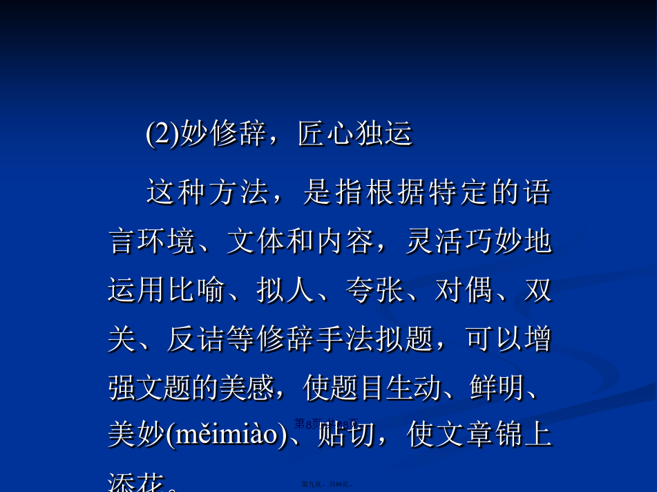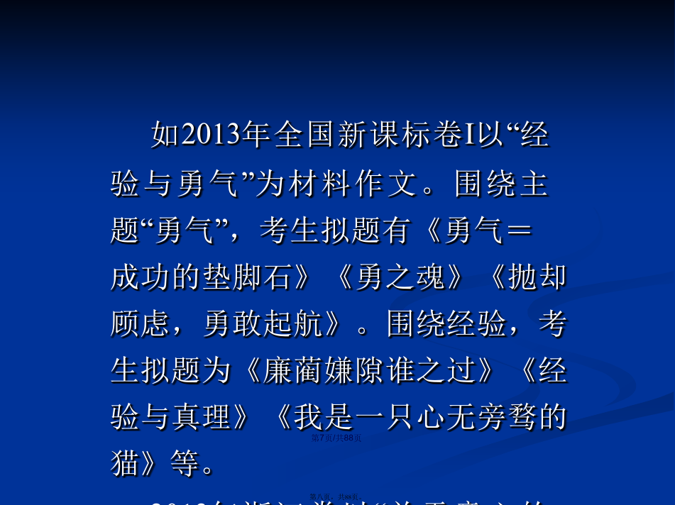 会计学一双眼睛顾盼生辉,人就显得精神俊秀,如果双目无神,人自然就萎靡不振了,作文也是如此,所以有“题好一半文”之说。高考作文由于阅卷的时间有限,对于题目的要求就更高,靓丽夺目的标题既能为作者行文提供一个明确(míngquè)的中心点,又能扣住读者心弦,起到眉目传情的作用。如果我们能熟悉和掌握一定的拟题要求和方法,让作文标题闪出第一道亮点,就等于给自己的作文上了一道“保险”。1.拟题原则(1)用语新奇,亮出文采,给人耳目一新之感。(2)着意铺排,强化主旨,使文题生动、活泼、形象。(3)文题要有浓厚的文学色彩,能给人以广阔的想象(xiǎngxiàng)空间,营造出悠远而抒情的意境,引人遐思。(4)要尽量拟出自己的个性特点,有个性的文题可以使人文思泉涌。避免误区1.表意不明如雾里看花。2.题目太大,不便驾驭。3.脱离话题,另起炉灶。4.俗不可耐,了无新意。5.千人一面(qiānrényīmiàn),千篇一题。6.冗长繁杂,没有个性,缺乏文采。2.标题类型(1)话题型如以“生活”为话题,就直接套用话题为《关于生活》《幸福生活》;以“同桌”为话题,就拟题为《同桌的故事》《我的同桌》。这些题目一般(yībān)不能体现考生的创造才能,只能说聊胜于无。(2)观点型如以“位置”为话题,就拟题为《有为才有位》;以“合作”为话题,就拟题为《合作才能双赢》等。直接表明作者的观点态度、见解主张等,能够起到提纲挈领的作用。(3)文采型我们应该鼓励学生在观点型题目的基础上,运用必要的修辞手段,如《乘着音乐的翅膀》《世界很小是个家》《成功之花只对挑战者绽放》《路是月的痕》等,使题目真正做到不同凡响,一见难忘。3.拟题方法怎样才能迅速拟出简洁、醒目、新颖、有文采的标题呢?其实,只要(zhǐyào)我们留心一下众多流光溢彩的考场佳作,就不难发现其中的奥秘。(1)善补题,以小见大无论是新材料作文还是话题作文,都要求考生不脱离所给话题或材料命题,也就是对写作范围作了限制,所以标题必须切合材料或话题的内涵,不能偏离所给的材料或话题。因此,在拟题时要遵循“小角度、具体(jùtǐ)化、易表达”的原则。在操作上,就是在所给话题或材料后面加上适当的词语进行增补,对写作范围加以限制,能使话题由大变小、由虚变实、由抽象变具体(jùtǐ),这样既能让人一目了然,也是最简洁方便的拟题方法。如2013年全国新课标卷I以“经验与勇气”为材料作文。围绕主题“勇气”,考生拟题有《勇气=成功的垫脚石》《勇之魂》《抛却顾虑,勇敢起航》。围绕经验,考生拟题为《廉蔺嫌隙谁之过》《经验与真理》《我是一只心无旁骛的猫》等。2013年浙江卷以“关于童心的三句话”为材料作文。考生拟题有:《落在地上的太阳(tàiyáng)》《寻找丢失的童真》《城堡》。2013年全国大纲卷以“同学间的人际关系”为材料作文,考生拟题为:《心宽天自宽》《同窗相煎何太急》《把爱传下去》等。从这些题目中,我们可以大致了解到考生对材料的审题立意方向和行文思路。(2)妙修辞,匠心独运这种方法,是指根据特定的语言环境、文体和内容,灵活巧妙地运用比喻、拟人、夸张、对偶、双关、反诘等修辞手法拟题,可以增强文题的美感,使题目生动、鲜明、美妙(měimiào)、贴切,使文章锦上添花。从2013年的高考满分作文中,挑选了以下运用修辞的标题供大家参考:比喻:《断线的风筝》《点燃童心之灯》拟人:《转过身,拥抱错误》对比:《缩小自己,放大他人》《人类的幸福和自身的完美》《猛虎与蔷薇》《做流星还是做树根》《平凡与伟大》(3)巧点化,妙趣横生这种方法是指引用或化用大家(dàjiā)所熟悉的诗词、歌词、名言、书名、影视名、广告词等作为文题。如《阿Q新传》《不畏浮云遮望眼》《失落的祝英台》《痛并快乐着》《一千零二夜》《赏你千遍总不厌》《借我一双慧眼》。这种方法,可以使文章标题显得新颖别致,妙趣横生,产生独特的魅力。2013年高考满分作文中也有一些运用此法的标题值得大家(dàjiā)参考借鉴:《让美丽独自绽放》《没有人是一座孤岛》(江苏卷)《犹有画船听雨眠》《浓妆淡抹总相宜》(四川卷)《任尔东西南北风》《上善若水》(湖北卷)《人非圣贤,孰能无过》(山东卷)《为有源头活水来》(江西(jiānɡxī)卷)《行而知之》(天津卷)(4)设悬念,矛盾生疑悬念就是疑团,文学上称之为“卖关子”,其效果就是让人虚惊一场,产生一种勾魂摄魄、欲罢不能的感染力,拟题时可以充分利用、挖掘生活语言,利用相似词语的颠倒、谐音、形近等特点产生独特的魅力,使标题靓丽起来。如《打假与假打》《秋天里的春天》《向钱看与向前看》《给心灵松绑》。问句入题常常可以收到其他句式难以达到的效果。如:“哥,是捡来的吗?”(2003年全国卷)、“