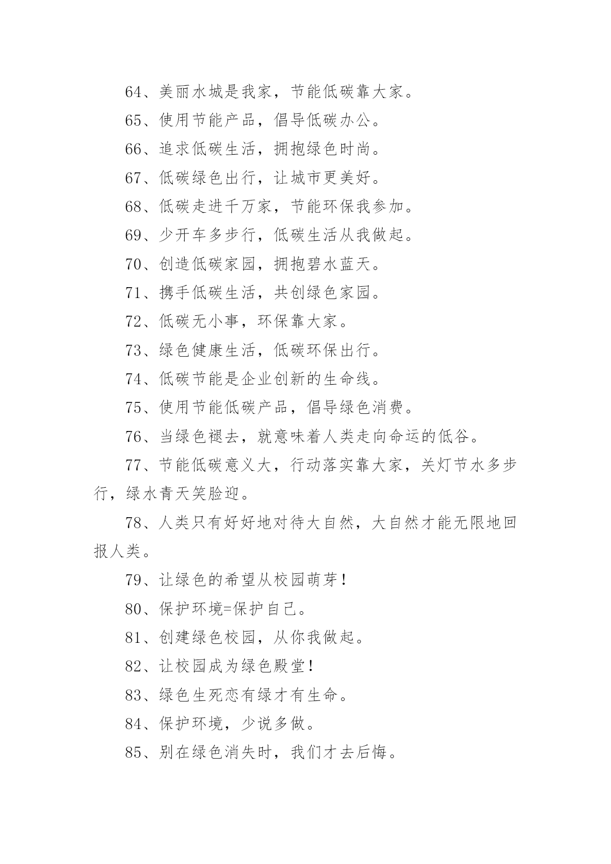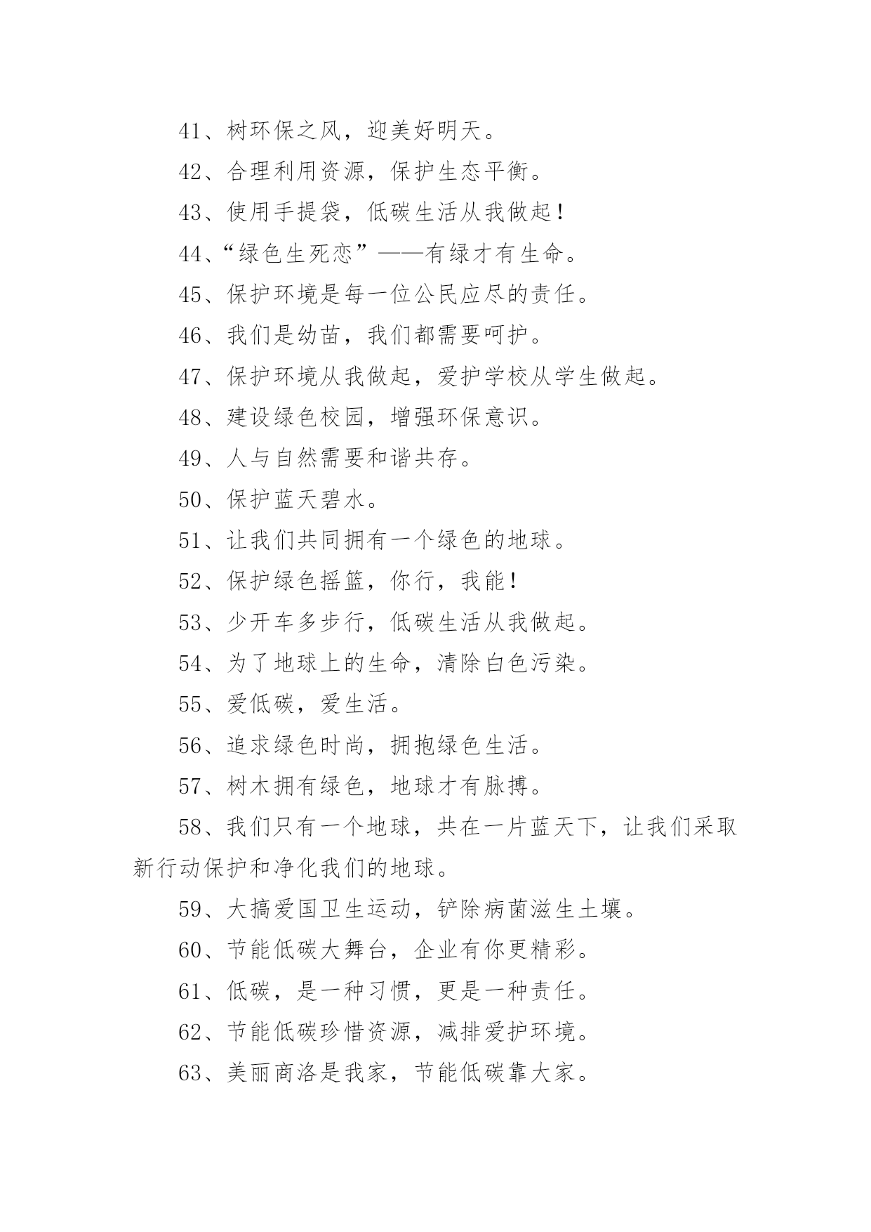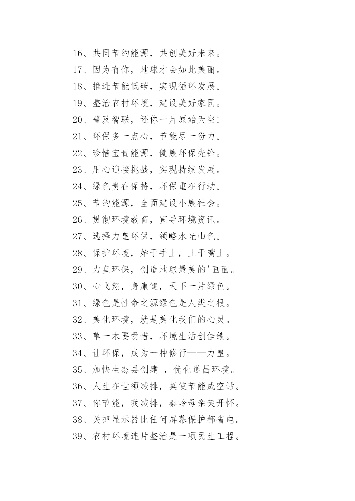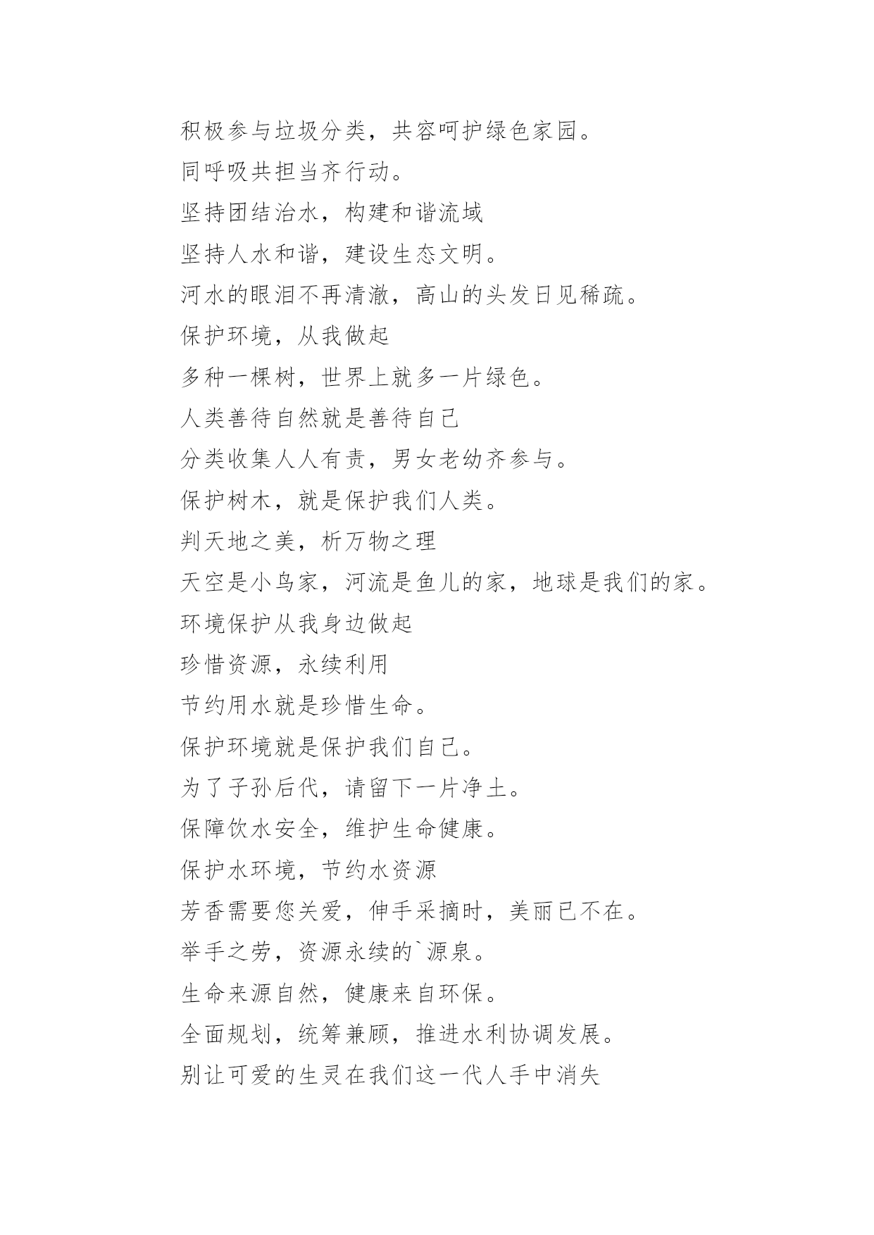 环保宣传标语环保宣传标语必备[15篇]在平平淡淡的日常中,许多人都接触过一些比较经典的标语吧,标语是一种最经济、最有效的宣传、鼓动口号。什么样的标语才经典呢?以下是小编为大家收集的环保宣传标语,欢迎大家分享。环保宣传标语11、绿色消费,健康人生。2、低碳让地球,解脱苦难。3、保护环境比吃饭更重要。4、力皇,让地球容颜焕发。5、没有节约,就没有未来。6、清洁生产是企业的性命。7、为世界节能,让财富共享。8、保护环境就是选择了宁静。9、做文明学子,倡低碳之风。10、只可自怡悦,不堪持寄君。11、少一个脚印,多一片绿色。12、爱护环境就是传递正能量。13、节能大作战,等你来挑战。14、全民动员,共建节约型社会。15、倡导绿色消费,共建美好家园。16、共同节约能源,共创美好未来。17、因为有你,地球才会如此美丽。18、推进节能低碳,实现循环发展。19、整治农村环境,建设美好家园。20、普及智联,还你一片原始天空!21、环保多一点心,节能尽一份力。22、珍惜宝贵能源,健康环保先锋。23、用心迎接挑战,实现持续发展。24、绿色贵在保持,环保重在行动。25、节约能源,全面建设小康社会。26、贯彻环境教育,宣导环境资讯。27、选择力皇环保,领略水光山色。28、保护环境,始于手上,止于嘴上。29、力皇环保,创造地球最美的'画面。30、心飞翔,身康健,天下一片绿色。31、绿色是性命之源绿色是人类之根。32、美化环境,就是美化我们的心灵。33、草一木要爱惜,环境生活创佳绩。34、让环保,成为一种修行——力皇。35、加快生态县创建,优化遂昌环境。36、人生在世须减排,莫使节能成空话。37、你节能,我减排,秦岭母亲笑开怀。38、关掉显示器比任何屏幕保护都省电。39、农村环境连片整治是一项民生工程。40、地球村庄是我家,节能减排靠大家。41、引领环保新时尚,创造自由新生活。42、心随环境而变,为你打造心的空间。43、排放废水少一刻,小鱼欢乐多一刻。44、树木拥有了绿色,地球才能有脉搏。45、环保与健康常在,财富与自由共享。46、环保创造自由财富,主导健康生活。47、男女老少齐动员,保护绿色好家园。48、绿色发展手牵手,生态富民心连心。49、美丽校园靓如家,节能低碳我爱她。50、节能低碳大舞台,企业有你更精彩。51、连片整治大发展,农村环境大改善。52、多走路,少坐车,加强锻炼,身体棒!53、争当节能减排卫士,乐做低碳环保先锋。54、人人争当节能标兵,户户争做节约家庭。55、人人参与节能减排,个个都是城市形象。56、节能减排人人关注,珍惜资源家家受益。57、做良心企业,为您的完美生活的保驾护航!58、给你"更环保、更健康、更成功"的'选择。59、低碳生活,你我做起;节能减排,成就未来。60、实实在在做环保人士,轻轻松松享财富自由。环保宣传标语21、做节约能源资源表率,建节约型机关2、清爽地球靠大家,低碳走进你我他3、低碳,一定要低碳4、节省水电讲环保,低碳生活我来造5、不要让绿色从身边消失6、少坐汽车多行走,低碳健康我拥有7、节能低碳珍惜资源,减排爱护环境8、享受低碳生活,不再被OUT、9、低碳生活,从我做起10、节能低碳,科学发展11、使用节能低碳产品,倡导绿色消费12、低碳走进千万家,节能环保我参加13、低碳让地球解脱苦难14、绿色生活,从节约每一滴水,每一度电开始15、节能低碳从现在做起,从我做起,从点滴做起16、温室效应我不要,低碳生活我拥抱17、推进绿色办公,促进资源节约18、加大节能低碳低碳力度,迎接绿色世博会19、推广节水型用水器具和设备,提高用水效益环保宣传标语3清澈的河水是动物们的镜子,不要让河水再次污浊不清。坚定信心,狠抓源头,重拳出击,坚决打好大气污染治理攻坚战。草儿青,花儿红,请您不要伤害它!人人为环保,环保为人人尊天重地,敬天爱人积极参与垃圾分类,共容呵护绿色家园。同呼吸共担当齐行动。坚持团结治水,构建和谐流域坚持人水和谐,建设生态文明。河水的眼泪不再清澈,高山的头发日见稀疏。保护环境,从我做起多种一棵树,世界上就多一片绿色。人类善待自然就是善待自己分类收集人人有责,男女老幼齐参与。保护树木,就是保护我们人类。判天地之美,析万物之理天空是小鸟家,河流是鱼儿的家,地球是我们的家。环境保护从我身边做起珍惜资源,永续利用节约用水就是珍惜生命。保护环境就是保护我们自己。为了子孙后代,请留下一片净土。保障饮水安全,维护生命健康。保护水环境,节约水资源芳香需要您关爱,伸手采摘时,美丽已不在。举手之劳,资源永续的`源泉。生命来源自然,健康来自环保。全面规划,统筹兼顾,推进水利协调发展。别让可爱的生灵在我们这一代人手中消失保护绿地标语:不要踩我啊。我也会疼的……为了我们自己,也为了我们后代,请保护环境。不要旁观,请加入行动者的行列。环保宣传标