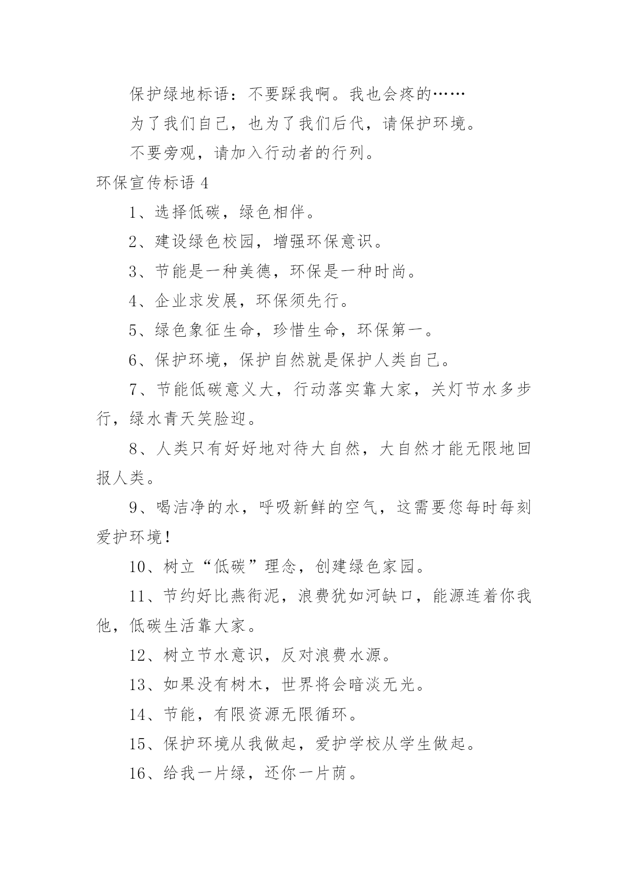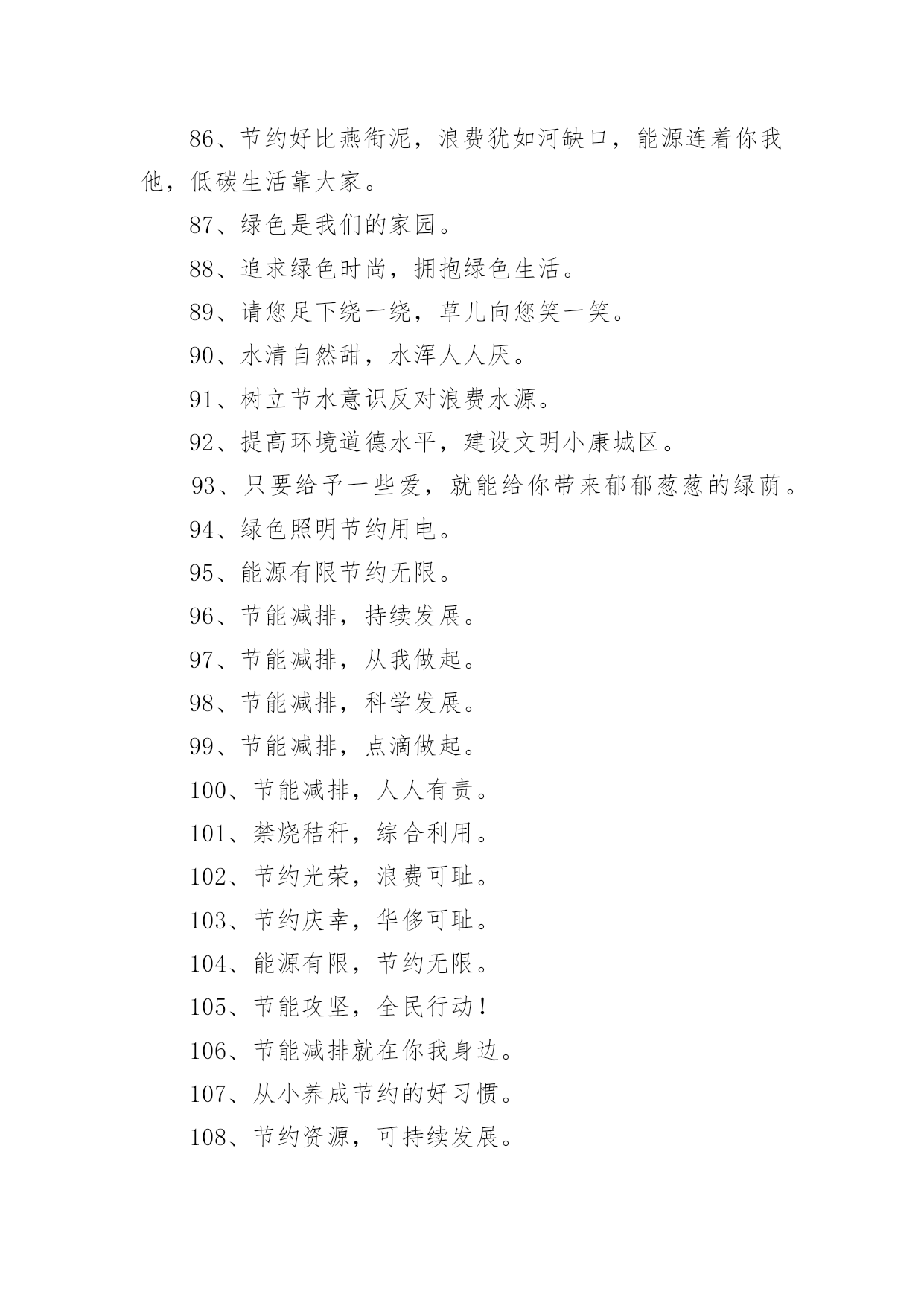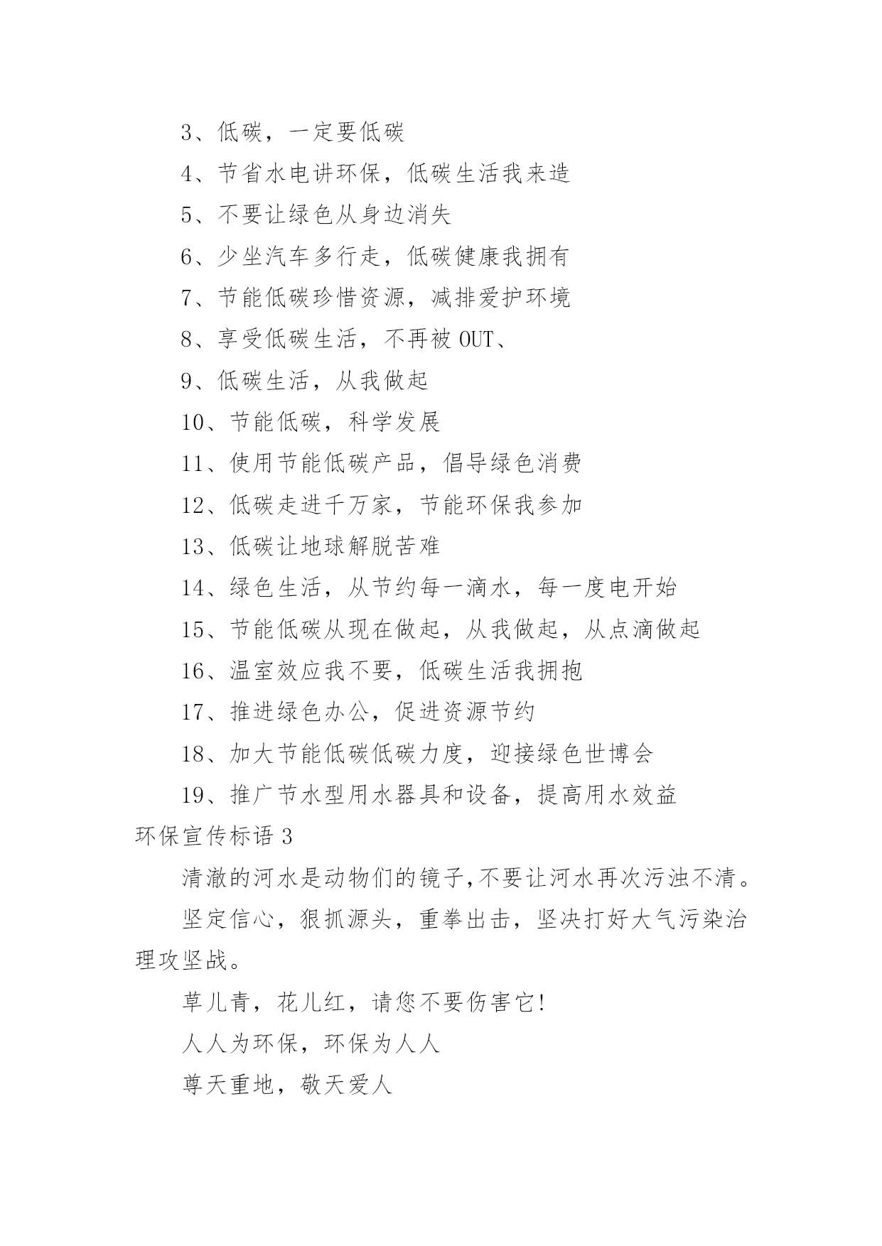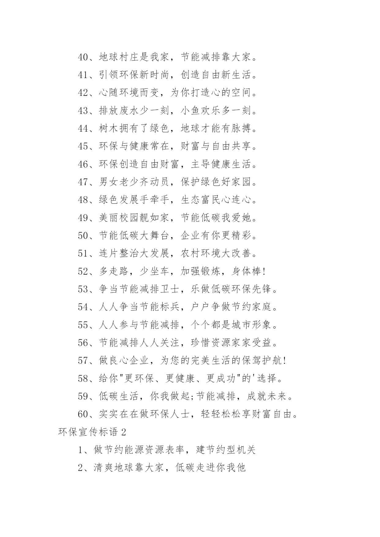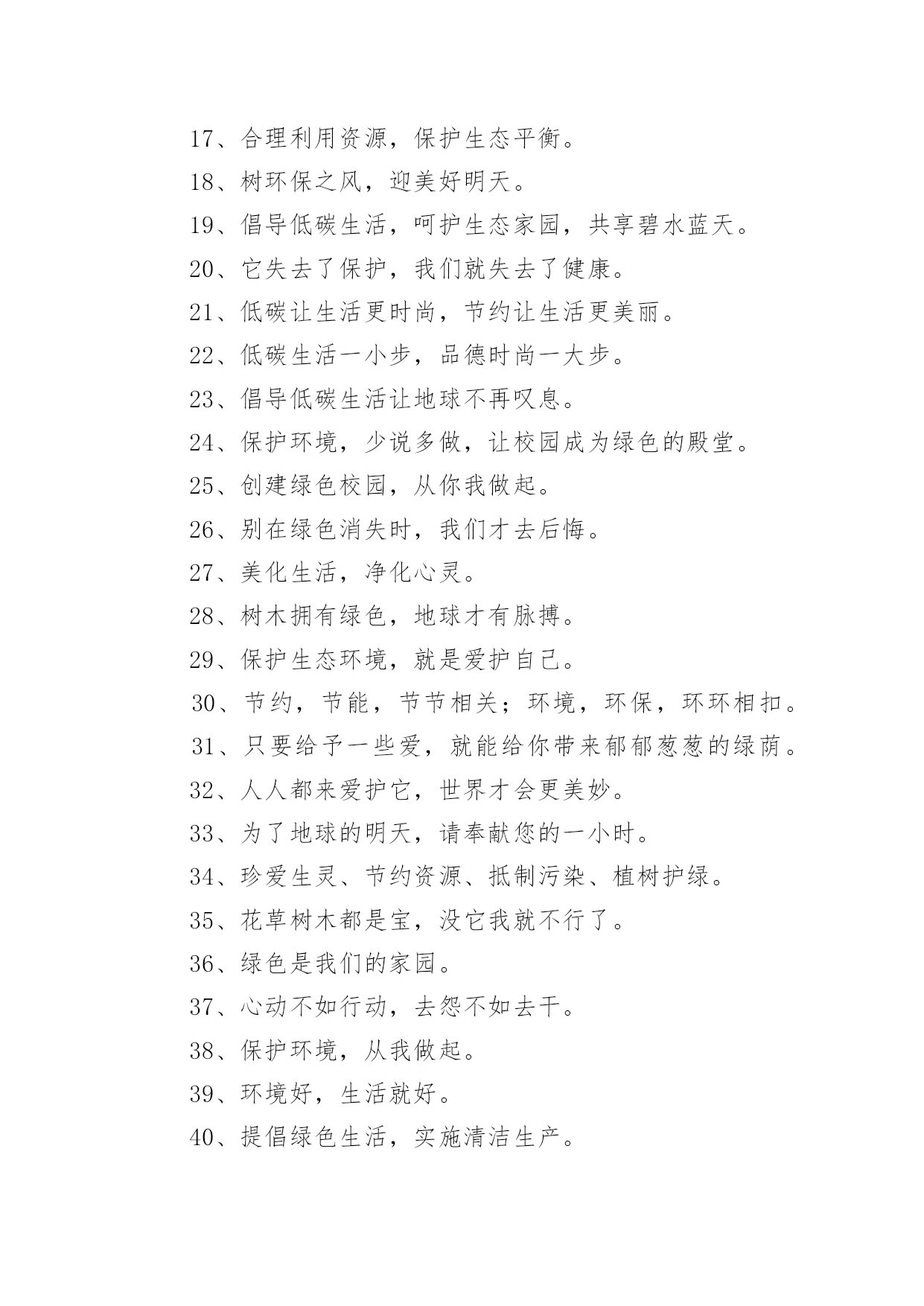 环保宣传标语环保宣传标语必备[15篇]在平平淡淡的日常中,许多人都接触过一些比较经典的标语吧,标语是一种最经济、最有效的宣传、鼓动口号。什么样的标语才经典呢?以下是小编为大家收集的环保宣传标语,欢迎大家分享。环保宣传标语11、绿色消费,健康人生。2、低碳让地球,解脱苦难。3、保护环境比吃饭更重要。4、力皇,让地球容颜焕发。5、没有节约,就没有未来。6、清洁生产是企业的性命。7、为世界节能,让财富共享。8、保护环境就是选择了宁静。9、做文明学子,倡低碳之风。10、只可自怡悦,不堪持寄君。11、少一个脚印,多一片绿色。12、爱护环境就是传递正能量。13、节能大作战,等你来挑战。14、全民动员,共建节约型社会。15、倡导绿色消费,共建美好家园。16、共同节约能源,共创美好未来。17、因为有你,地球才会如此美丽。18、推进节能低碳,实现循环发展。19、整治农村环境,建设美好家园。20、普及智联,还你一片原始天空!21、环保多一点心,节能尽一份力。22、珍惜宝贵能源,健康环保先锋。23、用心迎接挑战,实现持续发展。24、绿色贵在保持,环保重在行动。25、节约能源,全面建设小康社会。26、贯彻环境教育,宣导环境资讯。27、选择力皇环保,领略水光山色。28、保护环境,始于手上,止于嘴上。29、力皇环保,创造地球最美的'画面。30、心飞翔,身康健,天下一片绿色。31、绿色是性命之源绿色是人类之根。32、美化环境,就是美化我们的心灵。33、草一木要爱惜,环境生活创佳绩。34、让环保,成为一种修行——力皇。35、加快生态县创建,优化遂昌环境。36、人生在世须减排,莫使节能成空话。37、你节能,我减排,秦岭母亲笑开怀。38、关掉显示器比任何屏幕保护都省电。39、农村环境连片整治是一项民生工程。40、地球村庄是我家,节能减排靠大家。41、引领环保新时尚,创造自由新生活。42、心随环境而变,为你打造心的空间。43、排放废水少一刻,小鱼欢乐多一刻。44、树木拥有了绿色,地球才能有脉搏。45、环保与健康常在,财富与自由共享。46、环保创造自由财富,主导健康生活。47、男女老少齐动员,保护绿色好家园。48、绿色发展手牵手,生态富民心连心。49、美丽校园靓如家,节能低碳我爱她。50、节能低碳大舞台,企业有你更精彩。51、连片整治大发展,农村环境大改善。52、多走路,少坐车,加强锻炼,身体棒!53、争当节能减排卫士,乐做低碳环保先锋。54、人人争当节能标兵,户户争做节约家庭。55、人人参与节能减排,个个都是城市形象。56、节能减排人人关注,珍惜资源家家受益。57、做良心企业,为您的完美生活的保驾护航!58、给你"更环保、更健康、更成功"的'选择。59、低碳生活,你我做起;节能减排,成就未来。60、实实在在做环保人士,轻轻松松享财富自由。环保宣传标语21、做节约能源资源表率,建节约型机关2、清爽地球靠大家,低碳走进你我他3、低碳,一定要低碳4、节省水电讲环保,低碳生活我来造5、不要让绿色从身边消失6、少坐汽车多行走,低碳健康我拥有7、节能低碳珍惜资源,减排爱护环境8、享受低碳生活,不再被OUT、9、低碳生活,从我做起10、节能低碳,科学发展11、使用节能低碳产品,倡导绿色消费12、低碳走进千万家,节能环保我参加13、低碳让地球解脱苦难14、绿色生活,从节约每一滴水,每一度电开始15、节能低碳从现在做起,从我做起,从点滴做起16、温室效应我不要,低碳生活我拥抱17、推进绿色办公,促进资源节约18、加大节能低碳低碳力度,迎接绿色世博会19、推广节水型用水器具和设备,提高用水效益环保宣传标语3清澈的河水是动物们的镜子,不要让河水再次污浊不清。坚定信心,狠抓源头,重拳出击,坚决打好大气污染治理攻坚战。草儿青,花儿红,请您不要伤害它!人人为环保,环保为人人尊天重地,敬天爱人积极参与垃圾分类,共容呵护绿色家园。同呼吸共担当齐行动。坚持团结治水,构建和谐流域坚持人水和谐,建设生态文明。河水的眼泪不再清澈,高山的头发日见稀疏。保护环境,从我做起多种一棵树,世界上就多一片绿色。人类善待自然就是善待自己分类收集人人有责,男女老幼齐参与。保护树木,就是保护我们人类。判天地之美,析万物之理天空是小鸟家,河流是鱼儿的家,地球是我们的家。环境保护从我身边做起珍惜资源,永续利用节约用水就是珍惜生命。保护环境就是保护我们自己。为了子孙后代,请留下一片净土。保障饮水安全,维护生命健康。保护水环境,节约水资源芳香需要您关爱,伸手采摘时,美丽已不在。举手之劳,资源永续的`源泉。生命来源自然,健康来自环保。全面规划,统筹兼顾,推进水利协调发展。别让可爱的生灵在我们这一代人手中消失保护绿地标语:不要踩我啊。我也会疼的……为了我们自己,也为了我们后代,请保护环境。不要旁观,请加入行动者的行列。环保宣传标