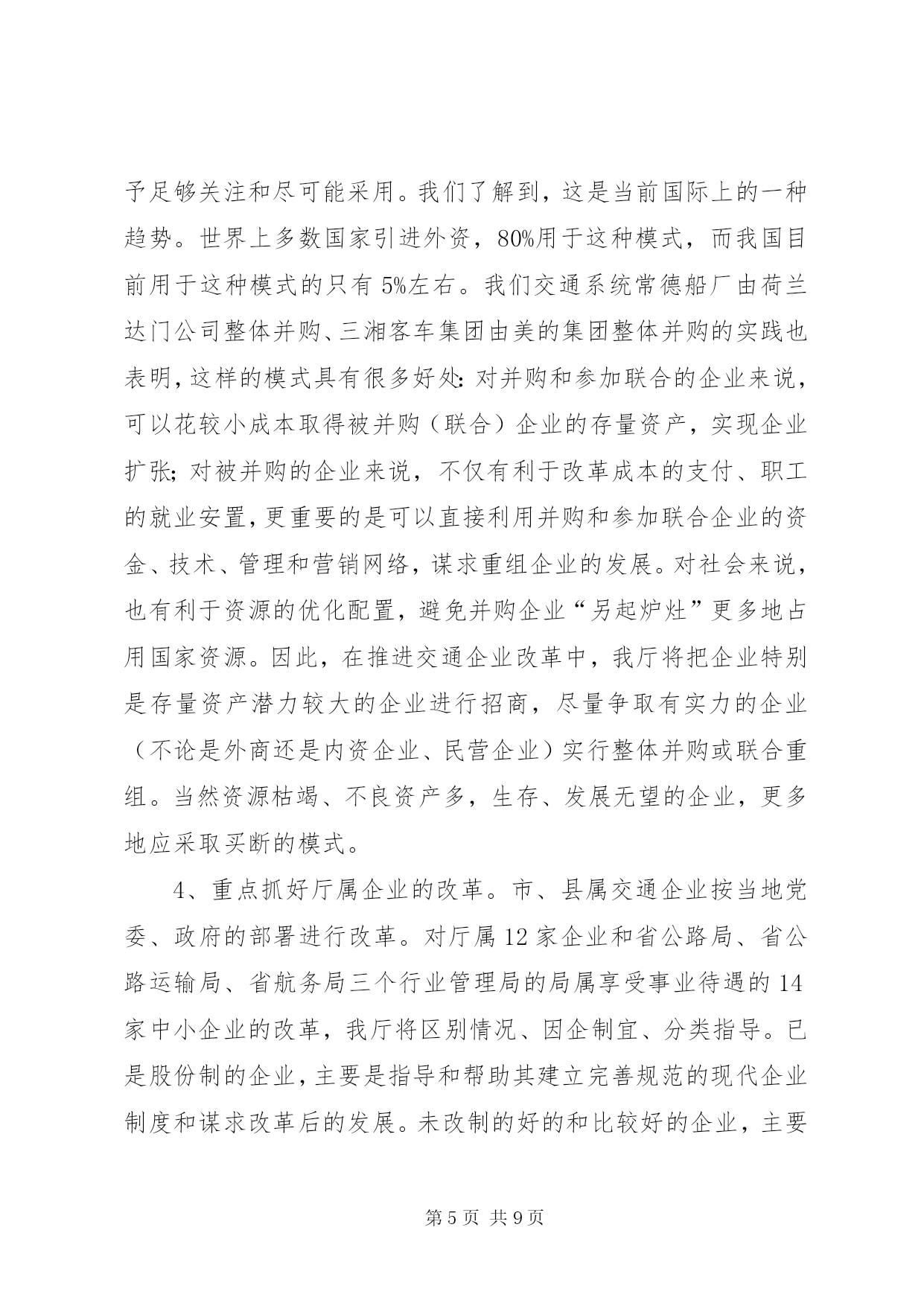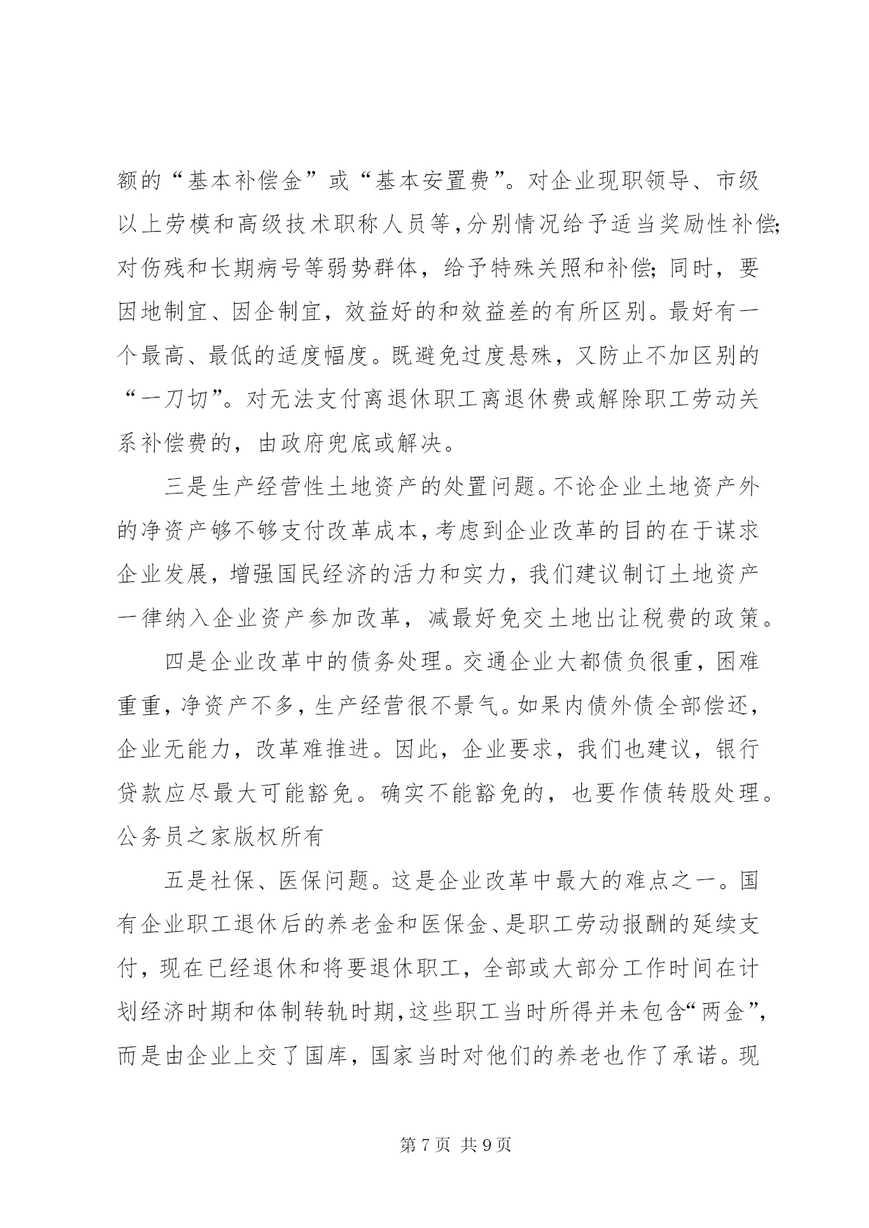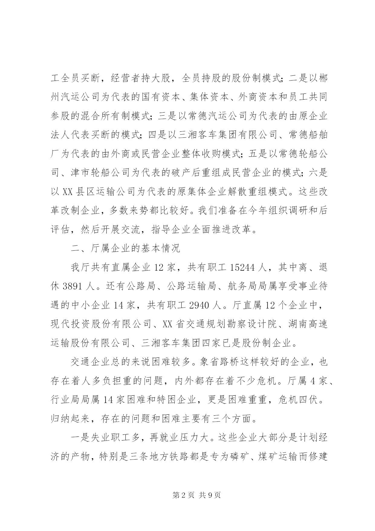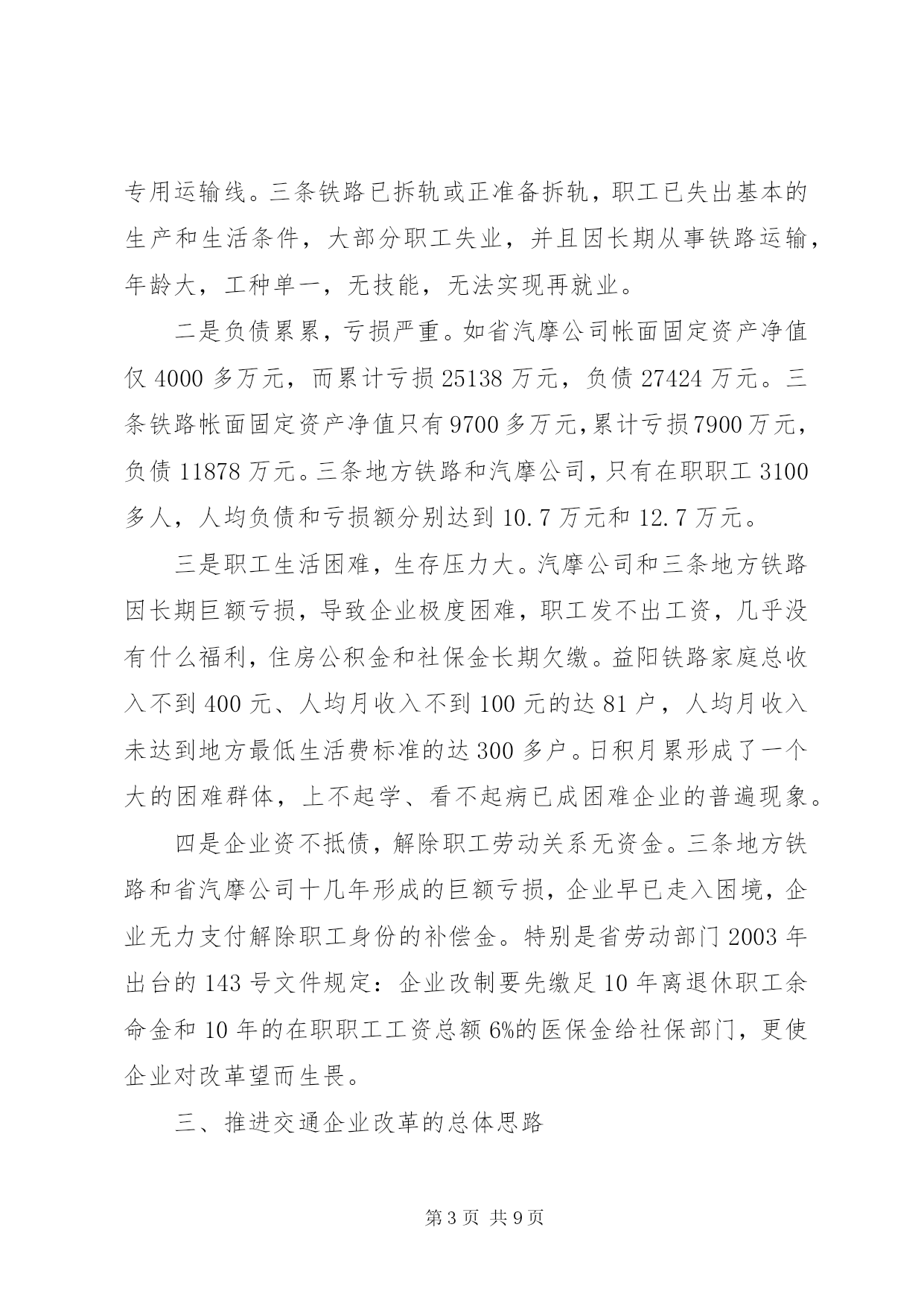 第PAGE\*Arabic\*MERGEFORMAT9页共NUMPAGES\*MERGEFORMAT9页关于国有交通企业改革问题的汇报按照省发展计划委员会87号文件(湘计发[2004]87号)的有关要求,我厅对国有交通企业的改革情况进行了调查,并就进一步推进交通企业改革问题作了研究。现将有关情况报告如下。一、全省交通企业的基本情况据2002年底的统计,除省属企业外,全省有包括公路运输、水路运输、交通工业、搬运装卸、联运和港口企业在内的交通企业241家,有职工12万多人,其中国有企业85家,职工7万2千多人,集体和其他所有制企业156家,职工5万多人。离退休职工一般都占企业职工总人数的三分之一以上,多数水运企业离退休职工占职工总人数半数以上。在所有这些企业中,除10余家大中型公路运输企业和为数很少的几家交通工业企业尚能维持正常经营活动,按时发放职工工资,多少有些利润外,其余大多数企业都是人员过多,负担沉重,债务缠身,步履艰难。交通企业在建国后很长一段时间是交通运输的主力军,曾经为满足社会需要做出重大贡献。为了搞活交通企业,从上个世纪80年代中后期起,我厅就一直在指导和帮助企业转换经营机制和实施改革。特别是近几年来在探索公有制多种有效实现形式方面加大了工作力度,取得了突破性进展。据我们调查,目前全省交通企业进行产权制度改革,建立起多元化产权结构的约占30%。其主要模式有以下六种:一是以衡阳汽运公司为代表的职工全员买断,经营者持大股,全员持股的股份制模式;二是以郴州汽运公司为代表的国有资本、集体资本、外商资本和员工共同参股的混合所有制模式;三是以常德汽运公司为代表的由原企业法人代表买断的模式;四是以三湘客车集团有限公司、常德船舶厂为代表的由外商或民营企业整体收购模式;五是以常德轮船公司、津市轮船公司为代表的破产后重组成民营企业的模式;六是以XX县区运输公司为代表的原集体企业解散重组模式。这些改革改制企业,多数来势都比较好。我们准备在今年组织调研和后评估,然后开展交流,指导企业全面推进改革。二、厅属企业的基本情况我厅共有直属企业12家,共有职工15244人,其中离、退休3891人。还有公路局、公路运输局、航务局局属享受事业待遇的中小企业14家,共有职工2940人。厅直属12个企业中,现代投资股份有限公司、XX省交通规划勘察设计院、湖南高速运输股份有限公司、三湘客车集团四家已是股份制企业。交通企业总的来说困难较多。象省路桥这样较好的企业,也存在着人多负担重的问题,内外都存在着不少危机。厅属4家、行业局局属14家困难和特困企业,更是困难重重,危机四伏。归纳起来,存在的问题和困难主要有三个方面。一是失业职工多,再就业压力大。这些企业大部分是计划经济的产物,特别是三条地方铁路都是专为磷矿、煤矿运输而修建专用运输线。三条铁路已拆轨或正准备拆轨,职工已失出基本的生产和生活条件,大部分职工失业,并且因长期从事铁路运输,年龄大,工种单一,无技能,无法实现再就业。二是负债累累,亏损严重。如省汽摩公司帐面固定资产净值仅4000多万元,而累计亏损25138万元,负债27424万元。三条铁路帐面固定资产净值只有9700多万元,累计亏损7900万元,负债11878万元。三条地方铁路和汽摩公司,只有在职职工3100多人,人均负债和亏损额分别达到10.7万元和12.7万元。三是职工生活困难,生存压力大。汽摩公司和三条地方铁路因长期巨额亏损,导致企业极度困难,职工发不出工资,几乎没有什么福利,住房公积金和社保金长期欠缴。益阳铁路家庭总收入不到400元、人均月收入不到100元的达81户,人均月收入未达到地方最低生活费标准的达300多户。日积月累形成了一个大的困难群体,上不起学、看不起病已成困难企业的普遍现象。四是企业资不抵债,解除职工劳动关系无资金。三条地方铁路和省汽摩公司十几年形成的巨额亏损,企业早已走入困境,企业无力支付解除职工身份的补偿金。特别是省劳动部门2003年出台的143号文件规定:企业改制要先缴足10年离退休职工余命金和10年的在职职工工资总额6%的医保金给社保部门,更使企业对改革望而生畏。三、推进交通企业改革的总体思路随着十六届三中全会《决定》的深入贯彻和省委、省政府有关企业改革举措的推出与实施,国有企业改革必将呈现出前所未有的强劲势头。我厅将在省委、省政府领导下,乘势而上,加大推进改革的工作力度,加快交通企业改革的步伐,力争厅属企业改革年内取得全面突破性进展,明年基本完成以产权制度改革为主要内容的改革任务。我们打算:1、在所有制方面全面放开交通企业。交通行业,是一个服务性和一般竞争性行业。根据有进有退,有所为和有所不为的原则,交通企业的国有资本可以有序退出。县属交通企业,原则上可以全部退出;省、市属交通企业也可以尽可能退出。
