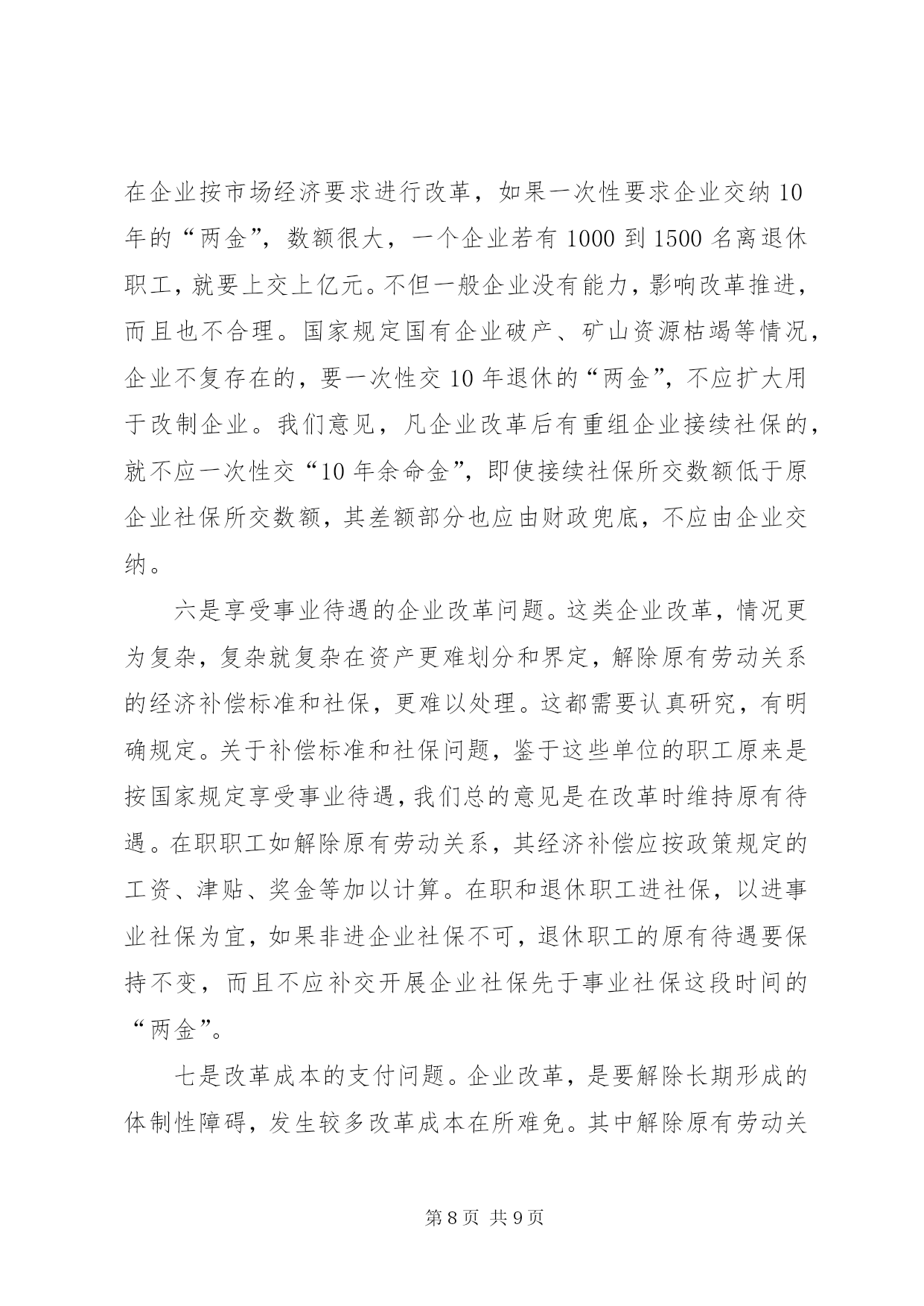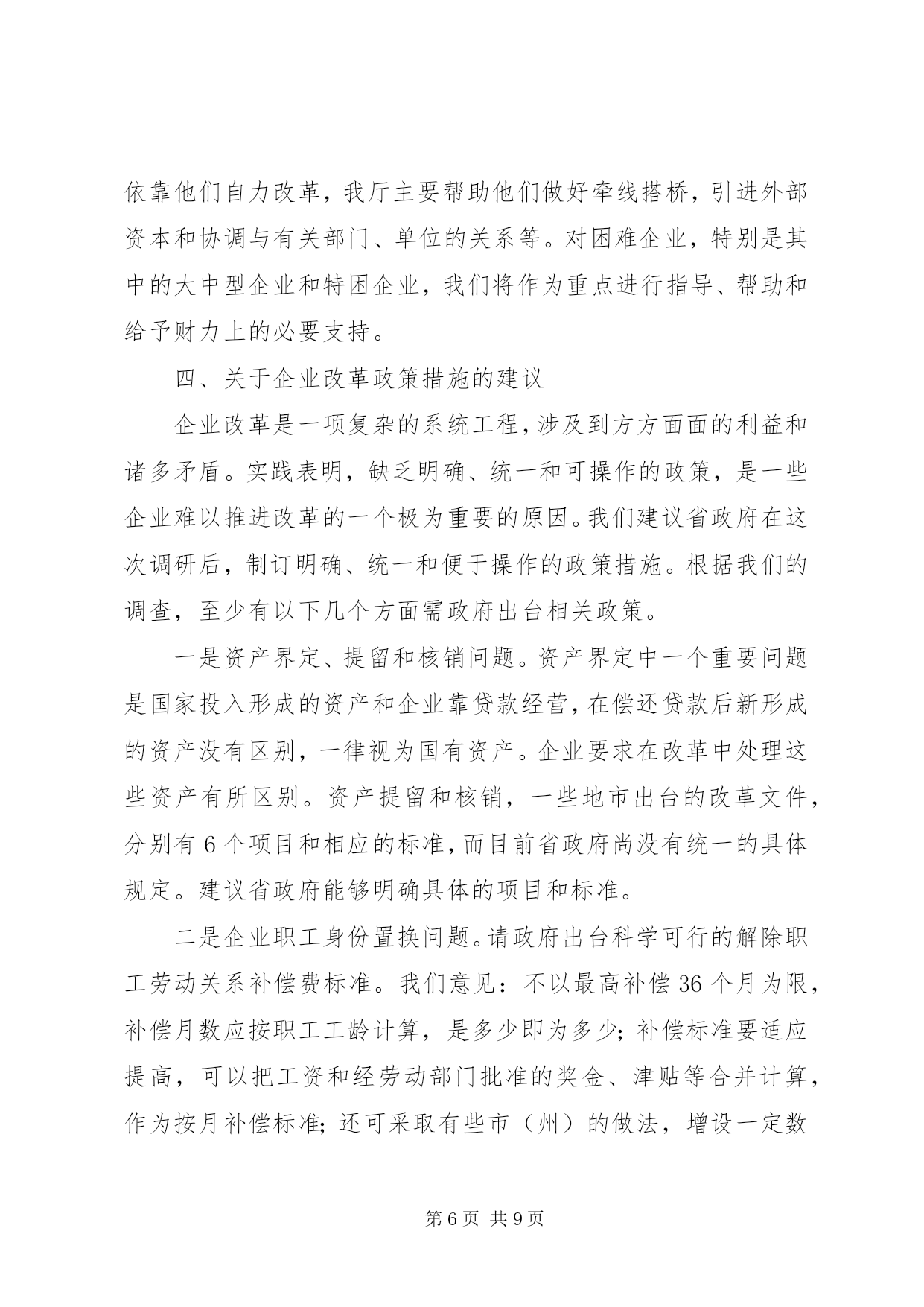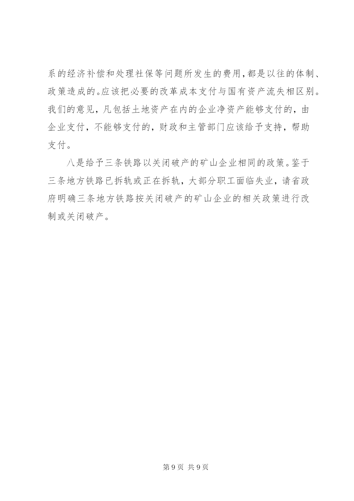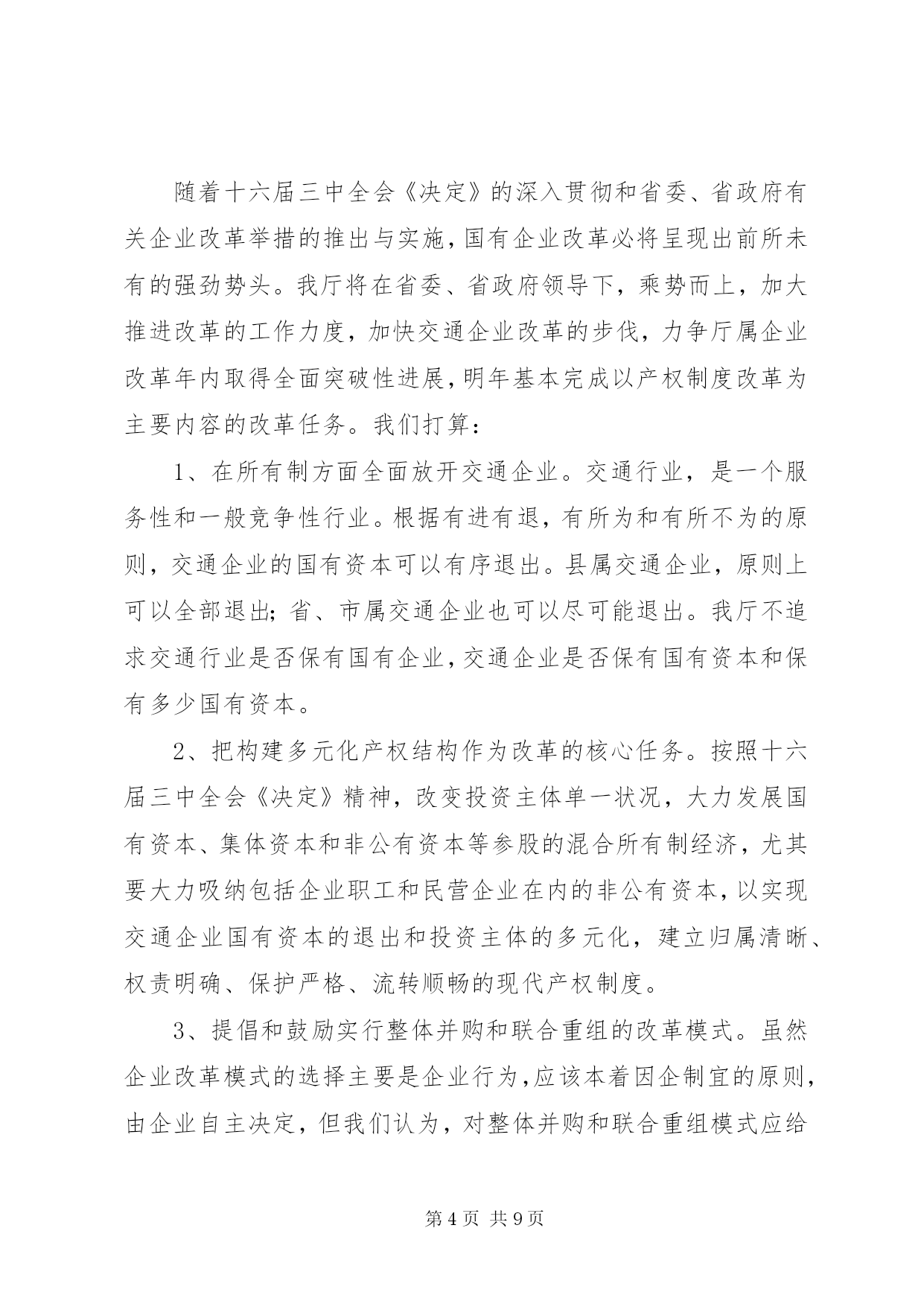 第PAGE\*Arabic\*MERGEFORMAT9页共NUMPAGES\*MERGEFORMAT9页关于国有交通企业改革问题的汇报按照省发展计划委员会87号文件(湘计发[2004]87号)的有关要求,我厅对国有交通企业的改革情况进行了调查,并就进一步推进交通企业改革问题作了研究。现将有关情况报告如下。一、全省交通企业的基本情况据2002年底的统计,除省属企业外,全省有包括公路运输、水路运输、交通工业、搬运装卸、联运和港口企业在内的交通企业241家,有职工12万多人,其中国有企业85家,职工7万2千多人,集体和其他所有制企业156家,职工5万多人。离退休职工一般都占企业职工总人数的三分之一以上,多数水运企业离退休职工占职工总人数半数以上。在所有这些企业中,除10余家大中型公路运输企业和为数很少的几家交通工业企业尚能维持正常经营活动,按时发放职工工资,多少有些利润外,其余大多数企业都是人员过多,负担沉重,债务缠身,步履艰难。交通企业在建国后很长一段时间是交通运输的主力军,曾经为满足社会需要做出重大贡献。为了搞活交通企业,从上个世纪80年代中后期起,我厅就一直在指导和帮助企业转换经营机制和实施改革。特别是近几年来在探索公有制多种有效实现形式方面加大了工作力度,取得了突破性进展。据我们调查,目前全省交通企业进行产权制度改革,建立起多元化产权结构的约占30%。其主要模式有以下六种:一是以衡阳汽运公司为代表的职工全员买断,经营者持大股,全员持股的股份制模式;二是以郴州汽运公司为代表的国有资本、集体资本、外商资本和员工共同参股的混合所有制模式;三是以常德汽运公司为代表的由原企业法人代表买断的模式;四是以三湘客车集团有限公司、常德船舶厂为代表的由外商或民营企业整体收购模式;五是以常德轮船公司、津市轮船公司为代表的破产后重组成民营企业的模式;六是以XX县区运输公司为代表的原集体企业解散重组模式。这些改革改制企业,多数来势都比较好。我们准备在今年组织调研和后评估,然后开展交流,指导企业全面推进改革。二、厅属企业的基本情况我厅共有直属企业12家,共有职工15244人,其中离、退休3891人。还有公路局、公路运输局、航务局局属享受事业待遇的中小企业14家,共有职工2940人。厅直属12个企业中,现代投资股份有限公司、XX省交通规划勘察设计院、湖南高速运输股份有限公司、三湘客车集团四家已是股份制企业。交通企业总的来说困难较多。象省路桥这样较好的企业,也存在着人多负担重的问题,内外都存在着不少危机。厅属4家、行业局局属14家困难和特困企业,更是困难重重,危机四伏。归纳起来,存在的问题和困难主要有三个方面。一是失业职工多,再就业压力大。这些企业大部分是计划经济的产物,特别是三条地方铁路都是专为磷矿、煤矿运输而修建专用运输线。三条铁路已拆轨或正准备拆轨,职工已失出基本的生产和生活条件,大部分职工失业,并且因长期从事铁路运输,年龄大,工种单一,无技能,无法实现再就业。二是负债累累,亏损严重。如省汽摩公司帐面固定资产净值仅4000多万元,而累计亏损25138万元,负债27424万元。三条铁路帐面固定资产净值只有9700多万元,累计亏损7900万元,负债11878万元。三条地方铁路和汽摩公司,只有在职职工3100多人,人均负债和亏损额分别达到10.7万元和12.7万元。三是职工生活困难,生存压力大。汽摩公司和三条地方铁路因长期巨额亏损,导致企业极度困难,职工发不出工资,几乎没有什么福利,住房公积金和社保金长期欠缴。益阳铁路家庭总收入不到400元、人均月收入不到100元的达81户,人均月收入未达到地方最低生活费标准的达300多户。日积月累形成了一个大的困难群体,上不起学、看不起病已成困难企业的普遍现象。四是企业资不抵债,解除职工劳动关系无资金。三条地方铁路和省汽摩公司十几年形成的巨额亏损,企业早已走入困境,企业无力支付解除职工身份的补偿金。特别是省劳动部门2003年出台的143号文件规定:企业改制要先缴足10年离退休职工余命金和10年的在职职工工资总额6%的医保金给社保部门,更使企业对改革望而生畏。三、推进交通企业改革的总体思路随着十六届三中全会《决定》的深入贯彻和省委、省政府有关企业改革举措的推出与实施,国有企业改革必将呈现出前所未有的强劲势头。我厅将在省委、省政府领导下,乘势而上,加大推进改革的工作力度,加快交通企业改革的步伐,力争厅属企业改革年内取得全面突破性进展,明年基本完成以产权制度改革为主要内容的改革任务。我们打算:1、在所有制方面全面放开交通企业。交通行业,是一个服务性和一般竞争性行业。根据有进有退,有所为和有所不为的原则,交通企业的国有资本可以有序退出。县属交通企业,原则上可以全部退出;省、市属交通企业也可以尽可能退出。