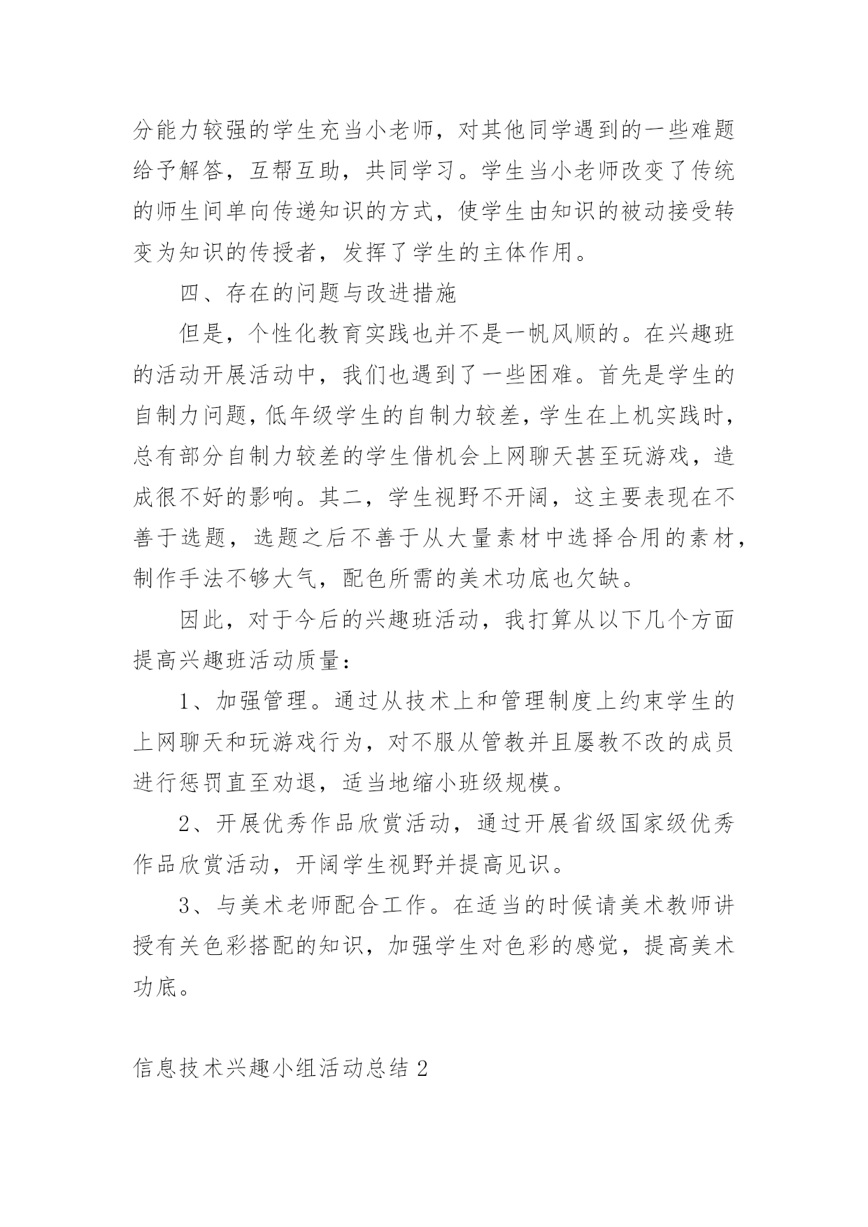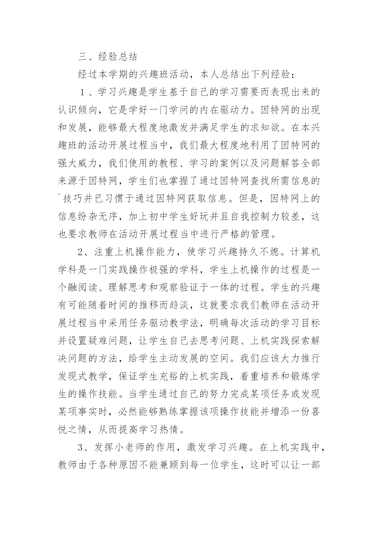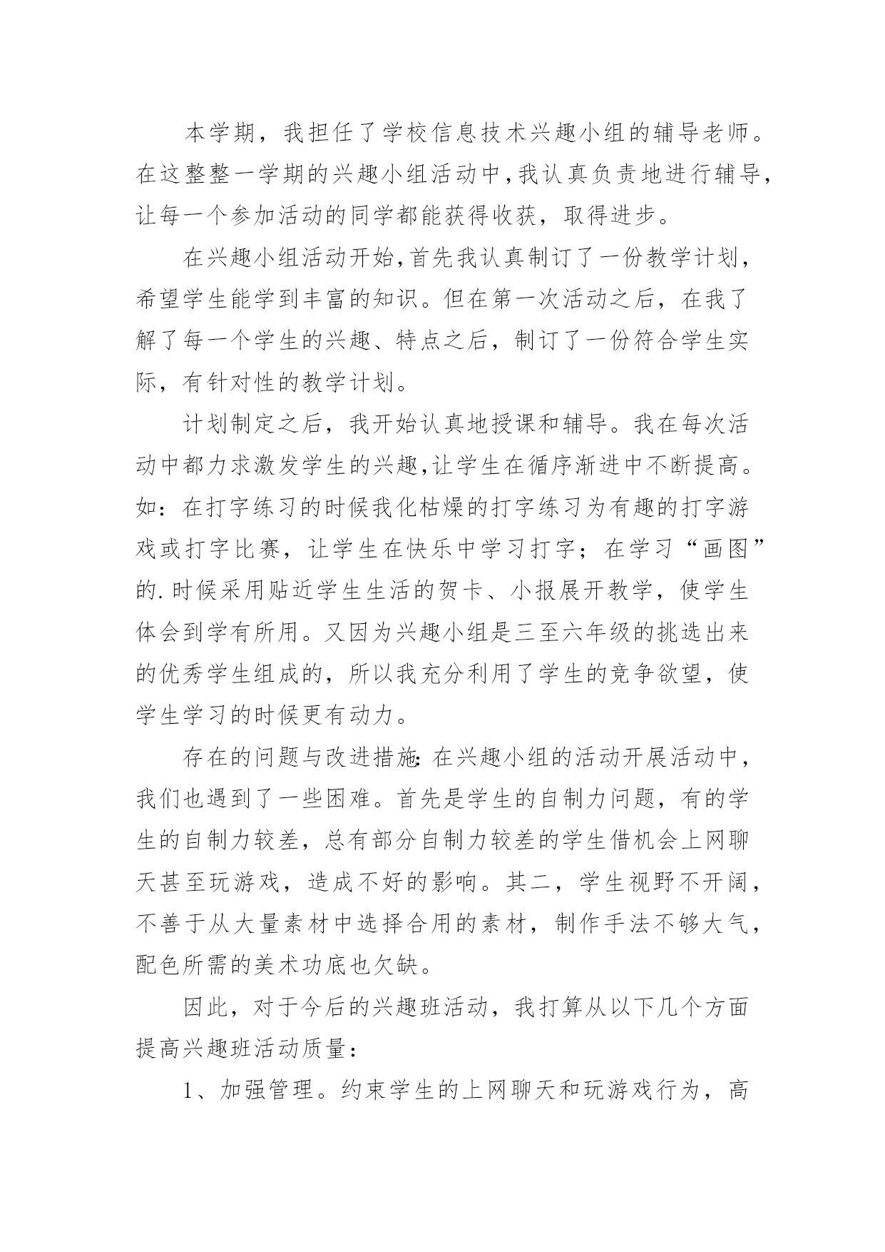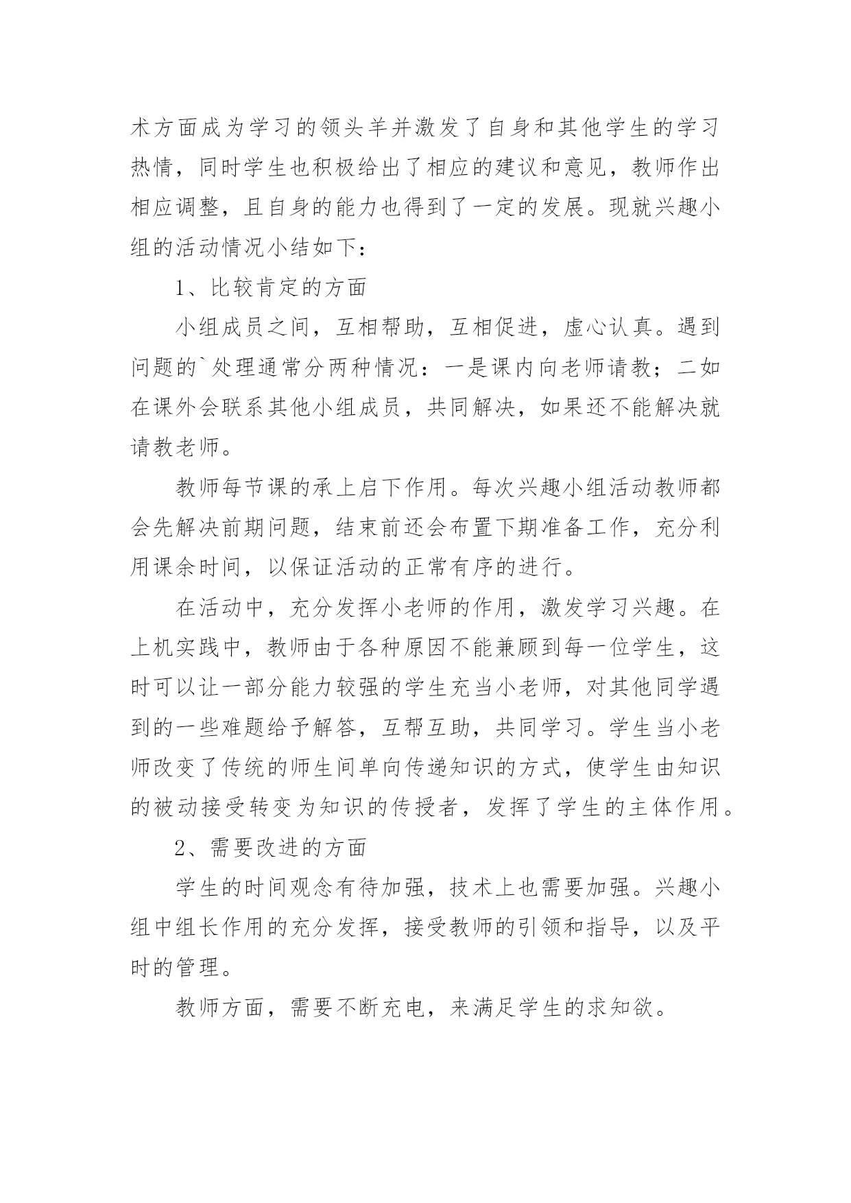 信息技术兴趣小组活动总结总结是指社会团体、企业单位和个人在自身的某一时期、某一项目或某些工作告一段落或者全部完成后进行回顾检查、分析评价,从而肯定成绩,得到经验,找出差距,得出教训和一些规律性认识的一种书面材料,它在我们的学习、工作中起到呈上启下的作用,让我们一起认真地写一份总结吧。那么你真的懂得怎么写总结吗?下面是小编为大家整理的信息技术兴趣小组活动总结,欢迎大家借鉴与参考,希望对大家有所帮助。信息技术兴趣小组活动总结1上学年,根据我校个性化教育与实践课题方案的安排,本人承担一至三年级电脑兴趣班活动的组织与教学工作。经过一年的工作与摸索,积累了一些经验,下面就小组活动情况、教学组织措施、经验与提高措施等三方面进行总结。一、本兴趣班活动情况根据学生自愿报名与教师选拔相结合的原则,到目前为止,本兴趣班共开展了16次教学活动。二、本兴趣班的组织与教学进展情况电脑应用分支广泛,为了充分尊重学生的兴趣爱好并为将来的区电脑作品制作竞赛作好准备,本兴趣班学员分为电脑绘画、打字和word、因特网三个小组。三个小组的学习钻研方向各有不同。三、经验总结经过本学期的兴趣班活动,本人总结出下列经验:1、学习兴趣是学生基于自己的学习需要而表现出来的认识倾向,它是学好一门学问的内在驱动力。因特网的出现和发展,能够最大程度地激发并满足学生的求知欲。在本兴趣班的活动开展过程当中,我们最大程度地利用了因特网的强大威力,我们使用的教程、学习的案例以及问题解答全部来源于因特网,学生们也掌握了通过因特网查找所需信息的`技巧并已习惯于通过因特网获取信息。但是,因特网上的信息纷杂无序,加上初中学生好玩并且自我控制力较差,这也要求教师在活动开展过程当中进行严格的管理。2、注重上机操作能力,使学习兴趣持久不熄。计算机学科是一门实践操作极强的学科,学生上机操作的过程是一个融阅读、理解思考和观察验证于一体的过程。学生的兴趣有可能随着时间的推移而趋淡,这就要求我们教师在活动开展过程当中采用任务驱动教学法,明确每次活动的学习目标并设置疑难问题,让学生自己去思考问题、上机实践探索解决问题的方法,给学生主动发展的空间。我们应该大力推行发现式教学,保证学生充裕的上机实践,着重培养和锻炼学生的操作技能。当学生通过自己的努力完成某项任务或发现某项事实时,必然能够熟练掌握该项操作技能并增添一份喜悦之情,从而提高学习热情。3、发挥小老师的作用,激发学习兴趣。在上机实践中,教师由于各种原因不能兼顾到每一位学生,这时可以让一部分能力较强的学生充当小老师,对其他同学遇到的一些难题给予解答,互帮互助,共同学习。学生当小老师改变了传统的师生间单向传递知识的方式,使学生由知识的被动接受转变为知识的传授者,发挥了学生的主体作用。四、存在的问题与改进措施但是,个性化教育实践也并不是一帆风顺的。在兴趣班的活动开展活动中,我们也遇到了一些困难。首先是学生的自制力问题,低年级学生的自制力较差,学生在上机实践时,总有部分自制力较差的学生借机会上网聊天甚至玩游戏,造成很不好的影响。其二,学生视野不开阔,这主要表现在不善于选题,选题之后不善于从大量素材中选择合用的素材,制作手法不够大气,配色所需的美术功底也欠缺。因此,对于今后的兴趣班活动,我打算从以下几个方面提高兴趣班活动质量:1、加强管理。通过从技术上和管理制度上约束学生的上网聊天和玩游戏行为,对不服从管教并且屡教不改的成员进行惩罚直至劝退,适当地缩小班级规模。2、开展优秀作品欣赏活动,通过开展省级国家级优秀作品欣赏活动,开阔学生视野并提高见识。3、与美术老师配合工作。在适当的时候请美术教师讲授有关色彩搭配的知识,加强学生对色彩的感觉,提高美术功底。信息技术兴趣小组活动总结2本学期,我担任了学校信息技术兴趣小组的辅导老师。在这整整一学期的兴趣小组活动中,我认真负责地进行辅导,让每一个参加活动的同学都能获得收获,取得进步。在兴趣小组活动开始,首先我认真制订了一份教学计划,希望学生能学到丰富的知识。但在第一次活动之后,在我了解了每一个学生的兴趣、特点之后,制订了一份符合学生实际,有针对性的教学计划。计划制定之后,我开始认真地授课和辅导。我在每次活动中都力求激发学生的兴趣,让学生在循序渐进中不断提高。如:在打字练习的时候我化枯燥的打字练习为有趣的打字游戏或打字比赛,让学生在快乐中学习打字;在学习“画图”的.时候采用贴近学生生活的贺卡、小报展开教学,使学生体会到学有所用。又因为兴趣小组是三至六年级的挑选出来的优秀学生组成的,所以我充分利用了学生的竞争欲望,使学生学习的时候更有动力。存在的问题与改进措施:在兴趣小组的活动开展活动中,我们也遇到了一些困难。首先是学生的自制力问题,有的学生的自制力较差,总有部分自制力较差的学生借机会上网聊天甚至玩游戏,造成不好的影响。其二,学生