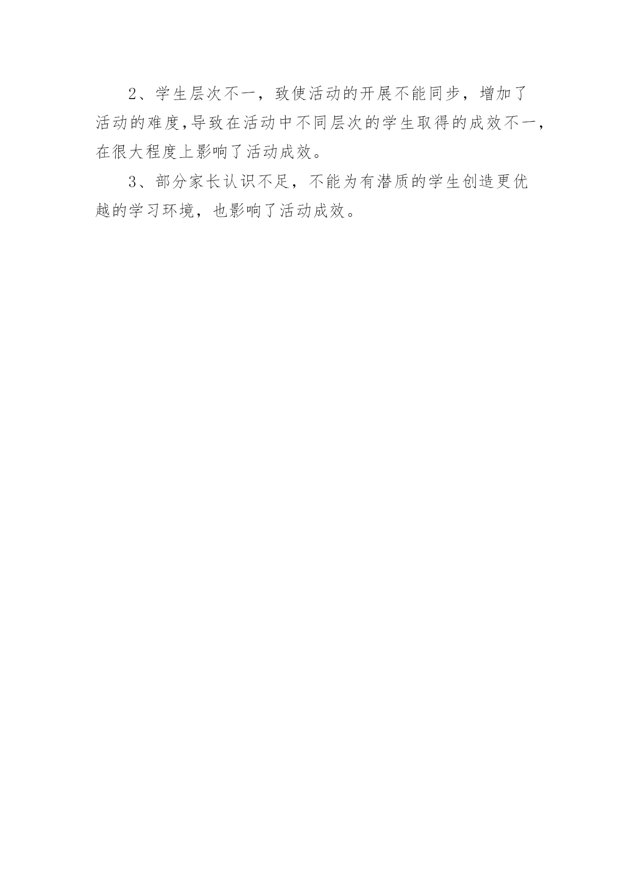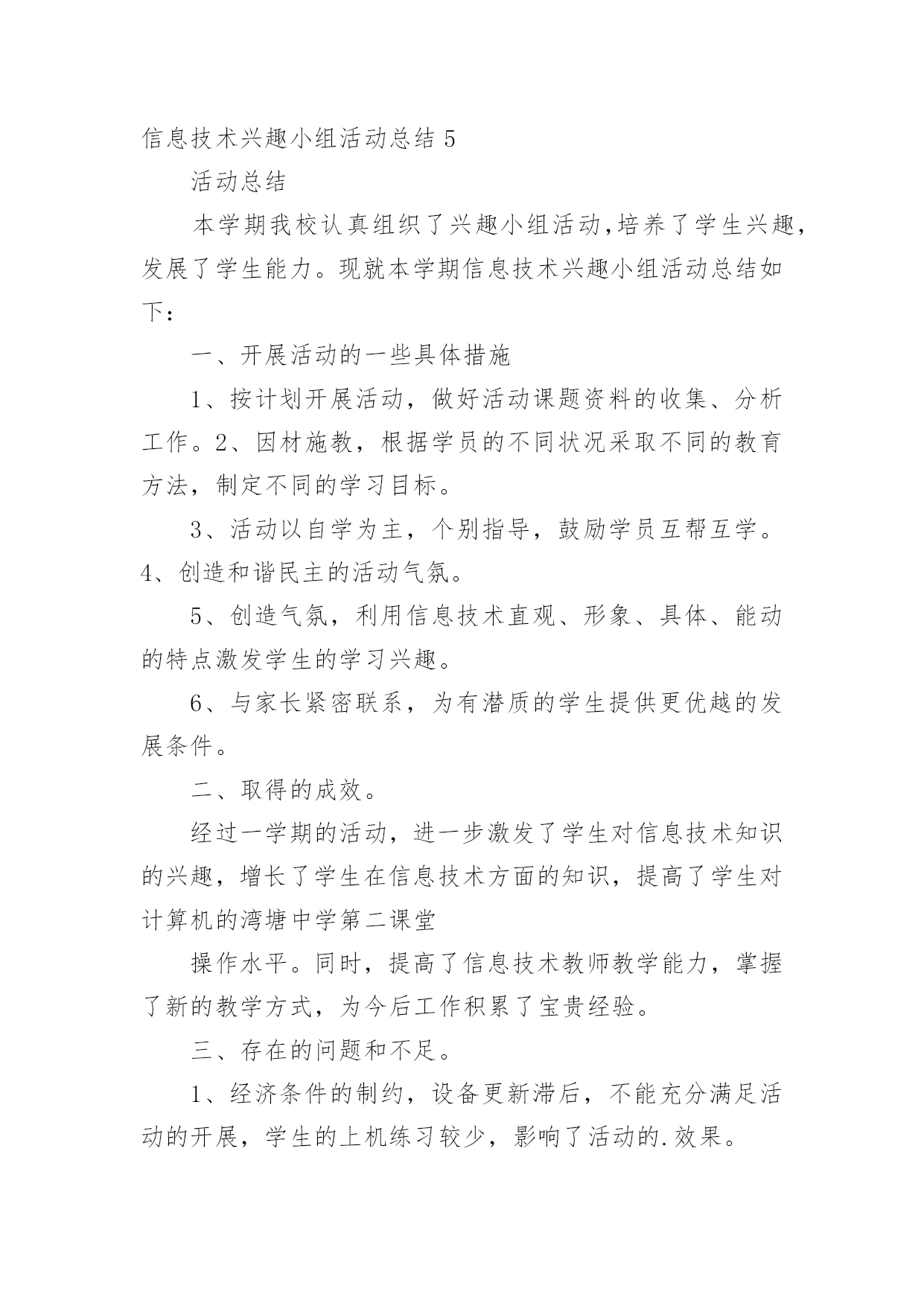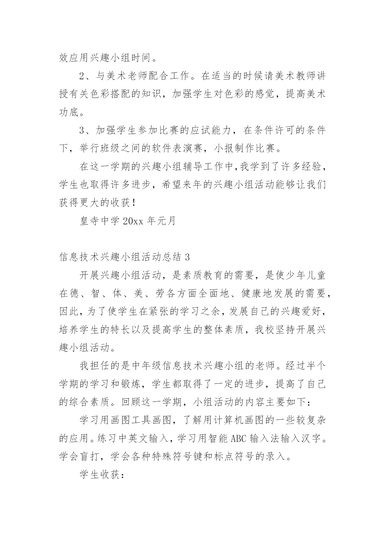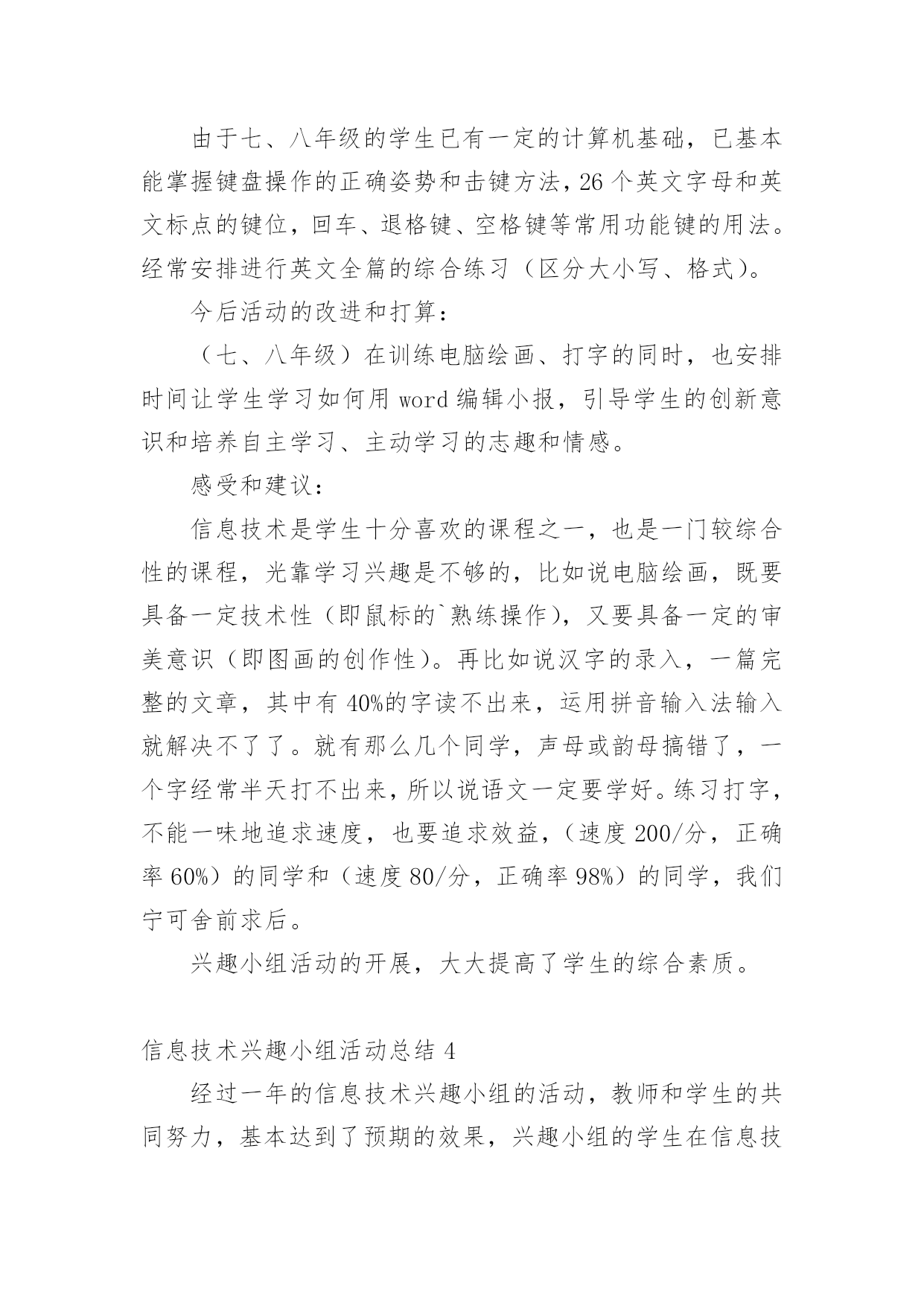 信息技术兴趣小组活动总结总结是指社会团体、企业单位和个人在自身的某一时期、某一项目或某些工作告一段落或者全部完成后进行回顾检查、分析评价,从而肯定成绩,得到经验,找出差距,得出教训和一些规律性认识的一种书面材料,它在我们的学习、工作中起到呈上启下的作用,让我们一起认真地写一份总结吧。那么你真的懂得怎么写总结吗?下面是小编为大家整理的信息技术兴趣小组活动总结,欢迎大家借鉴与参考,希望对大家有所帮助。信息技术兴趣小组活动总结1上学年,根据我校个性化教育与实践课题方案的安排,本人承担一至三年级电脑兴趣班活动的组织与教学工作。经过一年的工作与摸索,积累了一些经验,下面就小组活动情况、教学组织措施、经验与提高措施等三方面进行总结。一、本兴趣班活动情况根据学生自愿报名与教师选拔相结合的原则,到目前为止,本兴趣班共开展了16次教学活动。二、本兴趣班的组织与教学进展情况电脑应用分支广泛,为了充分尊重学生的兴趣爱好并为将来的区电脑作品制作竞赛作好准备,本兴趣班学员分为电脑绘画、打字和word、因特网三个小组。三个小组的学习钻研方向各有不同。三、经验总结经过本学期的兴趣班活动,本人总结出下列经验:1、学习兴趣是学生基于自己的学习需要而表现出来的认识倾向,它是学好一门学问的内在驱动力。因特网的出现和发展,能够最大程度地激发并满足学生的求知欲。在本兴趣班的活动开展过程当中,我们最大程度地利用了因特网的强大威力,我们使用的教程、学习的案例以及问题解答全部来源于因特网,学生们也掌握了通过因特网查找所需信息的`技巧并已习惯于通过因特网获取信息。但是,因特网上的信息纷杂无序,加上初中学生好玩并且自我控制力较差,这也要求教师在活动开展过程当中进行严格的管理。2、注重上机操作能力,使学习兴趣持久不熄。计算机学科是一门实践操作极强的学科,学生上机操作的过程是一个融阅读、理解思考和观察验证于一体的过程。学生的兴趣有可能随着时间的推移而趋淡,这就要求我们教师在活动开展过程当中采用任务驱动教学法,明确每次活动的学习目标并设置疑难问题,让学生自己去思考问题、上机实践探索解决问题的方法,给学生主动发展的空间。我们应该大力推行发现式教学,保证学生充裕的上机实践,着重培养和锻炼学生的操作技能。当学生通过自己的努力完成某项任务或发现某项事实时,必然能够熟练掌握该项操作技能并增添一份喜悦之情,从而提高学习热情。3、发挥小老师的作用,激发学习兴趣。在上机实践中,教师由于各种原因不能兼顾到每一位学生,这时可以让一部分能力较强的学生充当小老师,对其他同学遇到的一些难题给予解答,互帮互助,共同学习。学生当小老师改变了传统的师生间单向传递知识的方式,使学生由知识的被动接受转变为知识的传授者,发挥了学生的主体作用。四、存在的问题与改进措施但是,个性化教育实践也并不是一帆风顺的。在兴趣班的活动开展活动中,我们也遇到了一些困难。首先是学生的自制力问题,低年级学生的自制力较差,学生在上机实践时,总有部分自制力较差的学生借机会上网聊天甚至玩游戏,造成很不好的影响。其二,学生视野不开阔,这主要表现在不善于选题,选题之后不善于从大量素材中选择合用的素材,制作手法不够大气,配色所需的美术功底也欠缺。因此,对于今后的兴趣班活动,我打算从以下几个方面提高兴趣班活动质量:1、加强管理。通过从技术上和管理制度上约束学生的上网聊天和玩游戏行为,对不服从管教并且屡教不改的成员进行惩罚直至劝退,适当地缩小班级规模。2、开展优秀作品欣赏活动,通过开展省级国家级优秀作品欣赏活动,开阔学生视野并提高见识。3、与美术老师配合工作。在适当的时候请美术教师讲授有关色彩搭配的知识,加强学生对色彩的感觉,提高美术功底。信息技术兴趣小组活动总结2本学期,我担任了学校信息技术兴趣小组的辅导老师。在这整整一学期的兴趣小组活动中,我认真负责地进行辅导,让每一个参加活动的同学都能获得收获,取得进步。在兴趣小组活动开始,首先我认真制订了一份教学计划,希望学生能学到丰富的知识。但在第一次活动之后,在我了解了每一个学生的兴趣、特点之后,制订了一份符合学生实际,有针对性的教学计划。计划制定之后,我开始认真地授课和辅导。我在每次活动中都力求激发学生的兴趣,让学生在循序渐进中不断提高。如:在打字练习的时候我化枯燥的打字练习为有趣的打字游戏或打字比赛,让学生在快乐中学习打字;在学习“画图”的.时候采用贴近学生生活的贺卡、小报展开教学,使学生体会到学有所用。又因为兴趣小组是三至六年级的挑选出来的优秀学生组成的,所以我充分利用了学生的竞争欲望,使学生学习的时候更有动力。存在的问题与改进措施:在兴趣小组的活动开展活动中,我们也遇到了一些困难。首先是学生的自制力问题,有的学生的自制力较差,总有部分自制力较差的学生借机会上网聊天甚至玩游戏,造成不好的影响。其二,学生