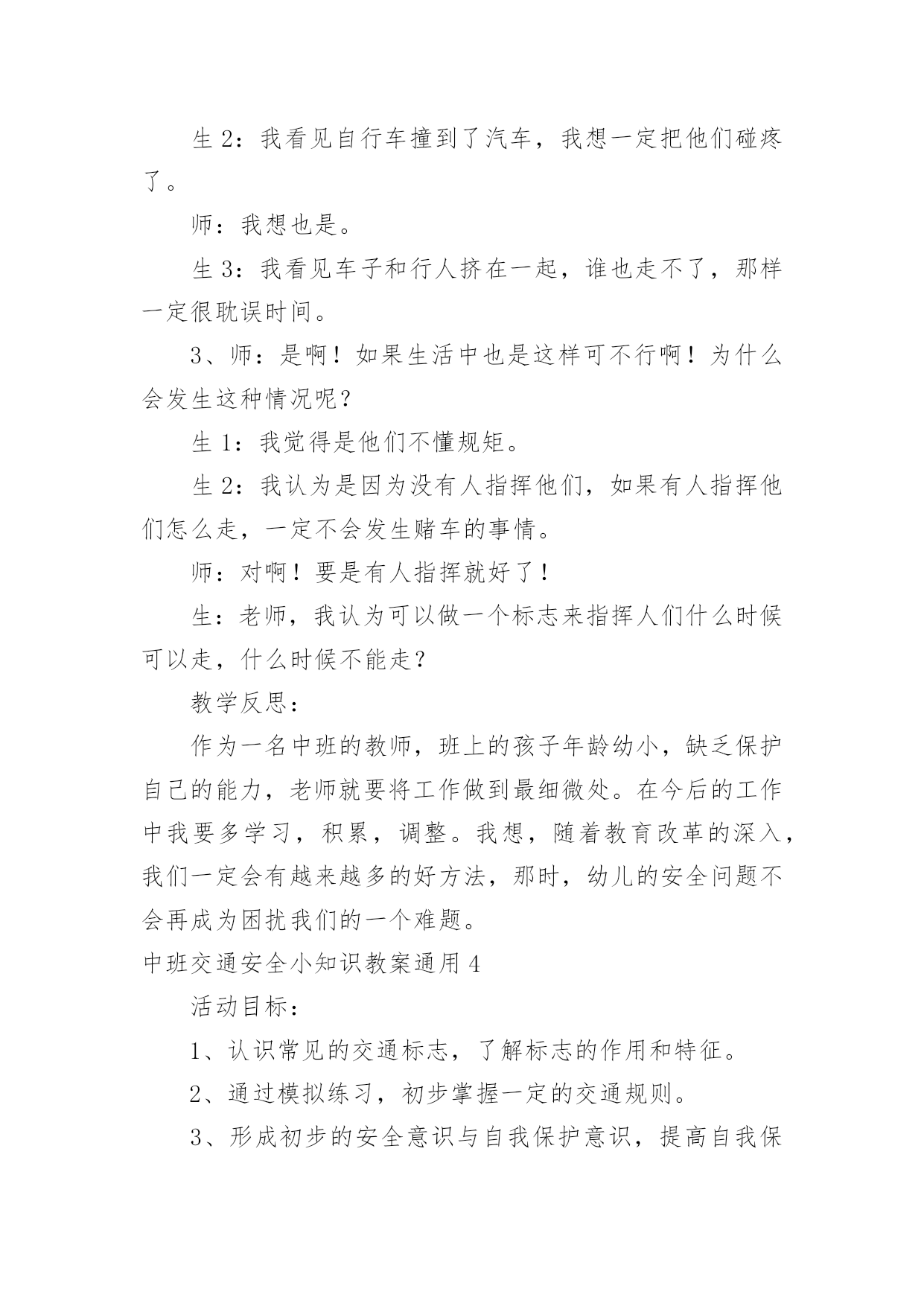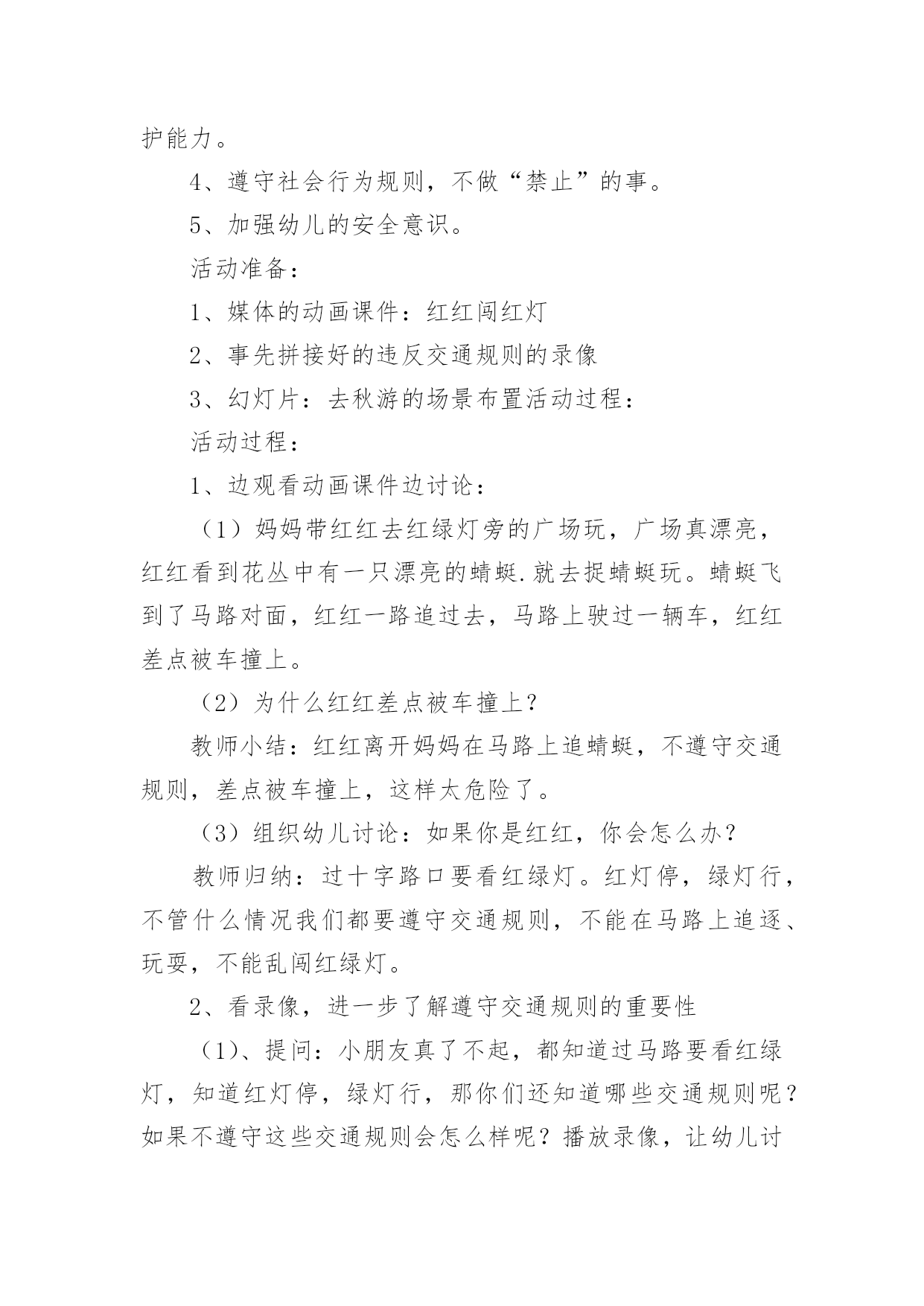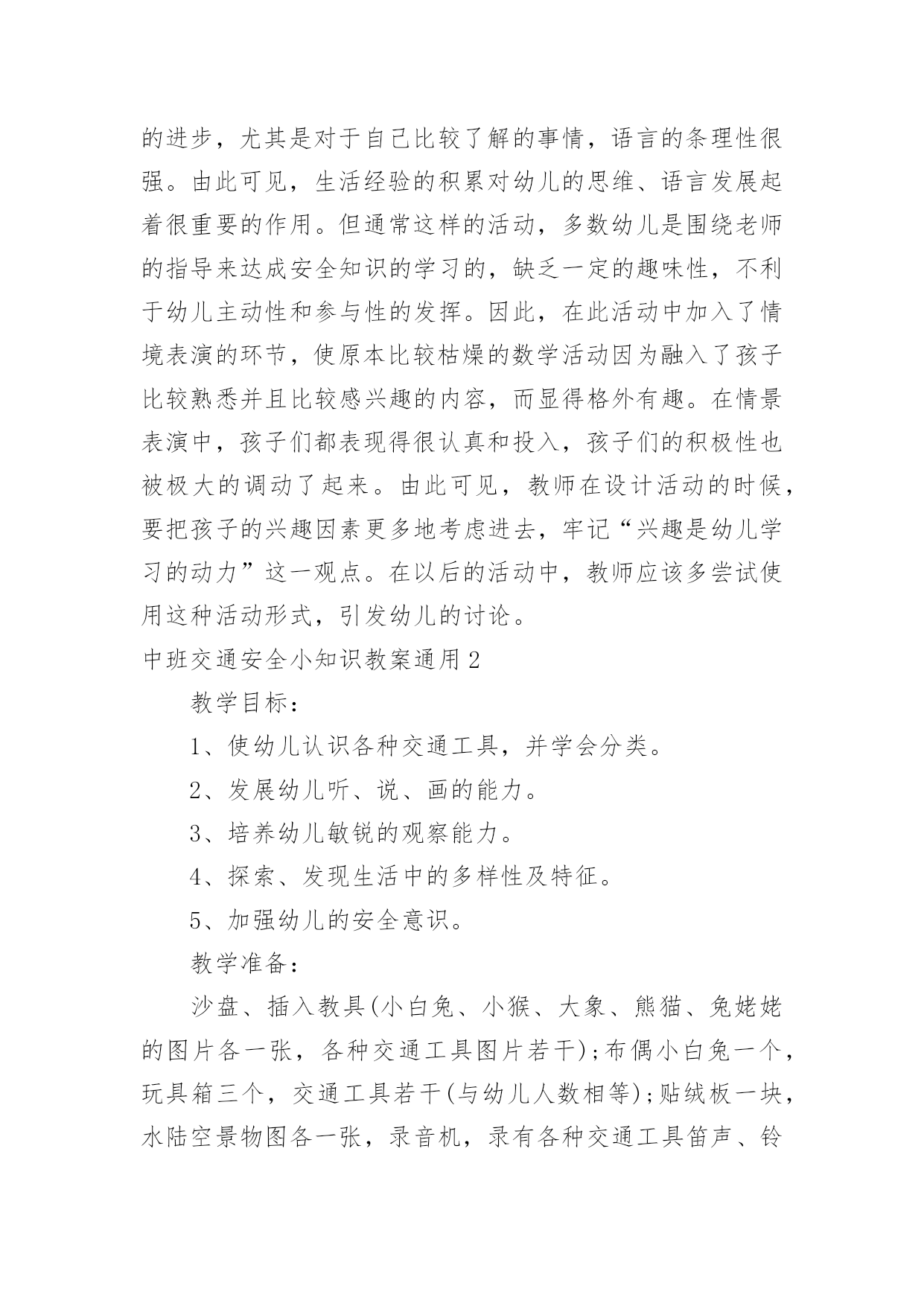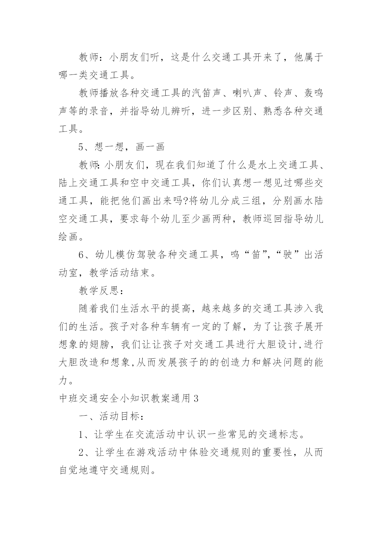 中班交通安全小知识教案中班交通安全小知识教案通用作为一名教师,时常要开展教案准备工作,编写教案助于积累教学经验,不断提高教学质量。教案应该怎么写才好呢?以下是小编为大家整理的中班交通安全小知识教案通用,仅供参考,大家一起来看看吧。中班交通安全小知识教案通用1活动目标:1、让幼儿在交流活动中认识一些常见的交通标志。2、让幼儿在游戏活动中体验交通规则的重要性,从而自觉地遵守交通规则。3、让幼儿在合作学习中学得一些基本的学习方法。4、培养幼儿敏锐的观察能力。5、遵守社会行为规则,不做“禁止”的事。活动准备:1、精心布置活动场景。2、收集各种交通标志(照片或图片)。3、字卡:交通安全、红灯停,绿灯行、人行道、非机动车道、汽车道。活动过程:(一)展开联想,揭示活动主题1、出示交通事故图片,请幼儿仔细观察。提问:孩子们,刚才你们看到了什么?想到了什么?2、多么可怕的车祸,为了不让这样的事情再发生,我们一定要注意交通安全。(出示字卡“交通安全”)(二)在活动中体会交通规则的重要性1、孩子们,看看我们坐的队形像什么?十字路口的学问可多了,现在我们就在十字路口做个游戏。老师请出三个司机,三个骑车的以及五个行人。参加游戏活动的孩子听到老师说完“开始”之后,立即向自己的对面出发。其他孩子仔细观察,看看会发生什么事情?(1)孩子们,刚才你们看到了什么?你们想说什么?(2)如果生活中也是这样可不行啊!为什么会发生这种情况呢?(3)(教师拿出信号灯标志)这是什么?谁能编句儿歌来说说信号灯的作用。(将标志贴在黑板上)幼儿回答后出示字卡“红灯停,绿灯行”。2、认识了红绿灯,我们还要知道自己应该走哪条路,这就要知道每条路的名称。孩子们,看看这个十字路口,你认识这些道路吗?(人行道、非机动车道、汽车道)(三)初步了解常见交通标志的作用(出示交通标志)在车辆穿梭的马路上,除了信号灯这个交通标志外,还有很多交通标志,这些交通标志都有什么用呢?(四)现场指挥1、刚才我们认识的交通标志对维护交通安全起着重要的作用。车辆的顺畅,人们的生命安全,更离不开交通警察。老师向交警叔叔学了一些指挥交通的本领,请小朋友仔细看,猜一猜是什么意思。2、老师来当交通警察,请小朋友站在这个十字路口,听警察叔叔的指挥,一起动一动吧!(五)评价幼儿游戏情况,结束。儿童安全小知识:1.增强红绿灯意识.红绿灯是设在街道路口的交通信号装置.`红灯停,绿灯行'按信号灯的指示通行,起步时向左右两边看是否有来车,然后从人行横道横过马路.自觉地接受交通信号的指挥.2.学龄前儿童过马路要让大人牵引.不要让儿童单独上街.他们如在街道或公路上行走,必须有成年人带领.3.不要在车辆临近时突然横过马路.人的大脑从接受外界信号到是否决定停步到最后停下来有一个过程.汽车也是这样,当紧急制动时也有一个过程;再加上行驶的汽车有惯性,不能一刹即停.最安全之策,只能是:不要在汽车临近时突然横穿马路.4.不要扒车.一些小孩出于好奇,常常利用车辆起步、上坡、减速时扒车,或作游戏或以扒车代步.这样很容易跌倒或摔伤.甚至造成生命危险.活动反思:孩子们对交通安全有一定的认知,能较客观的认定其他人行为的对与错。在活动中,幼儿的语言表达能力有了很大的进步,尤其是对于自己比较了解的事情,语言的条理性很强。由此可见,生活经验的积累对幼儿的思维、语言发展起着很重要的作用。但通常这样的活动,多数幼儿是围绕老师的指导来达成安全知识的学习的,缺乏一定的趣味性,不利于幼儿主动性和参与性的发挥。因此,在此活动中加入了情境表演的环节,使原本比较枯燥的数学活动因为融入了孩子比较熟悉并且比较感兴趣的内容,而显得格外有趣。在情景表演中,孩子们都表现得很认真和投入,孩子们的积极性也被极大的调动了起来。由此可见,教师在设计活动的时候,要把孩子的兴趣因素更多地考虑进去,牢记“兴趣是幼儿学习的动力”这一观点。在以后的活动中,教师应该多尝试使用这种活动形式,引发幼儿的讨论。中班交通安全小知识教案通用2教学目标:1、使幼儿认识各种交通工具,并学会分类。2、发展幼儿听、说、画的能力。3、培养幼儿敏锐的观察能力。4、探索、发现生活中的多样性及特征。5、加强幼儿的安全意识。教学准备:沙盘、插入教具(小白兔、小猴、大象、熊猫、兔姥姥的图片各一张,各种交通工具图片若干);布偶小白兔一个,玩具箱三个,交通工具若干(与幼儿人数相等);贴绒板一块,水陆空景物图各一张,录音机,录有各种交通工具笛声、铃声、轰鸣声等磁带一盒。教学过程:1、讲故事《小白兔看姥姥》教师:小朋友们,今天老师给大家讲一个有趣的故事《小白兔看姥姥》,你们可要听清楚,小白兔去看姥姥的路上乘坐了什么交通工具?谁的速度最快?教师边讲故事边在沙盘里演示涉及到的教具,讲完后让幼儿讨论回答先前提出的问题。教师明确:小白兔乘坐的汽车是在