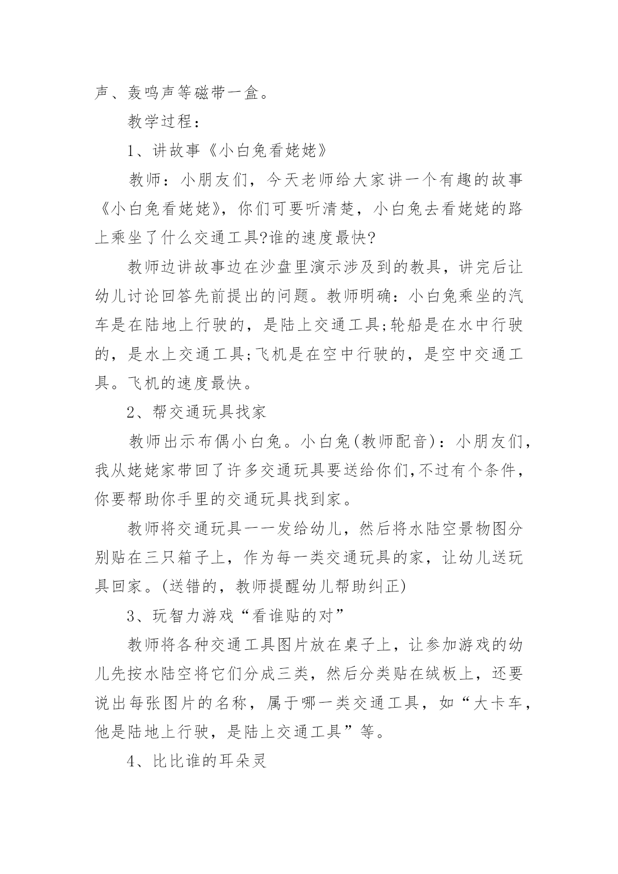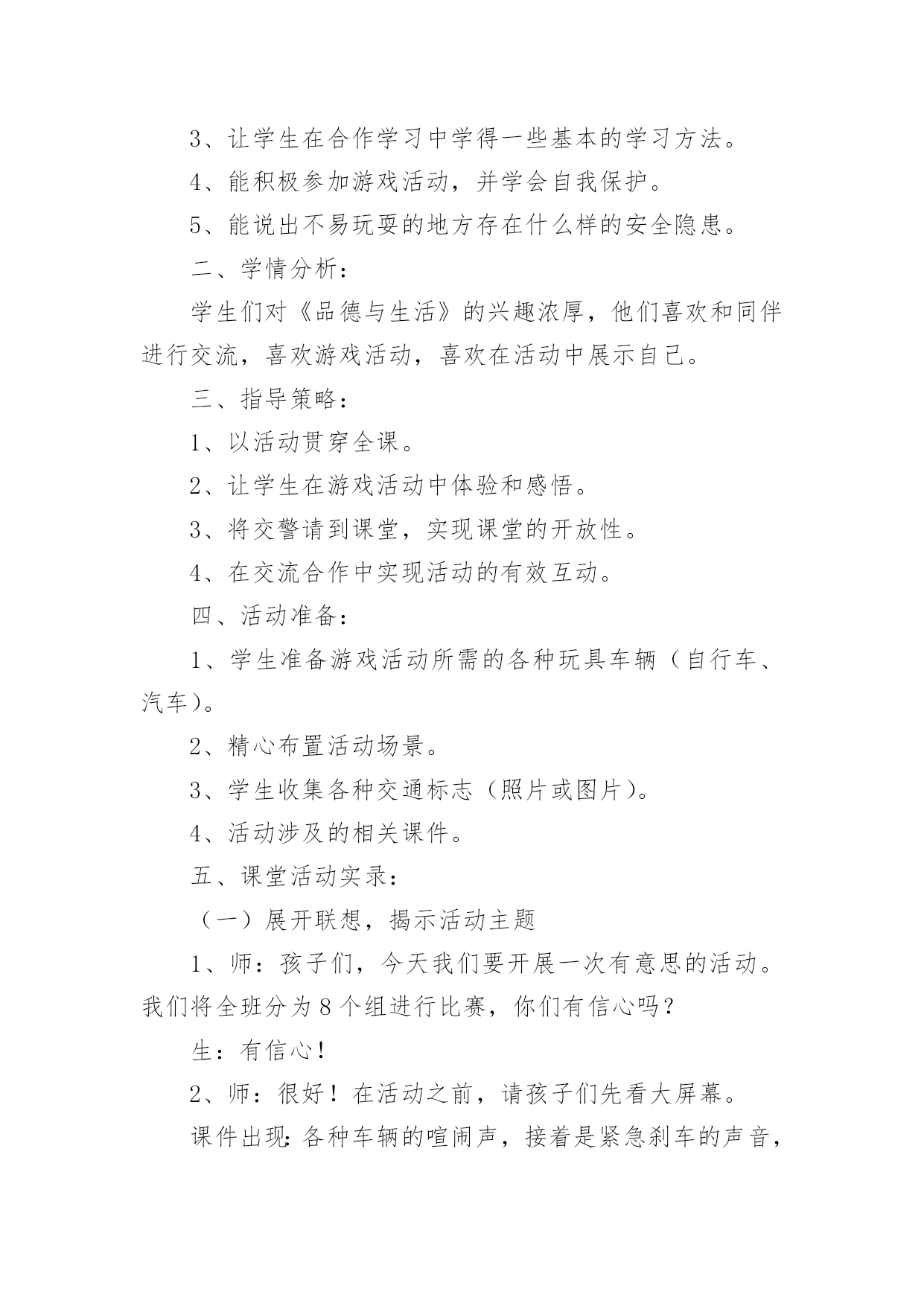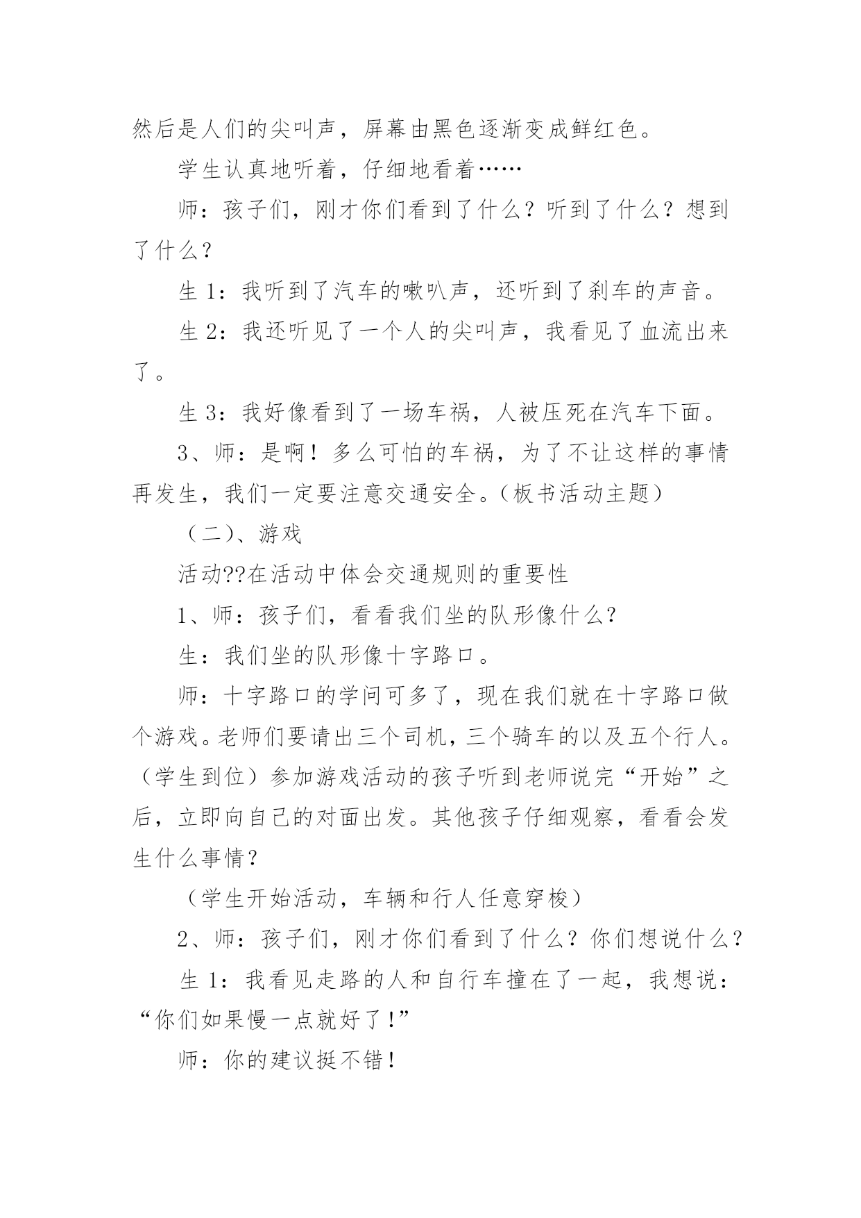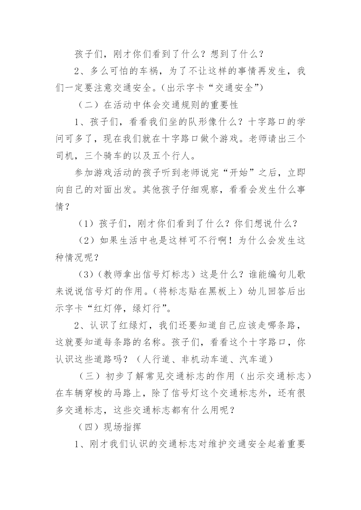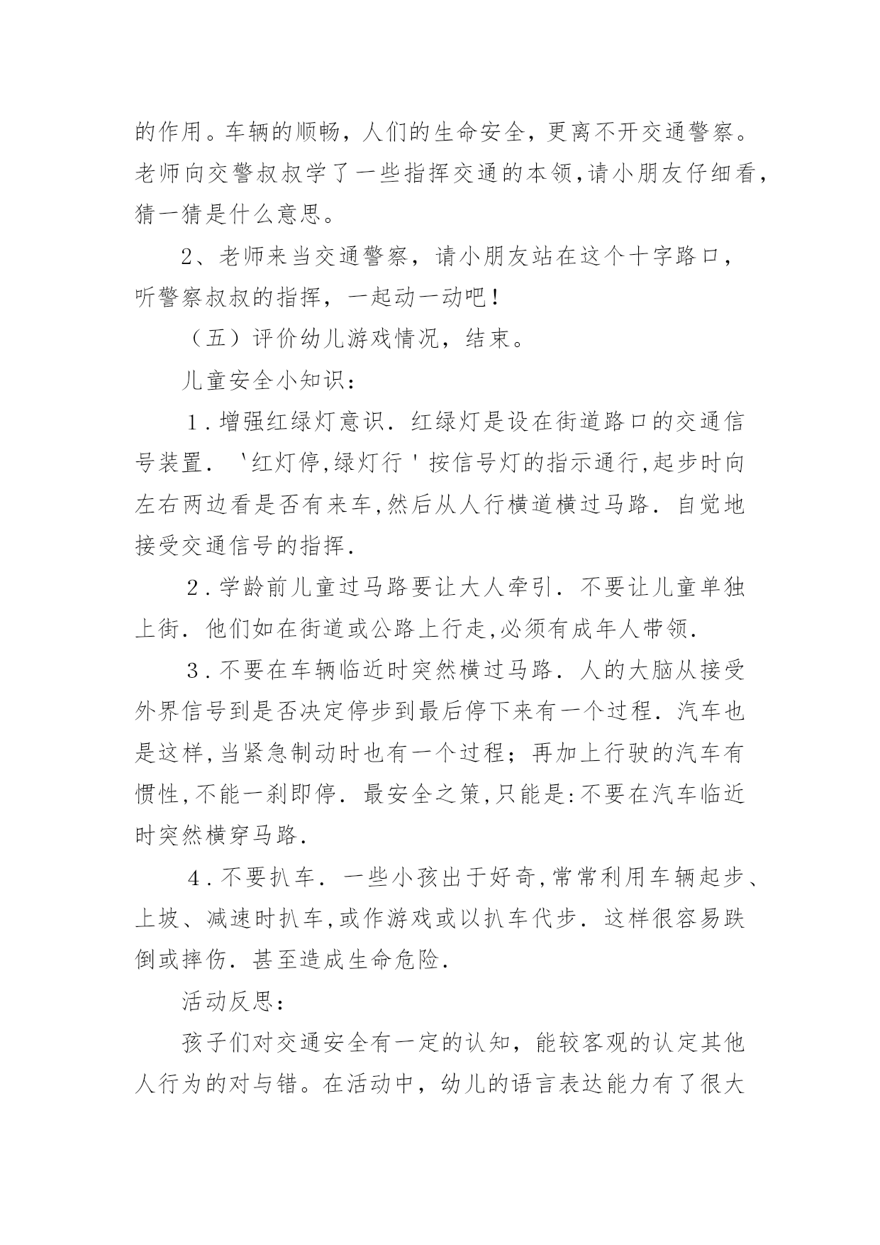 中班交通安全小知识教案中班交通安全小知识教案通用作为一名教师,时常要开展教案准备工作,编写教案助于积累教学经验,不断提高教学质量。教案应该怎么写才好呢?以下是小编为大家整理的中班交通安全小知识教案通用,仅供参考,大家一起来看看吧。中班交通安全小知识教案通用1活动目标:1、让幼儿在交流活动中认识一些常见的交通标志。2、让幼儿在游戏活动中体验交通规则的重要性,从而自觉地遵守交通规则。3、让幼儿在合作学习中学得一些基本的学习方法。4、培养幼儿敏锐的观察能力。5、遵守社会行为规则,不做“禁止”的事。活动准备:1、精心布置活动场景。2、收集各种交通标志(照片或图片)。3、字卡:交通安全、红灯停,绿灯行、人行道、非机动车道、汽车道。活动过程:(一)展开联想,揭示活动主题1、出示交通事故图片,请幼儿仔细观察。提问:孩子们,刚才你们看到了什么?想到了什么?2、多么可怕的车祸,为了不让这样的事情再发生,我们一定要注意交通安全。(出示字卡“交通安全”)(二)在活动中体会交通规则的重要性1、孩子们,看看我们坐的队形像什么?十字路口的学问可多了,现在我们就在十字路口做个游戏。老师请出三个司机,三个骑车的以及五个行人。参加游戏活动的孩子听到老师说完“开始”之后,立即向自己的对面出发。其他孩子仔细观察,看看会发生什么事情?(1)孩子们,刚才你们看到了什么?你们想说什么?(2)如果生活中也是这样可不行啊!为什么会发生这种情况呢?(3)(教师拿出信号灯标志)这是什么?谁能编句儿歌来说说信号灯的作用。(将标志贴在黑板上)幼儿回答后出示字卡“红灯停,绿灯行”。2、认识了红绿灯,我们还要知道自己应该走哪条路,这就要知道每条路的名称。孩子们,看看这个十字路口,你认识这些道路吗?(人行道、非机动车道、汽车道)(三)初步了解常见交通标志的作用(出示交通标志)在车辆穿梭的马路上,除了信号灯这个交通标志外,还有很多交通标志,这些交通标志都有什么用呢?(四)现场指挥1、刚才我们认识的交通标志对维护交通安全起着重要的作用。车辆的顺畅,人们的生命安全,更离不开交通警察。老师向交警叔叔学了一些指挥交通的本领,请小朋友仔细看,猜一猜是什么意思。2、老师来当交通警察,请小朋友站在这个十字路口,听警察叔叔的指挥,一起动一动吧!(五)评价幼儿游戏情况,结束。儿童安全小知识:1.增强红绿灯意识.红绿灯是设在街道路口的交通信号装置.`红灯停,绿灯行'按信号灯的指示通行,起步时向左右两边看是否有来车,然后从人行横道横过马路.自觉地接受交通信号的指挥.2.学龄前儿童过马路要让大人牵引.不要让儿童单独上街.他们如在街道或公路上行走,必须有成年人带领.3.不要在车辆临近时突然横过马路.人的大脑从接受外界信号到是否决定停步到最后停下来有一个过程.汽车也是这样,当紧急制动时也有一个过程;再加上行驶的汽车有惯性,不能一刹即停.最安全之策,只能是:不要在汽车临近时突然横穿马路.4.不要扒车.一些小孩出于好奇,常常利用车辆起步、上坡、减速时扒车,或作游戏或以扒车代步.这样很容易跌倒或摔伤.甚至造成生命危险.活动反思:孩子们对交通安全有一定的认知,能较客观的认定其他人行为的对与错。在活动中,幼儿的语言表达能力有了很大的进步,尤其是对于自己比较了解的事情,语言的条理性很强。由此可见,生活经验的积累对幼儿的思维、语言发展起着很重要的作用。但通常这样的活动,多数幼儿是围绕老师的指导来达成安全知识的学习的,缺乏一定的趣味性,不利于幼儿主动性和参与性的发挥。因此,在此活动中加入了情境表演的环节,使原本比较枯燥的数学活动因为融入了孩子比较熟悉并且比较感兴趣的内容,而显得格外有趣。在情景表演中,孩子们都表现得很认真和投入,孩子们的积极性也被极大的调动了起来。由此可见,教师在设计活动的时候,要把孩子的兴趣因素更多地考虑进去,牢记“兴趣是幼儿学习的动力”这一观点。在以后的活动中,教师应该多尝试使用这种活动形式,引发幼儿的讨论。中班交通安全小知识教案通用2教学目标:1、使幼儿认识各种交通工具,并学会分类。2、发展幼儿听、说、画的能力。3、培养幼儿敏锐的观察能力。4、探索、发现生活中的多样性及特征。5、加强幼儿的安全意识。教学准备:沙盘、插入教具(小白兔、小猴、大象、熊猫、兔姥姥的图片各一张,各种交通工具图片若干);布偶小白兔一个,玩具箱三个,交通工具若干(与幼儿人数相等);贴绒板一块,水陆空景物图各一张,录音机,录有各种交通工具笛声、铃声、轰鸣声等磁带一盒。教学过程:1、讲故事《小白兔看姥姥》教师:小朋友们,今天老师给大家讲一个有趣的故事《小白兔看姥姥》,你们可要听清楚,小白兔去看姥姥的路上乘坐了什么交通工具?谁的速度最快?教师边讲故事边在沙盘里演示涉及到的教具,讲完后让幼儿讨论回答先前提出的问题。教师明确:小白兔乘坐的汽车是在