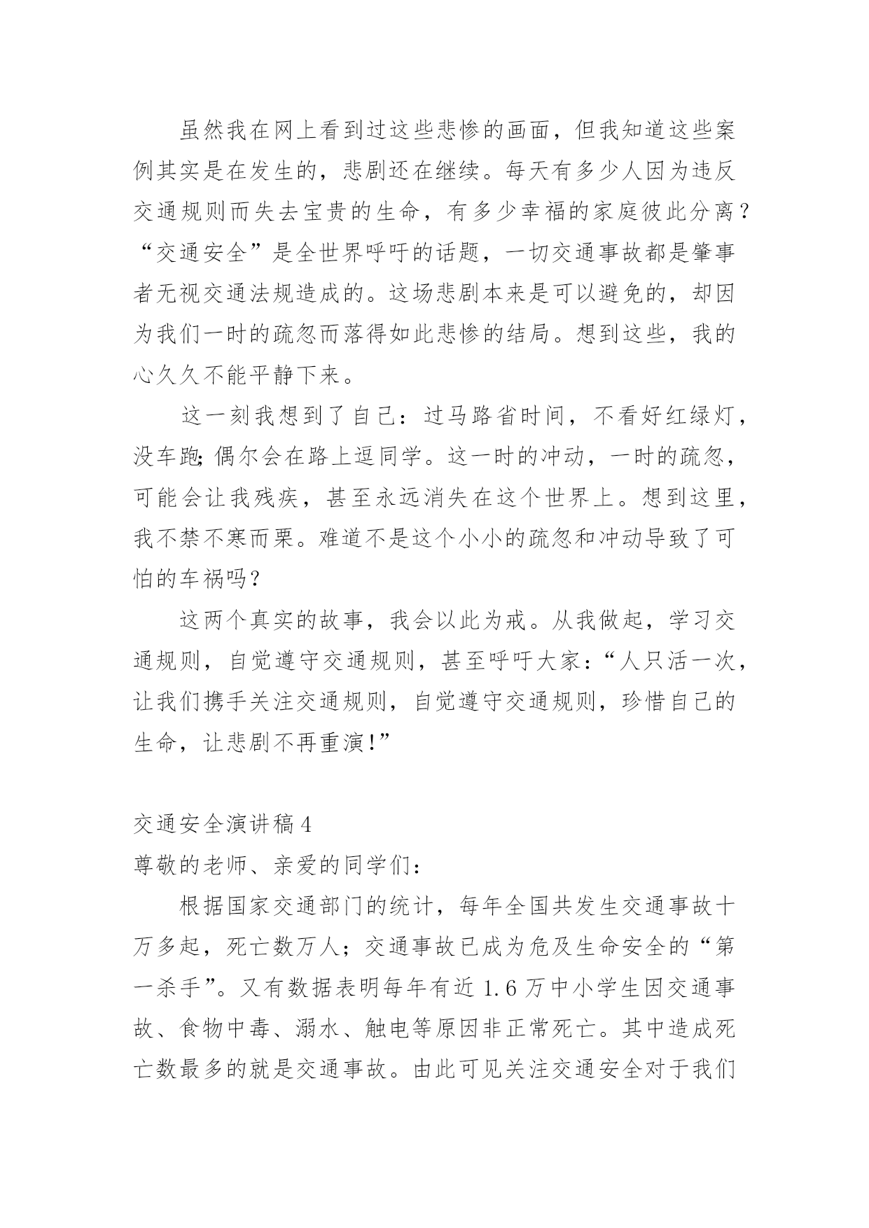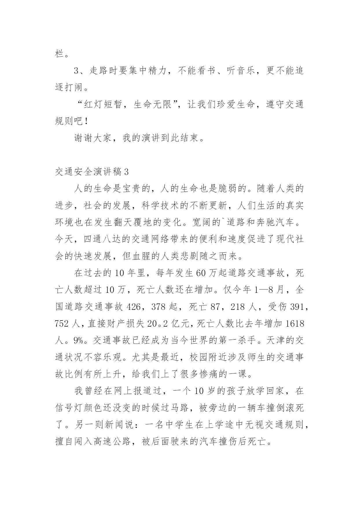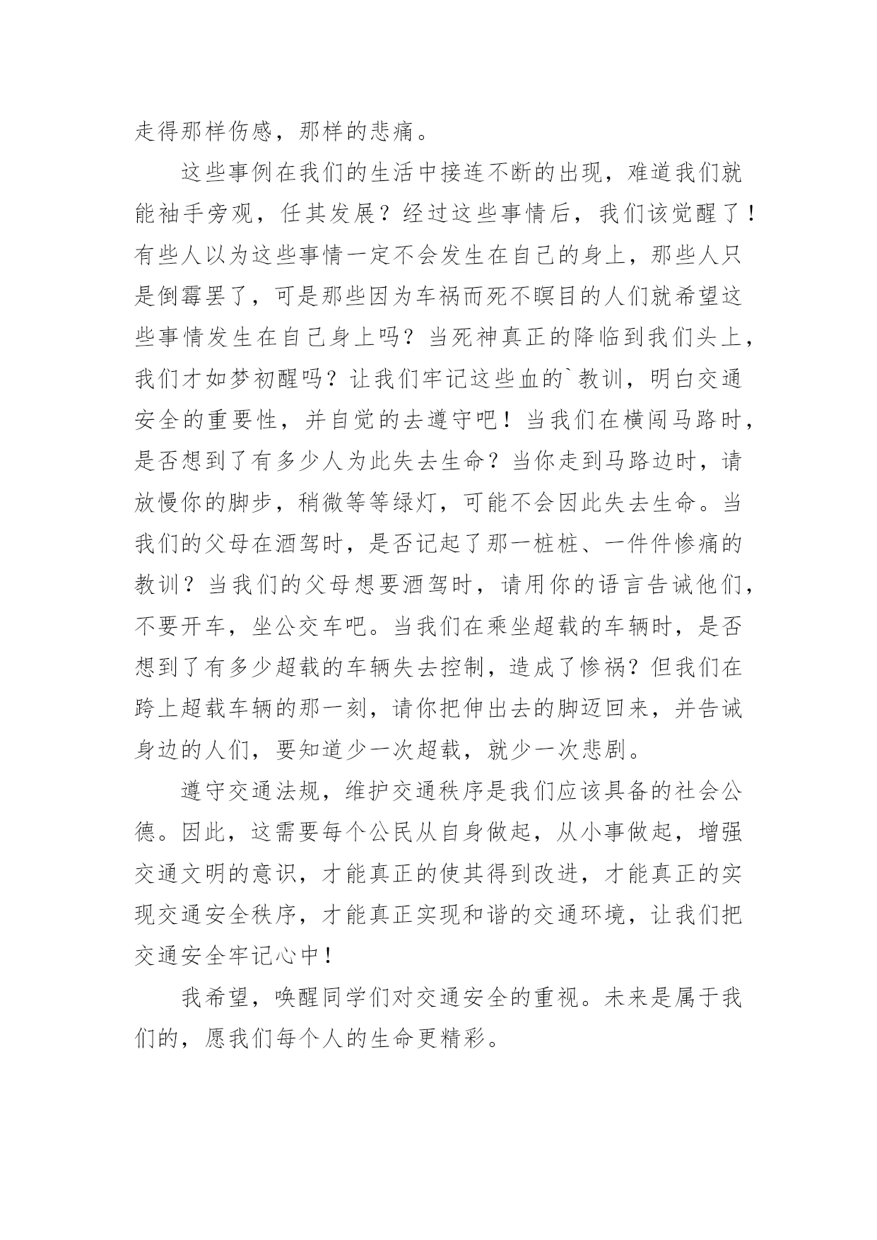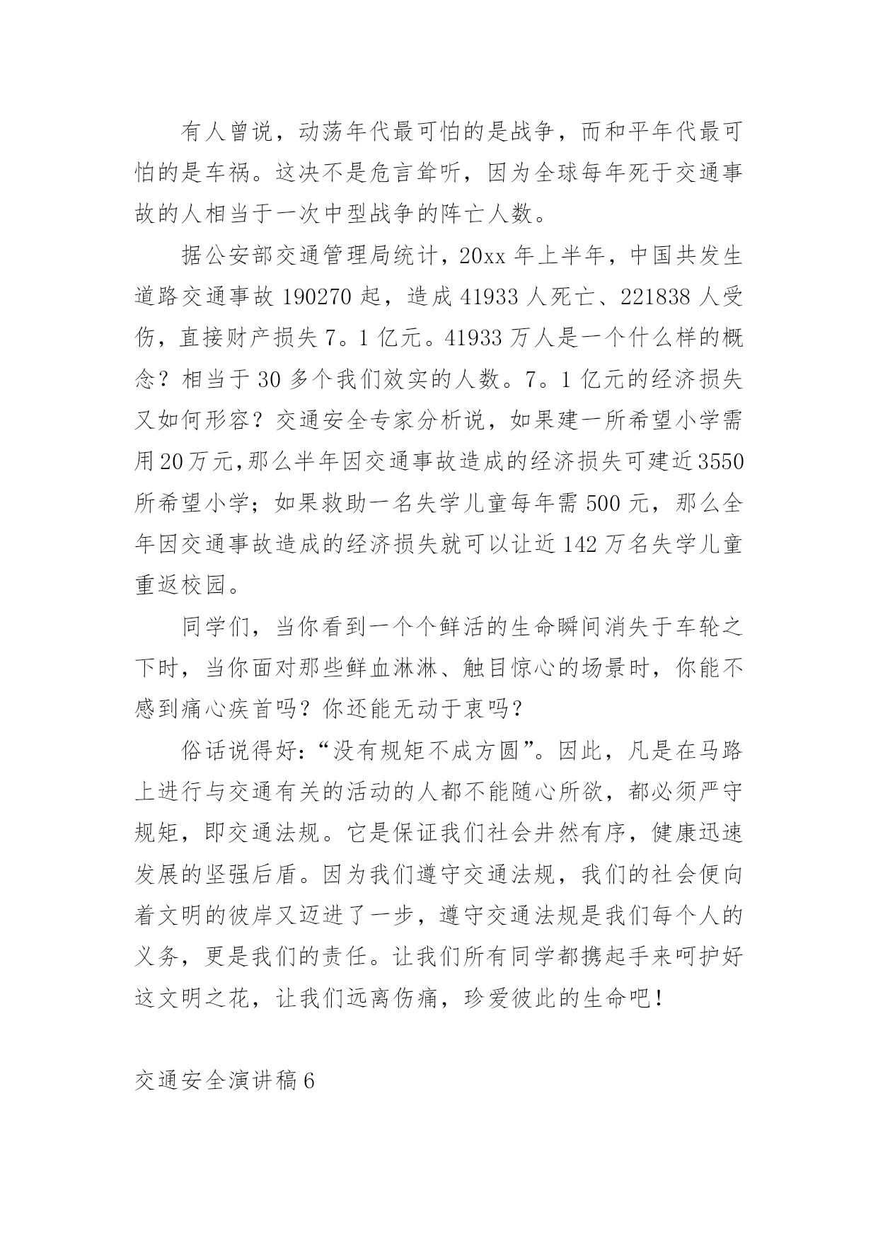 交通安全演讲稿交通安全演讲稿(15篇)演讲稿是一种实用性比较强的文稿,是为演讲准备的书面材料。在快速变化和不断变革的新时代,我们可以使用演讲稿的机会越来越多,演讲稿的注意事项有许多,你确定会写吗?以下是小编收集整理的交通安全演讲稿,仅供参考,欢迎大家阅读。交通安全演讲稿1老师、同学们:大家好!我今天演讲的题目是交通安全记心中。晨起,我走向川流不息的马路,望着车轮卷起的尘埃,那些事情就不断的在我脑海中回荡,曾经,一个六七岁的天真烂漫的小女孩,因为无知和童真,没有想到可能发生的悲剧。她为了一个小球冲向马路,就在刚刚捡起的时候,一辆大卡车奔驰而过,小女孩倒在了卡车车轮下,刚刚还活泼可爱的小女孩,霎时,那柔弱的灵魂就悄悄地从她身边溜走了。她的亲人哭天喊地,可是,那又有什么用呢?惨祸已经酿成,哭泣也没有用,可怜的小女孩就葬身于车轮下……一辆载重汽车由于超载以至被滚下那万丈深渊,那轰隆声回响山谷,可那位年轻的司机却抛弃一切毫无声息的走了,走得那样伤感,那样的悲痛。这些事例在我们的生活中接连不断的出现,难道我们就能袖手旁观,任其发展?经过这些事情后,我们该觉醒了!有些人以为这些事情一定不会发生在自己的身上,那些人只是倒霉罢了,可是那些因为车祸而死不瞑目的人们就希望这些事情发生在自己身上吗?当死神真正的降临到我们头上,我们才如梦初醒吗?让我们牢记这些血的`教训,明白交通安全的重要性,并自觉的去遵守吧!当我们在横闯马路时,是否想到了有多少人为此失去生命?当你走到马路边时,请放慢你的脚步,稍微等等绿灯,可能不会因此失去生命。当我们的父母在酒驾时,是否记起了那一桩桩、一件件惨痛的教训?当我们的父母想要酒驾时,请用你的语言告诫他们,不要开车,坐公交车吧。当我们在乘坐超载的车辆时,是否想到了有多少超载的车辆失去控制,造成了惨祸?但我们在跨上超载车辆的那一刻,请你把伸出去的脚迈回来,并告诫身边的人们,要知道少一次超载,就少一次悲剧。遵守交通法规,维护交通秩序是我们应该具备的社会公德。因此,这需要每个公民从自身做起,从小事做起,增强交通文明的意识,才能真正的使其得到改进,才能真正的实现交通安全秩序,才能真正实现和谐的交通环境,让我们把交通安全牢记心中!我希望,唤醒同学们对交通安全的重视。未来是属于我们的,愿我们每个人的生命更精彩。交通安全演讲稿2敬爱的老师,亲爱的同学们:大家早上好!今天我演讲的题目是《交通安全伴我行》。安全,牵系着每个人的生命。每当我走在上学、放学的路上,看到身边飞驰而过的车辆,心里就会产生恐惧感。眼前浮现的一幕幕车毁人亡的画面让我感到害怕。大家可能看到过这样一个报道:20xx年11月14日,山西沁源县第二中学的学生们像往常一样正在沿着马路跑操。突然间,一辆大货车横冲直撞的碾向跑操的队伍,导致21名师生遇难。许多家长听到噩耗传来,伤心欲绝的奔向现场。可是,无论亲人怎样撕心裂肺的呼喊,他们永远也不会醒来了。这血的教训是多么深刻,多么惨痛啊!然而,如此的事故还有很多。据统计,我国每年因车祸死亡的儿童人数约20000人,平均不到半小时就有一名儿童葬身在车轮下,这是多么惊人的数字。而在这惊心触目的数字背后,又有多少个痛不欲生的亲人和多少个永远失去欢乐的家庭!想到这些,我抑制不住内心的`情感,为遇难者流下同情的泪水,对肇事者产生无比的愤恨!然而,这些交通事故的发生绝大多数都是因为人们不遵守交通规则而造成的。同学们,作为一名合格的少先队员,我们应该积极行动起来,从我做起,从身边做起。因此,我倡议:1、要认真遵守《小学生守则》和《交通法则》。2、过马路时要看红路灯、走斑马线,千万不能翻越护栏。3、走路时要集中精力,不能看书、听音乐,更不能追逐打闹。“红灯短暂,生命无限”,让我们珍爱生命,遵守交通规则吧!谢谢大家,我的演讲到此结束。交通安全演讲稿3人的生命是宝贵的,人的生命也是脆弱的。随着人类的进步,社会的发展,科学技术的不断更新,人们生活的真实环境也在发生翻天覆地的变化。宽阔的`道路和奔驰汽车。今天,四通八达的交通网络带来的便利和速度促进了现代社会的快速发展,但血腥的人类悲剧随之而来。在过去的10年里,每年发生60万起道路交通事故,死亡人数超过10万,死亡人数还在增加。仅今年1—8月,全国道路交通事故426,378起,死亡87,218人,受伤391,752人,直接财产损失20。2亿元,死亡人数比去年增加1618人。9%。交通事故已经成为当今世界的第一杀手。天津的交通状况不容乐观。尤其是最近,校园附近涉及师生的交通事故比例有所上升,给我们上了很多惨痛的一课。我曾经在网上报道过,一个10岁的孩子放学回家,在信号灯颜色还没变的时候过马路,被旁边的一辆车撞倒滚死了。另一则新闻说:一名中学生在上学途中无视交通规则,擅自闯入高速公路,被后面驶来的汽车撞伤后死亡