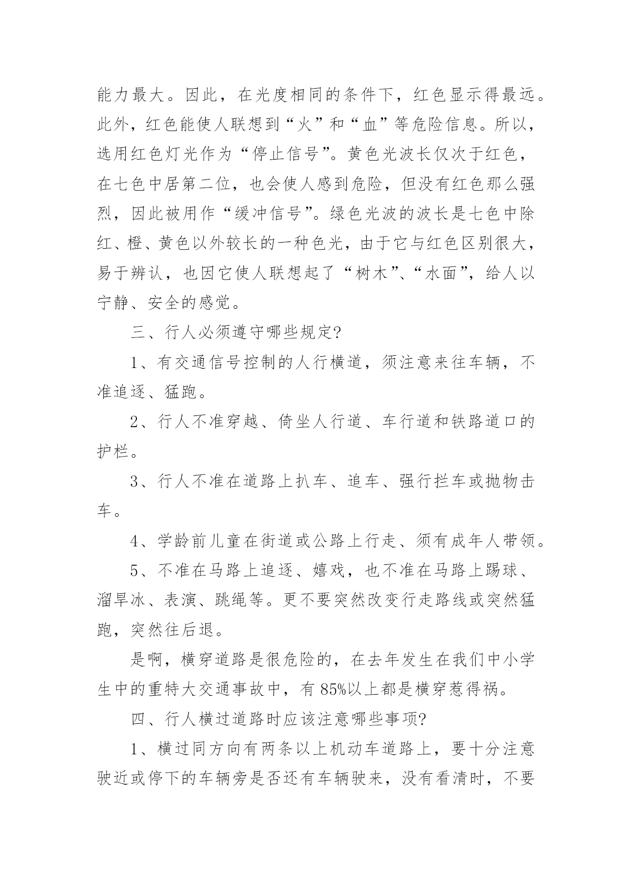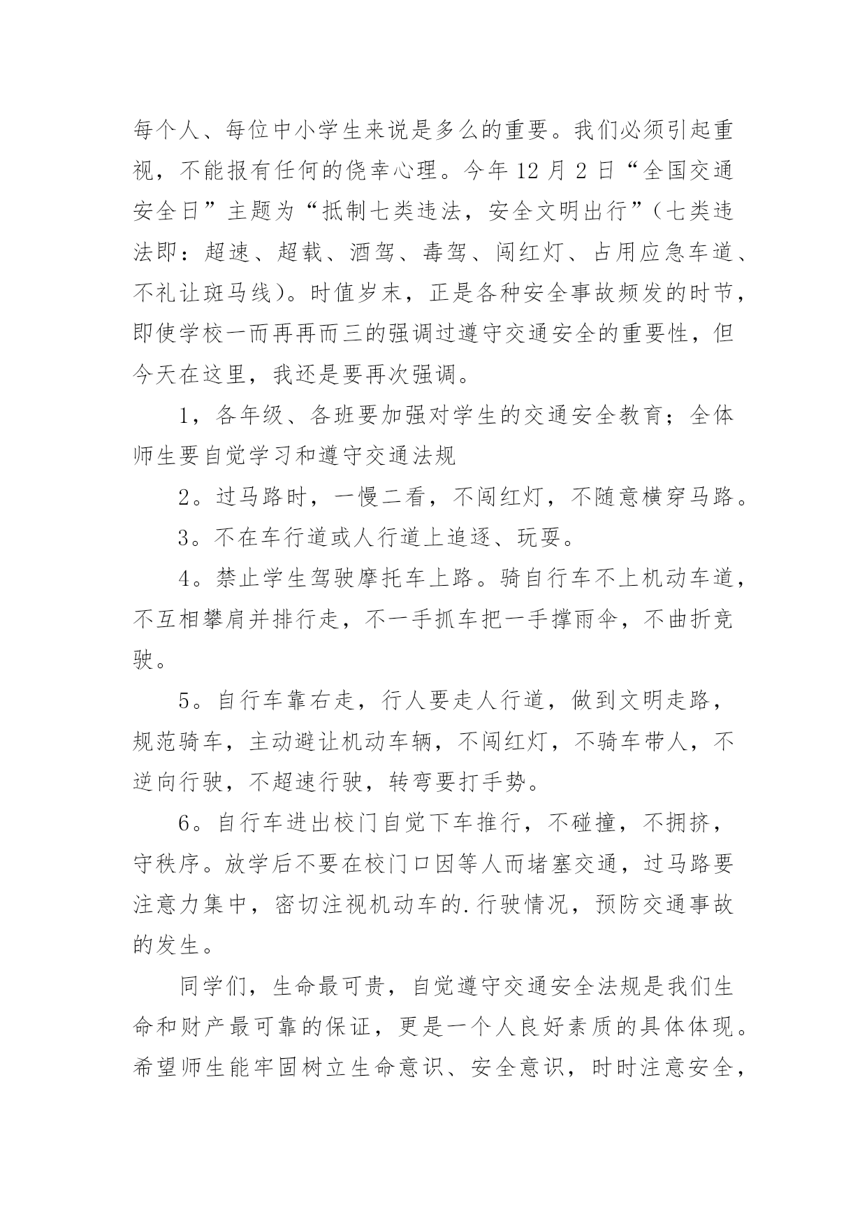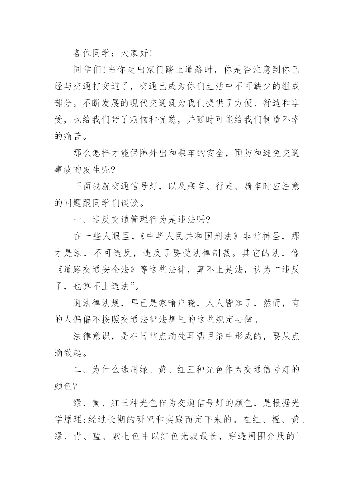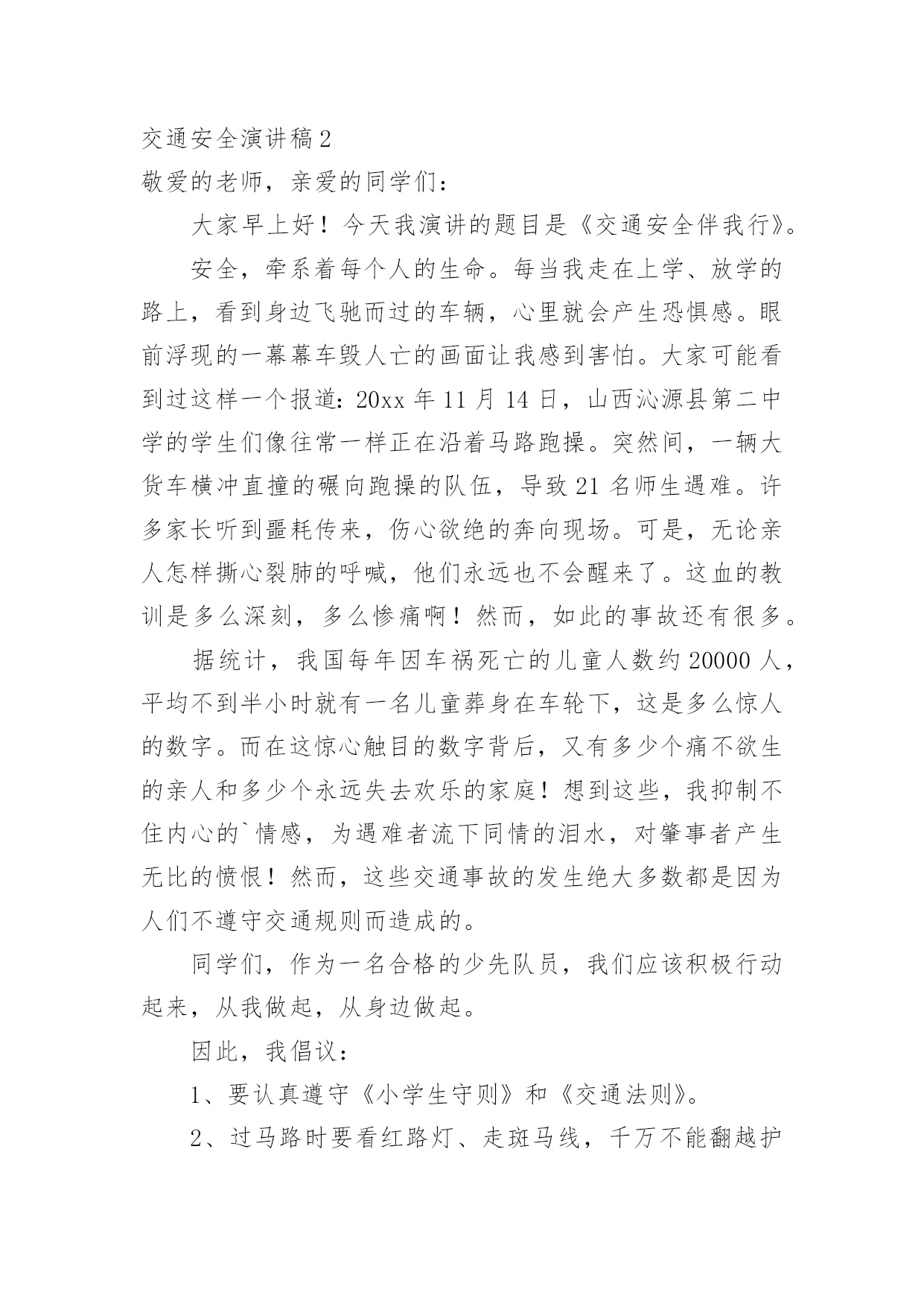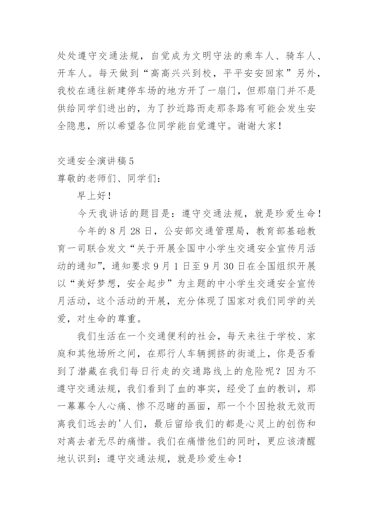 交通安全演讲稿交通安全演讲稿(15篇)演讲稿是一种实用性比较强的文稿,是为演讲准备的书面材料。在快速变化和不断变革的新时代,我们可以使用演讲稿的机会越来越多,演讲稿的注意事项有许多,你确定会写吗?以下是小编收集整理的交通安全演讲稿,仅供参考,欢迎大家阅读。交通安全演讲稿1老师、同学们:大家好!我今天演讲的题目是交通安全记心中。晨起,我走向川流不息的马路,望着车轮卷起的尘埃,那些事情就不断的在我脑海中回荡,曾经,一个六七岁的天真烂漫的小女孩,因为无知和童真,没有想到可能发生的悲剧。她为了一个小球冲向马路,就在刚刚捡起的时候,一辆大卡车奔驰而过,小女孩倒在了卡车车轮下,刚刚还活泼可爱的小女孩,霎时,那柔弱的灵魂就悄悄地从她身边溜走了。她的亲人哭天喊地,可是,那又有什么用呢?惨祸已经酿成,哭泣也没有用,可怜的小女孩就葬身于车轮下……一辆载重汽车由于超载以至被滚下那万丈深渊,那轰隆声回响山谷,可那位年轻的司机却抛弃一切毫无声息的走了,走得那样伤感,那样的悲痛。这些事例在我们的生活中接连不断的出现,难道我们就能袖手旁观,任其发展?经过这些事情后,我们该觉醒了!有些人以为这些事情一定不会发生在自己的身上,那些人只是倒霉罢了,可是那些因为车祸而死不瞑目的人们就希望这些事情发生在自己身上吗?当死神真正的降临到我们头上,我们才如梦初醒吗?让我们牢记这些血的`教训,明白交通安全的重要性,并自觉的去遵守吧!当我们在横闯马路时,是否想到了有多少人为此失去生命?当你走到马路边时,请放慢你的脚步,稍微等等绿灯,可能不会因此失去生命。当我们的父母在酒驾时,是否记起了那一桩桩、一件件惨痛的教训?当我们的父母想要酒驾时,请用你的语言告诫他们,不要开车,坐公交车吧。当我们在乘坐超载的车辆时,是否想到了有多少超载的车辆失去控制,造成了惨祸?但我们在跨上超载车辆的那一刻,请你把伸出去的脚迈回来,并告诫身边的人们,要知道少一次超载,就少一次悲剧。遵守交通法规,维护交通秩序是我们应该具备的社会公德。因此,这需要每个公民从自身做起,从小事做起,增强交通文明的意识,才能真正的使其得到改进,才能真正的实现交通安全秩序,才能真正实现和谐的交通环境,让我们把交通安全牢记心中!我希望,唤醒同学们对交通安全的重视。未来是属于我们的,愿我们每个人的生命更精彩。交通安全演讲稿2敬爱的老师,亲爱的同学们:大家早上好!今天我演讲的题目是《交通安全伴我行》。安全,牵系着每个人的生命。每当我走在上学、放学的路上,看到身边飞驰而过的车辆,心里就会产生恐惧感。眼前浮现的一幕幕车毁人亡的画面让我感到害怕。大家可能看到过这样一个报道:20xx年11月14日,山西沁源县第二中学的学生们像往常一样正在沿着马路跑操。突然间,一辆大货车横冲直撞的碾向跑操的队伍,导致21名师生遇难。许多家长听到噩耗传来,伤心欲绝的奔向现场。可是,无论亲人怎样撕心裂肺的呼喊,他们永远也不会醒来了。这血的教训是多么深刻,多么惨痛啊!然而,如此的事故还有很多。据统计,我国每年因车祸死亡的儿童人数约20000人,平均不到半小时就有一名儿童葬身在车轮下,这是多么惊人的数字。而在这惊心触目的数字背后,又有多少个痛不欲生的亲人和多少个永远失去欢乐的家庭!想到这些,我抑制不住内心的`情感,为遇难者流下同情的泪水,对肇事者产生无比的愤恨!然而,这些交通事故的发生绝大多数都是因为人们不遵守交通规则而造成的。同学们,作为一名合格的少先队员,我们应该积极行动起来,从我做起,从身边做起。因此,我倡议:1、要认真遵守《小学生守则》和《交通法则》。2、过马路时要看红路灯、走斑马线,千万不能翻越护栏。3、走路时要集中精力,不能看书、听音乐,更不能追逐打闹。“红灯短暂,生命无限”,让我们珍爱生命,遵守交通规则吧!谢谢大家,我的演讲到此结束。交通安全演讲稿3人的生命是宝贵的,人的生命也是脆弱的。随着人类的进步,社会的发展,科学技术的不断更新,人们生活的真实环境也在发生翻天覆地的变化。宽阔的`道路和奔驰汽车。今天,四通八达的交通网络带来的便利和速度促进了现代社会的快速发展,但血腥的人类悲剧随之而来。在过去的10年里,每年发生60万起道路交通事故,死亡人数超过10万,死亡人数还在增加。仅今年1—8月,全国道路交通事故426,378起,死亡87,218人,受伤391,752人,直接财产损失20。2亿元,死亡人数比去年增加1618人。9%。交通事故已经成为当今世界的第一杀手。天津的交通状况不容乐观。尤其是最近,校园附近涉及师生的交通事故比例有所上升,给我们上了很多惨痛的一课。我曾经在网上报道过,一个10岁的孩子放学回家,在信号灯颜色还没变的时候过马路,被旁边的一辆车撞倒滚死了。另一则新闻说:一名中学生在上学途中无视交通规则,擅自闯入高速公路,被后面驶来的汽车撞伤后死亡