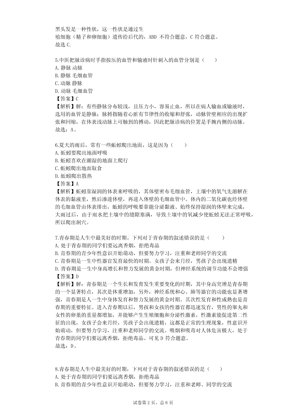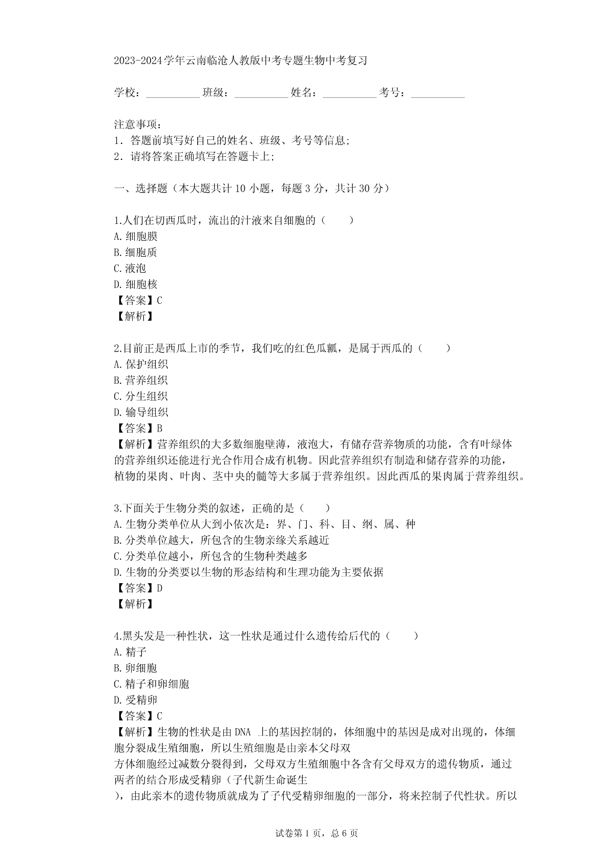 2023-2024学年云南临沧人教版中考专题生物中考复习(真题及答案).pdf