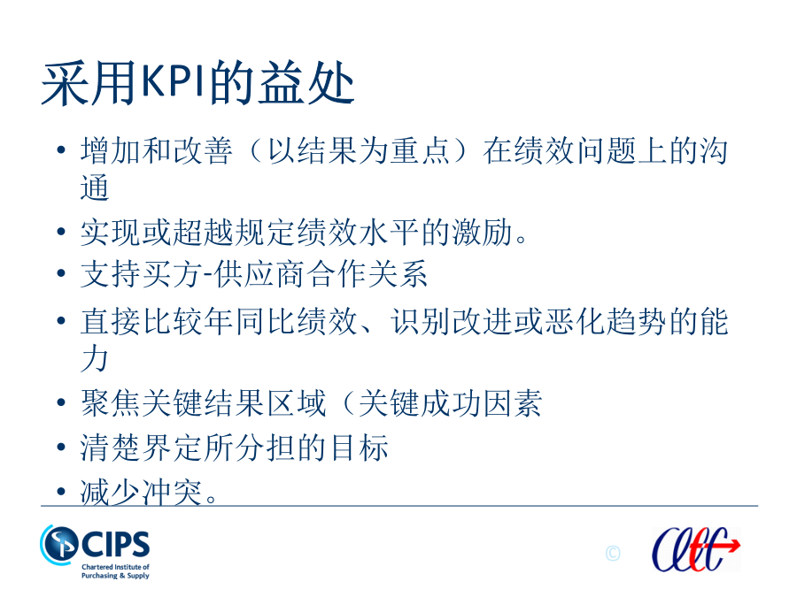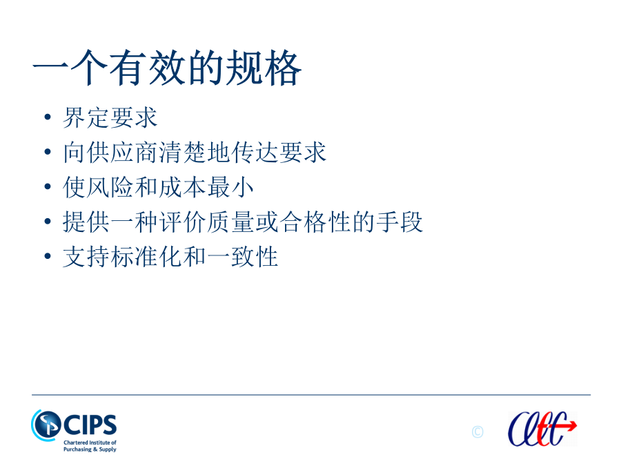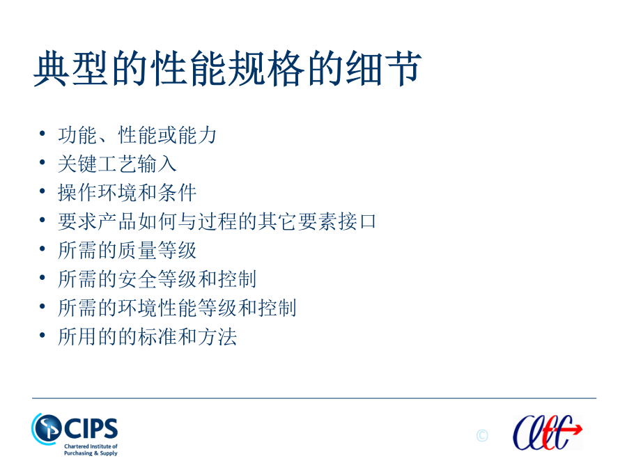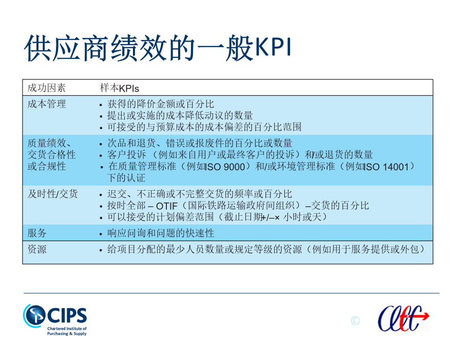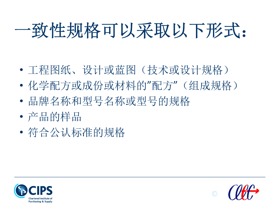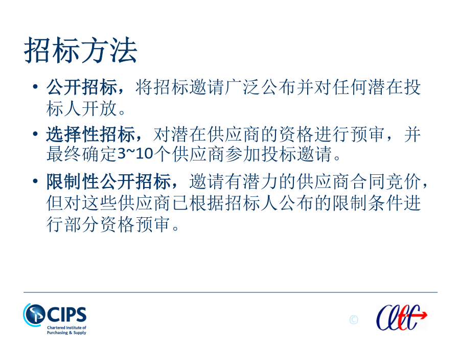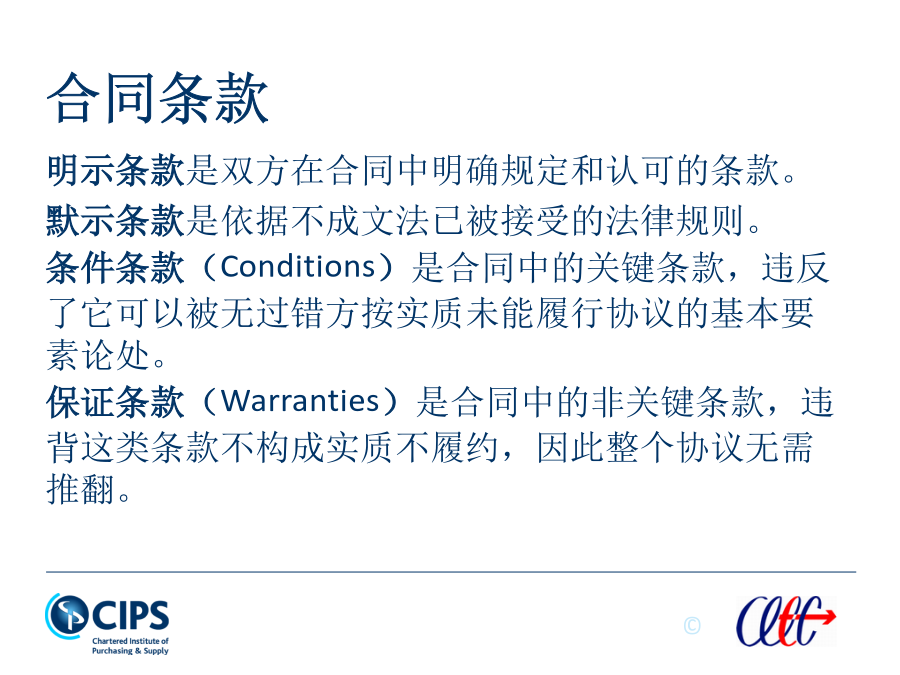 《采购与供应的谈判与合同》招标方法界定要求向供应商清楚地传达要求使风险和成本最小提供一种评价质量或合格性的手段支持标准化和一致性工程图纸、设计或蓝图(技术或设计规格)化学配方或成份或材料的”配方”(组成规格)品牌名称和型号名称或型号的规格产品的样品符合公认标准的规格功能、性能或能力关键工艺输入操作环境和条件要求产品如何与过程的其它要素接口所需的质量等级所需的安全等级和控制所需的环境性能等级和控制所用的的标准和方法所界定的绩效标准以前的绩效其它可对比组织(例如其它供应商)的绩效或标准标杆增加和改善(以结果为重点)在绩效问题上的沟通实现或超越规定绩效水平的激励。支持买方-供应商合作关系直接比较年同比绩效、识别改进或恶化趋势的能力聚焦关键结果区域(关键成功因素清楚界定所分担的目标减少冲突。供应商绩效的一般KPIKPI作为绩效的说明合同条款标准合同的优点和缺点健康与安全承诺。保密协议。分包商的使用。供应商人员。例如:1投标中标通知函2合同文件的范围3规格或需求声明4带有相关参考号、页码和版本号的技术图纸5一般合同条款6特殊合同条款7投标邀请、投标格式和附表8中标通知函所参考的通讯方式。协议(Agreement),采取要约(offer)和承诺(acceptance)。对价(Consideration)。建立法律关系的意图(Intentiontocreatelegalrelations)。立约能力(Contractualcapacity)。任何形式的承诺都是有效的,不论是口头、书面还是根据各方行为推断。沉默本身并不是承诺:承诺者必须具有某种行动。受要约人应负责确保适当地和清楚地向要约人传达承诺。承诺是对某个要约的全部条款的无条件同意(“是”)。对价必须是有价值的。对价必须是充分的,即它是得到法律认可的。不同商谈方对一致同意的内容具有不同的认识或记忆。对不适当或不利条款做出承诺。合同中的“错误”:即在合同条款中存在误解或歧义时缺乏真正的一致。合同因条款错误或出现歧义而无效。产生后续的误解和合同纠纷。缺乏据以衡量合规性和履约性的合同管理的书面条款。合同授予决定缺乏透明性和审计跟踪。陈述是在何时做出的。在做出陈述后是否将其付诸书面。陈述对接受者的重要性。做出陈述的人是否已经建议另一方核查其有效性。做出陈述的人是否具有有关陈述主题内容的特殊知识或技能。表述必须已经诱发了合同。无过失一方不得取消合同,如果:他不知道该误述。他知道表述是假的。他没有依赖该表述。表述是在合同形成后做出的。对货物价值的一定程度的夸大是谈判过程可以接受的一个要素,但“过分”的陈述会带来被指不合理及不诚实的风险。在面对你的供应商准备的公式时,不要仅依赖它的市场知识。应自己进行研究,并且如果你不同意供应商的数字,应向他们提出质疑并要求看一下支持证据。应记住,货物售出概不退换。如果编写公式,应确保所用的所有定价或市场信息是准确和最新的,并且如果你需要在公式纳入各种估计的价值,应诚实为之,不要采用你知道是或怀疑是不正确的信息。什么构成一个有效要约?要约是可供承诺的“开放”要约吗?要约邀请和谈判邀请一般合同结构一般合同结构(续)发送所有询价的确认书。发送所有订单的确认书。和供应商进行合同谈判,明确条款,达成协议。检查所有发生了更改的条款和条件(即反要约),这些有可能是附加在供应商的文件中的。在收到商品的时候,在上面盖上刻有“依据买方的条款接收”字样的章。在国际贸易交易中一份要约或承诺何时变为有效?被销售货物的物权、产权和风险何时从海外卖方转移给本国买方?在货物与合同不符时一方具有什么权利?供应合同协议它使买方和供应商对某一特定情形下、针对规定要求的供货相关的所有条款承担责任。它使买方和供应商仅对某一特定情形下、针对规定要求的采购和供货承担责任。向更广泛的供应商基地开放市场是指:你不会遗漏掉可能更具有竞争力的潜在供应商。你也许会发现一些创新的解决方案,如果不这样做可能会失去发现这些方案的机会。你将能避免因大供应商数量不断减少所导致的市场不景气的危险。总括订单(blanketorder)框架协议(Frameworkagreements)分订单(Call-offs)和微型竞争框架协议的例子服务合同服务水平协议《英国货物和服务供应法案1982》服务合同和外包合同外包的要求外包合同条款租赁还是购买的决策租赁还是购买的决策什么是谈判?谈判说服。让步。逼迫。解决问题。一般供应源搜寻过程采用谈判还是竞争性招标?直接合同谈判合同和关系管理在解决冲突中的谈判冲突的来源团队管理利益相关者谈判的现场分门德娄(Mendelow)的势力/利益矩阵托马斯