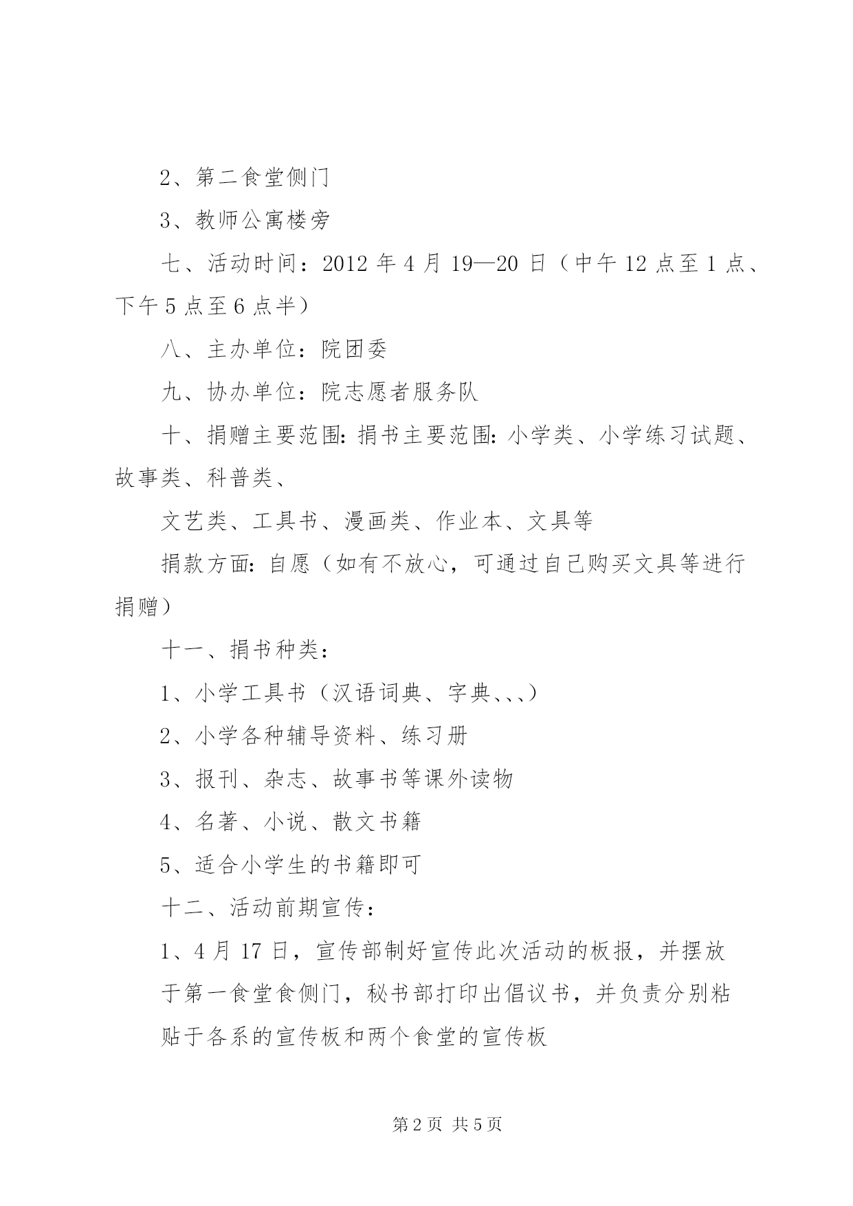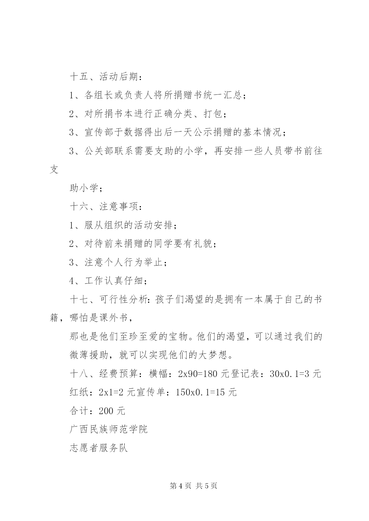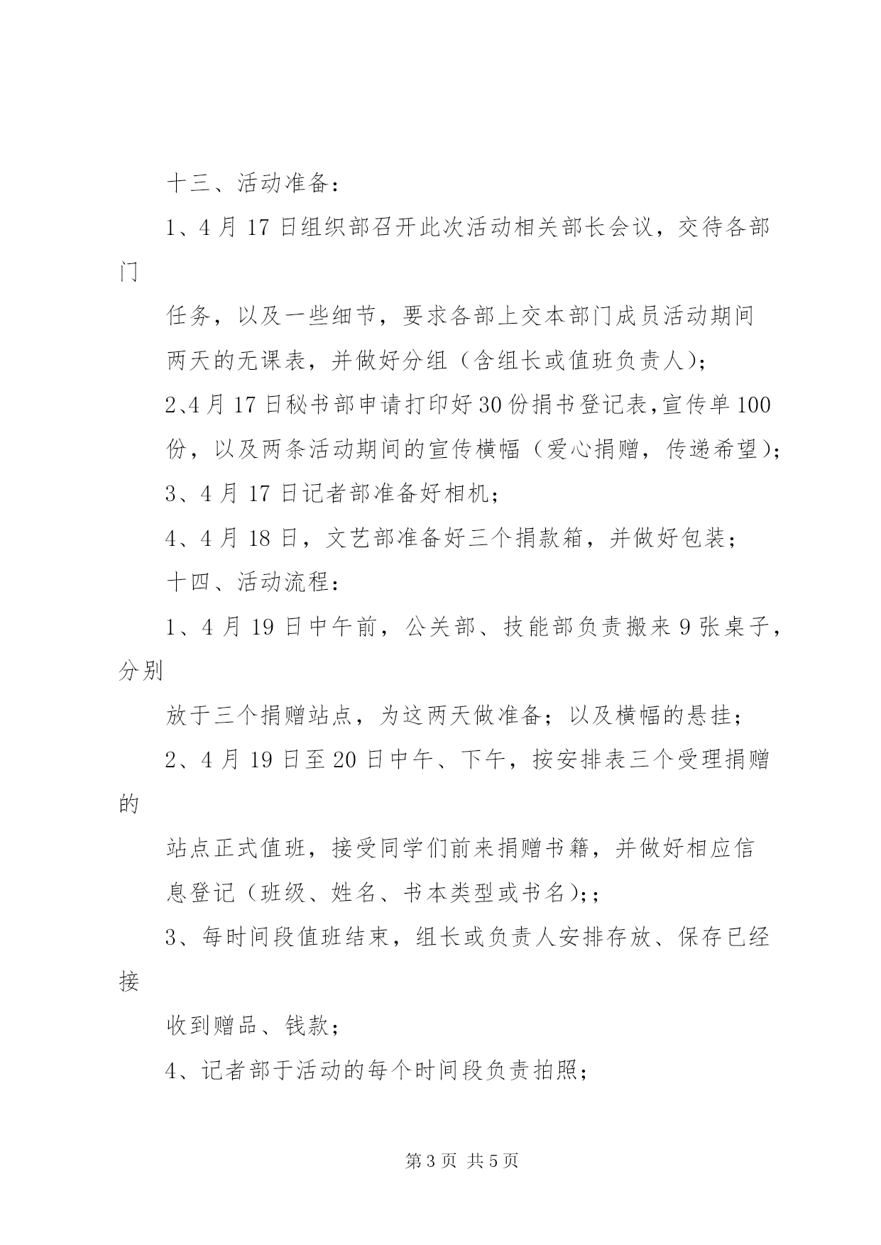 第PAGE\*Arabic\*MERGEFORMAT5页共NUMPAGES\*MERGEFORMAT5页学校”捐书活动方案献爱心捐赠活动策划方案一、活动背景:当清晨的第一缕阳光洒向地平线,铃声响起,我们大多数的同学不情愿的起床开始一天的学习生活了,手里拿着我们所要学习的课本,极不情愿的走近教室。然而,在一些地方,有一部分的孩子很想读书,可是他们没有所需要的课本,虽然经济的发展,到了今天,大多数人都有书读,但他们却一直在找寻,他们在期盼,期盼着自己也能像大多数孩子一样,手里拿着自己喜欢的书,脸上带着甜蜜的微笑。二、活动目的。书,是人类进步的象征;书,是传递知识和思想的载体。读书,可以提升人的素质内涵,更能给人带来希望。那么,让我们以书为桥梁,向那些没有书读的小孩子们捐出他们所期的图书吧。或许,我们的微不足道的举动能给幼小的他们带去一个希望。三、活动意义。通过本次捐赠活动,给那些没有书读的孩子带去春天的希望。四、活动主题:爱心捐赠,传递希望五、活动对象:学院全体师生六、活动地点:1、第一食堂正门2、第二食堂侧门3、教师公寓楼旁七、活动时间:2012年4月19—20日(中午12点至1点、下午5点至6点半)八、主办单位:院团委九、协办单位:院志愿者服务队十、捐赠主要范围:捐书主要范围:小学类、小学练习试题、故事类、科普类、文艺类、工具书、漫画类、作业本、文具等捐款方面:自愿(如有不放心,可通过自己购买文具等进行捐赠)十一、捐书种类:1、小学工具书(汉语词典、字典、、、)2、小学各种辅导资料、练习册3、报刊、杂志、故事书等课外读物4、名著、小说、散文书籍5、适合小学生的书籍即可十二、活动前期宣传:1、4月17日,宣传部制好宣传此次活动的板报,并摆放于第一食堂食侧门,秘书部打印出倡议书,并负责分别粘贴于各系的宣传板和两个食堂的宣传板十三、活动准备:1、4月17日组织部召开此次活动相关部长会议,交待各部门任务,以及一些细节,要求各部上交本部门成员活动期间两天的无课表,并做好分组(含组长或值班负责人);2、4月17日秘书部申请打印好30份捐书登记表,宣传单100份,以及两条活动期间的宣传横幅(爱心捐赠,传递希望);3、4月17日记者部准备好相机;4、4月18日,文艺部准备好三个捐款箱,并做好包装;十四、活动流程:1、4月19日中午前,公关部、技能部负责搬来9张桌子,分别放于三个捐赠站点,为这两天做准备;以及横幅的悬挂;2、4月19日至20日中午、下午,按安排表三个受理捐赠的站点正式值班,接受同学们前来捐赠书籍,并做好相应信息登记(班级、姓名、书本类型或书名);;3、每时间段值班结束,组长或负责人安排存放、保存已经接收到赠品、钱款;4、记者部于活动的每个时间段负责拍照;十五、活动后期:1、各组长或负责人将所捐赠书统一汇总;2、对所捐书本进行正确分类、打包;3、宣传部于数据得出后一天公示捐赠的基本情况;3、公关部联系需要支助的小学,再安排一些人员带书前往支助小学;十六、注意事项:1、服从组织的活动安排;2、对待前来捐赠的同学要有礼貌;3、注意个人行为举止;4、工作认真仔细;十七、可行性分析:孩子们渴望的是拥有一本属于自己的书籍,哪怕是课外书,那也是他们至珍至爱的宝物。他们的渴望,可以通过我们的微薄援助,就可以实现他们的大梦想。十八、经费预算:横幅:2x90=180元登记表:30x0.1=3元红纸:2x1=2元宣传单:150x0.1=15元合计:200元广西民族师范学院志愿者服务队2012年2月20日