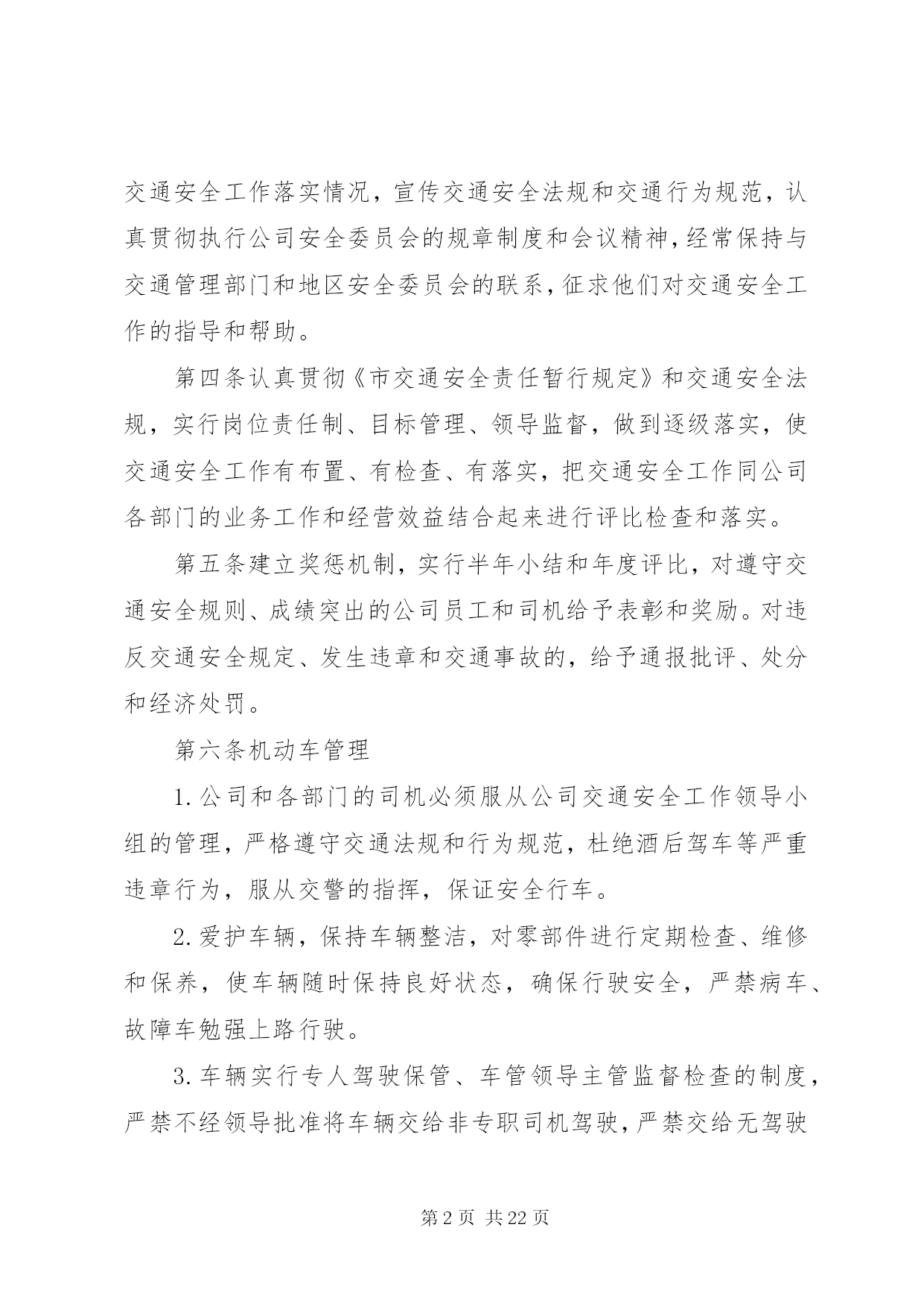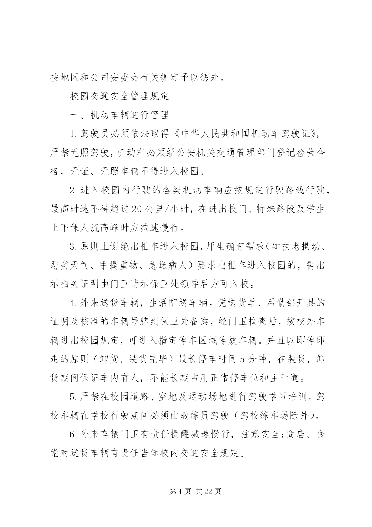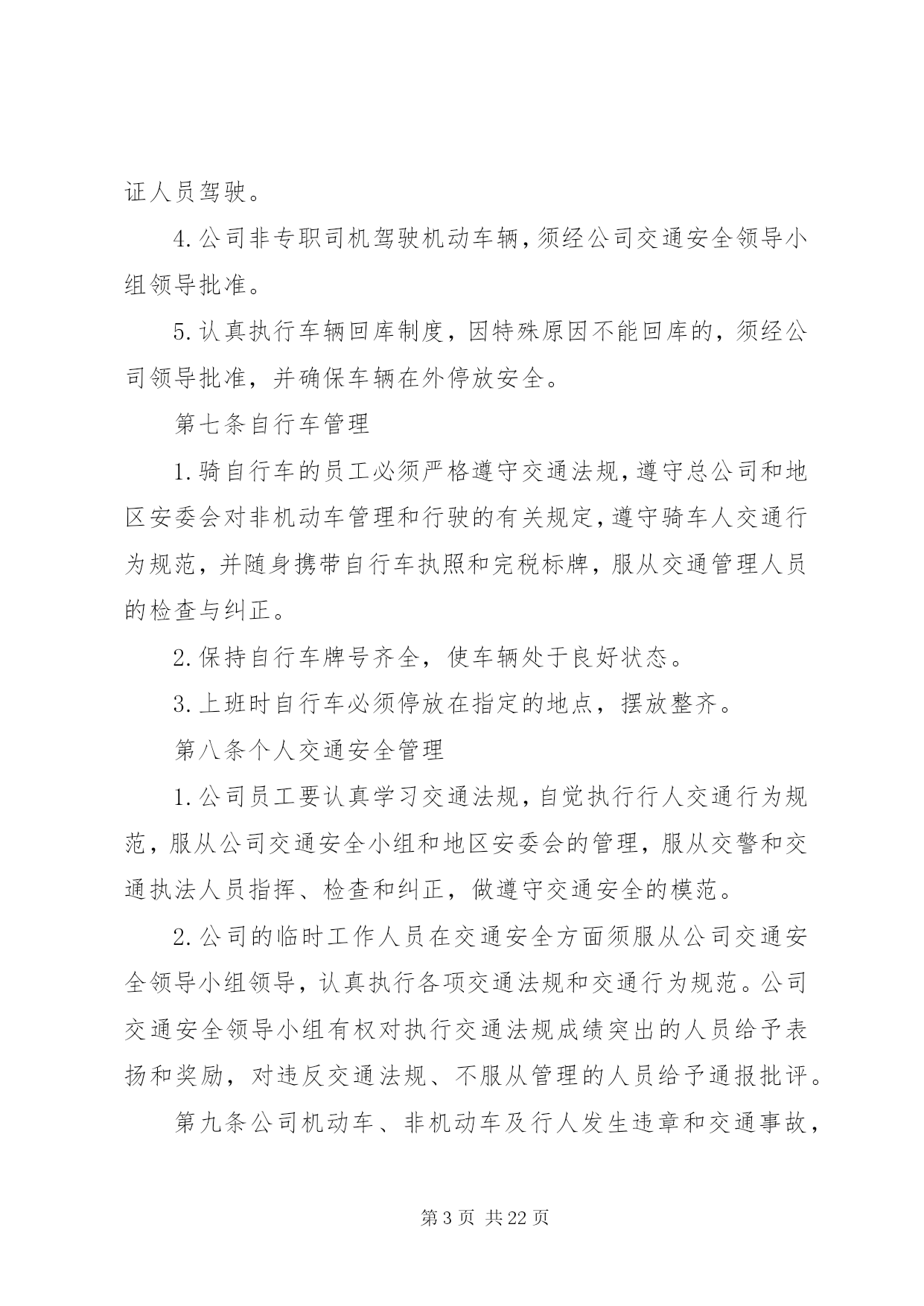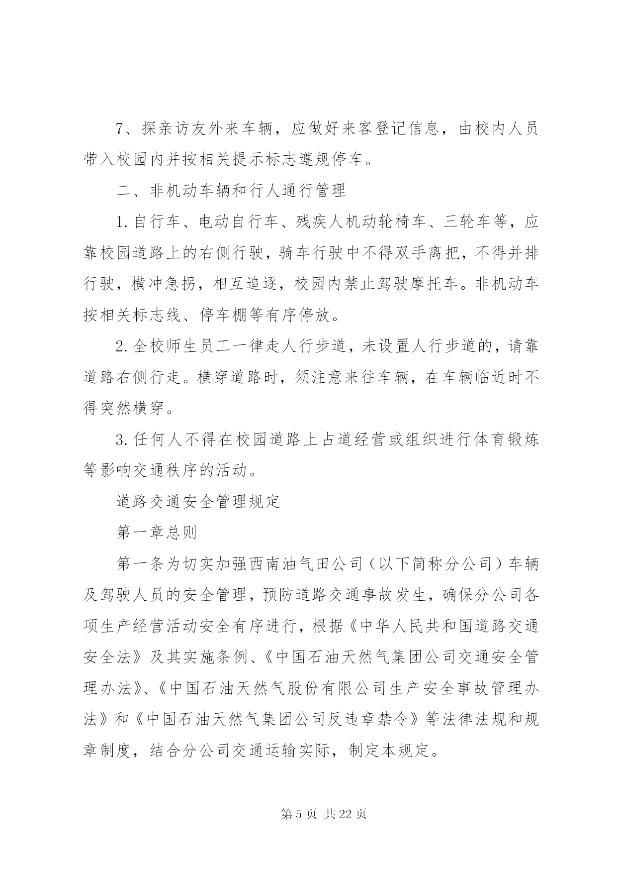 第PAGE\*Arabic\*MERGEFORMAT22页共NUMPAGES\*MERGEFORMAT22页企业交通安全管理规定企业交通安全管理规定第一条为加强公司交通安全管理工作,落实交通安全责任制,认真贯彻交通安全工作安全第一,预防为主的方针,特制定本规定。第二条统一领导,部门负责,建立健全交通安全领导组织机构。1.公司副总经理全面负责公司交通安全工作。2.各部门主要领导全面负责本部门交通安全工作。3.各部门确定一名交通安全员负责交通安全工作的检查和实施。4.公司办公室确定一名交通安全员负责本部门公司机动车辆管理、交通安全工作的实施情况的检查以及同交通管理部门和地区安全委员会的日常工作联系。5.由公司交通安全负责人、各部门的交通安全负责人和车管主任组成公司交通安全工作领导小组,领导、部署和检查公司的交通安全工作。6.公司交通安全工作领导小组的日常工作地点设在公司办公室,办公室主任为交通安全工作领导小组常务副组长。第三条公司和各部门主要领导,须将交通安全工作列人工作议事日程。定期召开交通安全工作小组会议和安全员会议,检查交通安全工作落实情况,宣传交通安全法规和交通行为规范,认真贯彻执行公司安全委员会的规章制度和会议精神,经常保持与交通管理部门和地区安全委员会的联系,征求他们对交通安全工作的指导和帮助。第四条认真贯彻《市交通安全责任暂行规定》和交通安全法规,实行岗位责任制、目标管理、领导监督,做到逐级落实,使交通安全工作有布置、有检查、有落实,把交通安全工作同公司各部门的业务工作和经营效益结合起来进行评比检查和落实。第五条建立奖惩机制,实行半年小结和年度评比,对遵守交通安全规则、成绩突出的公司员工和司机给予表彰和奖励。对违反交通安全规定、发生违章和交通事故的,给予通报批评、处分和经济处罚。第六条机动车管理1.公司和各部门的司机必须服从公司交通安全工作领导小组的管理,严格遵守交通法规和行为规范,杜绝酒后驾车等严重违章行为,服从交警的指挥,保证安全行车。2.爱护车辆,保持车辆整洁,对零部件进行定期检查、维修和保养,使车辆随时保持良好状态,确保行驶安全,严禁病车、故障车勉强上路行驶。3.车辆实行专人驾驶保管、车管领导主管监督检查的制度,严禁不经领导批准将车辆交给非专职司机驾驶,严禁交给无驾驶证人员驾驶。4.公司非专职司机驾驶机动车辆,须经公司交通安全领导小组领导批准。5.认真执行车辆回库制度,因特殊原因不能回库的,须经公司领导批准,并确保车辆在外停放安全。第七条自行车管理1.骑自行车的员工必须严格遵守交通法规,遵守总公司和地区安委会对非机动车管理和行驶的有关规定,遵守骑车人交通行为规范,并随身携带自行车执照和完税标牌,服从交通管理人员的检查与纠正。2.保持自行车牌号齐全,使车辆处于良好状态。3.上班时自行车必须停放在指定的地点,摆放整齐。第八条个人交通安全管理1.公司员工要认真学习交通法规,自觉执行行人交通行为规范,服从公司交通安全小组和地区安委会的管理,服从交警和交通执法人员指挥、检查和纠正,做遵守交通安全的模范。2.公司的临时工作人员在交通安全方面须服从公司交通安全领导小组领导,认真执行各项交通法规和交通行为规范。公司交通安全领导小组有权对执行交通法规成绩突出的人员给予表扬和奖励,对违反交通法规、不服从管理的人员给予通报批评。第九条公司机动车、非机动车及行人发生违章和交通事故,按地区和公司安委会有关规定予以惩处。校园交通安全管理规定一、机动车辆通行管理1.驾驶员必须依法取得《中华人民共和国机动车驾驶证》,严禁无照驾驶,机动车必须经公安机关交通管理部门登记检验合格,无证、无照车辆不得进入校园。2.进入校园内行驶的各类机动车辆应按规定行驶路线行驶,最高时速不得超过20公里/小时,在进出校门、特殊路段及学生上下课人流高峰时应减速慢行。3.原则上谢绝出租车进入校园,师生确有需求(如扶老携幼、恶劣天气、手提重物、急送病人)要求出租车进入校园的,需出示相关证明由门卫请示保卫处领导后方可入校。4.外来送货车辆,生活配送车辆。凭送货单、后勤部开具的证明及核准的车辆号牌到保卫处备案,经门卫检查后,按校外车辆进出校园规定,可进入指定停车区域停放车辆。并且以即停即走的原则(卸货、装货完毕)最长停车时间5分钟,在装货,卸货期间保证车内有人,不能长期占用正常停车位和主干道。5.严禁在校园道路、空地及运动场地进行驾驶学习培训。驾校车辆在学校行驶期间必须由教练员驾驶(驾校练车场除外)。6.外来车辆门卫有责任提醒减速慢行,注意安全;商店、食堂对送货车辆有责任告知校内交通安全规定。7、探亲访友外来车辆,应做好来客登记信息,由校内人员带入校园内并按相关提示标志遵规停车。二、非机动车辆和行人通行管理1.自行车、电动自行车、残疾人机动轮椅车、