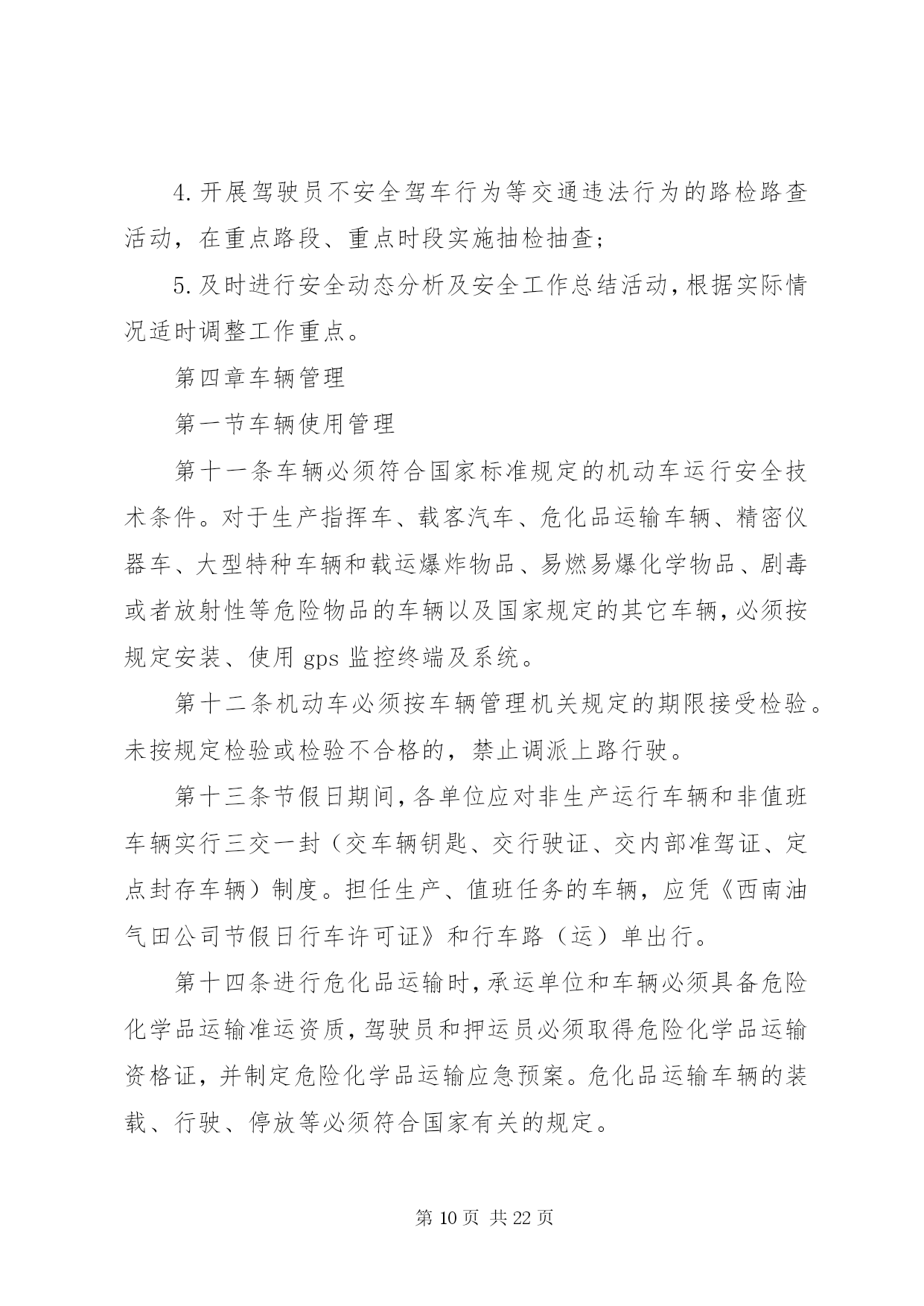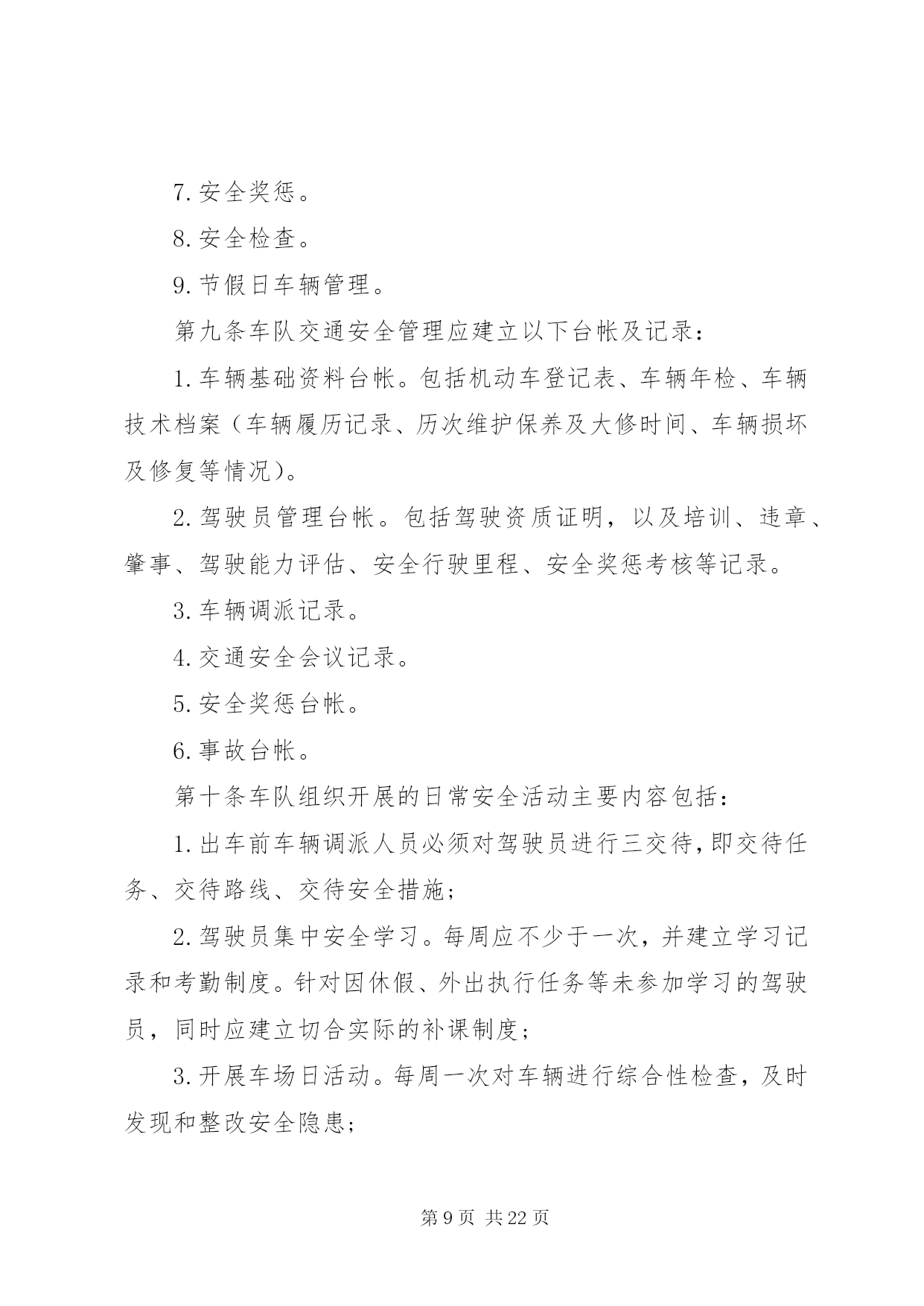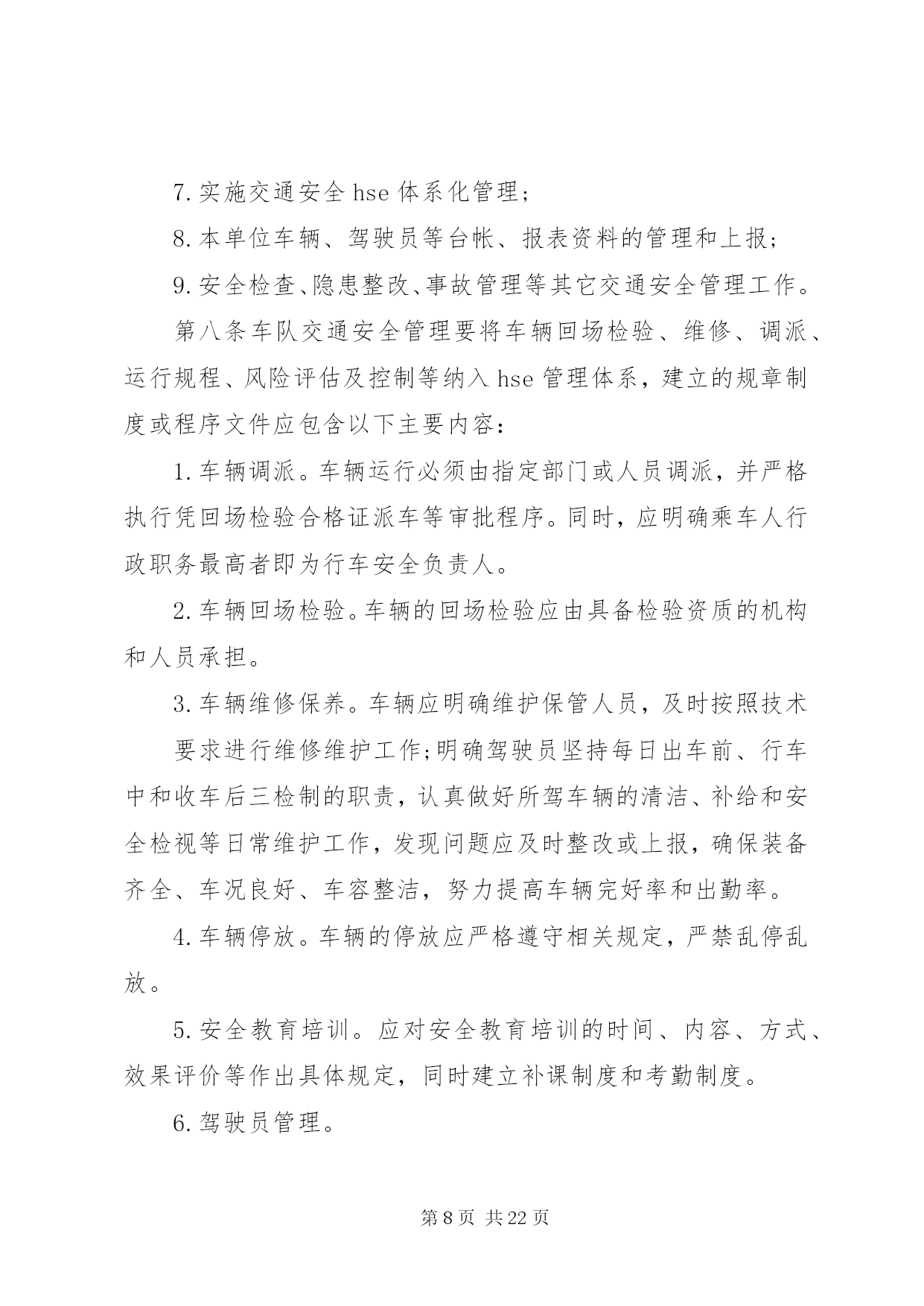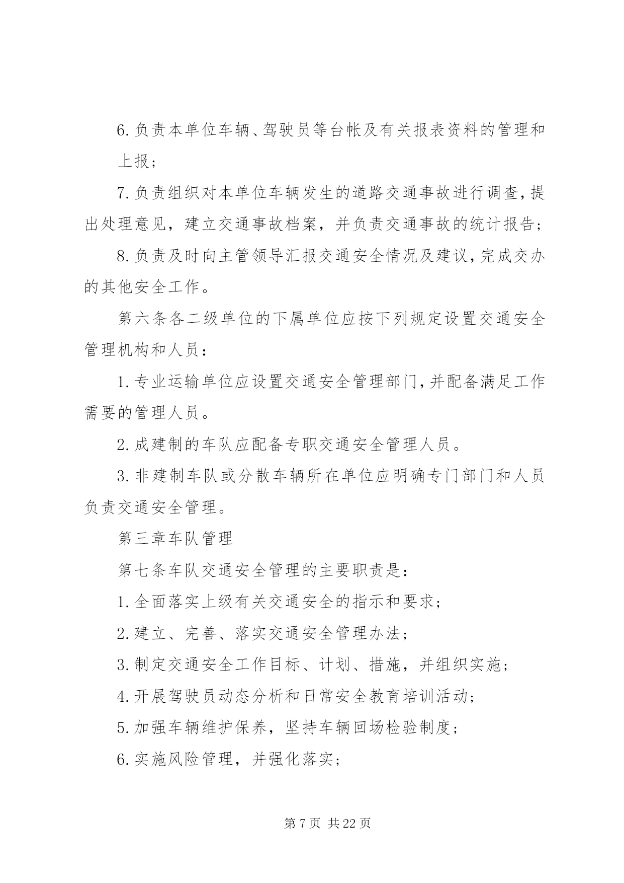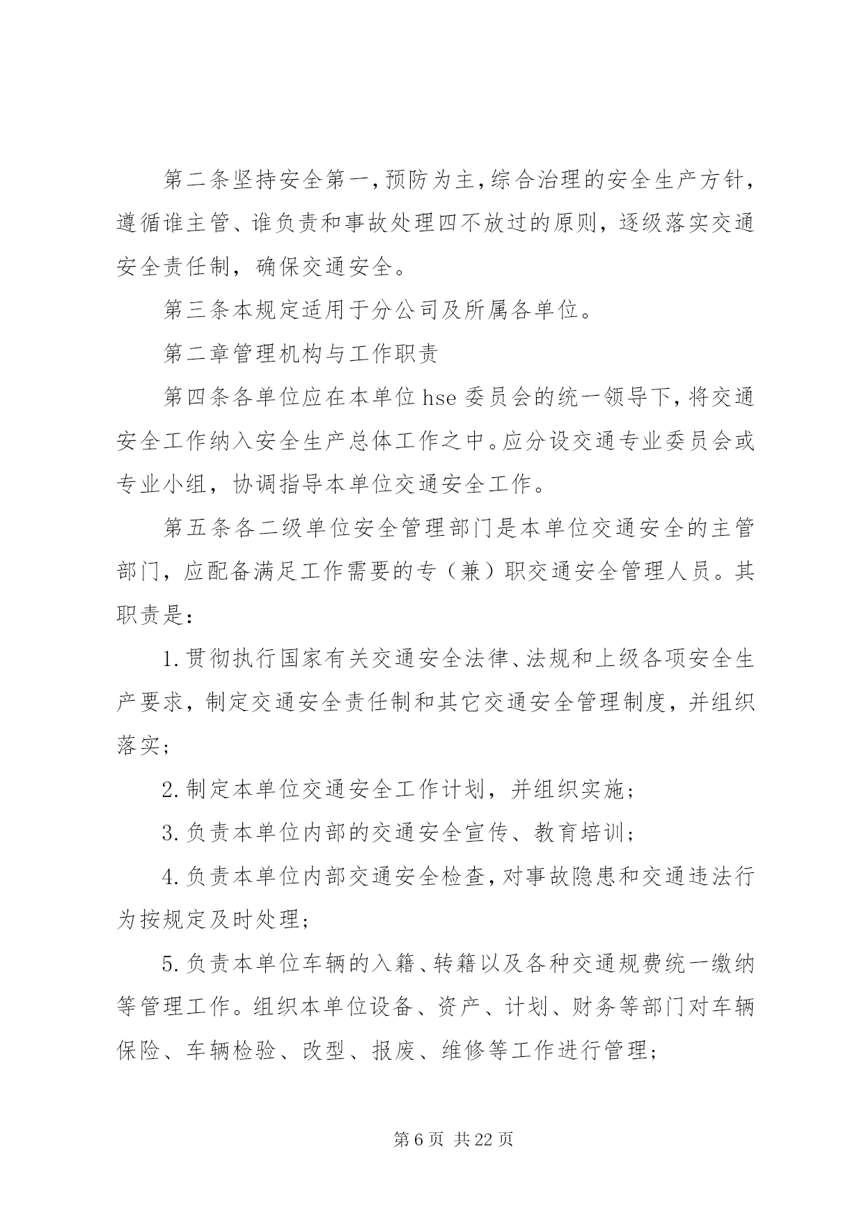 第PAGE\*Arabic\*MERGEFORMAT22页共NUMPAGES\*MERGEFORMAT22页企业交通安全管理规定企业交通安全管理规定第一条为加强公司交通安全管理工作,落实交通安全责任制,认真贯彻交通安全工作安全第一,预防为主的方针,特制定本规定。第二条统一领导,部门负责,建立健全交通安全领导组织机构。1.公司副总经理全面负责公司交通安全工作。2.各部门主要领导全面负责本部门交通安全工作。3.各部门确定一名交通安全员负责交通安全工作的检查和实施。4.公司办公室确定一名交通安全员负责本部门公司机动车辆管理、交通安全工作的实施情况的检查以及同交通管理部门和地区安全委员会的日常工作联系。5.由公司交通安全负责人、各部门的交通安全负责人和车管主任组成公司交通安全工作领导小组,领导、部署和检查公司的交通安全工作。6.公司交通安全工作领导小组的日常工作地点设在公司办公室,办公室主任为交通安全工作领导小组常务副组长。第三条公司和各部门主要领导,须将交通安全工作列人工作议事日程。定期召开交通安全工作小组会议和安全员会议,检查交通安全工作落实情况,宣传交通安全法规和交通行为规范,认真贯彻执行公司安全委员会的规章制度和会议精神,经常保持与交通管理部门和地区安全委员会的联系,征求他们对交通安全工作的指导和帮助。第四条认真贯彻《市交通安全责任暂行规定》和交通安全法规,实行岗位责任制、目标管理、领导监督,做到逐级落实,使交通安全工作有布置、有检查、有落实,把交通安全工作同公司各部门的业务工作和经营效益结合起来进行评比检查和落实。第五条建立奖惩机制,实行半年小结和年度评比,对遵守交通安全规则、成绩突出的公司员工和司机给予表彰和奖励。对违反交通安全规定、发生违章和交通事故的,给予通报批评、处分和经济处罚。第六条机动车管理1.公司和各部门的司机必须服从公司交通安全工作领导小组的管理,严格遵守交通法规和行为规范,杜绝酒后驾车等严重违章行为,服从交警的指挥,保证安全行车。2.爱护车辆,保持车辆整洁,对零部件进行定期检查、维修和保养,使车辆随时保持良好状态,确保行驶安全,严禁病车、故障车勉强上路行驶。3.车辆实行专人驾驶保管、车管领导主管监督检查的制度,严禁不经领导批准将车辆交给非专职司机驾驶,严禁交给无驾驶证人员驾驶。4.公司非专职司机驾驶机动车辆,须经公司交通安全领导小组领导批准。5.认真执行车辆回库制度,因特殊原因不能回库的,须经公司领导批准,并确保车辆在外停放安全。第七条自行车管理1.骑自行车的员工必须严格遵守交通法规,遵守总公司和地区安委会对非机动车管理和行驶的有关规定,遵守骑车人交通行为规范,并随身携带自行车执照和完税标牌,服从交通管理人员的检查与纠正。2.保持自行车牌号齐全,使车辆处于良好状态。3.上班时自行车必须停放在指定的地点,摆放整齐。第八条个人交通安全管理1.公司员工要认真学习交通法规,自觉执行行人交通行为规范,服从公司交通安全小组和地区安委会的管理,服从交警和交通执法人员指挥、检查和纠正,做遵守交通安全的模范。2.公司的临时工作人员在交通安全方面须服从公司交通安全领导小组领导,认真执行各项交通法规和交通行为规范。公司交通安全领导小组有权对执行交通法规成绩突出的人员给予表扬和奖励,对违反交通法规、不服从管理的人员给予通报批评。第九条公司机动车、非机动车及行人发生违章和交通事故,按地区和公司安委会有关规定予以惩处。校园交通安全管理规定一、机动车辆通行管理1.驾驶员必须依法取得《中华人民共和国机动车驾驶证》,严禁无照驾驶,机动车必须经公安机关交通管理部门登记检验合格,无证、无照车辆不得进入校园。2.进入校园内行驶的各类机动车辆应按规定行驶路线行驶,最高时速不得超过20公里/小时,在进出校门、特殊路段及学生上下课人流高峰时应减速慢行。3.原则上谢绝出租车进入校园,师生确有需求(如扶老携幼、恶劣天气、手提重物、急送病人)要求出租车进入校园的,需出示相关证明由门卫请示保卫处领导后方可入校。4.外来送货车辆,生活配送车辆。凭送货单、后勤部开具的证明及核准的车辆号牌到保卫处备案,经门卫检查后,按校外车辆进出校园规定,可进入指定停车区域停放车辆。并且以即停即走的原则(卸货、装货完毕)最长停车时间5分钟,在装货,卸货期间保证车内有人,不能长期占用正常停车位和主干道。5.严禁在校园道路、空地及运动场地进行驾驶学习培训。驾校车辆在学校行驶期间必须由教练员驾驶(驾校练车场除外)。6.外来车辆门卫有责任提醒减速慢行,注意安全;商店、食堂对送货车辆有责任告知校内交通安全规定。7、探亲访友外来车辆,应做好来客登记信息,由校内人员带入校园内并按相关提示标志遵规停车。二、非机动车辆和行人通行管理1.自行车、电动自行车、残疾人机动轮椅车、