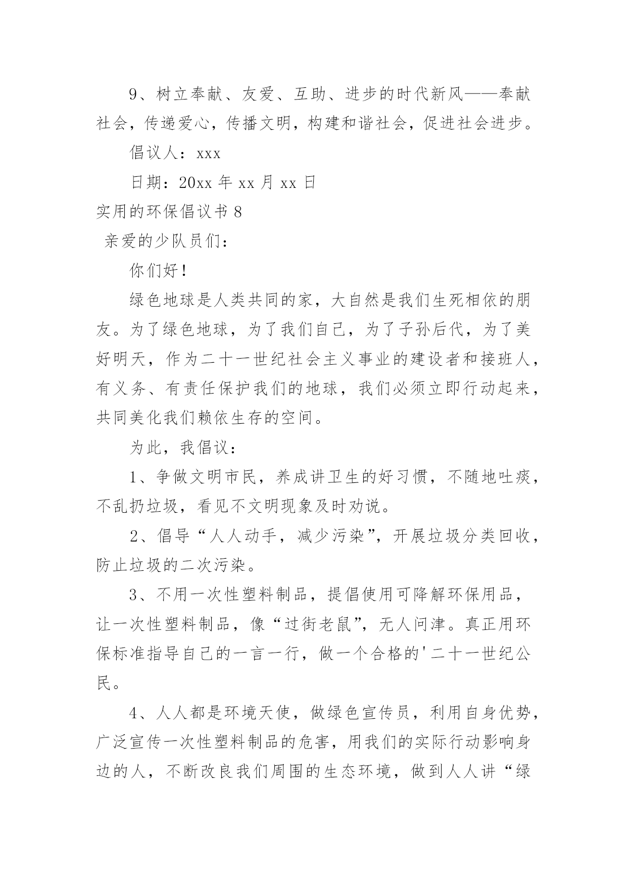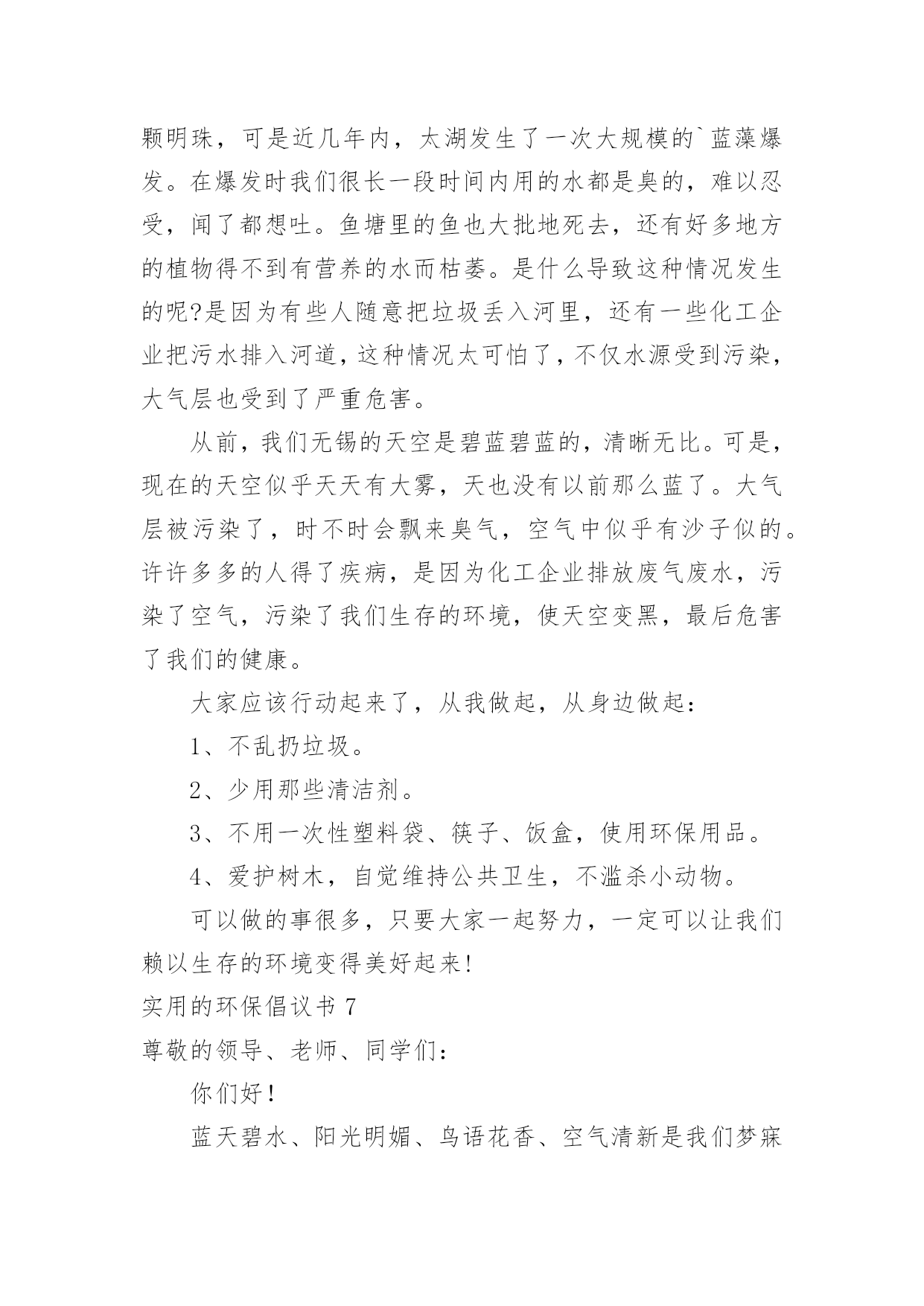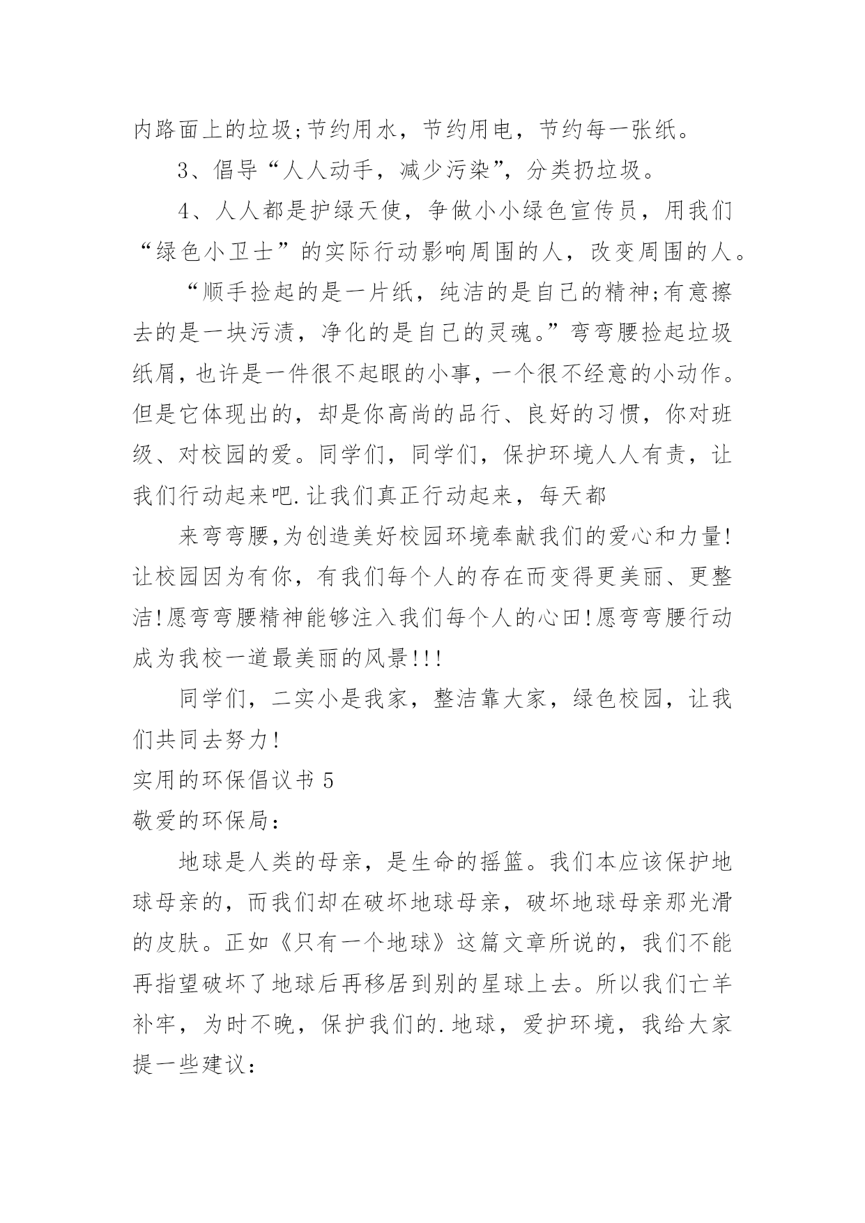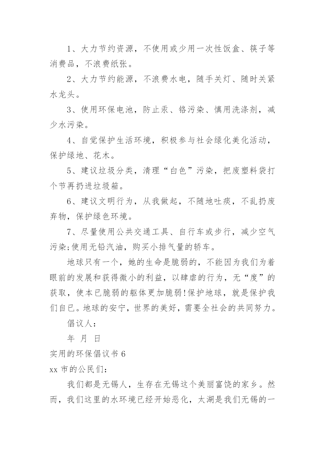 环保倡议书实用的环保倡议书(汇编9篇)在社会发展不断提速的今天,越来越多人会去使用倡议书,倡议书作为一种公开提议性的专用书信,其在写作上有一定的规范。一听到写倡议书就拖延症懒癌齐复发?以下是小编收集整理的实用的环保倡议书,仅供参考,希望能够帮助到大家。实用的环保倡议书1新的世纪,我们渴望干净的地球,渴望健康的地球,渴望环保的家园,渴望绿色、健康、卫生的社区遍地开花……爷爷、奶奶、叔叔、阿姨,让我们立即行动起来!为了保护地球的绿色,为了子孙后代,消灭污染,保护发展环境。在此,我们发出倡议:1、使用无磷洗涤剂。含磷洗涤剂使用时会使大量的`磷进入城市水体,引起水质下降,水体变黑变臭。我们可以选购“无磷”洗涤剂,减少污染。2、请随手关紧水龙头,提倡一水多用。一个关不紧的水龙头一个月可以流掉1—6吨水。随水关紧水龙头,乃是举手之劳,而一水多用更是节约用水的具体表现。3、请将再生资源分类回收,注意及时回收废塑料制品。4、请少用一次性制品。一次性制品给我们带来了方便,但也浪费了大量保贵资源。“一次性”物品,我们实在消费不起了!5、请选用环保建材装修居室。很多人在住进新装修的房子后,会感到头痛、恶心等,这都是装修过程中所造成的污染引起的。(如使用了含苯等有害物质超标的材料)因此,在此提醒您,在装修时尽量使用环保材料。6、拒用野生动物制品。如不穿珍稀动物皮毛服装,尽量穿天然织物;拒食野生动物;在野外旅游,不偷猎野生动物等等。7、提倡选购绿色食品。我们相信,总有那么一天,绿色环保将会在我们的每一个角落闪烁醉人的星光。宜宾市翠屏区女学街小学六年级:XXX实用的环保倡议书2各位师生们:大家好!地球,这位人类的母亲,这个生命的摇篮,是那么的美丽壮观,和蔼可亲。但是近几年来由于人们对生态环境的破坏、绿洲的不重视,我们生存的地球犹如一位生命垂危的老人,奄奄一息……这令人震惊的严重现象和历史教训,怎能不引起大家的认真思考呢?环境保护刻不容缓啊!为了我们共同的家园——地球,我提出了一下几条建议:一、学习有关环境保护知识,收听、收看广播保护节目,阅读环境知识读物、报纸,与同学、朋友和家长讨论环境保护知识,与破坏环境的现象作斗争。二、不浪费纸张,不浪费粮食,节约用水,节约用电,节约燃料。共同节约我们有限的资源。三、把损坏的物品修理好再用,延长使用期,多用可循环再利用的物品,不用或少用一次性纸制品和木制品。四、购买有“环境标志”和“绿色标志”的物品,不吸烟,不随地吐痰,不使用还有破坏臭氧层的物品(如发胶)五、不向下水道排放污油、丢垃圾,不向海洋、湖泊、江河,分类处理垃圾,把旧书本、报纸、饮料罐卖给废品回收部门,少用塑料包装袋。六、保护野生动物,不摘采花草,不砍伐树木,不踏草坪。七、不用一次性筷子,因为快餐筷的材料是树木。八、提醒爸爸妈妈买菜时不用塑料方便袋,以减少白色垃圾。九、我们要节约用水,早晨洗脸时要把水龙头拧小。生活中要学会循环利用水。十、照顾好自己身边的一草一木、爱护花草。让我们同小树一起茁壮成长。世界主宰中不能没有绿色。如果我们行动起来,地球将会布满绿色的足迹。绿色是生命之色、和平之色,绿色时碧水、蓝天和清新的`空气,绿色时树的私语和花的思索。被破坏的大自然已伤痕累累,就让我们用绿来浇灌它吧!同学们,让我们行动起来,保护地球资源,不让世上最后一滴净水,成为人类悲哀的眼泪!实用的环保倡议书3尊敬的xx老师、家长,各位小朋友们:大家好!你曾经仰望过蓝天白云、欣赏过万里晴空的美景吗?你曾经在树荫下纳凉,为一抹新绿而感动过吗?你曾经聆听过小河潺潺、观察过清澈河底的鱼儿吗?那都是绿色的生命在闪耀着勃勃生机我们的家园通许,是一座美丽的.小城,这里应该是流水清澈,应该是红花柳绿,应该是鸟语花香。我们的幼儿园就坐落在这样美丽的一片土地上,这里是我们共同的家园,这里需要绿色的辉映。幼儿园把环保教育渗透在幼儿园教学中、开展争创:环保小卫士幼儿园活动、园内环保理念随处可见、教室里废报纸、旧光盘等把教室布置的充满特色、各种废旧材料制作的玩教具让孩子们爱不释手、经常开展变废为宝幼儿园活动、创设了亲子绘本馆、节约家长为孩子买书的开支、达到幼教资源共享、幼儿园的小朋友表示,将践行低碳生活、绿色环保的理念,共同保护环境、洁净家园。幼儿园邀请大家一起,携手行动起来,从身边做起,从点滴做起:1)请将垃圾果屑扔进垃圾筒里;请不要往小河里乱扔垃圾;2)请随手关掉手龙头,随手关灯;节约每一滴水、每一度电;3)请不要乱踩草坪,不要随便摘花;请爱护小树木;4)请珍惜纸张,可以利用的再次利用;5)请不要大声喧哗,不要产生环境噪音;我们呼唤绿色,共建绿色的美好家园,需要你,需要我,需要大家的共同努力。加入行动者的行列吧!我们将不再看到小树枯亡、花草落泪,鸟儿会为你歌唱,河水会为你鼓掌。关注环保就是关