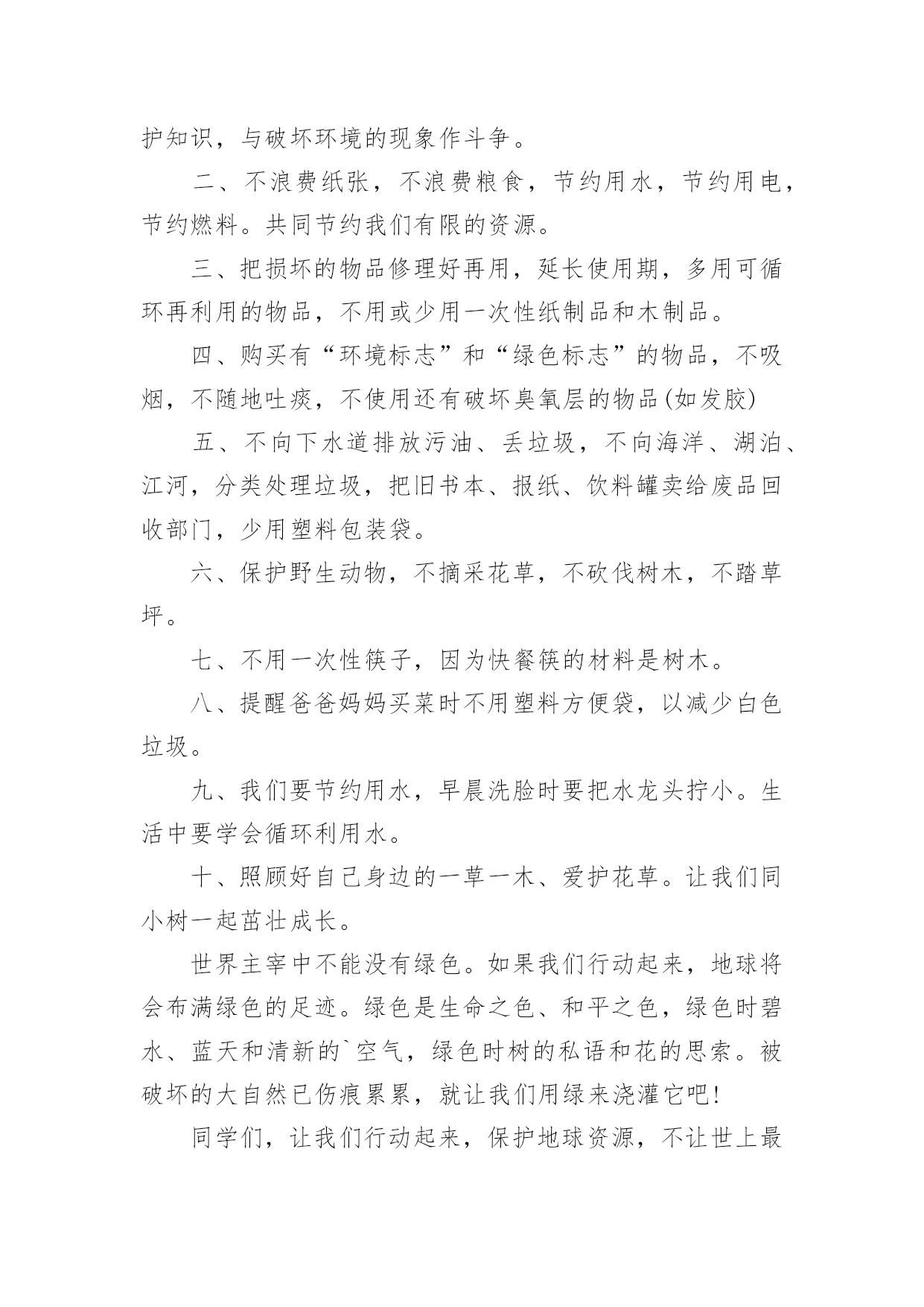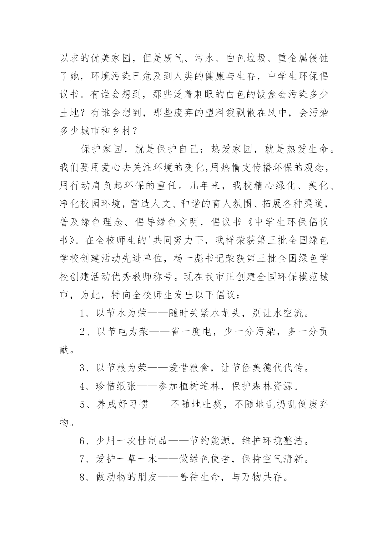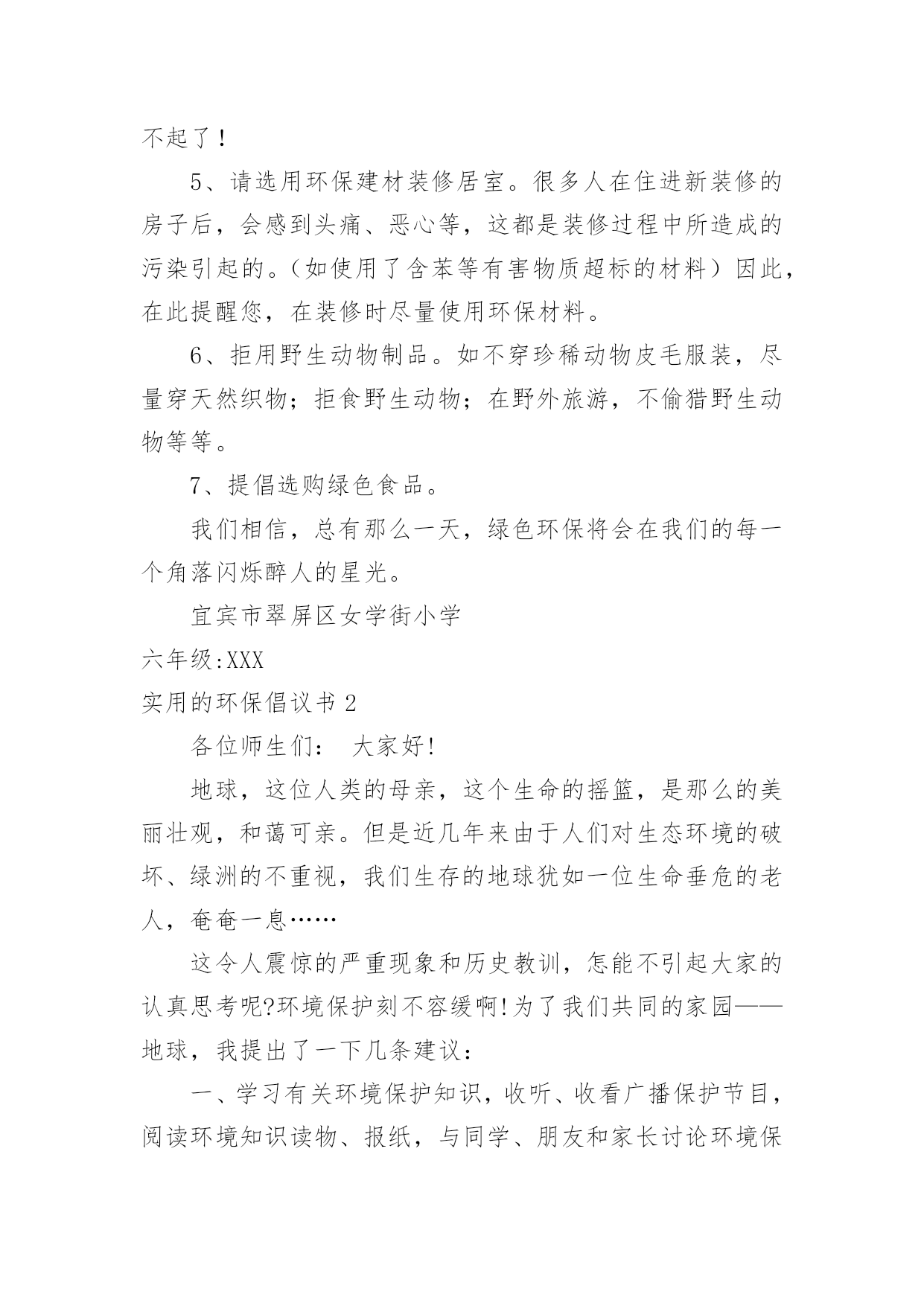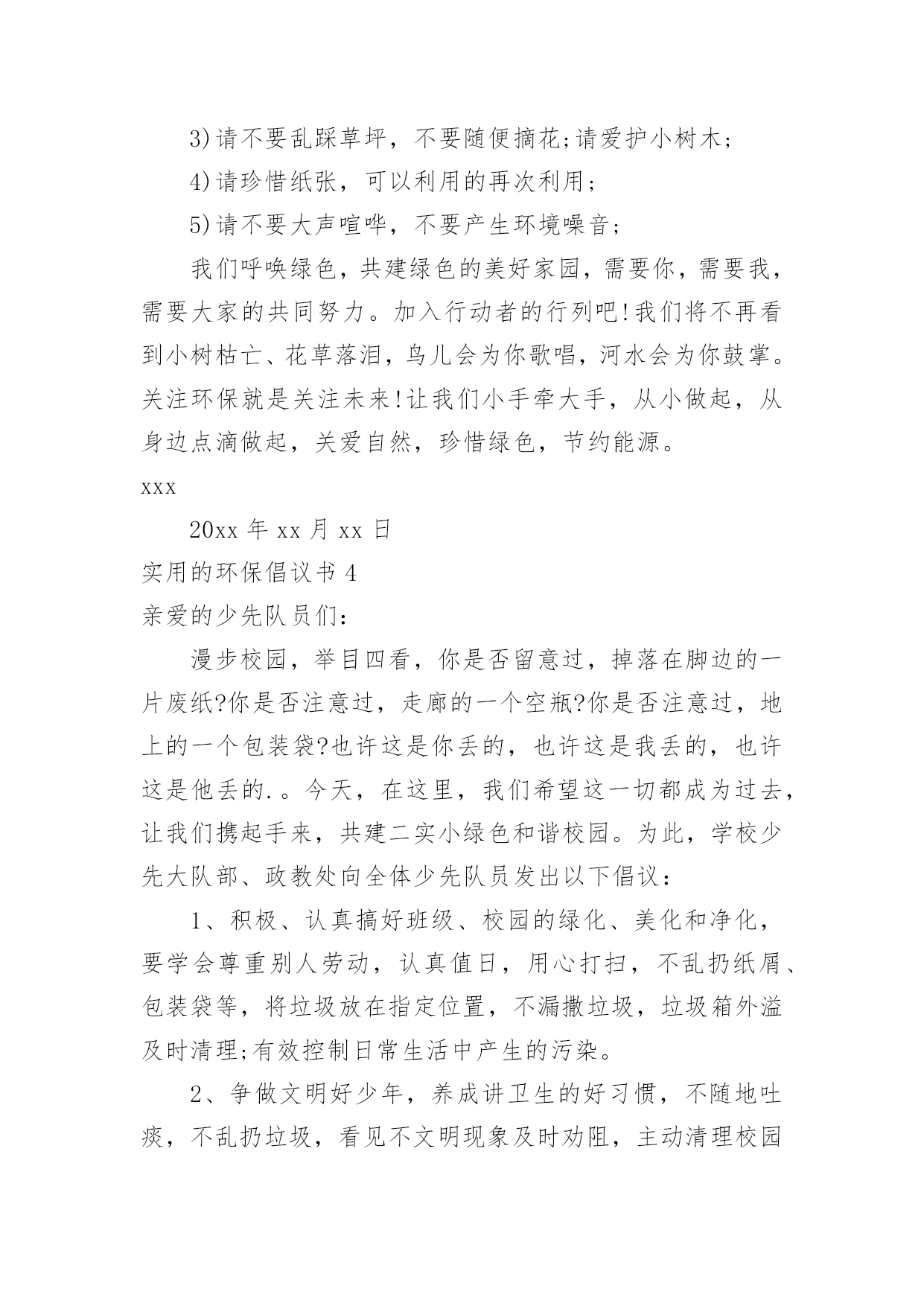 环保倡议书实用的环保倡议书(汇编9篇)在社会发展不断提速的今天,越来越多人会去使用倡议书,倡议书作为一种公开提议性的专用书信,其在写作上有一定的规范。一听到写倡议书就拖延症懒癌齐复发?以下是小编收集整理的实用的环保倡议书,仅供参考,希望能够帮助到大家。实用的环保倡议书1新的世纪,我们渴望干净的地球,渴望健康的地球,渴望环保的家园,渴望绿色、健康、卫生的社区遍地开花……爷爷、奶奶、叔叔、阿姨,让我们立即行动起来!为了保护地球的绿色,为了子孙后代,消灭污染,保护发展环境。在此,我们发出倡议:1、使用无磷洗涤剂。含磷洗涤剂使用时会使大量的`磷进入城市水体,引起水质下降,水体变黑变臭。我们可以选购“无磷”洗涤剂,减少污染。2、请随手关紧水龙头,提倡一水多用。一个关不紧的水龙头一个月可以流掉1—6吨水。随水关紧水龙头,乃是举手之劳,而一水多用更是节约用水的具体表现。3、请将再生资源分类回收,注意及时回收废塑料制品。4、请少用一次性制品。一次性制品给我们带来了方便,但也浪费了大量保贵资源。“一次性”物品,我们实在消费不起了!5、请选用环保建材装修居室。很多人在住进新装修的房子后,会感到头痛、恶心等,这都是装修过程中所造成的污染引起的。(如使用了含苯等有害物质超标的材料)因此,在此提醒您,在装修时尽量使用环保材料。6、拒用野生动物制品。如不穿珍稀动物皮毛服装,尽量穿天然织物;拒食野生动物;在野外旅游,不偷猎野生动物等等。7、提倡选购绿色食品。我们相信,总有那么一天,绿色环保将会在我们的每一个角落闪烁醉人的星光。宜宾市翠屏区女学街小学六年级:XXX实用的环保倡议书2各位师生们:大家好!地球,这位人类的母亲,这个生命的摇篮,是那么的美丽壮观,和蔼可亲。但是近几年来由于人们对生态环境的破坏、绿洲的不重视,我们生存的地球犹如一位生命垂危的老人,奄奄一息……这令人震惊的严重现象和历史教训,怎能不引起大家的认真思考呢?环境保护刻不容缓啊!为了我们共同的家园——地球,我提出了一下几条建议:一、学习有关环境保护知识,收听、收看广播保护节目,阅读环境知识读物、报纸,与同学、朋友和家长讨论环境保护知识,与破坏环境的现象作斗争。二、不浪费纸张,不浪费粮食,节约用水,节约用电,节约燃料。共同节约我们有限的资源。三、把损坏的物品修理好再用,延长使用期,多用可循环再利用的物品,不用或少用一次性纸制品和木制品。四、购买有“环境标志”和“绿色标志”的物品,不吸烟,不随地吐痰,不使用还有破坏臭氧层的物品(如发胶)五、不向下水道排放污油、丢垃圾,不向海洋、湖泊、江河,分类处理垃圾,把旧书本、报纸、饮料罐卖给废品回收部门,少用塑料包装袋。六、保护野生动物,不摘采花草,不砍伐树木,不踏草坪。七、不用一次性筷子,因为快餐筷的材料是树木。八、提醒爸爸妈妈买菜时不用塑料方便袋,以减少白色垃圾。九、我们要节约用水,早晨洗脸时要把水龙头拧小。生活中要学会循环利用水。十、照顾好自己身边的一草一木、爱护花草。让我们同小树一起茁壮成长。世界主宰中不能没有绿色。如果我们行动起来,地球将会布满绿色的足迹。绿色是生命之色、和平之色,绿色时碧水、蓝天和清新的`空气,绿色时树的私语和花的思索。被破坏的大自然已伤痕累累,就让我们用绿来浇灌它吧!同学们,让我们行动起来,保护地球资源,不让世上最后一滴净水,成为人类悲哀的眼泪!实用的环保倡议书3尊敬的xx老师、家长,各位小朋友们:大家好!你曾经仰望过蓝天白云、欣赏过万里晴空的美景吗?你曾经在树荫下纳凉,为一抹新绿而感动过吗?你曾经聆听过小河潺潺、观察过清澈河底的鱼儿吗?那都是绿色的生命在闪耀着勃勃生机我们的家园通许,是一座美丽的.小城,这里应该是流水清澈,应该是红花柳绿,应该是鸟语花香。我们的幼儿园就坐落在这样美丽的一片土地上,这里是我们共同的家园,这里需要绿色的辉映。幼儿园把环保教育渗透在幼儿园教学中、开展争创:环保小卫士幼儿园活动、园内环保理念随处可见、教室里废报纸、旧光盘等把教室布置的充满特色、各种废旧材料制作的玩教具让孩子们爱不释手、经常开展变废为宝幼儿园活动、创设了亲子绘本馆、节约家长为孩子买书的开支、达到幼教资源共享、幼儿园的小朋友表示,将践行低碳生活、绿色环保的理念,共同保护环境、洁净家园。幼儿园邀请大家一起,携手行动起来,从身边做起,从点滴做起:1)请将垃圾果屑扔进垃圾筒里;请不要往小河里乱扔垃圾;2)请随手关掉手龙头,随手关灯;节约每一滴水、每一度电;3)请不要乱踩草坪,不要随便摘花;请爱护小树木;4)请珍惜纸张,可以利用的再次利用;5)请不要大声喧哗,不要产生环境噪音;我们呼唤绿色,共建绿色的美好家园,需要你,需要我,需要大家的共同努力。加入行动者的行列吧!我们将不再看到小树枯亡、花草落泪,鸟儿会为你歌唱,河水会为你鼓掌。关注环保就是关