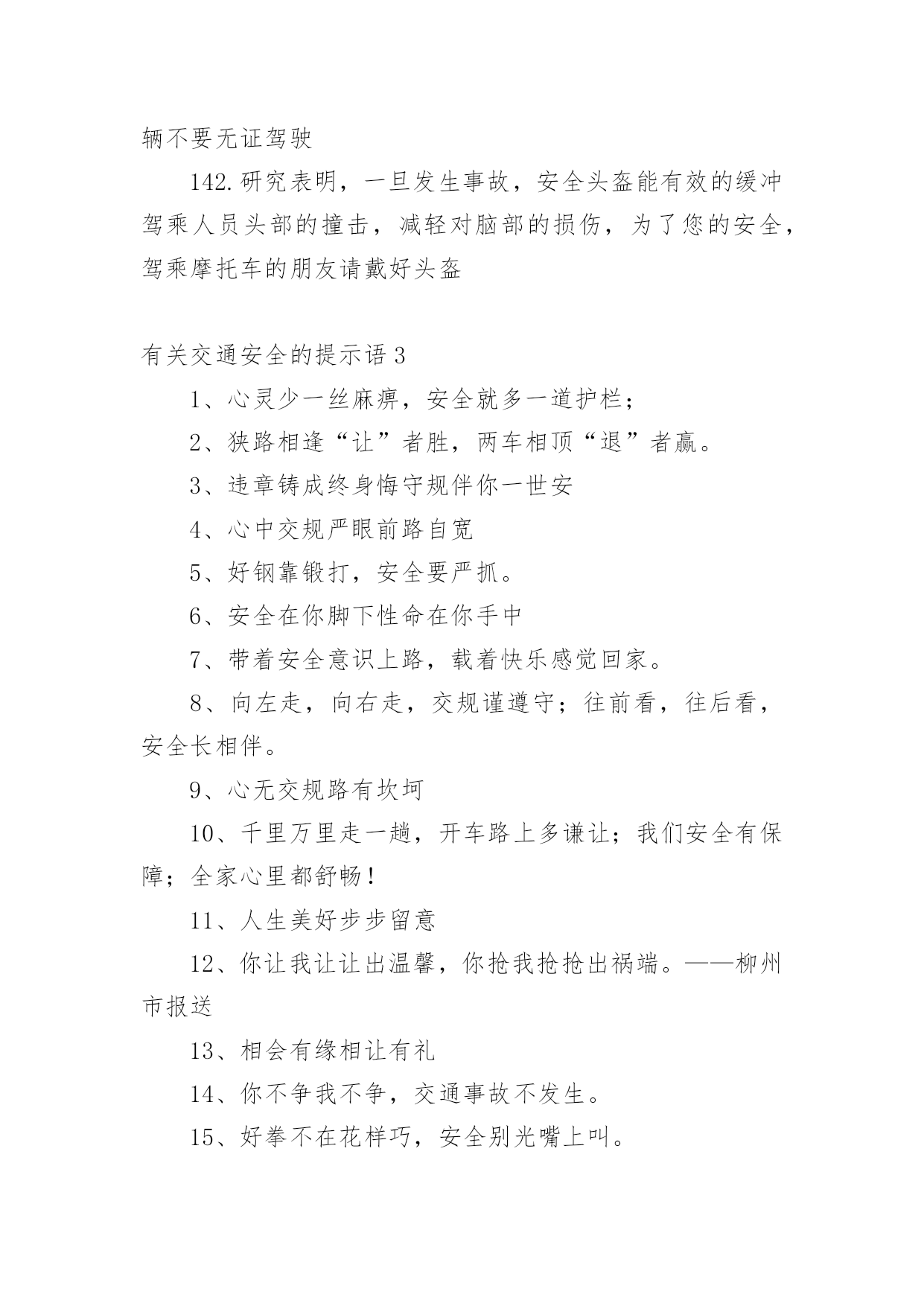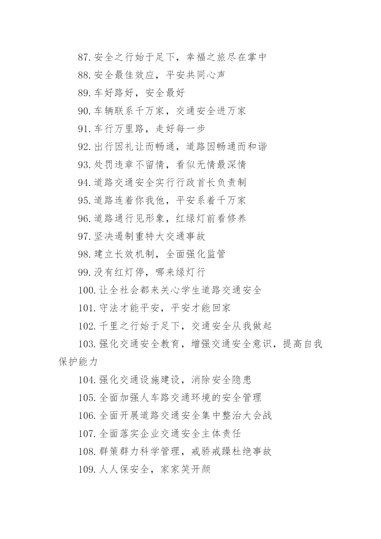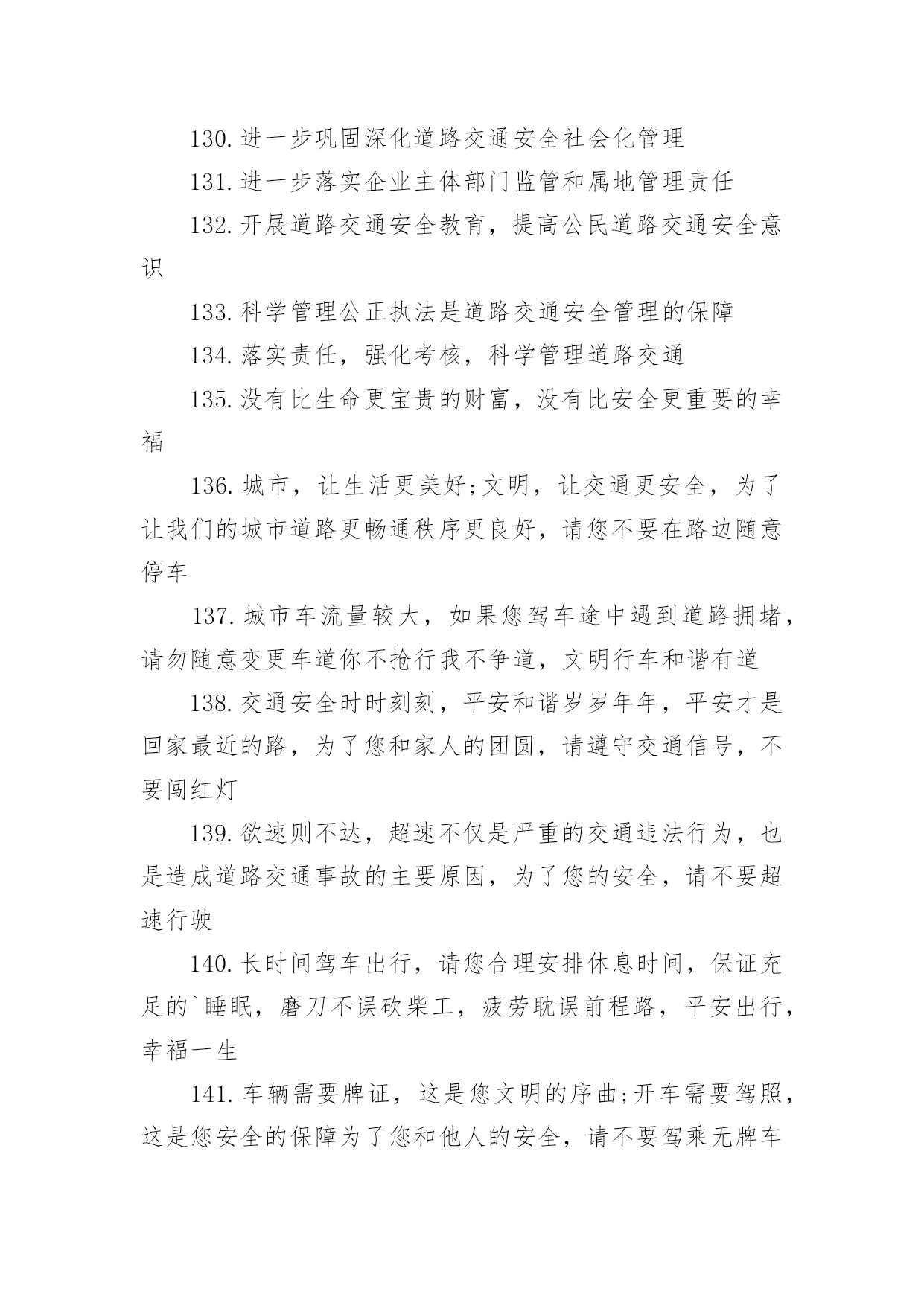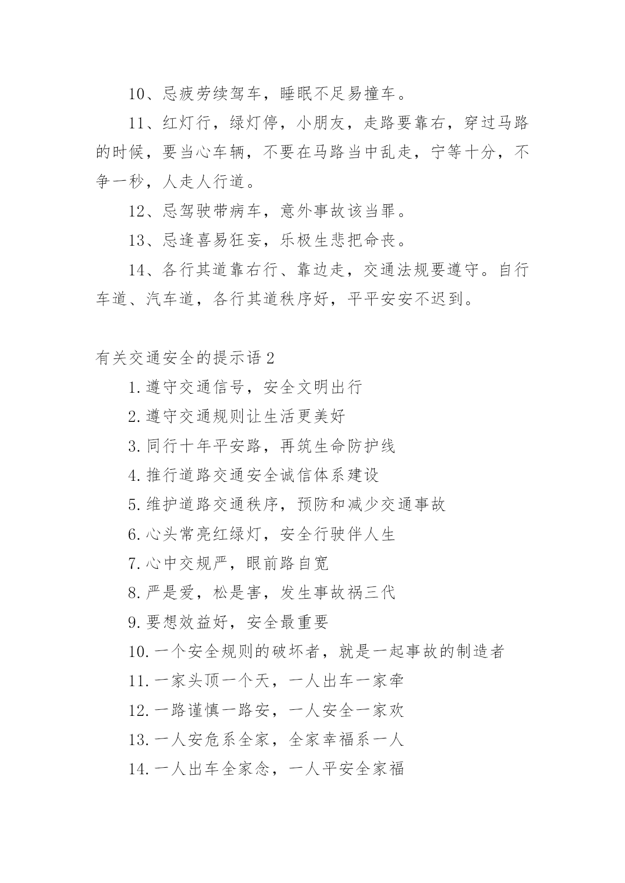 交通安全的提示语有关交通安全的提示语无论是身处学校还是步入社会,大家都不可避免地会接触到提示语吧,提示语就是对人物说话时的表现进行记叙描写,提示一下当前的情况。那要怎么写好提示语呢?下面是小编帮大家整理的有关交通安全的提示语,希望对大家有所帮助。有关交通安全的提示语11、忌驾车人超载,违反科学大事来。2、忌心情不愉快,遇事往往难避开。3、忌不系安全带,一旦造事自伤害。4、过马路过马路、左右瞧,大家要走人行道。公路若无斑马线,直行通过勿打闹。远离汽车不猛跑,迅速安全通行好。5、忌驾车打电话,一心二用很可怕。6、忌驾车酒喝醉,容易冲动或犯罪。7、忌与人比车快,争强好胜造事快。8、红绿灯红、黄、绿三盏灯,十字路口眨眼睛。红灯亮晶晶,大家停一停;黄灯亮晶晶,大家等一等;绿灯亮晶晶,可以向前行。行人车辆听指挥,拐弯慢行要小心。9、忌驾车穿拖鞋,脚底汗滑车不乖。10、忌疲劳续驾车,睡眠不足易撞车。11、红灯行,绿灯停,小朋友,走路要靠右,穿过马路的时候,要当心车辆,不要在马路当中乱走,宁等十分,不争一秒,人走人行道。12、忌驾驶带病车,意外事故该当罪。13、忌逢喜易狂妄,乐极生悲把命丧。14、各行其道靠右行、靠边走,交通法规要遵守。自行车道、汽车道,各行其道秩序好,平平安安不迟到。有关交通安全的提示语21.遵守交通信号,安全文明出行2.遵守交通规则让生活更美好3.同行十年平安路,再筑生命防护线4.推行道路交通安全诚信体系建设5.维护道路交通秩序,预防和减少交通事故6.心头常亮红绿灯,安全行驶伴人生7.心中交规严,眼前路自宽8.严是爱,松是害,发生事故祸三代9.要想效益好,安全最重要10.一个安全规则的破坏者,就是一起事故的制造者11.一家头顶一个天,一人出车一家牵12.一路谨慎一路安,一人安全一家欢13.一人安危系全家,全家幸福系一人14.一人出车全家念,一人平安全家福15.一日千里不算难,千金难买是安全16.预防为主,综合治理,创造和谐交通环境17.占道摆摊设点,妨碍交通安全18.找点空闲找点时间,交通法规经常看看19.肇事莫逃逸,逃逸违天理20.肇事逃逸犯法,缉拿归案严惩21.珍爱他人生命,请勿超员超载22.挣金山,挣银山,交通安全是靠山23.秩序保障安全,规则守护生命24.自觉抵制交通违法行为,培养文明交通习惯25.走遍东西南北中,平安二字记心中26.走过春夏秋冬,安全永驻心中27.秩序保障安全规则守护生命28.斑马线安全线生命线29.宁走百步远不冒一步险30.横过马路左右看红停绿行保平安31.平安出行每一步关爱生命每一天32.过街先看灯并线先打灯33.摒弃交通陋习蔚然文明新风34.横过马路看灯望车35.道路千万条安全第一条36.心宽路才宽守规人才美37.文明出行安全可靠38.放过一件事故隐患39.遵守交通法规是您对社会安宁的一份贡献40.虽为坦途——超速者戒;纵有捷径——乱穿者止41.安全管理第一条42.超车超速痛快一时,酿成车祸悔恨一生43.礼让三分平安在,抢行一秒后悔迟44.遵章守法预防早45.安全基础“三要素”46.摒弃交通陋习47.事故处理有规程48.三双筷子三只碗49.忽视安全抓生产是火中取栗50.蔚然文明新风51.肇事逃逸犯法,缉拿归案重罚52.“松”是事故的祸根53.车道人道各行其道54.心存侥幸,必遭不幸55.超速行驶是抢占死亡线56.法规记心中,三思而后行57.爱妻娇儿盼团圆58.安全是生产效益的保障59..十次肇事九次快60.摩托车族当自爱61.醉(罪)在酒中62.毁(悔)在杯中63.“严”是安全的保证64.设备管理和队伍65.脱离安全求效益是水中捞月66.“四不放过”是准绳67.等于埋下定时炸弹68.效益源于生产69.车道人道各行其道文明出行安全可靠70.平安开车是大事文明走路非小节71.交规与安全同在守法与幸福相连72.遵守交通规则让生活更美好73.人人需要文明交通交通需要人人文明74.文明传家久守规幸福长75.交通出行要守法安全出行要循规76.树立文明交通意识自觉维护交通秩序77.交通法规人人遵守文明城市处处安全78.文明行路路畅通平安回家家温馨79.车让人让出一分安全人让车让出一分文明80.守法的人以教训换流血,违法的人以流血换教训81.安全乐四季,健康福百年82.安全是父母的寄托,安全是儿女的心愿83.居安思危,莫忘交规84.安全,才是回家最近的路85.安全带是生命带,红绿灯是文明灯86.安全在你脚下,生命在你手中87.安全之行始于足下,幸福之旅尽在掌中88.安全最佳效应,平安共同心声89.车好路好,安全最好90.车辆联系千万家,交通安全进万家91.车行万里路,走好每一步92.出行因礼让而畅通,道路因畅通而和谐93.处罚违章不留情,看似无情最深情94.道路交通安全实行行政首长负责制95.道路连着你