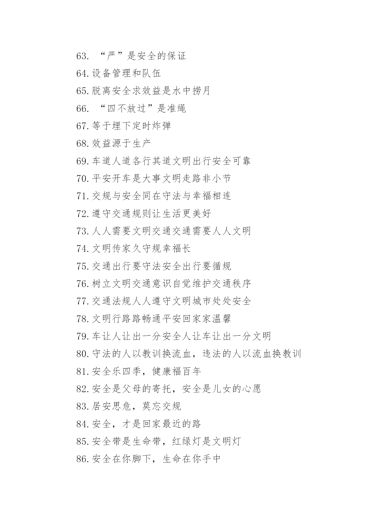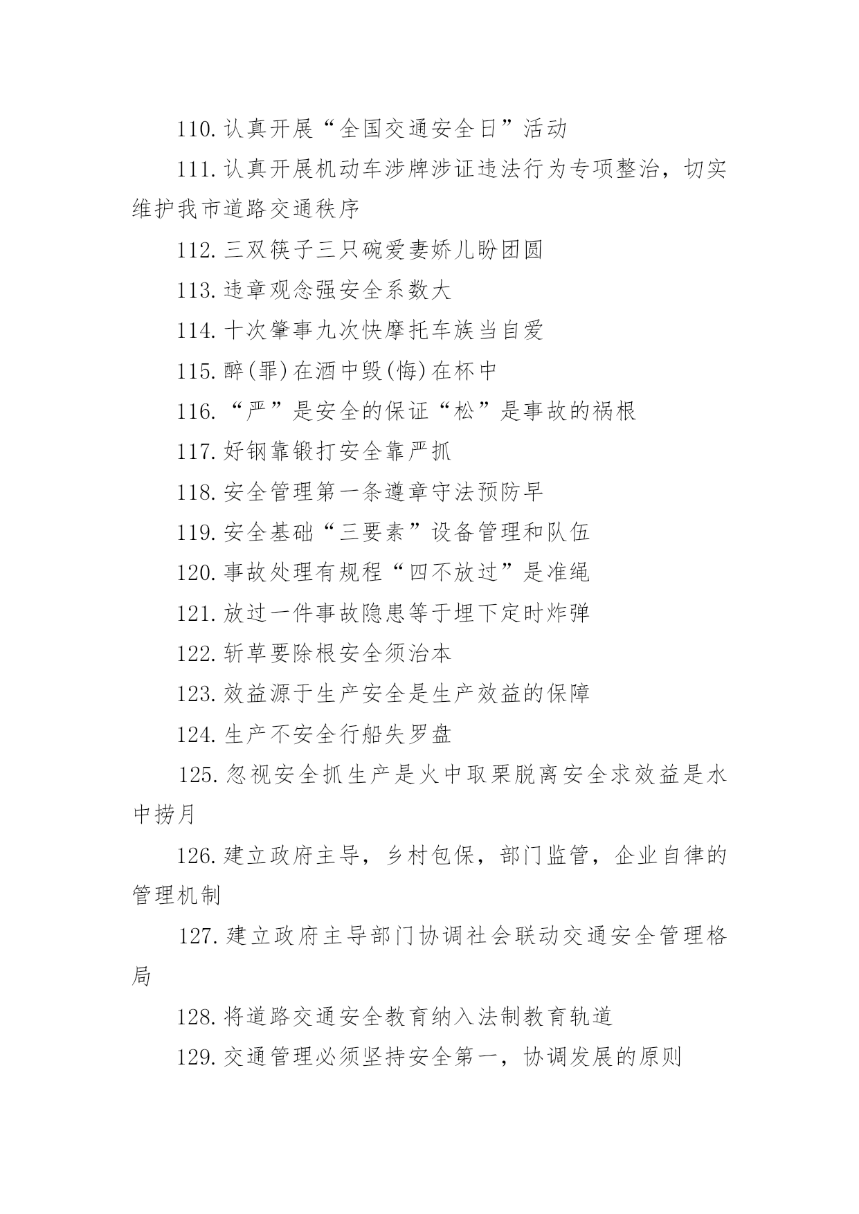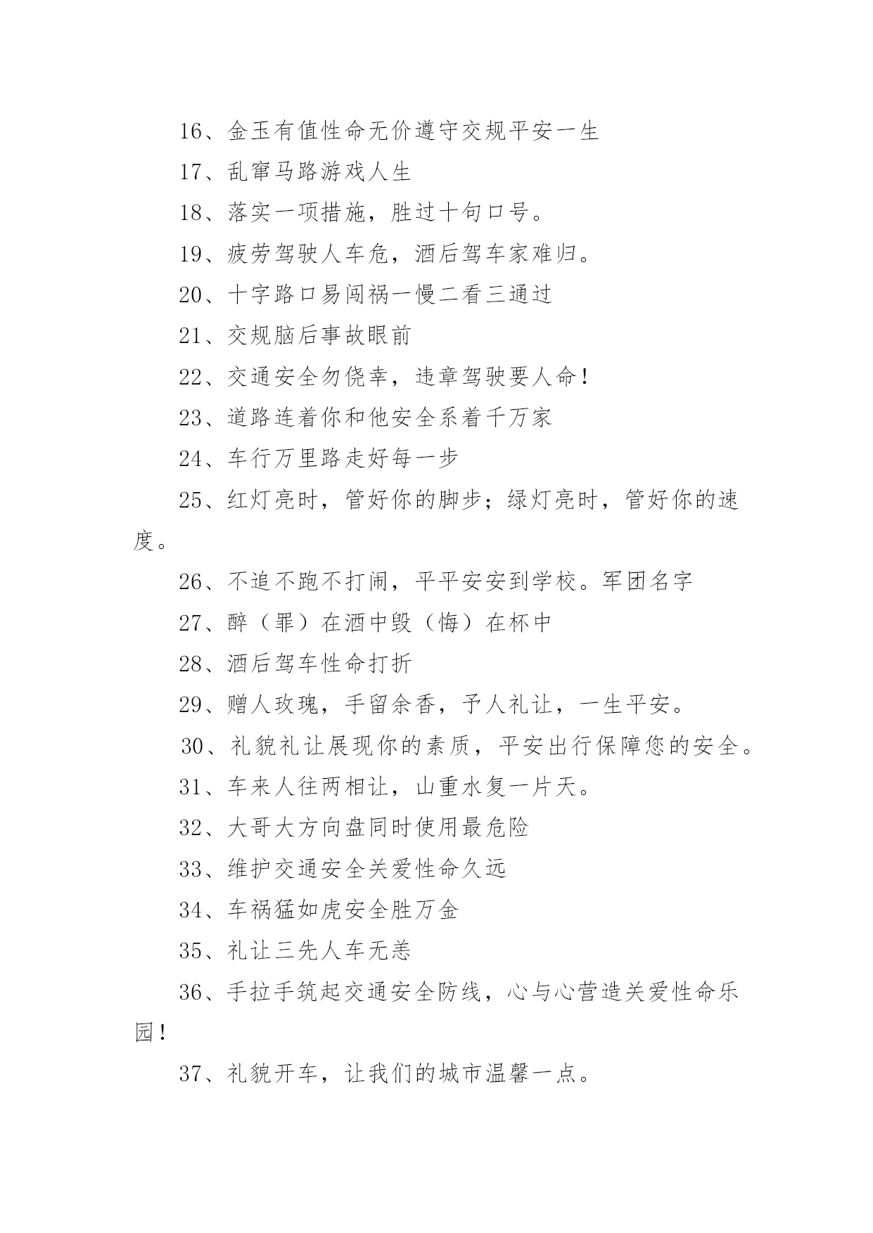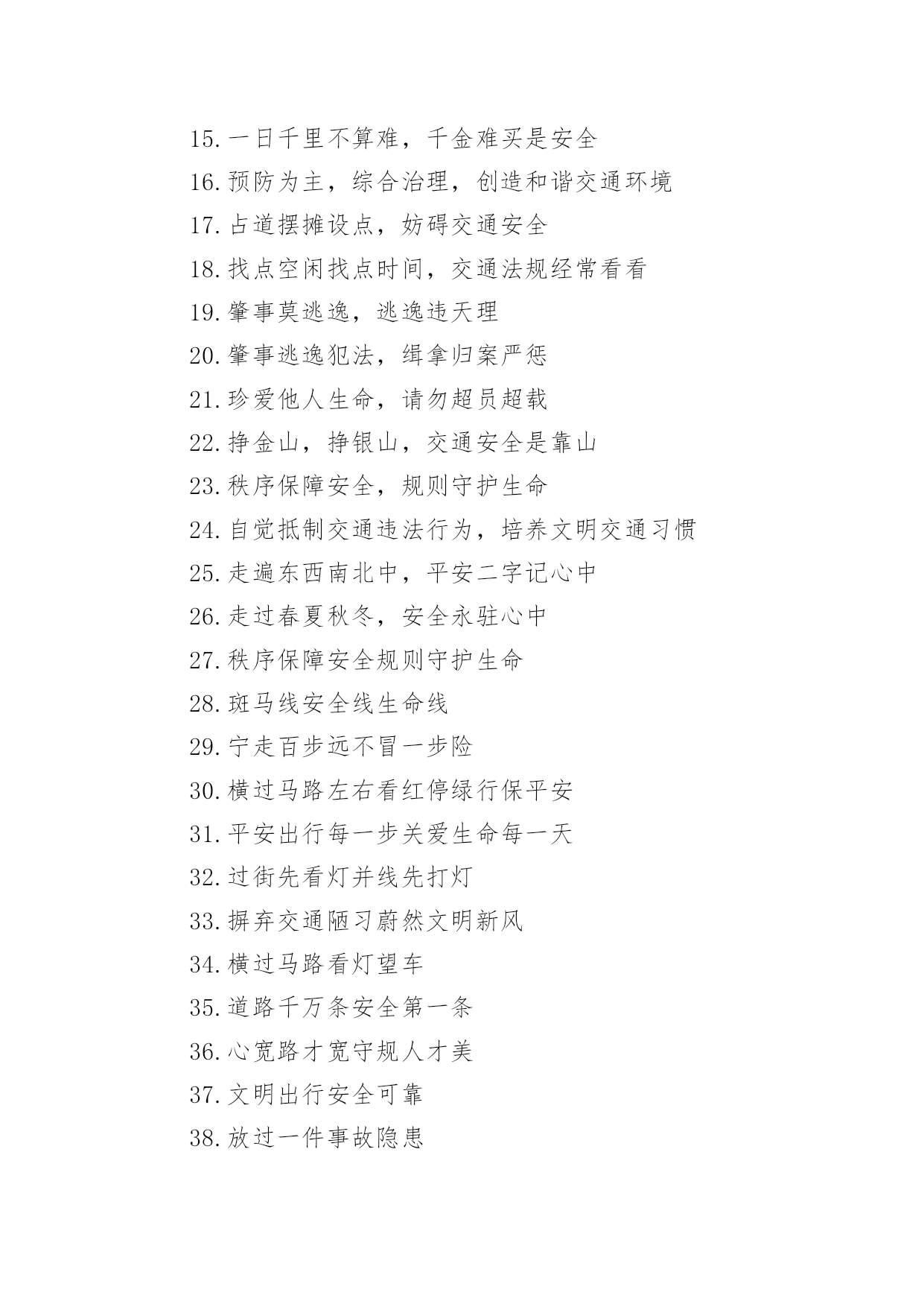 交通安全的提示语有关交通安全的提示语无论是身处学校还是步入社会,大家都不可避免地会接触到提示语吧,提示语就是对人物说话时的表现进行记叙描写,提示一下当前的情况。那要怎么写好提示语呢?下面是小编帮大家整理的有关交通安全的提示语,希望对大家有所帮助。有关交通安全的提示语11、忌驾车人超载,违反科学大事来。2、忌心情不愉快,遇事往往难避开。3、忌不系安全带,一旦造事自伤害。4、过马路过马路、左右瞧,大家要走人行道。公路若无斑马线,直行通过勿打闹。远离汽车不猛跑,迅速安全通行好。5、忌驾车打电话,一心二用很可怕。6、忌驾车酒喝醉,容易冲动或犯罪。7、忌与人比车快,争强好胜造事快。8、红绿灯红、黄、绿三盏灯,十字路口眨眼睛。红灯亮晶晶,大家停一停;黄灯亮晶晶,大家等一等;绿灯亮晶晶,可以向前行。行人车辆听指挥,拐弯慢行要小心。9、忌驾车穿拖鞋,脚底汗滑车不乖。10、忌疲劳续驾车,睡眠不足易撞车。11、红灯行,绿灯停,小朋友,走路要靠右,穿过马路的时候,要当心车辆,不要在马路当中乱走,宁等十分,不争一秒,人走人行道。12、忌驾驶带病车,意外事故该当罪。13、忌逢喜易狂妄,乐极生悲把命丧。14、各行其道靠右行、靠边走,交通法规要遵守。自行车道、汽车道,各行其道秩序好,平平安安不迟到。有关交通安全的提示语21.遵守交通信号,安全文明出行2.遵守交通规则让生活更美好3.同行十年平安路,再筑生命防护线4.推行道路交通安全诚信体系建设5.维护道路交通秩序,预防和减少交通事故6.心头常亮红绿灯,安全行驶伴人生7.心中交规严,眼前路自宽8.严是爱,松是害,发生事故祸三代9.要想效益好,安全最重要10.一个安全规则的破坏者,就是一起事故的制造者11.一家头顶一个天,一人出车一家牵12.一路谨慎一路安,一人安全一家欢13.一人安危系全家,全家幸福系一人14.一人出车全家念,一人平安全家福15.一日千里不算难,千金难买是安全16.预防为主,综合治理,创造和谐交通环境17.占道摆摊设点,妨碍交通安全18.找点空闲找点时间,交通法规经常看看19.肇事莫逃逸,逃逸违天理20.肇事逃逸犯法,缉拿归案严惩21.珍爱他人生命,请勿超员超载22.挣金山,挣银山,交通安全是靠山23.秩序保障安全,规则守护生命24.自觉抵制交通违法行为,培养文明交通习惯25.走遍东西南北中,平安二字记心中26.走过春夏秋冬,安全永驻心中27.秩序保障安全规则守护生命28.斑马线安全线生命线29.宁走百步远不冒一步险30.横过马路左右看红停绿行保平安31.平安出行每一步关爱生命每一天32.过街先看灯并线先打灯33.摒弃交通陋习蔚然文明新风34.横过马路看灯望车35.道路千万条安全第一条36.心宽路才宽守规人才美37.文明出行安全可靠38.放过一件事故隐患39.遵守交通法规是您对社会安宁的一份贡献40.虽为坦途——超速者戒;纵有捷径——乱穿者止41.安全管理第一条42.超车超速痛快一时,酿成车祸悔恨一生43.礼让三分平安在,抢行一秒后悔迟44.遵章守法预防早45.安全基础“三要素”46.摒弃交通陋习47.事故处理有规程48.三双筷子三只碗49.忽视安全抓生产是火中取栗50.蔚然文明新风51.肇事逃逸犯法,缉拿归案重罚52.“松”是事故的祸根53.车道人道各行其道54.心存侥幸,必遭不幸55.超速行驶是抢占死亡线56.法规记心中,三思而后行57.爱妻娇儿盼团圆58.安全是生产效益的保障59..十次肇事九次快60.摩托车族当自爱61.醉(罪)在酒中62.毁(悔)在杯中63.“严”是安全的保证64.设备管理和队伍65.脱离安全求效益是水中捞月66.“四不放过”是准绳67.等于埋下定时炸弹68.效益源于生产69.车道人道各行其道文明出行安全可靠70.平安开车是大事文明走路非小节71.交规与安全同在守法与幸福相连72.遵守交通规则让生活更美好73.人人需要文明交通交通需要人人文明74.文明传家久守规幸福长75.交通出行要守法安全出行要循规76.树立文明交通意识自觉维护交通秩序77.交通法规人人遵守文明城市处处安全78.文明行路路畅通平安回家家温馨79.车让人让出一分安全人让车让出一分文明80.守法的人以教训换流血,违法的人以流血换教训81.安全乐四季,健康福百年82.安全是父母的寄托,安全是儿女的心愿83.居安思危,莫忘交规84.安全,才是回家最近的路85.安全带是生命带,红绿灯是文明灯86.安全在你脚下,生命在你手中87.安全之行始于足下,幸福之旅尽在掌中88.安全最佳效应,平安共同心声89.车好路好,安全最好90.车辆联系千万家,交通安全进万家91.车行万里路,走好每一步92.出行因礼让而畅通,道路因畅通而和谐93.处罚违章不留情,看似无情最深情94.道路交通安全实行行政首长负责制95.道路连着你