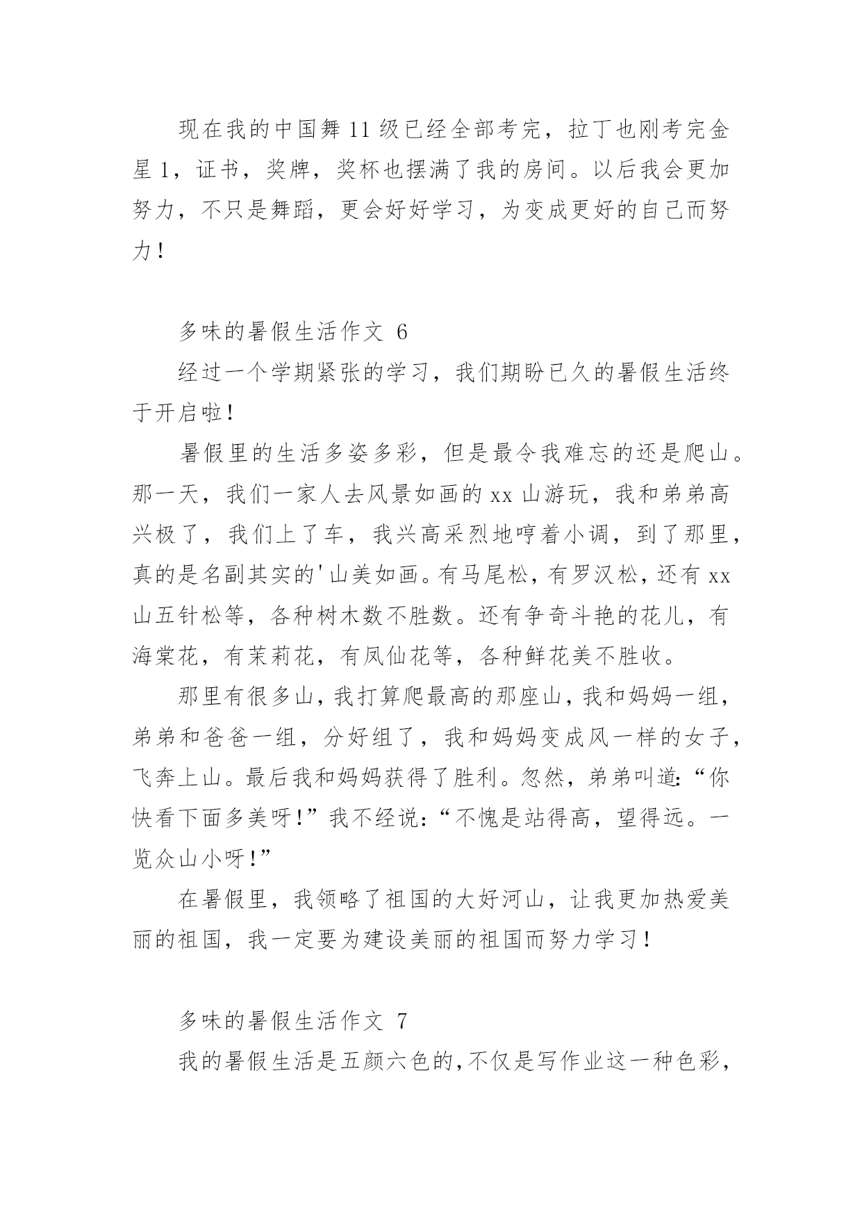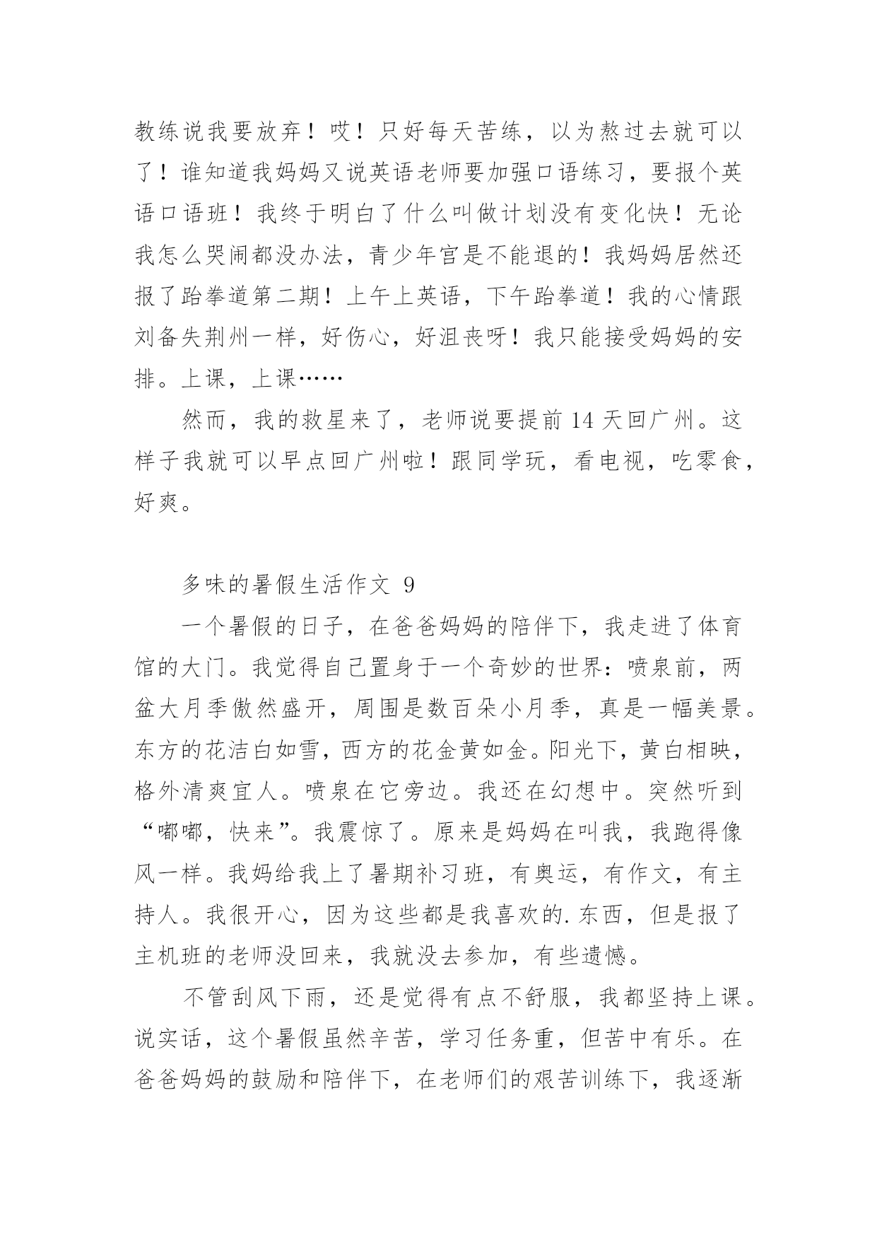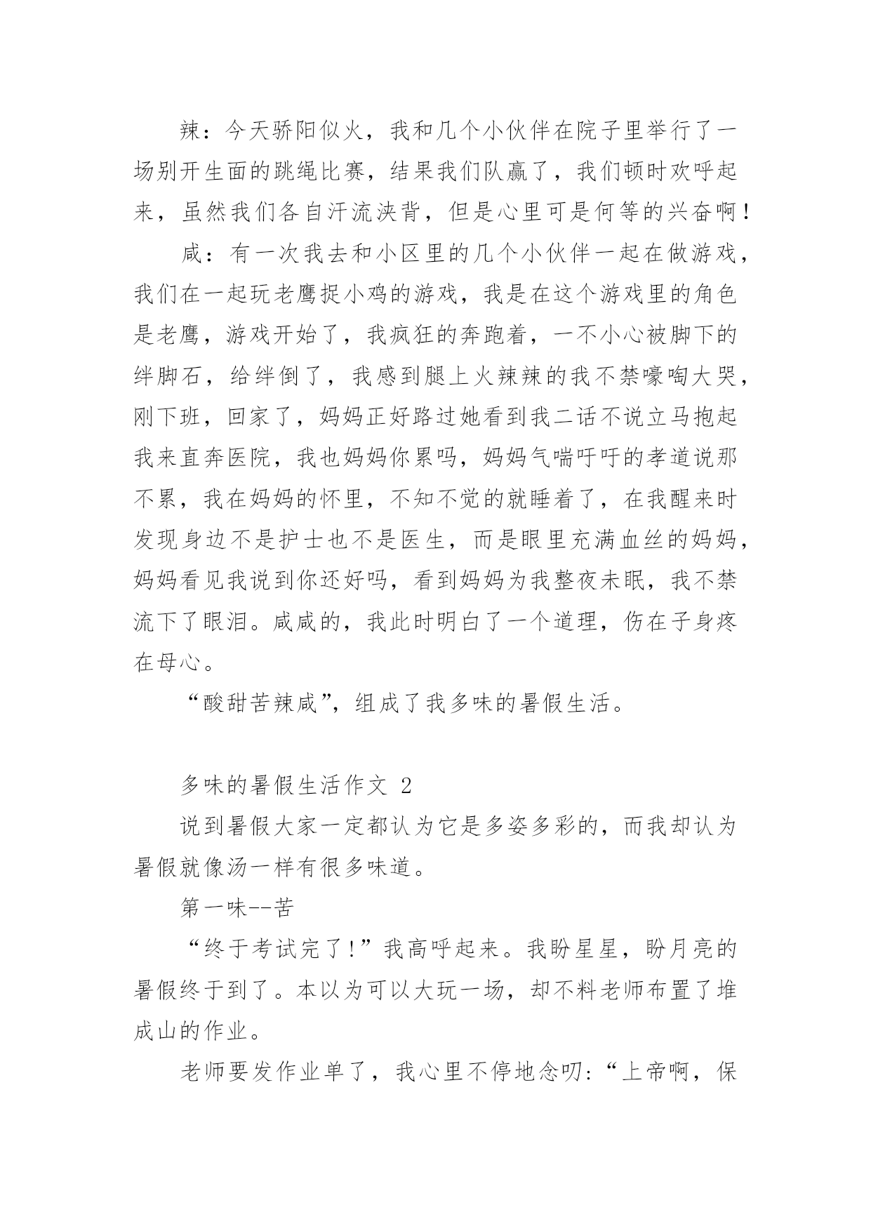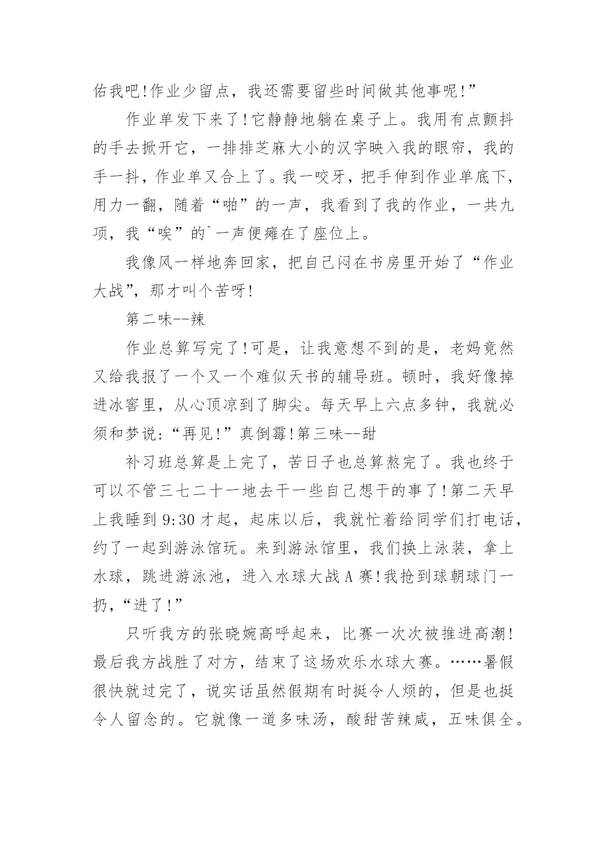 多味的暑假生活作文多味的暑假生活作文(通用24篇)在学习、工作或生活中,大家或多或少都会接触过作文吧,作文是一种言语活动,具有高度的综合性和创造性。你所见过的作文是什么样的呢?下面是小编收集整理的多味的暑假生活作文,欢迎大家分享。多味的暑假生活作文1光阴似箭日月如梭,转眼间一个学期过完了,回顾愉快地暑假生活,我的心里就像被打翻的五味瓶,酸甜苦辣咸五味俱全,让我带你们一起走进我的。酸:在我领成绩单时,我在想我一定考的非常好,当拿起成绩单时,我如晴天霹雳,英语考的不错,可是数学和语文我都没考到95分以上,想想以前我的努力一下子全没了,我一时接受不了,眼泪夺眶而出。甜:酸中有甜,在这个暑假里,帮我妈妈带我游览了金碧辉煌的'故宫,观赏过波澜壮阔的长江玩上过红叶似火,我是又高兴又失落,高兴的是终于可以看到一些远近闻名的古圣之地去欣赏了,失望的是没能把这美好的时刻拍下来。苦:假期刚开始,爸爸妈妈说有由于这次我没考好,所以给我布置了高强度的学习计划,又给我补习了,作文班绘画班……每天还要在背一些古诗,虽然很累但是我每天都很充实。辣:今天骄阳似火,我和几个小伙伴在院子里举行了一场别开生面的跳绳比赛,结果我们队赢了,我们顿时欢呼起来,虽然我们各自汗流浃背,但是心里可是何等的兴奋啊!咸:有一次我去和小区里的几个小伙伴一起在做游戏,我们在一起玩老鹰捉小鸡的游戏,我是在这个游戏里的角色是老鹰,游戏开始了,我疯狂的奔跑着,一不小心被脚下的绊脚石,给绊倒了,我感到腿上火辣辣的我不禁嚎啕大哭,刚下班,回家了,妈妈正好路过她看到我二话不说立马抱起我来直奔医院,我也妈妈你累吗,妈妈气喘吁吁的孝道说那不累,我在妈妈的怀里,不知不觉的就睡着了,在我醒来时发现身边不是护士也不是医生,而是眼里充满血丝的妈妈,妈妈看见我说到你还好吗,看到妈妈为我整夜未眠,我不禁流下了眼泪。咸咸的,我此时明白了一个道理,伤在子身疼在母心。“酸甜苦辣咸”,组成了我多味的暑假生活。多味的暑假生活作文2说到暑假大家一定都认为它是多姿多彩的,而我却认为暑假就像汤一样有很多味道。第一味--苦“终于考试完了!”我高呼起来。我盼星星,盼月亮的暑假终于到了。本以为可以大玩一场,却不料老师布置了堆成山的作业。老师要发作业单了,我心里不停地念叨:“上帝啊,保佑我吧!作业少留点,我还需要留些时间做其他事呢!”作业单发下来了!它静静地躺在桌子上。我用有点颤抖的手去掀开它,一排排芝麻大小的汉字映入我的眼帘,我的手一抖,作业单又合上了。我一咬牙,把手伸到作业单底下,用力一翻,随着“啪”的一声,我看到了我的作业,一共九项,我“唉”的`一声便瘫在了座位上。我像风一样地奔回家,把自己闷在书房里开始了“作业大战”,那才叫个苦呀!第二味--辣作业总算写完了!可是,让我意想不到的是,老妈竟然又给我报了一个又一个难似天书的辅导班。顿时,我好像掉进冰窖里,从心顶凉到了脚尖。每天早上六点多钟,我就必须和梦说:“再见!”真倒霉!第三味--甜补习班总算是上完了,苦日子也总算熬完了。我也终于可以不管三七二十一地去干一些自己想干的事了!第二天早上我睡到9:30才起,起床以后,我就忙着给同学们打电话,约了一起到游泳馆玩。来到游泳馆里,我们换上泳装,拿上水球,跳进游泳池,进入水球大战A赛!我抢到球朝球门一扔,“进了!”只听我方的张晓婉高呼起来,比赛一次次被推进高潮!最后我方战胜了对方,结束了这场欢乐水球大赛。……暑假很快就过完了,说实话虽然假期有时挺令人烦的,但是也挺令人留念的。它就像一道多味汤,酸甜苦辣咸,五味俱全。多味的暑假生活作文3暑假啊!你终于到了我该干些什么呢?当然有的同学说;一定要好好玩个痛快了!我当然也想玩个痛快了可是计划赶不上变化,妈妈已经帮我计划好我的暑假生活了。难道我就会这样屈服么?当然不会了,我一定要抗议了那天妈妈向我的暑假计划,我听了之后立刻拒绝可是妈妈还不放弃,又对我进行了一番说服教育,可我还是“宁死不屈”妈妈见状,便使出“杀手锏”不去的话就罚你一年不准玩电脑,什么!一年不玩电脑,岂不是想要我的命?我只好屈服了接下来便开始了暑假的艰苦生活,每天早上6点起床然后复习以往的`知识!一直复习7点半,然后再去练跆拳道,一直练到10点下午2点还要去补奥数6点回到家后还要写练习题嗨!暑假本来是我们的休息的时间,而现在每天都要去补习班,我也知道妈妈是为我好,可是也应该让我有些休息的时间不要让我一味的学习呀!多味的暑假生活作文4在期末考的最后一天,我望着窗外,心想:暑假马上了,我好激动,盼望、期待着。散学典礼结束后,正打开电视机看我心心念念动漫时,妈妈突然跑过来说:“女儿,这是你们的暑假作业,还有帮你报了阅读作文班和舞蹈班。”心里想:这么多作业,还有补习班,我听了心情跌倒了谷底,伤心地嚎啕大哭了起来,我跟妈妈说:“可不可以把舞蹈班
