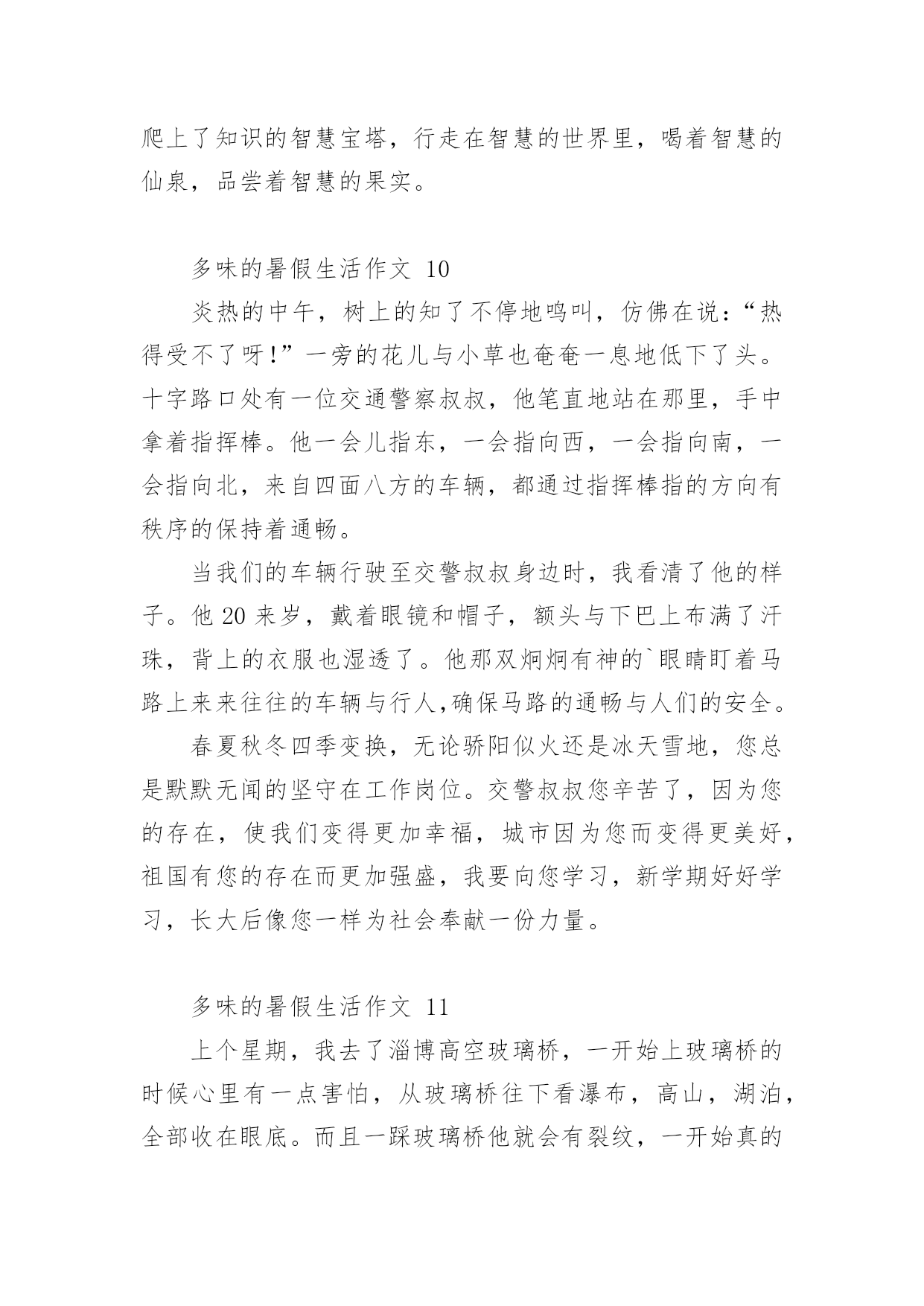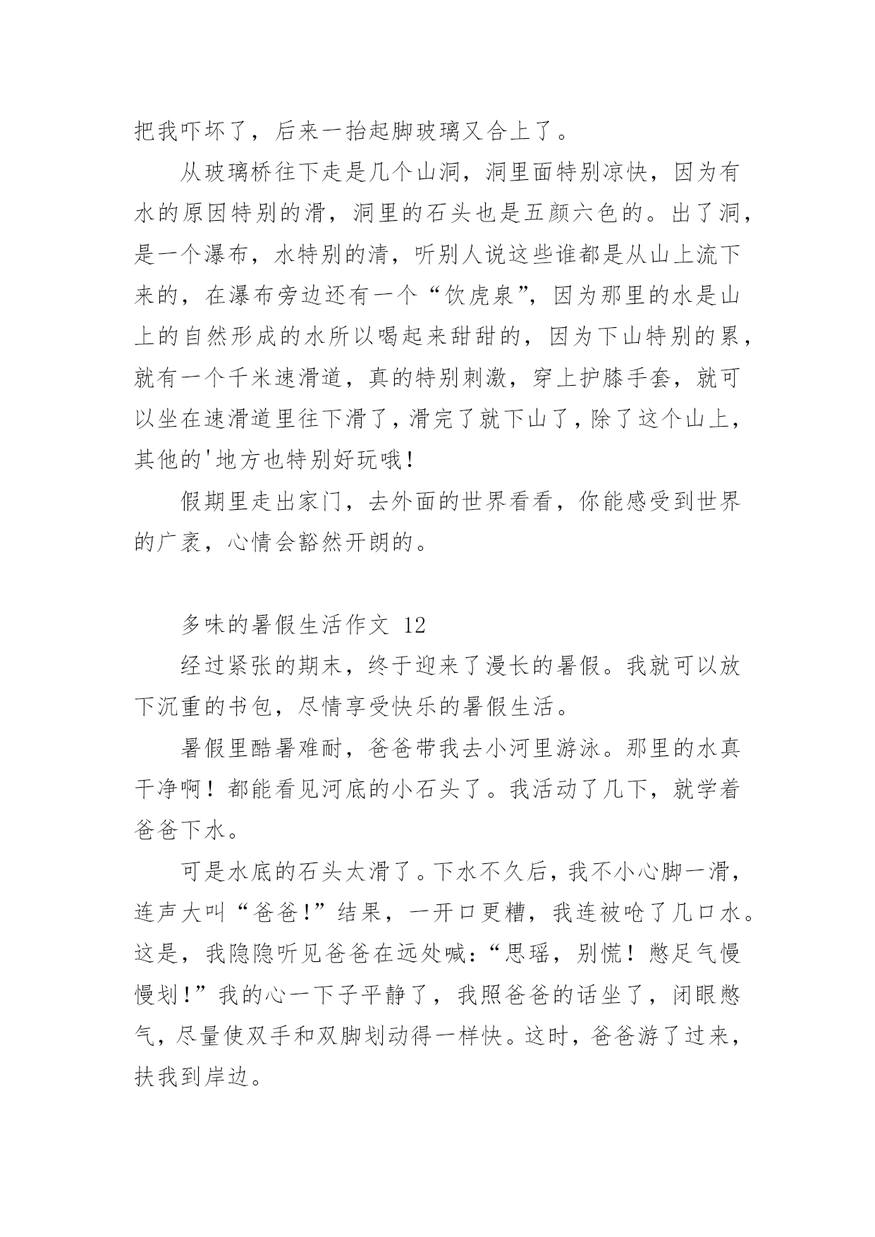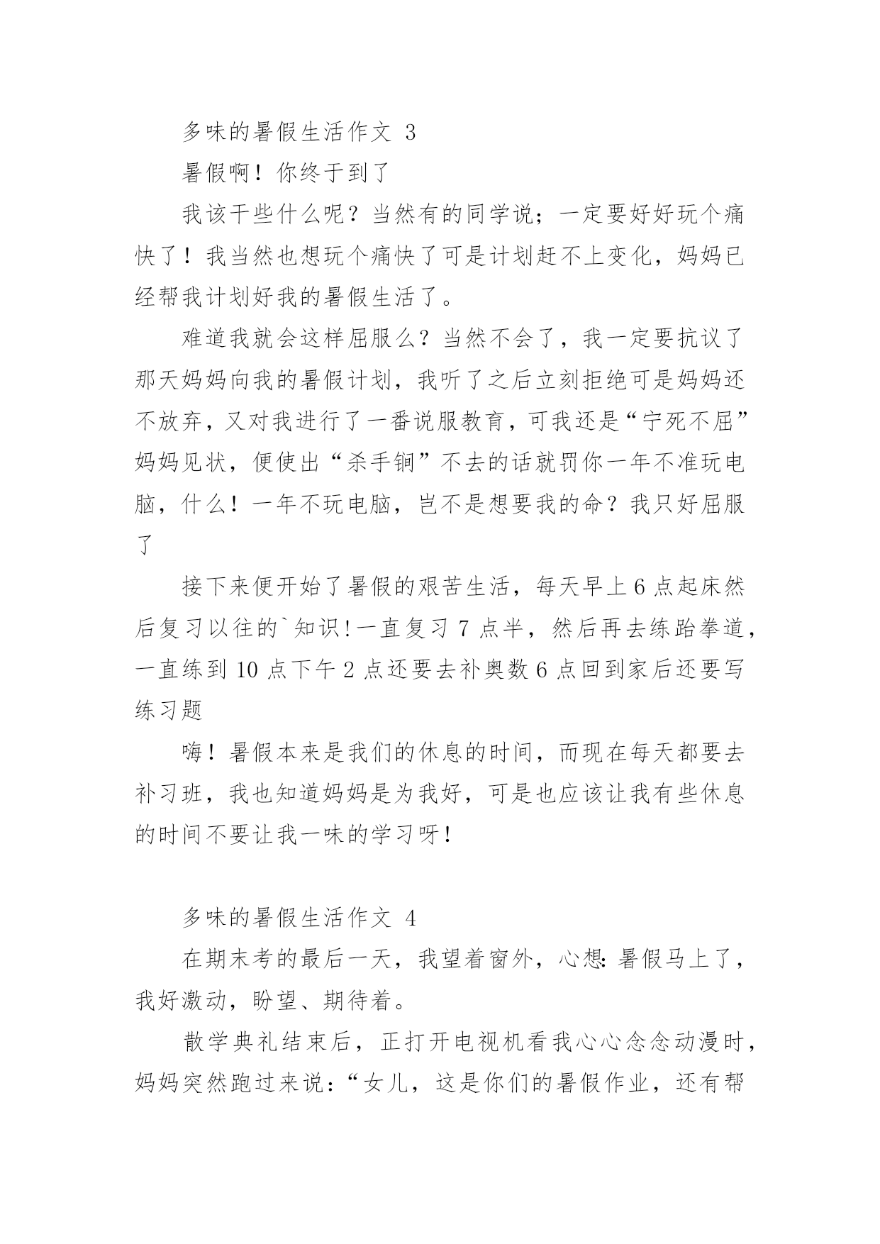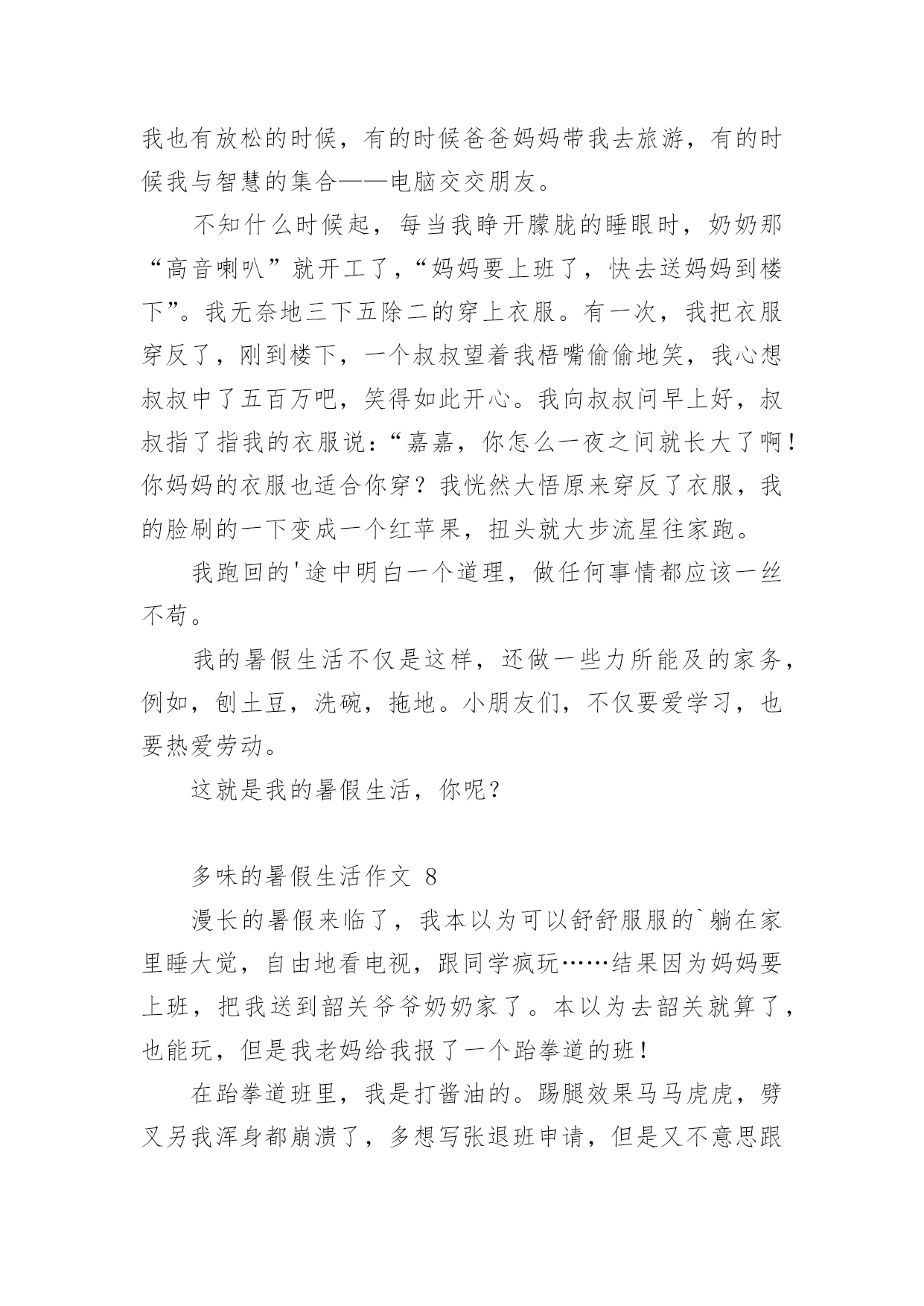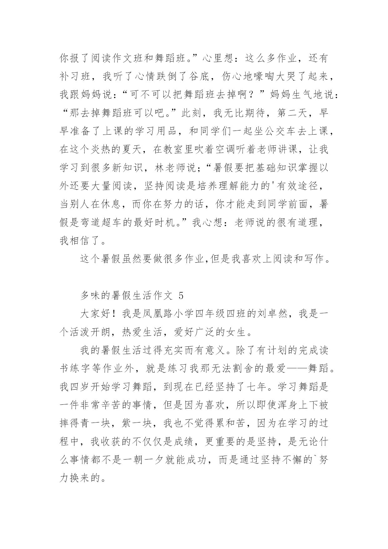 多味的暑假生活作文多味的暑假生活作文(通用24篇)在学习、工作或生活中,大家或多或少都会接触过作文吧,作文是一种言语活动,具有高度的综合性和创造性。你所见过的作文是什么样的呢?下面是小编收集整理的多味的暑假生活作文,欢迎大家分享。多味的暑假生活作文1光阴似箭日月如梭,转眼间一个学期过完了,回顾愉快地暑假生活,我的心里就像被打翻的五味瓶,酸甜苦辣咸五味俱全,让我带你们一起走进我的。酸:在我领成绩单时,我在想我一定考的非常好,当拿起成绩单时,我如晴天霹雳,英语考的不错,可是数学和语文我都没考到95分以上,想想以前我的努力一下子全没了,我一时接受不了,眼泪夺眶而出。甜:酸中有甜,在这个暑假里,帮我妈妈带我游览了金碧辉煌的'故宫,观赏过波澜壮阔的长江玩上过红叶似火,我是又高兴又失落,高兴的是终于可以看到一些远近闻名的古圣之地去欣赏了,失望的是没能把这美好的时刻拍下来。苦:假期刚开始,爸爸妈妈说有由于这次我没考好,所以给我布置了高强度的学习计划,又给我补习了,作文班绘画班……每天还要在背一些古诗,虽然很累但是我每天都很充实。辣:今天骄阳似火,我和几个小伙伴在院子里举行了一场别开生面的跳绳比赛,结果我们队赢了,我们顿时欢呼起来,虽然我们各自汗流浃背,但是心里可是何等的兴奋啊!咸:有一次我去和小区里的几个小伙伴一起在做游戏,我们在一起玩老鹰捉小鸡的游戏,我是在这个游戏里的角色是老鹰,游戏开始了,我疯狂的奔跑着,一不小心被脚下的绊脚石,给绊倒了,我感到腿上火辣辣的我不禁嚎啕大哭,刚下班,回家了,妈妈正好路过她看到我二话不说立马抱起我来直奔医院,我也妈妈你累吗,妈妈气喘吁吁的孝道说那不累,我在妈妈的怀里,不知不觉的就睡着了,在我醒来时发现身边不是护士也不是医生,而是眼里充满血丝的妈妈,妈妈看见我说到你还好吗,看到妈妈为我整夜未眠,我不禁流下了眼泪。咸咸的,我此时明白了一个道理,伤在子身疼在母心。“酸甜苦辣咸”,组成了我多味的暑假生活。多味的暑假生活作文2说到暑假大家一定都认为它是多姿多彩的,而我却认为暑假就像汤一样有很多味道。第一味--苦“终于考试完了!”我高呼起来。我盼星星,盼月亮的暑假终于到了。本以为可以大玩一场,却不料老师布置了堆成山的作业。老师要发作业单了,我心里不停地念叨:“上帝啊,保佑我吧!作业少留点,我还需要留些时间做其他事呢!”作业单发下来了!它静静地躺在桌子上。我用有点颤抖的手去掀开它,一排排芝麻大小的汉字映入我的眼帘,我的手一抖,作业单又合上了。我一咬牙,把手伸到作业单底下,用力一翻,随着“啪”的一声,我看到了我的作业,一共九项,我“唉”的`一声便瘫在了座位上。我像风一样地奔回家,把自己闷在书房里开始了“作业大战”,那才叫个苦呀!第二味--辣作业总算写完了!可是,让我意想不到的是,老妈竟然又给我报了一个又一个难似天书的辅导班。顿时,我好像掉进冰窖里,从心顶凉到了脚尖。每天早上六点多钟,我就必须和梦说:“再见!”真倒霉!第三味--甜补习班总算是上完了,苦日子也总算熬完了。我也终于可以不管三七二十一地去干一些自己想干的事了!第二天早上我睡到9:30才起,起床以后,我就忙着给同学们打电话,约了一起到游泳馆玩。来到游泳馆里,我们换上泳装,拿上水球,跳进游泳池,进入水球大战A赛!我抢到球朝球门一扔,“进了!”只听我方的张晓婉高呼起来,比赛一次次被推进高潮!最后我方战胜了对方,结束了这场欢乐水球大赛。……暑假很快就过完了,说实话虽然假期有时挺令人烦的,但是也挺令人留念的。它就像一道多味汤,酸甜苦辣咸,五味俱全。多味的暑假生活作文3暑假啊!你终于到了我该干些什么呢?当然有的同学说;一定要好好玩个痛快了!我当然也想玩个痛快了可是计划赶不上变化,妈妈已经帮我计划好我的暑假生活了。难道我就会这样屈服么?当然不会了,我一定要抗议了那天妈妈向我的暑假计划,我听了之后立刻拒绝可是妈妈还不放弃,又对我进行了一番说服教育,可我还是“宁死不屈”妈妈见状,便使出“杀手锏”不去的话就罚你一年不准玩电脑,什么!一年不玩电脑,岂不是想要我的命?我只好屈服了接下来便开始了暑假的艰苦生活,每天早上6点起床然后复习以往的`知识!一直复习7点半,然后再去练跆拳道,一直练到10点下午2点还要去补奥数6点回到家后还要写练习题嗨!暑假本来是我们的休息的时间,而现在每天都要去补习班,我也知道妈妈是为我好,可是也应该让我有些休息的时间不要让我一味的学习呀!多味的暑假生活作文4在期末考的最后一天,我望着窗外,心想:暑假马上了,我好激动,盼望、期待着。散学典礼结束后,正打开电视机看我心心念念动漫时,妈妈突然跑过来说:“女儿,这是你们的暑假作业,还有帮你报了阅读作文班和舞蹈班。”心里想:这么多作业,还有补习班,我听了心情跌倒了谷底,伤心地嚎啕大哭了起来,我跟妈妈说:“可不可以把舞蹈班