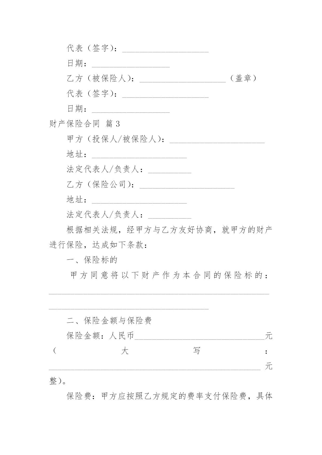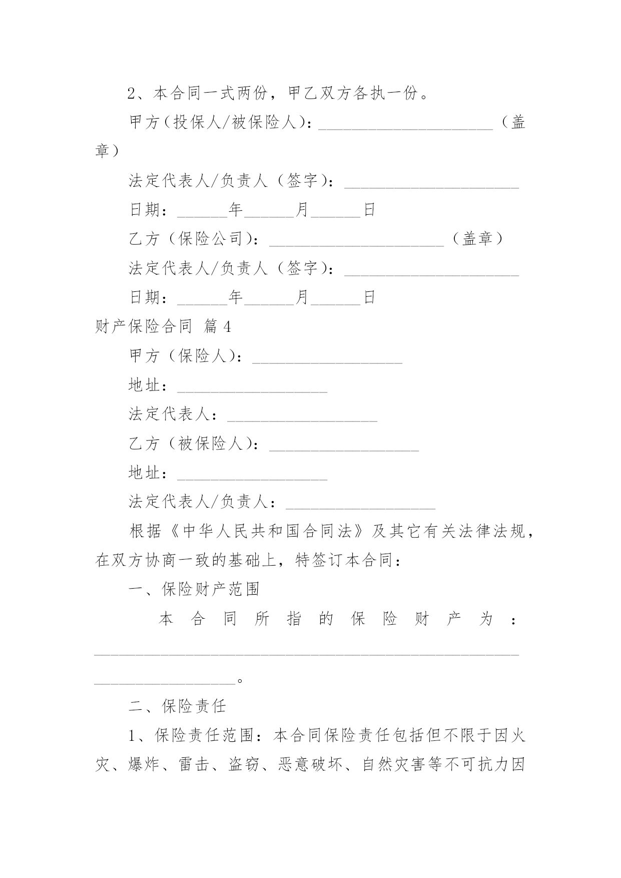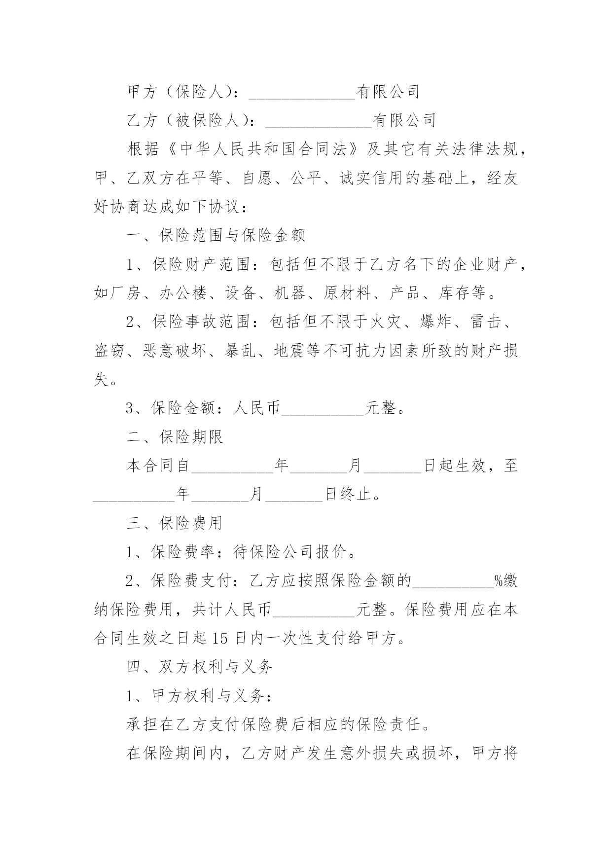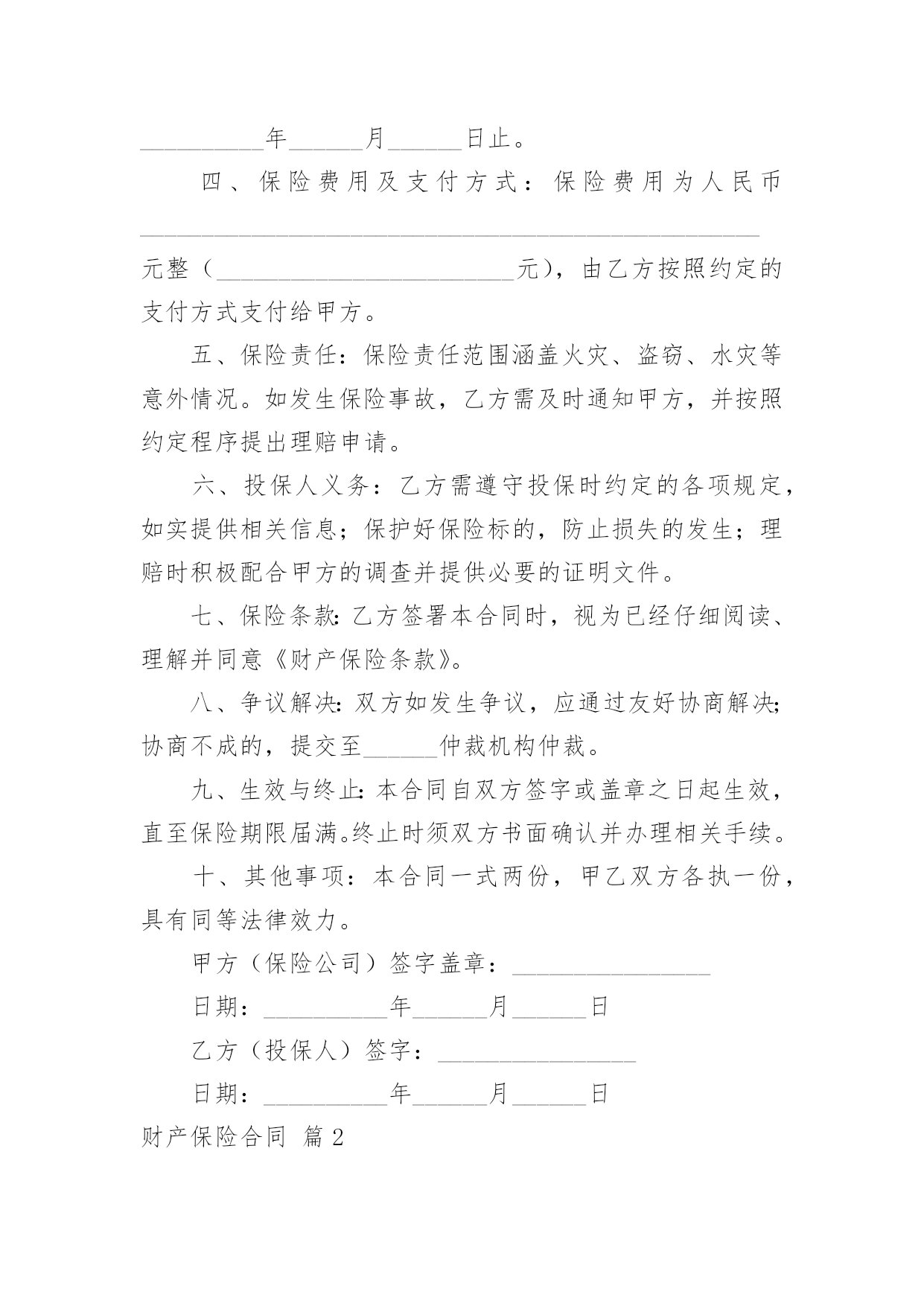 财产保险合同财产保险合同经典5篇随着广大人民群众法律意识的普遍提高,越来越多的场景和场合需要用到合同,签订合同也是非常有必要的行为。拟定合同的注意事项有许多,你确定会写吗?以下是小编为大家收集的财产保险合同,仅供参考,希望能够帮助到大家。财产保险合同篇1甲方(保险公司):____________________________地址:____________________________电话:____________________________乙方(投保人):____________________________地址:____________________________电话:____________________________根据《保险法》及相关法规,经甲方与乙方友好协商,就乙方的财产进行保险,达成如下条款:一、保险标的:乙方名下位于____________________________的'财产,具体包括但不限于房屋、家具、电器等。二、保险金额:人民币__________________________________________________元整(________________________元)。三、保险期限:自__________年______月______日起至__________年______月______日止。四、保险费用及支付方式:保险费用为人民币__________________________________________________元整(________________________元),由乙方按照约定的支付方式支付给甲方。五、保险责任:保险责任范围涵盖火灾、盗窃、水灾等意外情况。如发生保险事故,乙方需及时通知甲方,并按照约定程序提出理赔申请。六、投保人义务:乙方需遵守投保时约定的各项规定,如实提供相关信息;保护好保险标的,防止损失的发生;理赔时积极配合甲方的调查并提供必要的证明文件。七、保险条款:乙方签署本合同时,视为已经仔细阅读、理解并同意《财产保险条款》。八、争议解决:双方如发生争议,应通过友好协商解决;协商不成的,提交至______仲裁机构仲裁。九、生效与终止:本合同自双方签字或盖章之日起生效,直至保险期限届满。终止时须双方书面确认并办理相关手续。十、其他事项:本合同一式两份,甲乙双方各执一份,具有同等法律效力。甲方(保险公司)签字盖章:________________日期:__________年______月______日乙方(投保人)签字:________________日期:__________年______月______日财产保险合同篇2甲方(保险人):_____________有限公司乙方(被保险人):_____________有限公司根据《中华人民共和国合同法》及其它有关法律法规,甲、乙双方在平等、自愿、公平、诚实信用的基础上,经友好协商达成如下协议:一、保险范围与保险金额1、保险财产范围:包括但不限于乙方名下的企业财产,如厂房、办公楼、设备、机器、原材料、产品、库存等。2、保险事故范围:包括但不限于火灾、爆炸、雷击、盗窃、恶意破坏、暴乱、地震等不可抗力因素所致的财产损失。3、保险金额:人民币__________元整。二、保险期限本合同自__________年_______月_______日起生效,至__________年_______月_______日终止。三、保险费用1、保险费率:待保险公司报价。2、保险费支付:乙方应按照保险金额的__________%缴纳保险费用,共计人民币__________元整。保险费用应在本合同生效之日起15日内一次性支付给甲方。四、双方权利与义务1、甲方权利与义务:承担在乙方支付保险费后相应的保险责任。在保险期间内,乙方财产发生意外损失或损坏,甲方将按照合同约定进行赔偿。有权对乙方代理的全部保险业务及管理情况进行监督和检查。2、乙方权利与义务:按时支付保险费用。在保险事故发生后及时通知甲方,并提供相应的`证明文件以便甲方核实损失。不得将保险标的转让给他人或对其进行抵押、出租等操作。五、理赔与争议解决1、理赔:甲方在接到乙方通知后将尽快进行理赔处理,赔偿款项将在审核通过后按照约定的方式支付给乙方。2、争议解决:因履行本合同发生的任何争议,由双方友好协商解决,协商不成的,提交_______仲裁委员会仲裁。六、其他事项1、合同变更:如需变更保险条款内容,应提前书面通知对方,并经双方协商一致后签订补充协议。2、不可抗力:若因不可抗力原因导致本合同未能履行,双方应免除对方的责任,但应尽最大努力减少损失。3、法律效力:本合同一式两份,甲、乙双方各执一份,具有同等法律效力。本合同适用中华人民共和国法律。七、合同生效本合同自双方签字盖