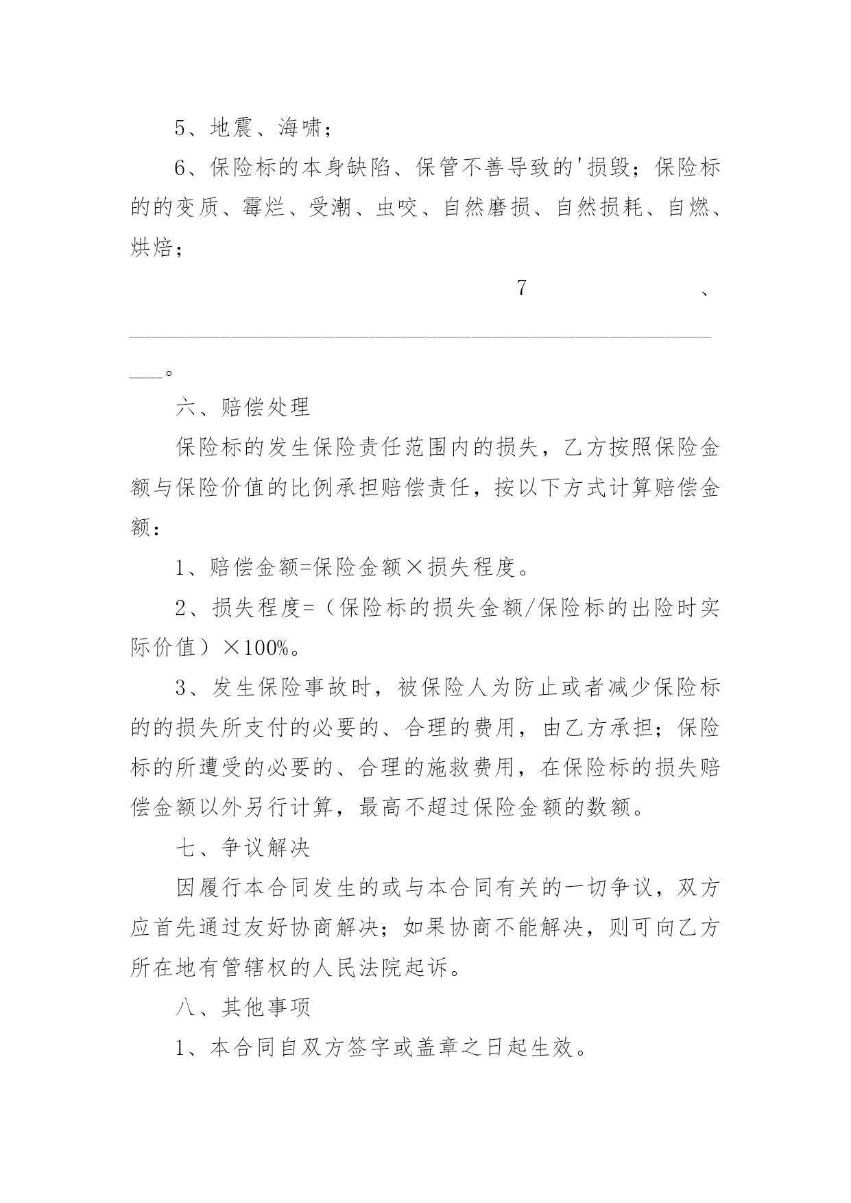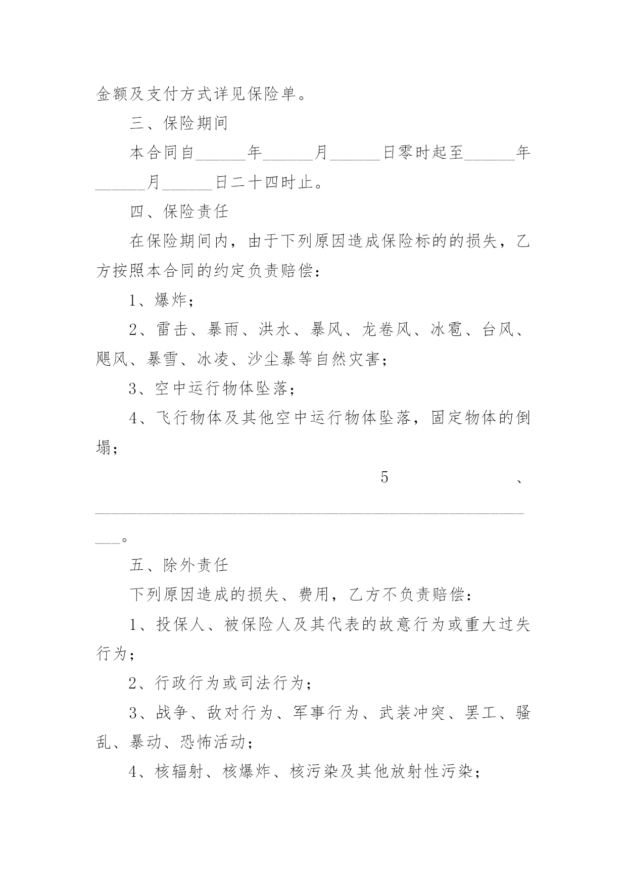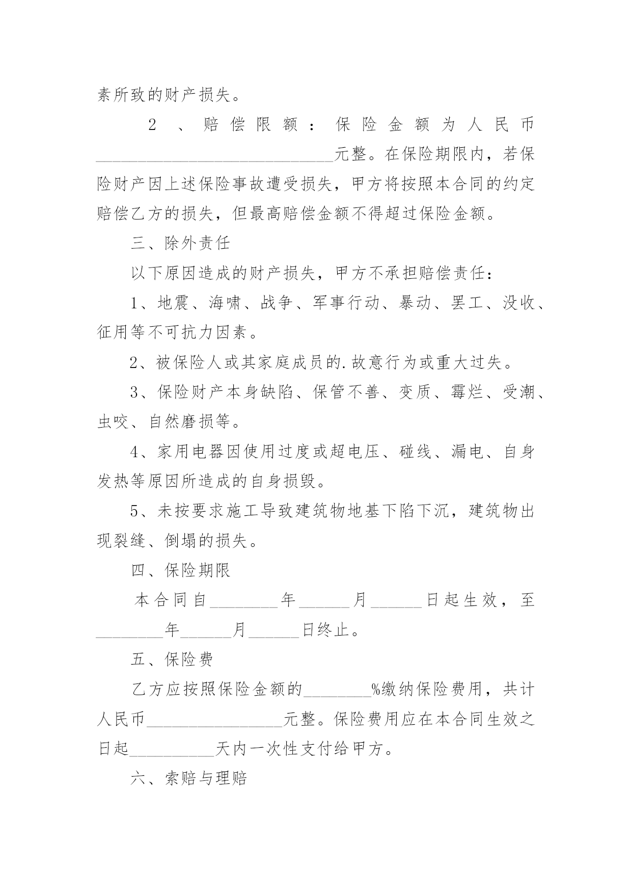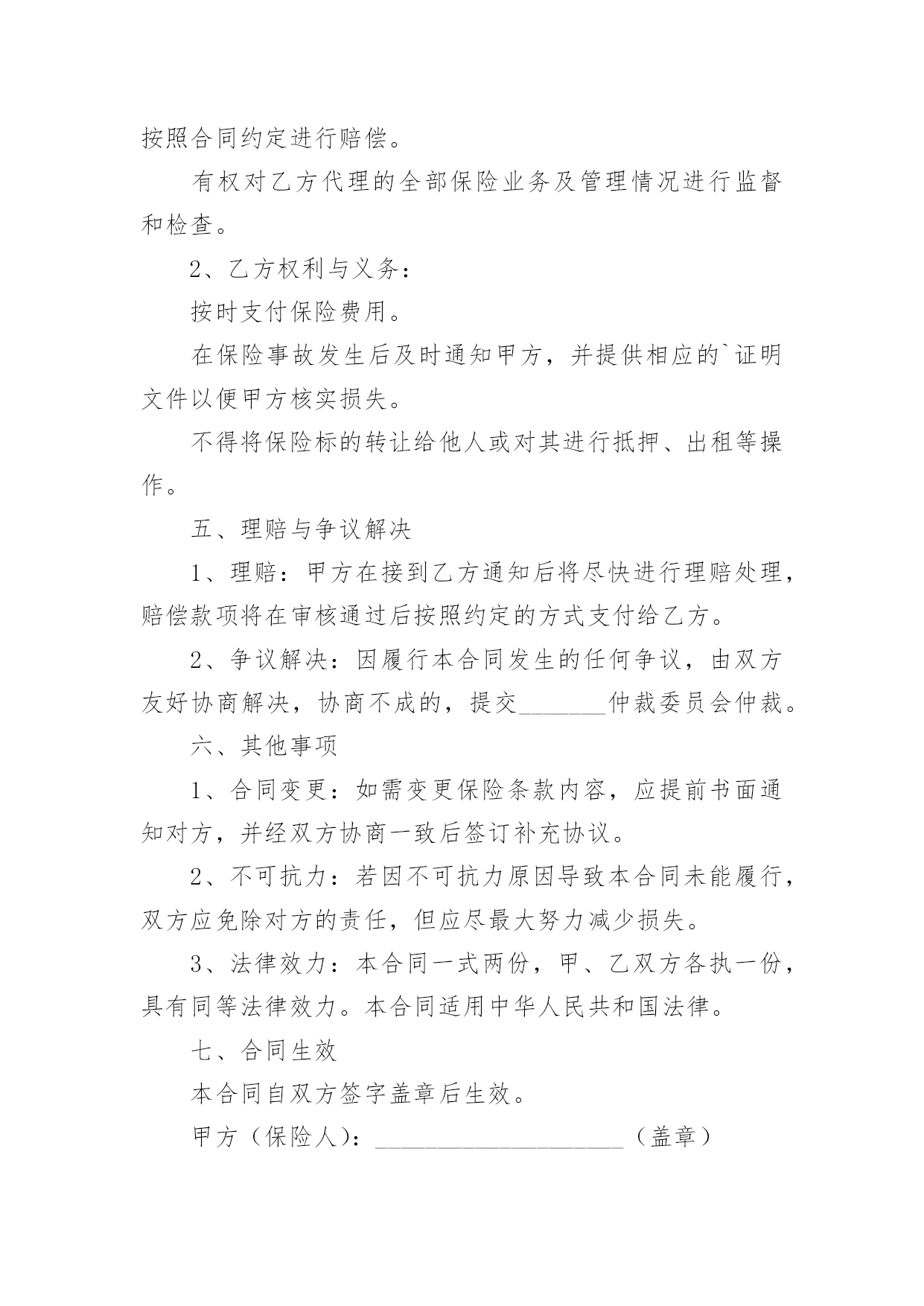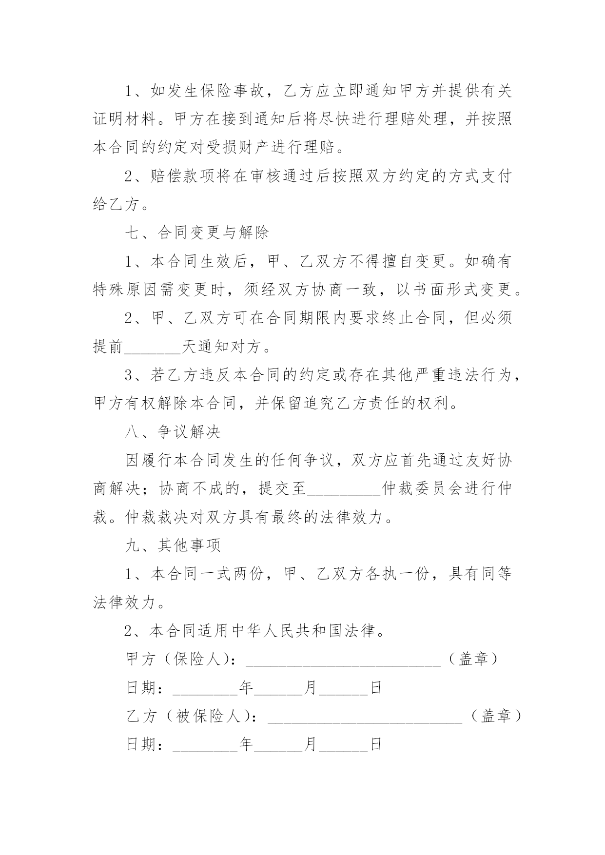 财产保险合同财产保险合同经典5篇随着广大人民群众法律意识的普遍提高,越来越多的场景和场合需要用到合同,签订合同也是非常有必要的行为。拟定合同的注意事项有许多,你确定会写吗?以下是小编为大家收集的财产保险合同,仅供参考,希望能够帮助到大家。财产保险合同篇1甲方(保险公司):____________________________地址:____________________________电话:____________________________乙方(投保人):____________________________地址:____________________________电话:____________________________根据《保险法》及相关法规,经甲方与乙方友好协商,就乙方的财产进行保险,达成如下条款:一、保险标的:乙方名下位于____________________________的'财产,具体包括但不限于房屋、家具、电器等。二、保险金额:人民币__________________________________________________元整(________________________元)。三、保险期限:自__________年______月______日起至__________年______月______日止。四、保险费用及支付方式:保险费用为人民币__________________________________________________元整(________________________元),由乙方按照约定的支付方式支付给甲方。五、保险责任:保险责任范围涵盖火灾、盗窃、水灾等意外情况。如发生保险事故,乙方需及时通知甲方,并按照约定程序提出理赔申请。六、投保人义务:乙方需遵守投保时约定的各项规定,如实提供相关信息;保护好保险标的,防止损失的发生;理赔时积极配合甲方的调查并提供必要的证明文件。七、保险条款:乙方签署本合同时,视为已经仔细阅读、理解并同意《财产保险条款》。八、争议解决:双方如发生争议,应通过友好协商解决;协商不成的,提交至______仲裁机构仲裁。九、生效与终止:本合同自双方签字或盖章之日起生效,直至保险期限届满。终止时须双方书面确认并办理相关手续。十、其他事项:本合同一式两份,甲乙双方各执一份,具有同等法律效力。甲方(保险公司)签字盖章:________________日期:__________年______月______日乙方(投保人)签字:________________日期:__________年______月______日财产保险合同篇2甲方(保险人):_____________有限公司乙方(被保险人):_____________有限公司根据《中华人民共和国合同法》及其它有关法律法规,甲、乙双方在平等、自愿、公平、诚实信用的基础上,经友好协商达成如下协议:一、保险范围与保险金额1、保险财产范围:包括但不限于乙方名下的企业财产,如厂房、办公楼、设备、机器、原材料、产品、库存等。2、保险事故范围:包括但不限于火灾、爆炸、雷击、盗窃、恶意破坏、暴乱、地震等不可抗力因素所致的财产损失。3、保险金额:人民币__________元整。二、保险期限本合同自__________年_______月_______日起生效,至__________年_______月_______日终止。三、保险费用1、保险费率:待保险公司报价。2、保险费支付:乙方应按照保险金额的__________%缴纳保险费用,共计人民币__________元整。保险费用应在本合同生效之日起15日内一次性支付给甲方。四、双方权利与义务1、甲方权利与义务:承担在乙方支付保险费后相应的保险责任。在保险期间内,乙方财产发生意外损失或损坏,甲方将按照合同约定进行赔偿。有权对乙方代理的全部保险业务及管理情况进行监督和检查。2、乙方权利与义务:按时支付保险费用。在保险事故发生后及时通知甲方,并提供相应的`证明文件以便甲方核实损失。不得将保险标的转让给他人或对其进行抵押、出租等操作。五、理赔与争议解决1、理赔:甲方在接到乙方通知后将尽快进行理赔处理,赔偿款项将在审核通过后按照约定的方式支付给乙方。2、争议解决:因履行本合同发生的任何争议,由双方友好协商解决,协商不成的,提交_______仲裁委员会仲裁。六、其他事项1、合同变更:如需变更保险条款内容,应提前书面通知对方,并经双方协商一致后签订补充协议。2、不可抗力:若因不可抗力原因导致本合同未能履行,双方应免除对方的责任,但应尽最大努力减少损失。3、法律效力:本合同一式两份,甲、乙双方各执一份,具有同等法律效力。本合同适用中华人民共和国法律。七、合同生效本合同自双方签字盖