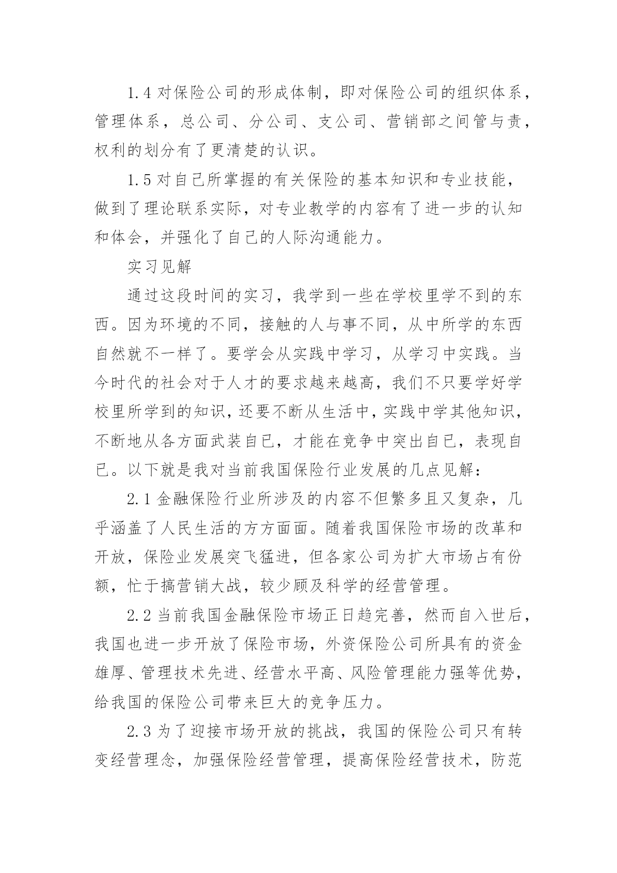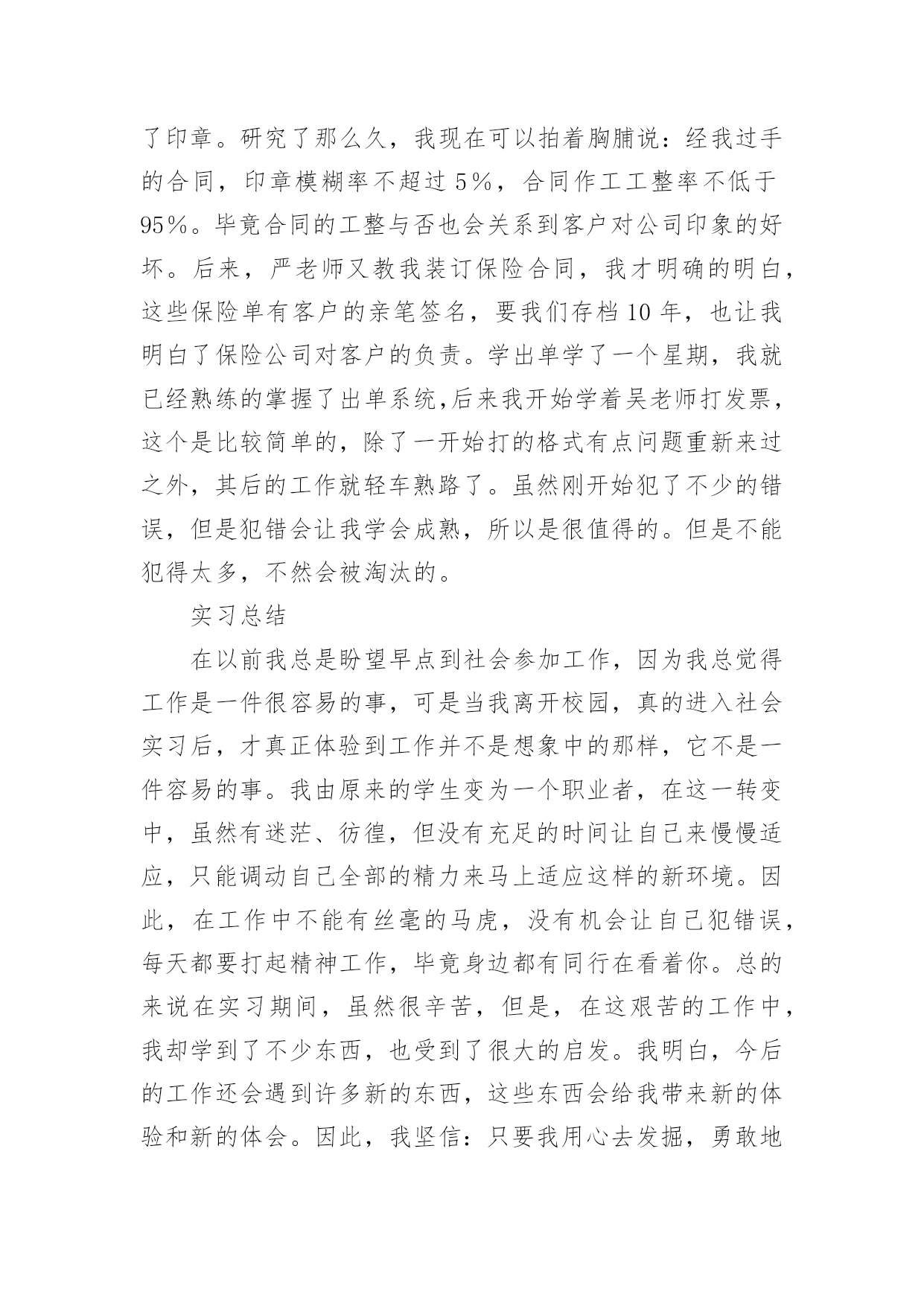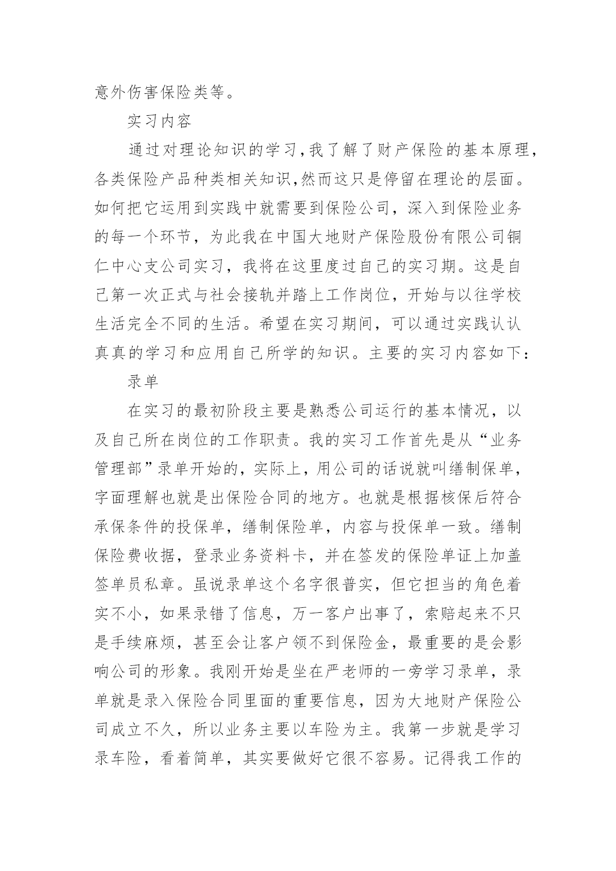 保险的实习报告保险的实习报告(汇编15篇)随着个人的素质不断提高,报告有着举足轻重的地位,报告具有语言陈述性的特点。你知道怎样写报告才能写的好吗?下面是小编精心整理的保险的实习报告,供大家参考借鉴,希望可以帮助到有需要的朋友。保险的实习报告1内容摘要实习是大学生完成学业所必经的一个过程,它让我们认识到自己角色的转变,使我们在实践中了解社会,让我们学到了很多在课堂上根本就学不到的知识,更打开了视野,增长了见识,为我们以后进一步走向社会打下坚实的基础。我于20xx年1月4日走进了中国大地保险股份有限公司铜仁中心支公司进行我的实习,在那里,我接受了更为实用的保险知识。这次实习让我了解了从大学到社会这一过度性阶段的生活,也让我学到很多做人做事的道理,更重要的是巩固了自己的专业知识和专业技能,为我下一步的职业设计生涯给予了一个好的开始。实习目的本次实习是为了拓展我们的知识面,扩大与社会的接触面,增加我们在社会竞争中的经验,锻炼和提高我们的能力,以便在以后毕业后能真真正正走入社会,能够适应国内外的经济形势的变化,并且能够在生活和工作中很好地处理各方面的问题,进一步运用所学知识分析和解决实际专业问题,提高我们的实际工作能力,为毕业实习和顶岗实习打下良好的基础。实习要求理论联系实际,学会运用所学的基础理论、基本知识和基本技能去解决实践中的具体问题。将学习的理论知识运用于实践当中,检验书本上理论的正确性,锻炼自己的动手能力并学会融会贯通,同时也能开拓视野,完善自己的知识结构达到锻炼能力的目的。一切是为了让我对金融保险专业知识形成客观,理性的认识,从而不与现实社会相脱节。实习公司简介1.中国大地财产保险股份有限公司中国大地财产保险前身为1949年10月成立的原中国人民保险公司,是经中国保监会批准成立,由中国再保险(集团)公司以投资人和主发起人的身份控股设立的全国性财产保险公司。公司成立于20xx年10月20日,注册资本金47.9亿元人民币,总部设立在上海。2.业务范围涵盖非寿险业务的各个领域包括企业财产保险类、机动车辆保险类、工程险类、责任险类、信用保险类、保证保险类、家庭财产保险类、货物运输保险类、船舶险类、农业保险类、以及短期健康保险和意外伤害保险类等。实习内容通过对理论知识的学习,我了解了财产保险的基本原理,各类保险产品种类相关知识,然而这只是停留在理论的层面。如何把它运用到实践中就需要到保险公司,深入到保险业务的每一个环节,为此我在中国大地财产保险股份有限公司铜仁中心支公司实习,我将在这里度过自己的实习期。这是自己第一次正式与社会接轨并踏上工作岗位,开始与以往学校生活完全不同的生活。希望在实习期间,可以通过实践认认真真的学习和应用自己所学的知识。主要的实习内容如下:录单在实习的最初阶段主要是熟悉公司运行的基本情况,以及自己所在岗位的工作职责。我的实习工作首先是从“业务管理部”录单开始的,实际上,用公司的话说就叫缮制保单,字面理解也就是出保险合同的地方。也就是根据核保后符合承保条件的投保单,缮制保险单,内容与投保单一致。缮制保险费收据,登录业务资料卡,并在签发的保险单证上加盖签单员私章。虽说录单这个名字很普实,但它担当的角色着实不小,如果录错了信息,万一客户出事了,索赔起来不只是手续麻烦,甚至会让客户领不到保险金,最重要的是会影响公司的形象。我刚开始是坐在严老师的一旁学习录单,录单就是录入保险合同里面的重要信息,因为大地财产保险公司成立不久,所以业务主要以车险为主。我第一步就是学习录车险,看着简单,其实要做好它很不容易。记得我工作的第一天,什么事情都不会,工作不知道怎么展开,后来还是通过自己的观察和模仿,才慢慢上手的。缮制保险单证根据投保单及核保人员签署的意见,由出单人员通过电脑缮制《机动车辆保险单》,经复核人员复核后出单。首先要客户提供资料有身份证、车辆合格证或者行驶证、购车发票。机动车辆保险的标的因险种不同而各异。车辆损失险的保险标的是各种机动车辆,主要是经交通管理部门检验合格并具有有效行驶证和号牌的各种机动车辆,包括各种汽车、摩托车。拖拉机、各种专业机械扯和特种车等;机动车交通事故责任强制保险与机动车商业险第三者责任保险的保险标的则是保险车辆因意外事故致使他人遭受人身伤亡或财产的直接依法应负的赔偿责任。机动车辆保险可分为机动车辆基本险和附加险。其中,机动车辆损失险、机动车交通事故责任强制保险和机动车商业险第三者责任保险是机动车辆保险的基本险。附加险因各公司的条款规定不同而异,附加险不能独立承保。单证清分、装订、归档对已填具的投保单、保险保险发票、保险证等及时进行清理归档,对留存业务部门的单证,由业务内勤按要求整理、装订,并将装订成册的保险单证在有效期内由业务部门指定专人妥善保管。装订合同看起来简单,其实,要把一份合同装订的紧凑、整