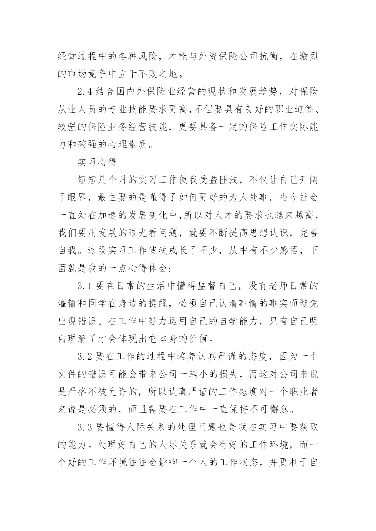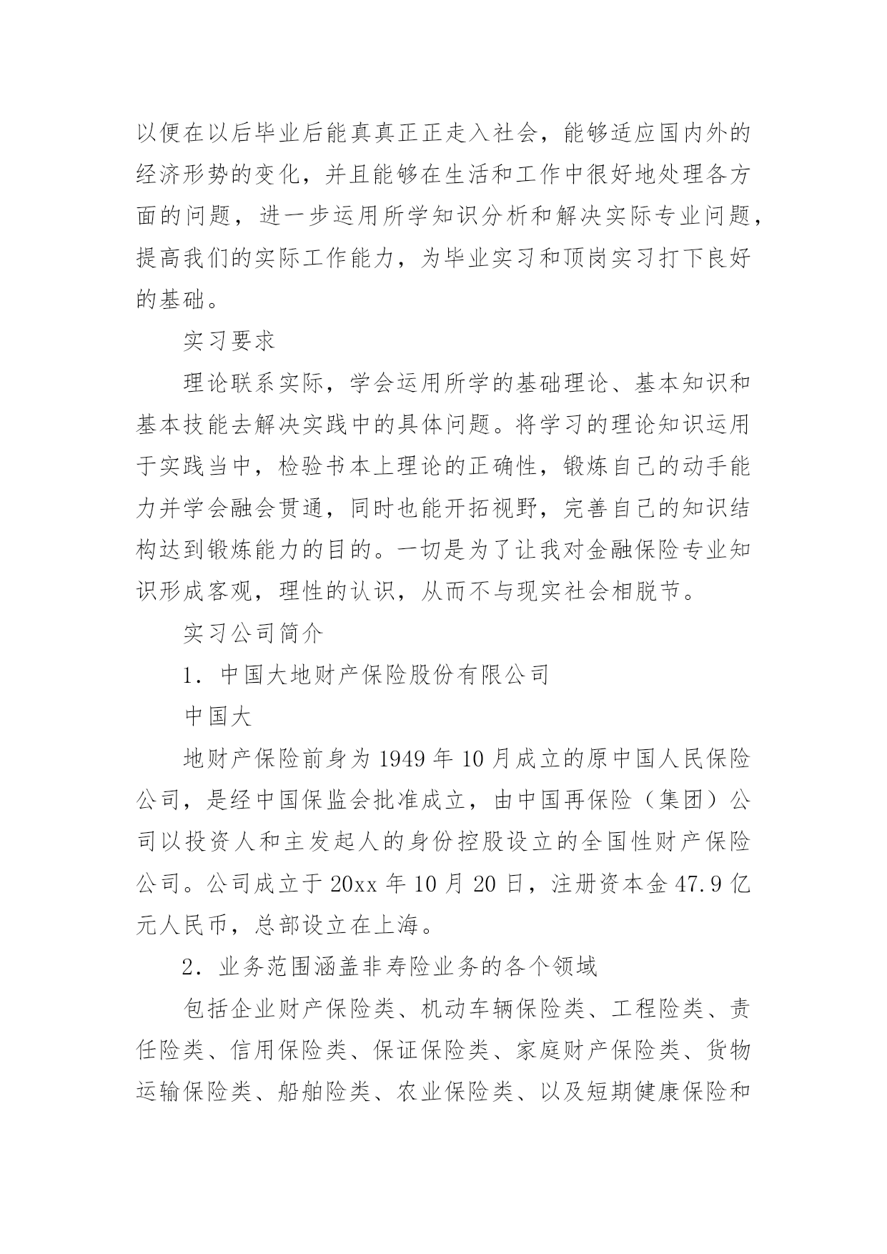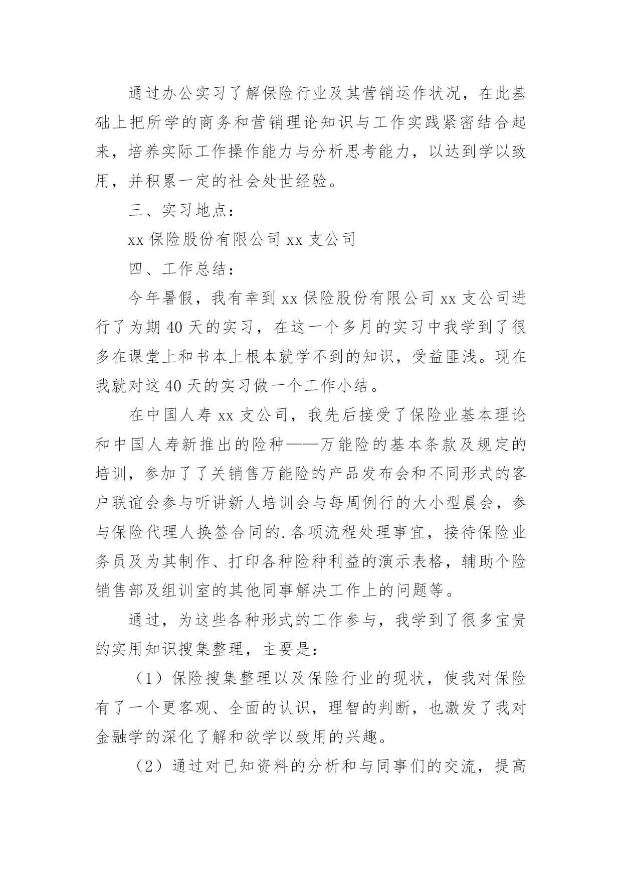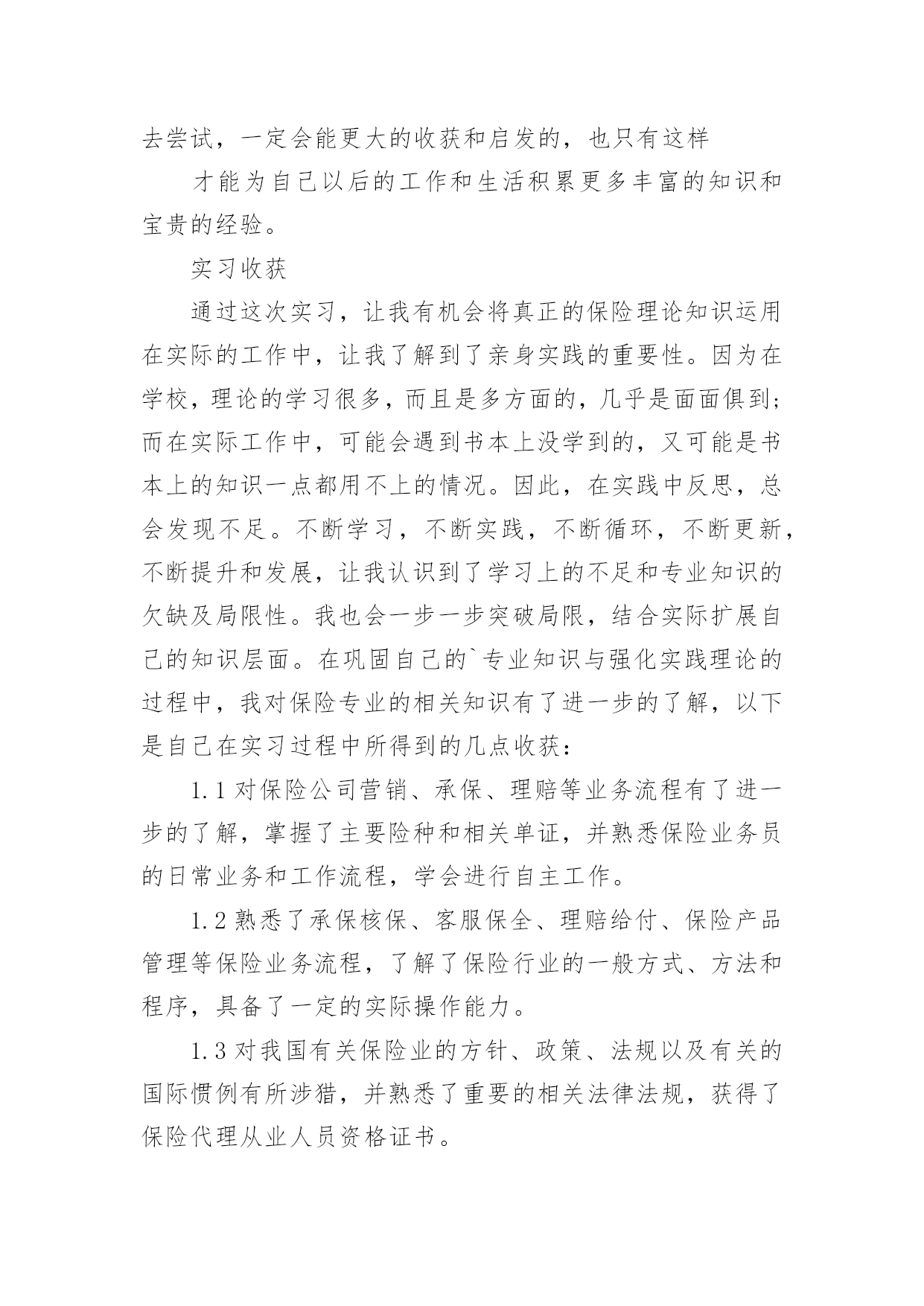 保险的实习报告保险的实习报告(汇编15篇)随着个人的素质不断提高,报告有着举足轻重的地位,报告具有语言陈述性的特点。你知道怎样写报告才能写的好吗?下面是小编精心整理的保险的实习报告,供大家参考借鉴,希望可以帮助到有需要的朋友。保险的实习报告1内容摘要实习是大学生完成学业所必经的一个过程,它让我们认识到自己角色的转变,使我们在实践中了解社会,让我们学到了很多在课堂上根本就学不到的知识,更打开了视野,增长了见识,为我们以后进一步走向社会打下坚实的基础。我于20xx年1月4日走进了中国大地保险股份有限公司铜仁中心支公司进行我的实习,在那里,我接受了更为实用的保险知识。这次实习让我了解了从大学到社会这一过度性阶段的生活,也让我学到很多做人做事的道理,更重要的是巩固了自己的专业知识和专业技能,为我下一步的职业设计生涯给予了一个好的开始。实习目的本次实习是为了拓展我们的知识面,扩大与社会的接触面,增加我们在社会竞争中的经验,锻炼和提高我们的能力,以便在以后毕业后能真真正正走入社会,能够适应国内外的经济形势的变化,并且能够在生活和工作中很好地处理各方面的问题,进一步运用所学知识分析和解决实际专业问题,提高我们的实际工作能力,为毕业实习和顶岗实习打下良好的基础。实习要求理论联系实际,学会运用所学的基础理论、基本知识和基本技能去解决实践中的具体问题。将学习的理论知识运用于实践当中,检验书本上理论的正确性,锻炼自己的动手能力并学会融会贯通,同时也能开拓视野,完善自己的知识结构达到锻炼能力的目的。一切是为了让我对金融保险专业知识形成客观,理性的认识,从而不与现实社会相脱节。实习公司简介1.中国大地财产保险股份有限公司中国大地财产保险前身为1949年10月成立的原中国人民保险公司,是经中国保监会批准成立,由中国再保险(集团)公司以投资人和主发起人的身份控股设立的全国性财产保险公司。公司成立于20xx年10月20日,注册资本金47.9亿元人民币,总部设立在上海。2.业务范围涵盖非寿险业务的各个领域包括企业财产保险类、机动车辆保险类、工程险类、责任险类、信用保险类、保证保险类、家庭财产保险类、货物运输保险类、船舶险类、农业保险类、以及短期健康保险和意外伤害保险类等。实习内容通过对理论知识的学习,我了解了财产保险的基本原理,各类保险产品种类相关知识,然而这只是停留在理论的层面。如何把它运用到实践中就需要到保险公司,深入到保险业务的每一个环节,为此我在中国大地财产保险股份有限公司铜仁中心支公司实习,我将在这里度过自己的实习期。这是自己第一次正式与社会接轨并踏上工作岗位,开始与以往学校生活完全不同的生活。希望在实习期间,可以通过实践认认真真的学习和应用自己所学的知识。主要的实习内容如下:录单在实习的最初阶段主要是熟悉公司运行的基本情况,以及自己所在岗位的工作职责。我的实习工作首先是从“业务管理部”录单开始的,实际上,用公司的话说就叫缮制保单,字面理解也就是出保险合同的地方。也就是根据核保后符合承保条件的投保单,缮制保险单,内容与投保单一致。缮制保险费收据,登录业务资料卡,并在签发的保险单证上加盖签单员私章。虽说录单这个名字很普实,但它担当的角色着实不小,如果录错了信息,万一客户出事了,索赔起来不只是手续麻烦,甚至会让客户领不到保险金,最重要的是会影响公司的形象。我刚开始是坐在严老师的一旁学习录单,录单就是录入保险合同里面的重要信息,因为大地财产保险公司成立不久,所以业务主要以车险为主。我第一步就是学习录车险,看着简单,其实要做好它很不容易。记得我工作的第一天,什么事情都不会,工作不知道怎么展开,后来还是通过自己的观察和模仿,才慢慢上手的。缮制保险单证根据投保单及核保人员签署的意见,由出单人员通过电脑缮制《机动车辆保险单》,经复核人员复核后出单。首先要客户提供资料有身份证、车辆合格证或者行驶证、购车发票。机动车辆保险的标的因险种不同而各异。车辆损失险的保险标的是各种机动车辆,主要是经交通管理部门检验合格并具有有效行驶证和号牌的各种机动车辆,包括各种汽车、摩托车。拖拉机、各种专业机械扯和特种车等;机动车交通事故责任强制保险与机动车商业险第三者责任保险的保险标的则是保险车辆因意外事故致使他人遭受人身伤亡或财产的直接依法应负的赔偿责任。机动车辆保险可分为机动车辆基本险和附加险。其中,机动车辆损失险、机动车交通事故责任强制保险和机动车商业险第三者责任保险是机动车辆保险的基本险。附加险因各公司的条款规定不同而异,附加险不能独立承保。单证清分、装订、归档对已填具的投保单、保险保险发票、保险证等及时进行清理归档,对留存业务部门的单证,由业务内勤按要求整理、装订,并将装订成册的保险单证在有效期内由业务部门指定专人妥善保管。装订合同看起来简单,其实,要把一份合同装订的紧凑、整