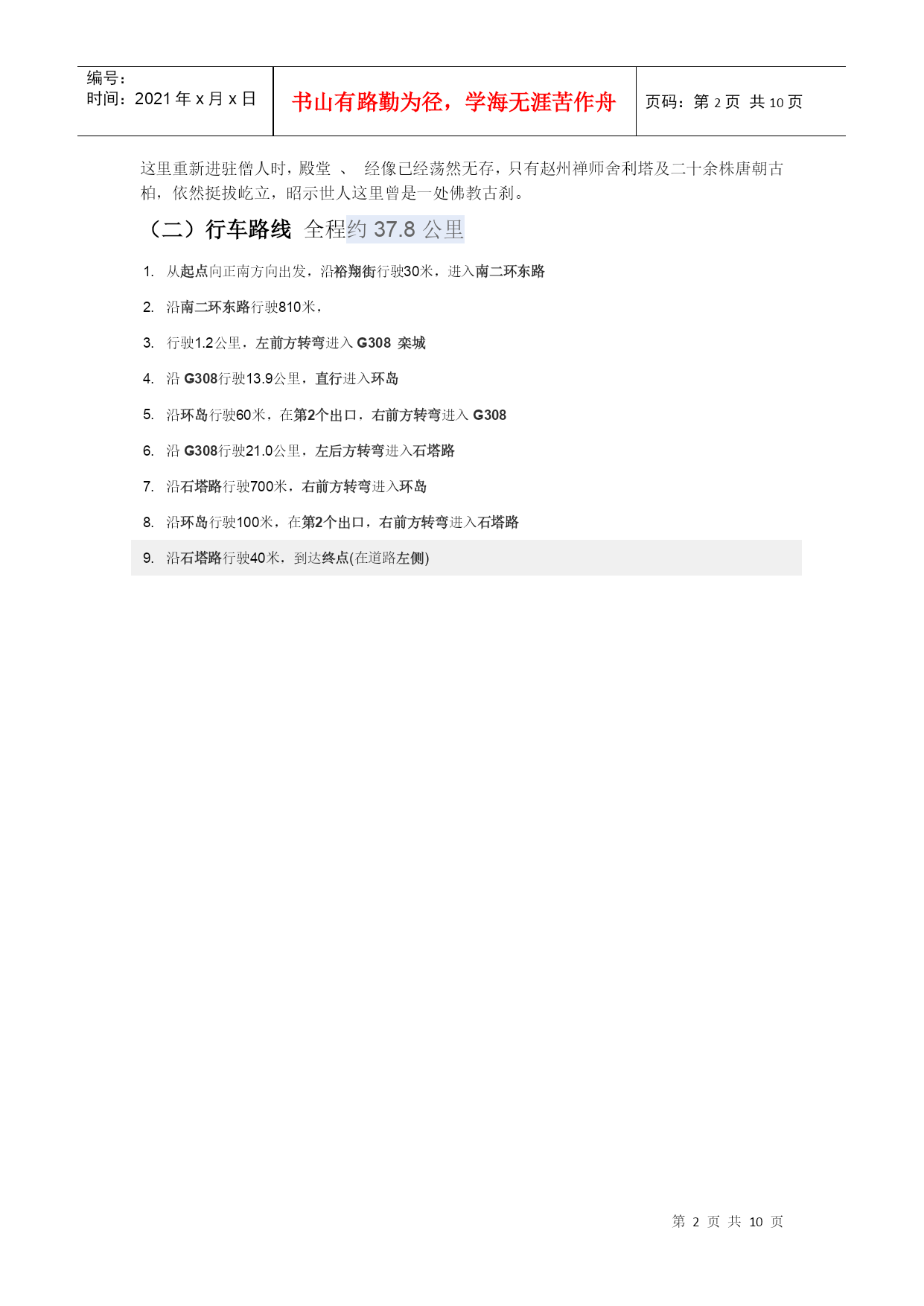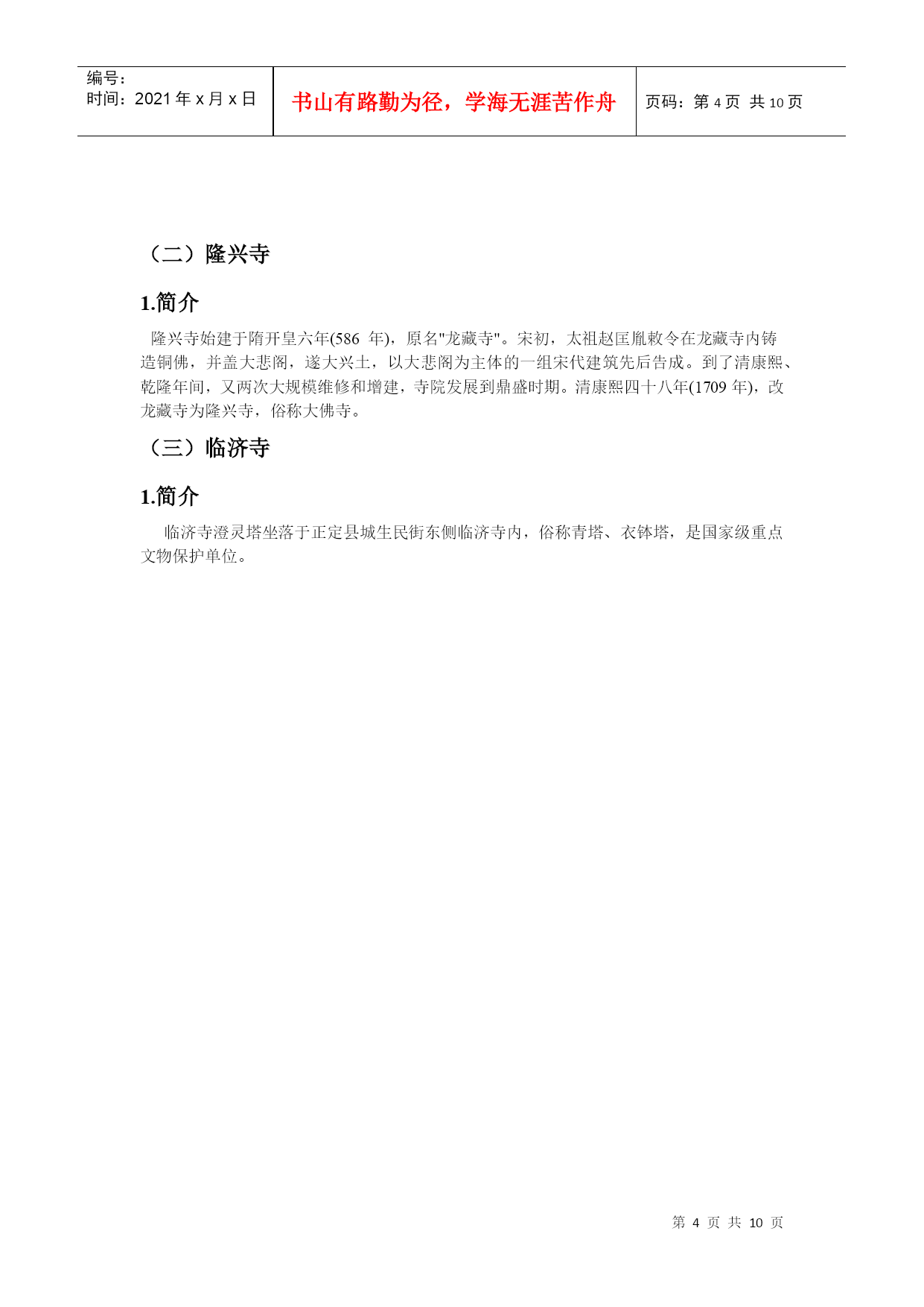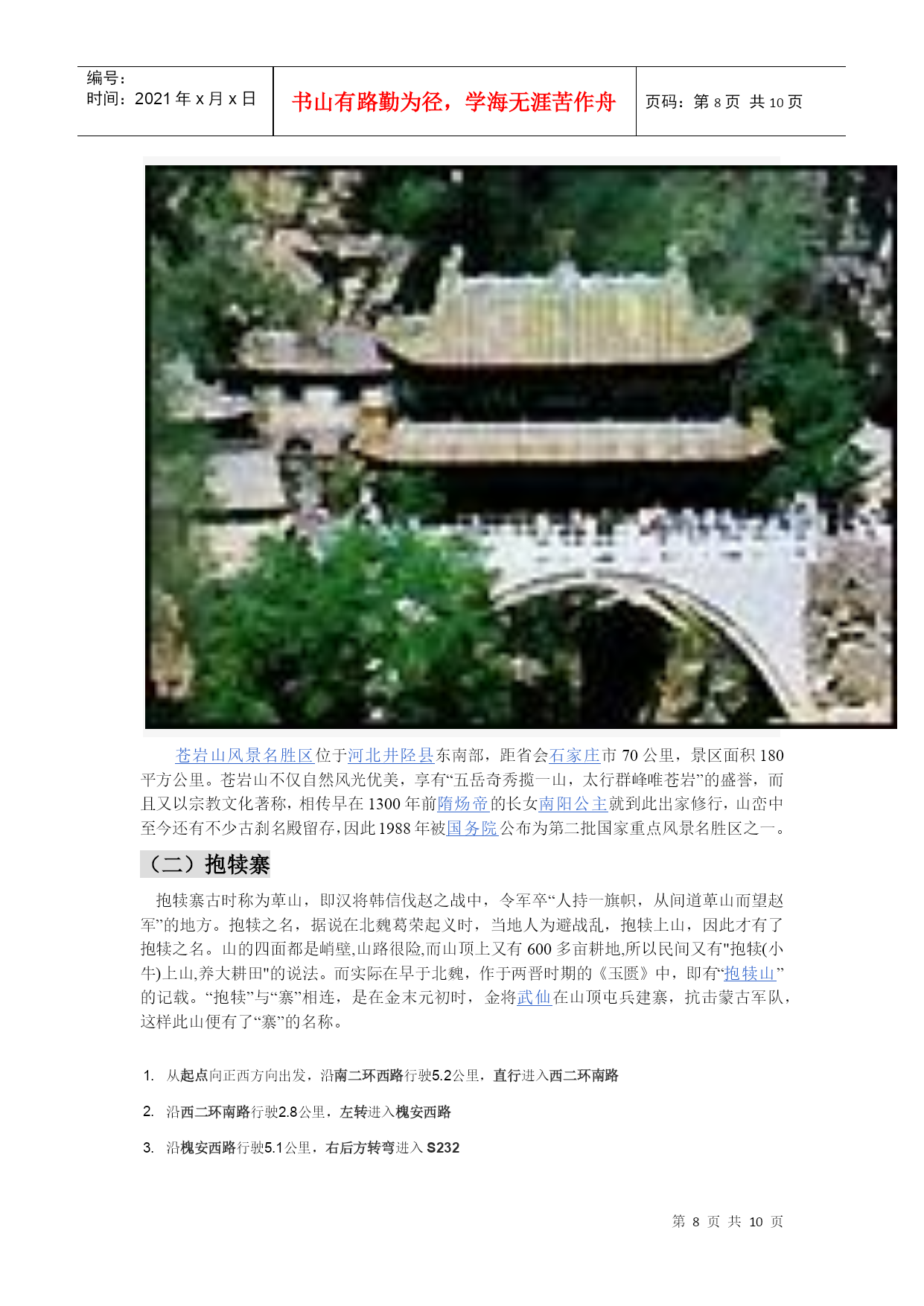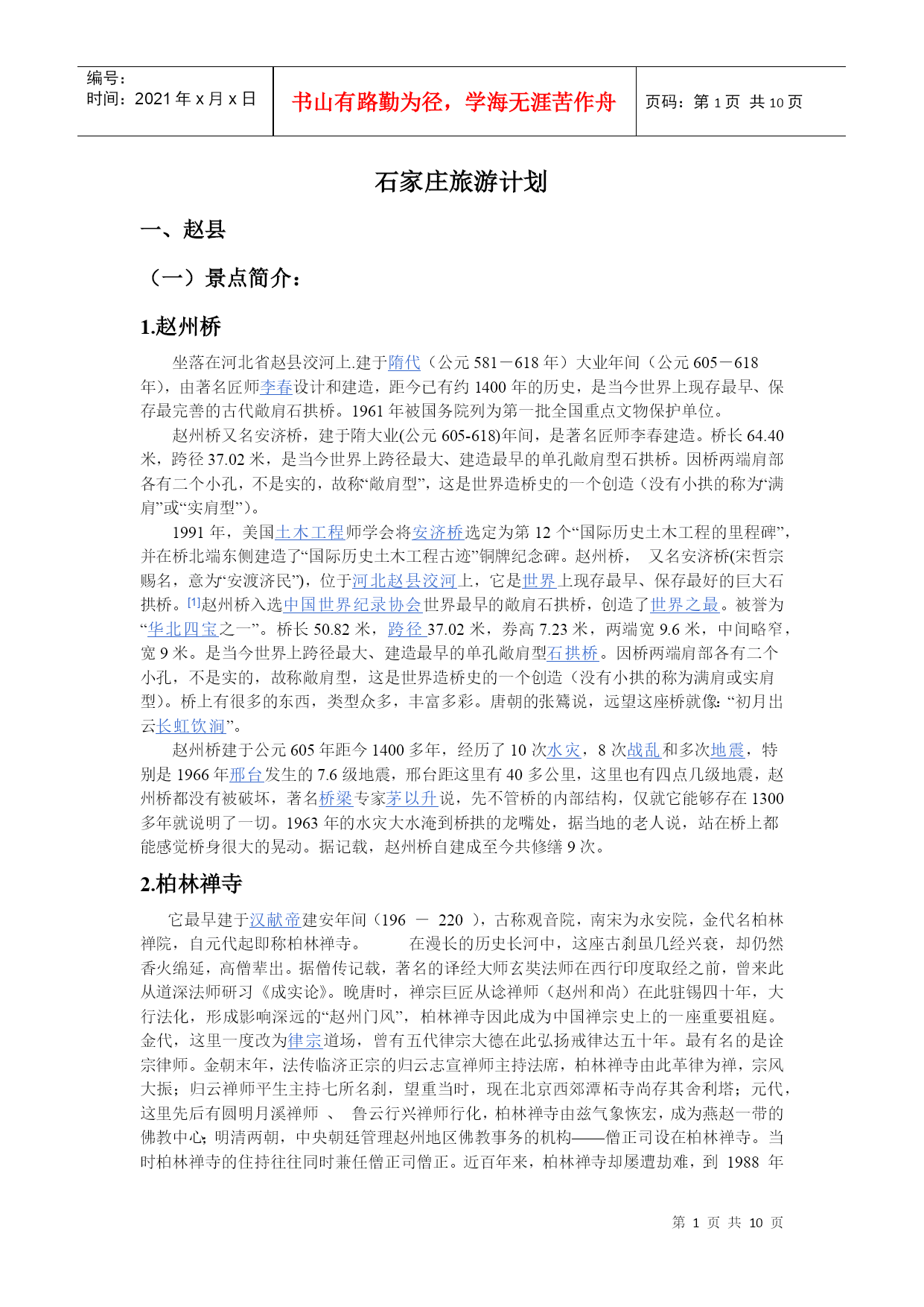 编号:时间:2021年x月x日书山有路勤为径,学海无涯苦作舟页码:第PAGE10页共NUMPAGES10页第PAGE\*MERGEFORMAT10页共NUMPAGES\*MERGEFORMAT10页石家庄旅游计划赵县(一)景点简介:1.赵州桥坐落在河北省赵县洨河上.建于HYPERLINK"http://baike.baidu.com/view/553903.htm"隋代(公元581-618年)大业年间(公元605-618年),由著名匠师HYPERLINK"http://baike.baidu.com/view/41125.htm"李春设计和建造,距今已有约1400年的历史,是当今世界上现存最早、保存最完善的古代敞肩石拱桥。1961年被国务院列为第一批全国重点文物保护单位。赵州桥又名安济桥,建于隋大业(公元605-618)年间,是著名匠师李春建造。桥长64.40米,跨径37.02米,是当今世界上跨径最大、建造最早的单孔敞肩型石拱桥。因桥两端肩部各有二个小孔,不是实的,故称“敞肩型”,这是世界造桥史的一个创造(没有小拱的称为“满肩”或“实肩型”)。1991年,美国HYPERLINK"http://baike.baidu.com/view/20031.htm"土木工程师学会将HYPERLINK"http://baike.baidu.com/view/37128.htm"安济桥选定为第12个“国际历史土木工程的里程碑”,并在桥北端东侧建造了“国际历史土木工程古迹”铜牌纪念碑。赵州桥,又名安济桥(宋哲宗赐名,意为“安渡济民”),位于HYPERLINK"http://baike.baidu.com/view/4675.htm"河北HYPERLINK"http://baike.baidu.com/view/69082.htm"赵县HYPERLINK"http://baike.baidu.com/view/1272699.htm"洨河上,它是HYPERLINK"http://baike.baidu.com/view/8083.htm"世界上现存最早、保存最好的巨大石拱桥。[1]赵州桥入选HYPERLINK"http://baike.baidu.com/view/2931242.htm"中国世界纪录协会世界最早的敞肩石拱桥,创造了HYPERLINK"http://baike.baidu.com/view/31789.htm"世界之最。被誉为“HYPERLINK"http://baike.baidu.com/view/752688.htm"华北四宝之一”。桥长50.82米,HYPERLINK"http://baike.baidu.com/view/1203372.htm"跨径37.02米,券高7.23米,两端宽9.6米,中间略窄,宽9米。是当今世界上跨径最大、建造最早的单孔敞肩型HYPERLINK"http://baike.baidu.com/view/137435.htm"石拱桥。因桥两端肩部各有二个小孔,不是实的,故称敞肩型,这是世界造桥史的一个创造(没有小拱的称为满肩或实肩型)。桥上有很多的东西,类型众多,丰富多彩。唐朝的张鷟说,远望这座桥就像:“初月出云HYPERLINK"http://baike.baidu.com/view/1999910.htm"长虹饮涧”。赵州桥建于公元605年距今1400多年,经历了10次HYPERLINK"http://baike.baidu.com/view/422413.htm"水灾,8次HYPERLINK"http://baike.baidu.com/view/562608.htm"战乱和多次HYPERLINK"http://baike.baidu.com/view/781.htm"地震,特别是1966年HYPERLINK"http://baike.baidu.com/view/10712.htm"邢台发生的7.6级地震,邢台距这里有40多公里,这里也有四点几级地震,赵州桥都没有被破坏,著名HYPERLINK"http://baike.baidu.com/view/113819.htm"桥梁专家HYPERLINK"http://baike.baidu.com/view/23034.htm"茅以升说,先不管桥的内部结构,仅就它能够存在1300多年就说明了一切。1963年的水灾大水淹到桥拱的龙嘴处,据当地的老人说,站在桥上都能感觉桥身很大的晃动。据记载,赵州桥自建成至今共修缮9次。2.柏林禅寺它最早建于HYPERLINK"http://b