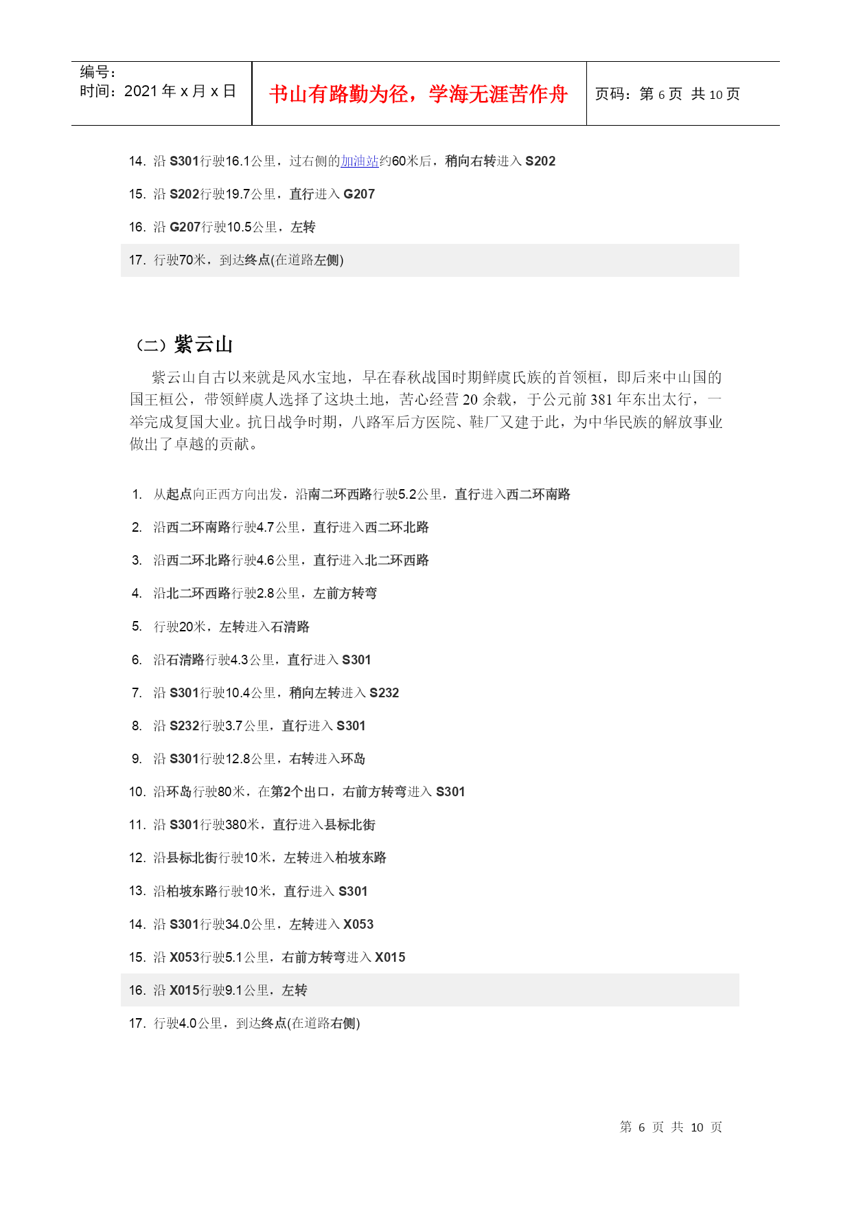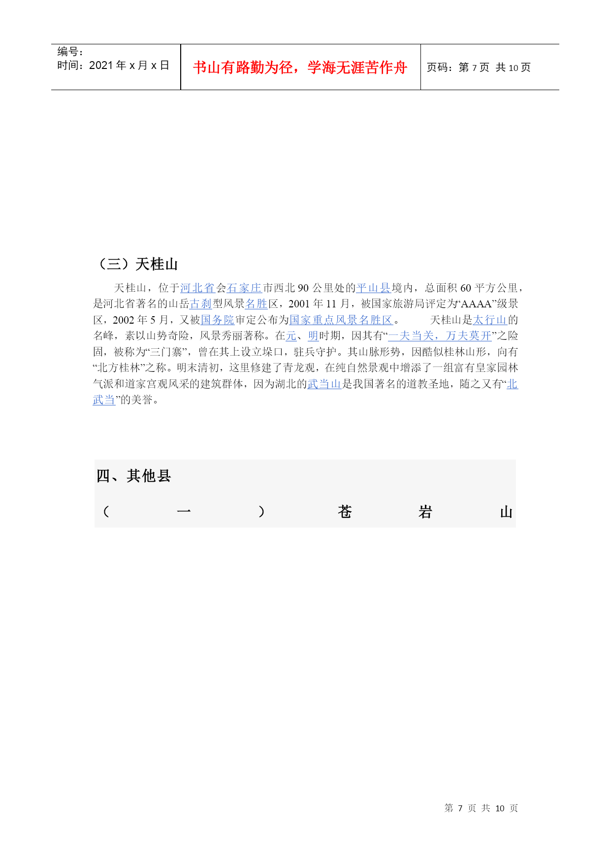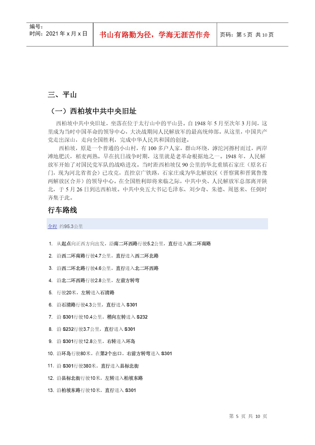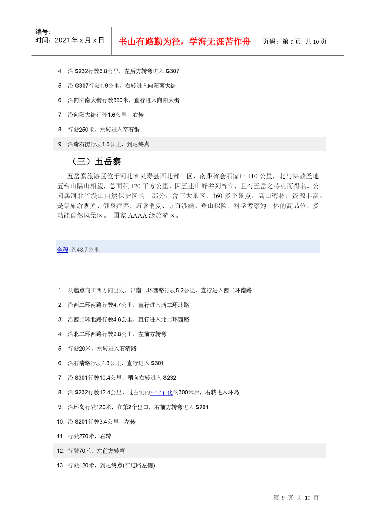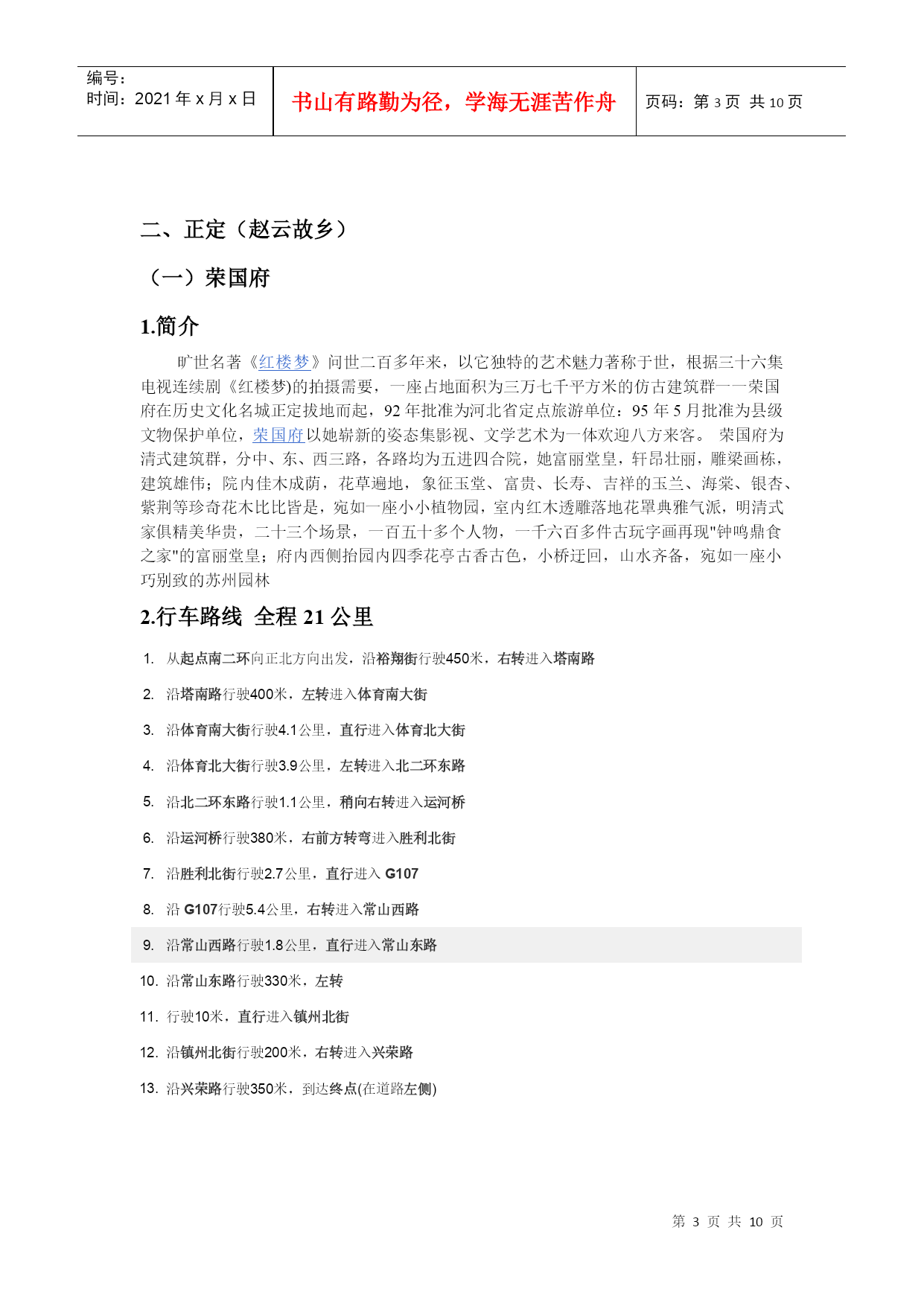 编号:时间:2021年x月x日书山有路勤为径,学海无涯苦作舟页码:第PAGE10页共NUMPAGES10页第PAGE\*MERGEFORMAT10页共NUMPAGES\*MERGEFORMAT10页石家庄旅游计划赵县(一)景点简介:1.赵州桥坐落在河北省赵县洨河上.建于HYPERLINK"http://baike.baidu.com/view/553903.htm"隋代(公元581-618年)大业年间(公元605-618年),由著名匠师HYPERLINK"http://baike.baidu.com/view/41125.htm"李春设计和建造,距今已有约1400年的历史,是当今世界上现存最早、保存最完善的古代敞肩石拱桥。1961年被国务院列为第一批全国重点文物保护单位。赵州桥又名安济桥,建于隋大业(公元605-618)年间,是著名匠师李春建造。桥长64.40米,跨径37.02米,是当今世界上跨径最大、建造最早的单孔敞肩型石拱桥。因桥两端肩部各有二个小孔,不是实的,故称“敞肩型”,这是世界造桥史的一个创造(没有小拱的称为“满肩”或“实肩型”)。1991年,美国HYPERLINK"http://baike.baidu.com/view/20031.htm"土木工程师学会将HYPERLINK"http://baike.baidu.com/view/37128.htm"安济桥选定为第12个“国际历史土木工程的里程碑”,并在桥北端东侧建造了“国际历史土木工程古迹”铜牌纪念碑。赵州桥,又名安济桥(宋哲宗赐名,意为“安渡济民”),位于HYPERLINK"http://baike.baidu.com/view/4675.htm"河北HYPERLINK"http://baike.baidu.com/view/69082.htm"赵县HYPERLINK"http://baike.baidu.com/view/1272699.htm"洨河上,它是HYPERLINK"http://baike.baidu.com/view/8083.htm"世界上现存最早、保存最好的巨大石拱桥。[1]赵州桥入选HYPERLINK"http://baike.baidu.com/view/2931242.htm"中国世界纪录协会世界最早的敞肩石拱桥,创造了HYPERLINK"http://baike.baidu.com/view/31789.htm"世界之最。被誉为“HYPERLINK"http://baike.baidu.com/view/752688.htm"华北四宝之一”。桥长50.82米,HYPERLINK"http://baike.baidu.com/view/1203372.htm"跨径37.02米,券高7.23米,两端宽9.6米,中间略窄,宽9米。是当今世界上跨径最大、建造最早的单孔敞肩型HYPERLINK"http://baike.baidu.com/view/137435.htm"石拱桥。因桥两端肩部各有二个小孔,不是实的,故称敞肩型,这是世界造桥史的一个创造(没有小拱的称为满肩或实肩型)。桥上有很多的东西,类型众多,丰富多彩。唐朝的张鷟说,远望这座桥就像:“初月出云HYPERLINK"http://baike.baidu.com/view/1999910.htm"长虹饮涧”。赵州桥建于公元605年距今1400多年,经历了10次HYPERLINK"http://baike.baidu.com/view/422413.htm"水灾,8次HYPERLINK"http://baike.baidu.com/view/562608.htm"战乱和多次HYPERLINK"http://baike.baidu.com/view/781.htm"地震,特别是1966年HYPERLINK"http://baike.baidu.com/view/10712.htm"邢台发生的7.6级地震,邢台距这里有40多公里,这里也有四点几级地震,赵州桥都没有被破坏,著名HYPERLINK"http://baike.baidu.com/view/113819.htm"桥梁专家HYPERLINK"http://baike.baidu.com/view/23034.htm"茅以升说,先不管桥的内部结构,仅就它能够存在1300多年就说明了一切。1963年的水灾大水淹到桥拱的龙嘴处,据当地的老人说,站在桥上都能感觉桥身很大的晃动。据记载,赵州桥自建成至今共修缮9次。2.柏林禅寺它最早建于HYPERLINK"http://b