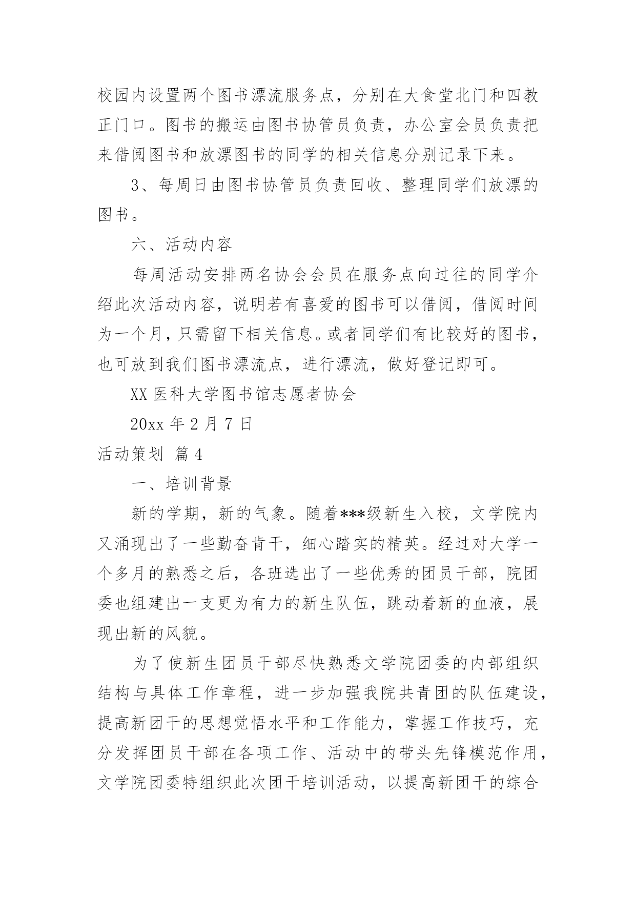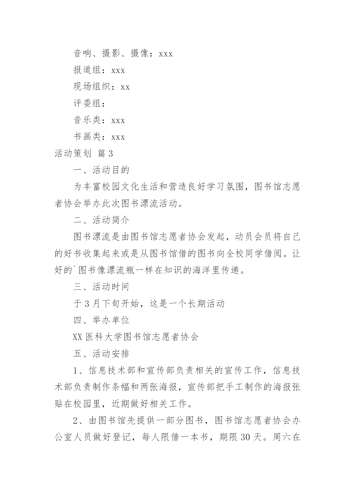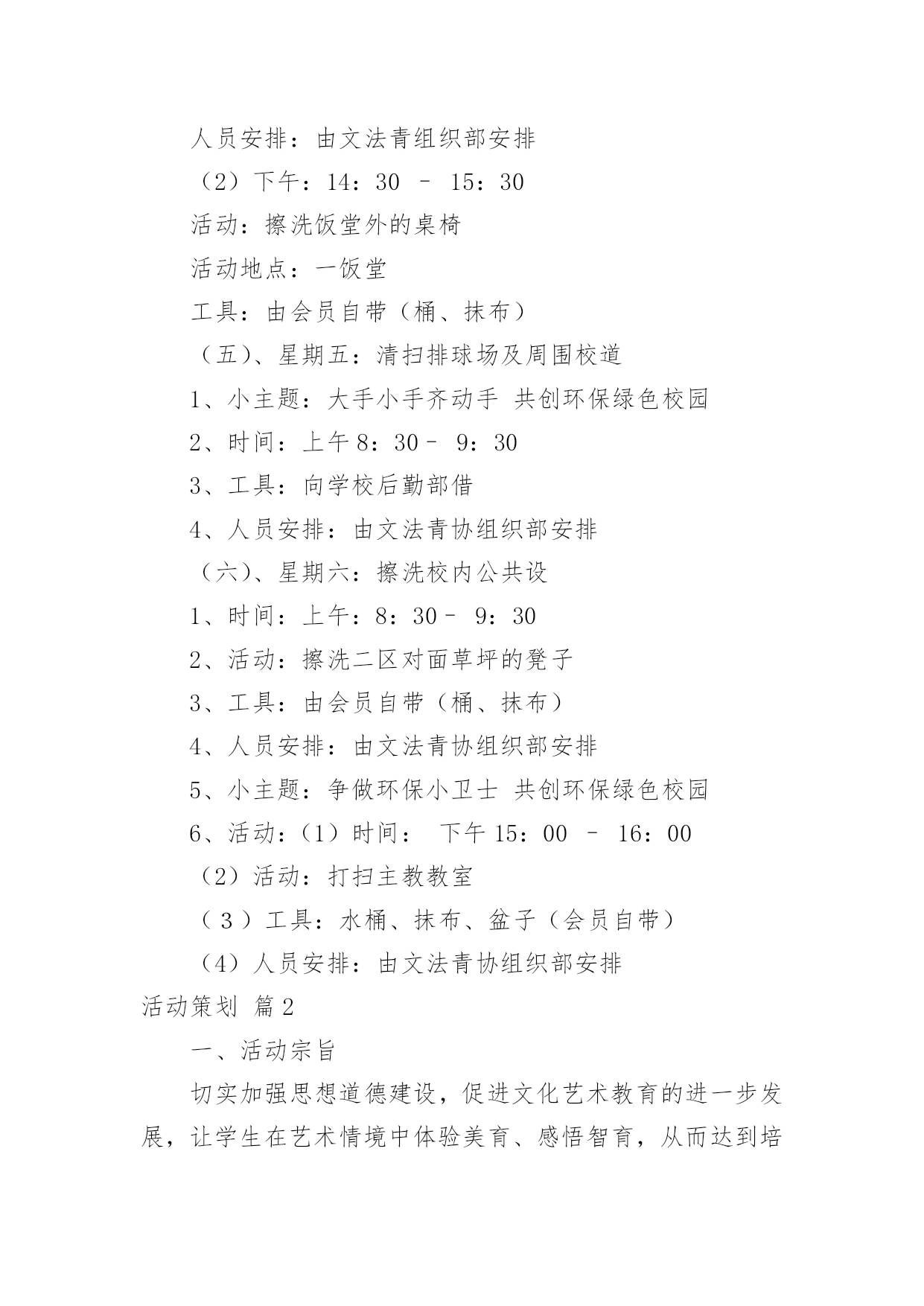 活动策划【精选】活动策划活动策划篇1一、活动背景:随着世界各国经济的迅速发展和生产力水平不断提高,人类对环境的影响越来越大,环境问题已日益突出和尖锐化。严重的生态破坏和环境污染问题已成为当代人类社会面临的重大问题。校园的污染也越来越严重;草坪上的垃圾越来越多;同学们都把装早餐的'袋子留在课室里,污染了我们的学习环境,严重地影响了同学们的学习情绪.二、活动目的:通过该项活动,让广大师生了解、认识到保护环境,爱护环境,珍惜资源的重要性。让更多的人加入到环保的行列中,携手共同营造一个绿色的校园传递绿色文化。三、活动地点及时间:广东石油化工学院校园内4月25日至4月30日四、活动对象:大一、大二的同学(每班招10个会员)五、前期准备:1、负责人去学校后勤部咨询相关问题,并提前说明活动期间要向他们借打扫的相关工具。2、由文法青协组织部的人员对这次活动进行宣传4、由文法青协组织部根据活动流程安排参加活动的值班人员。六、活动开展:(一)、星期一:清洁校园道路1、时间:上午8:30–9:302、地点:二区、四区门口3、工具:向学校后勤工具管理部门借4、人员安排:由文法青协组织部安排(二)、星期二:擦洗校内公共设施1、时间:上午:10:00–11:002、活动:擦洗东湖的凳子以及长廊3、工具:由会员自带(桶、抹布)4、人员安排:由文法青协组织部安排(三)、星期三:擦洗校内公共设1、时间:8:30–9:302、活动地点:五区草坪的凳子3、工具:由会员自带(桶、抹布)4、人员安排:由文法青协组织部安排(四)、星期四:1、小主题:大手小手齐动手共创环保绿色校园2、(1)上午8:00–9:00活动:清扫篮球场周围的落叶工具:向学校后勤部借人员安排:由文法青组织部安排(2)下午:14:30–15:30活动:擦洗饭堂外的桌椅活动地点:一饭堂工具:由会员自带(桶、抹布)(五)、星期五:清扫排球场及周围校道1、小主题:大手小手齐动手共创环保绿色校园2、时间:上午8:30–9:303、工具:向学校后勤部借4、人员安排:由文法青协组织部安排(六)、星期六:擦洗校内公共设1、时间:上午:8:30–9:302、活动:擦洗二区对面草坪的凳子3、工具:由会员自带(桶、抹布)4、人员安排:由文法青协组织部安排5、小主题:争做环保小卫士共创环保绿色校园6、活动:(1)时间:下午15:00–16:00(2)活动:打扫主教教室(3)工具:水桶、抹布、盆子(会员自带)(4)人员安排:由文法青协组织部安排活动策划篇2一、活动宗旨切实加强思想道德建设,促进文化艺术教育的进一步发展,让学生在艺术情境中体验美育、感悟智育,从而达到培养学生健康的审美情趣和良好的艺术修养,提高综合素质的目的,并营造积极向上、格调高雅、健康文明的育人环境。通过举办此次活动,旨在推动普及学生艺术教育,挖掘、发现和推动我校学生中的艺术人才及素质教育所取得的成果,全面提升学生的.综合素质。展现我校学生的艺术才华和精神风貌,为其全方位、多元化地搭建展示平台,二、活动主题:“红领巾牵手中国梦——个人才艺展风采”三、主办及承办单位:主办:淤溪中心小学。承办:淤溪中心小学少先队大队部四、活动时间:20xx年11月22日(周五)下午五、活动地点:学校多功能教室。六、活动项目:声乐、器乐、舞蹈、书法、绘画。七、活动方法:1.比赛以班为单位报名,初评后选出质量好的节目上报参加学校比赛。2.个人比赛。每个节目时限最多在5分钟之内。3.大会只提供音响及2个麦克风,其他所有器材和用品一律由参赛者自备并提前做好准备。八、人员安排:音乐类筛选负责人:xx(每个项目筛选六名同学参赛)美术书法类筛选负责人:xx(绘画统一命题《我的中国梦》)音响、摄影、摄像:xxx报道组:xxx现场组织:xx评委组:音乐类:xxx书画类:xxx活动策划篇3一、活动目的为丰富校园文化生活和营造良好学习氛围,图书馆志愿者协会举办此次图书漂流活动。二、活动简介图书漂流是由图书馆志愿者协会发起,动员会员将自己的好书收集起来或是从图书馆借的图书向全校同学借阅。让好的`图书像漂流瓶一样在知识的海洋里传递。三、活动时间于3月下旬开始,这是一个长期活动四、举办单位XX医科大学图书馆志愿者协会五、活动安排1、信息技术部和宣传部负责相关的宣传工作,信息技术部负责制作条幅和两张海报,宣传部把手工制作的海报张贴在校园里,近期做好相关工作。2、由图书馆先提供一部分图书,图书馆志愿者协会办公室人员做好登记,每人限借一本书,期限30天。周六在校园内设置两个图书漂流服务点,分别在大食堂北门和四教正门口。图书的搬运由图书协管员负责,办公室会员负责把来借阅图书和放漂图书的同学的相关信息分别记录下来。3、每周日由图书协管员负责回收、整理同学们放漂的图书。六、活动内容每周活动安排两名协会会员在服务