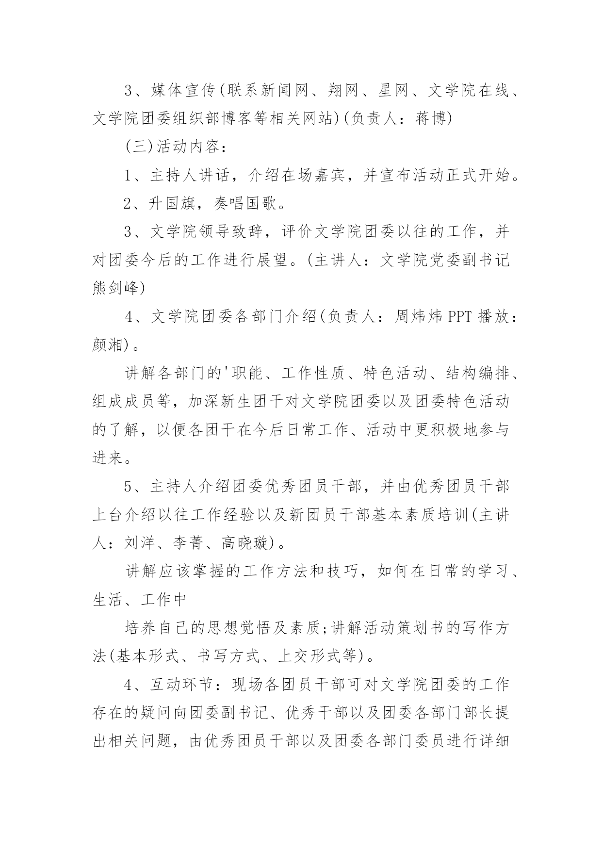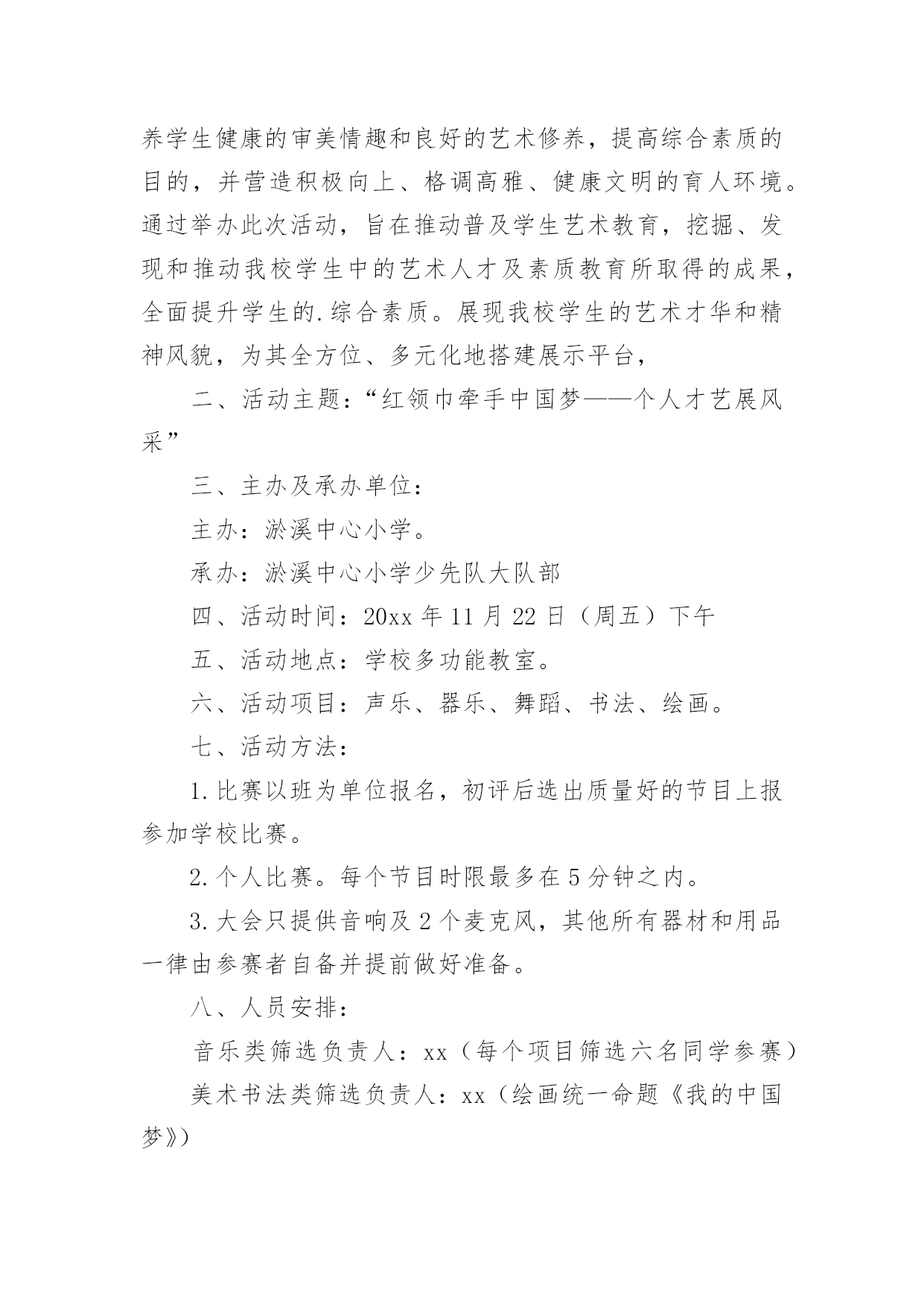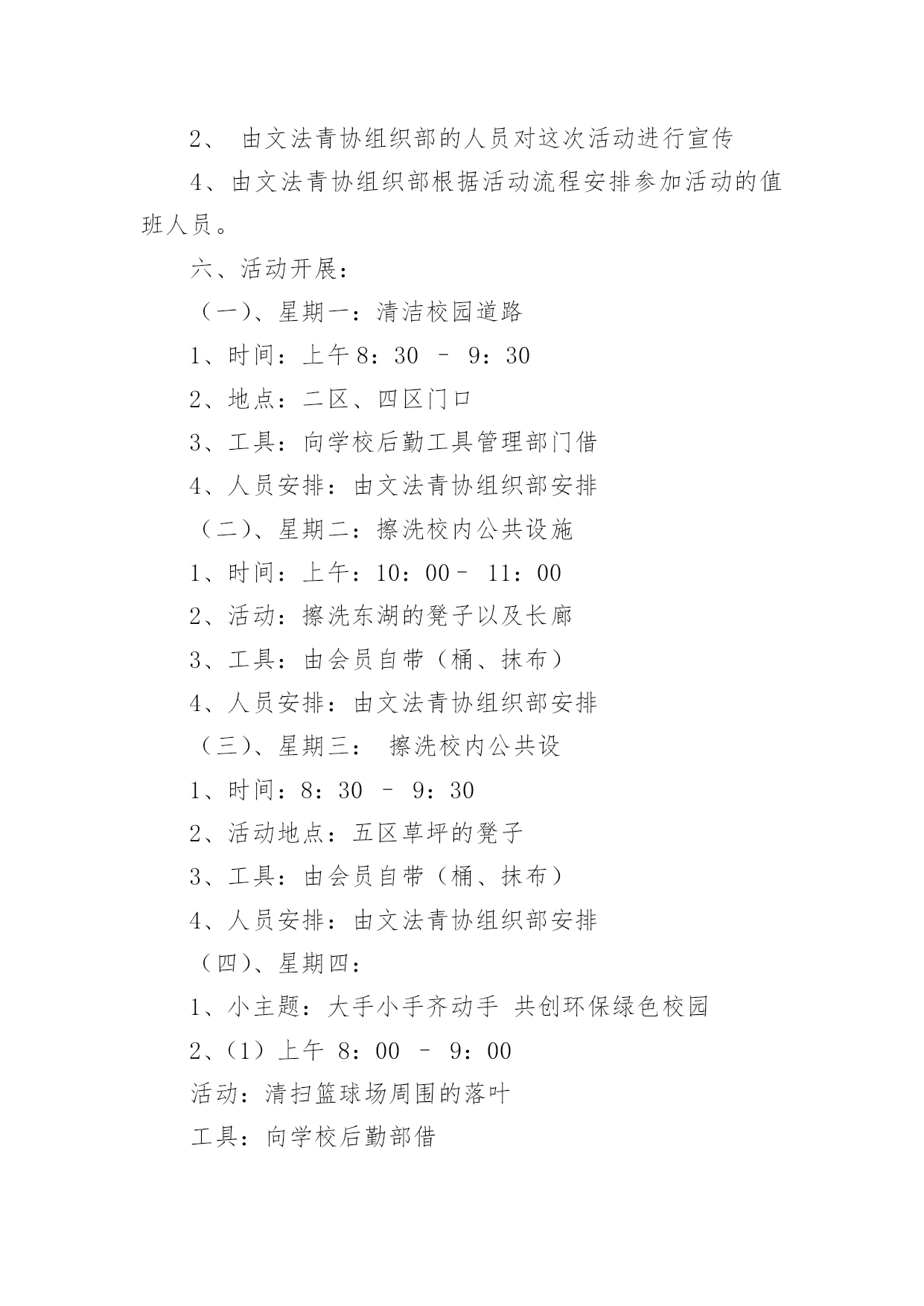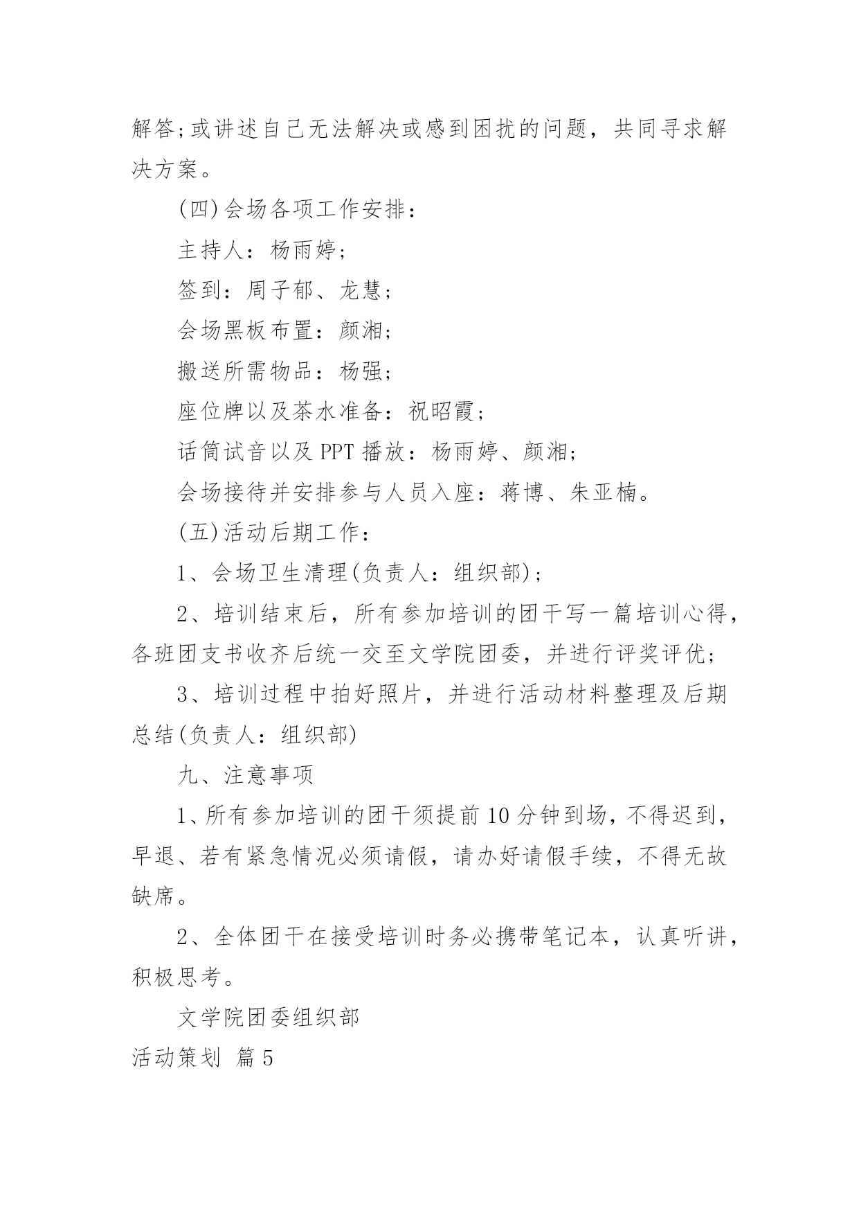 活动策划【精选】活动策划活动策划篇1一、活动背景:随着世界各国经济的迅速发展和生产力水平不断提高,人类对环境的影响越来越大,环境问题已日益突出和尖锐化。严重的生态破坏和环境污染问题已成为当代人类社会面临的重大问题。校园的污染也越来越严重;草坪上的垃圾越来越多;同学们都把装早餐的'袋子留在课室里,污染了我们的学习环境,严重地影响了同学们的学习情绪.二、活动目的:通过该项活动,让广大师生了解、认识到保护环境,爱护环境,珍惜资源的重要性。让更多的人加入到环保的行列中,携手共同营造一个绿色的校园传递绿色文化。三、活动地点及时间:广东石油化工学院校园内4月25日至4月30日四、活动对象:大一、大二的同学(每班招10个会员)五、前期准备:1、负责人去学校后勤部咨询相关问题,并提前说明活动期间要向他们借打扫的相关工具。2、由文法青协组织部的人员对这次活动进行宣传4、由文法青协组织部根据活动流程安排参加活动的值班人员。六、活动开展:(一)、星期一:清洁校园道路1、时间:上午8:30–9:302、地点:二区、四区门口3、工具:向学校后勤工具管理部门借4、人员安排:由文法青协组织部安排(二)、星期二:擦洗校内公共设施1、时间:上午:10:00–11:002、活动:擦洗东湖的凳子以及长廊3、工具:由会员自带(桶、抹布)4、人员安排:由文法青协组织部安排(三)、星期三:擦洗校内公共设1、时间:8:30–9:302、活动地点:五区草坪的凳子3、工具:由会员自带(桶、抹布)4、人员安排:由文法青协组织部安排(四)、星期四:1、小主题:大手小手齐动手共创环保绿色校园2、(1)上午8:00–9:00活动:清扫篮球场周围的落叶工具:向学校后勤部借人员安排:由文法青组织部安排(2)下午:14:30–15:30活动:擦洗饭堂外的桌椅活动地点:一饭堂工具:由会员自带(桶、抹布)(五)、星期五:清扫排球场及周围校道1、小主题:大手小手齐动手共创环保绿色校园2、时间:上午8:30–9:303、工具:向学校后勤部借4、人员安排:由文法青协组织部安排(六)、星期六:擦洗校内公共设1、时间:上午:8:30–9:302、活动:擦洗二区对面草坪的凳子3、工具:由会员自带(桶、抹布)4、人员安排:由文法青协组织部安排5、小主题:争做环保小卫士共创环保绿色校园6、活动:(1)时间:下午15:00–16:00(2)活动:打扫主教教室(3)工具:水桶、抹布、盆子(会员自带)(4)人员安排:由文法青协组织部安排活动策划篇2一、活动宗旨切实加强思想道德建设,促进文化艺术教育的进一步发展,让学生在艺术情境中体验美育、感悟智育,从而达到培养学生健康的审美情趣和良好的艺术修养,提高综合素质的目的,并营造积极向上、格调高雅、健康文明的育人环境。通过举办此次活动,旨在推动普及学生艺术教育,挖掘、发现和推动我校学生中的艺术人才及素质教育所取得的成果,全面提升学生的.综合素质。展现我校学生的艺术才华和精神风貌,为其全方位、多元化地搭建展示平台,二、活动主题:“红领巾牵手中国梦——个人才艺展风采”三、主办及承办单位:主办:淤溪中心小学。承办:淤溪中心小学少先队大队部四、活动时间:20xx年11月22日(周五)下午五、活动地点:学校多功能教室。六、活动项目:声乐、器乐、舞蹈、书法、绘画。七、活动方法:1.比赛以班为单位报名,初评后选出质量好的节目上报参加学校比赛。2.个人比赛。每个节目时限最多在5分钟之内。3.大会只提供音响及2个麦克风,其他所有器材和用品一律由参赛者自备并提前做好准备。八、人员安排:音乐类筛选负责人:xx(每个项目筛选六名同学参赛)美术书法类筛选负责人:xx(绘画统一命题《我的中国梦》)音响、摄影、摄像:xxx报道组:xxx现场组织:xx评委组:音乐类:xxx书画类:xxx活动策划篇3一、活动目的为丰富校园文化生活和营造良好学习氛围,图书馆志愿者协会举办此次图书漂流活动。二、活动简介图书漂流是由图书馆志愿者协会发起,动员会员将自己的好书收集起来或是从图书馆借的图书向全校同学借阅。让好的`图书像漂流瓶一样在知识的海洋里传递。三、活动时间于3月下旬开始,这是一个长期活动四、举办单位XX医科大学图书馆志愿者协会五、活动安排1、信息技术部和宣传部负责相关的宣传工作,信息技术部负责制作条幅和两张海报,宣传部把手工制作的海报张贴在校园里,近期做好相关工作。2、由图书馆先提供一部分图书,图书馆志愿者协会办公室人员做好登记,每人限借一本书,期限30天。周六在校园内设置两个图书漂流服务点,分别在大食堂北门和四教正门口。图书的搬运由图书协管员负责,办公室会员负责把来借阅图书和放漂图书的同学的相关信息分别记录下来。3、每周日由图书协管员负责回收、整理同学们放漂的图书。六、活动内容每周活动安排两名协会会员在服务