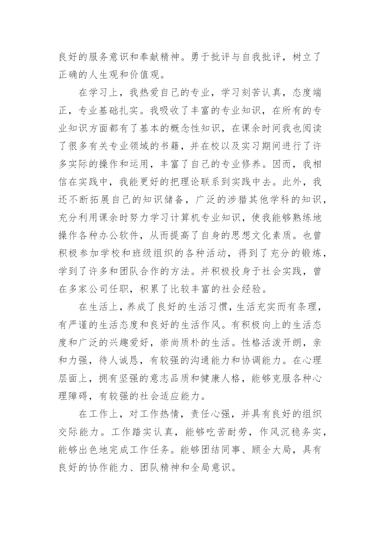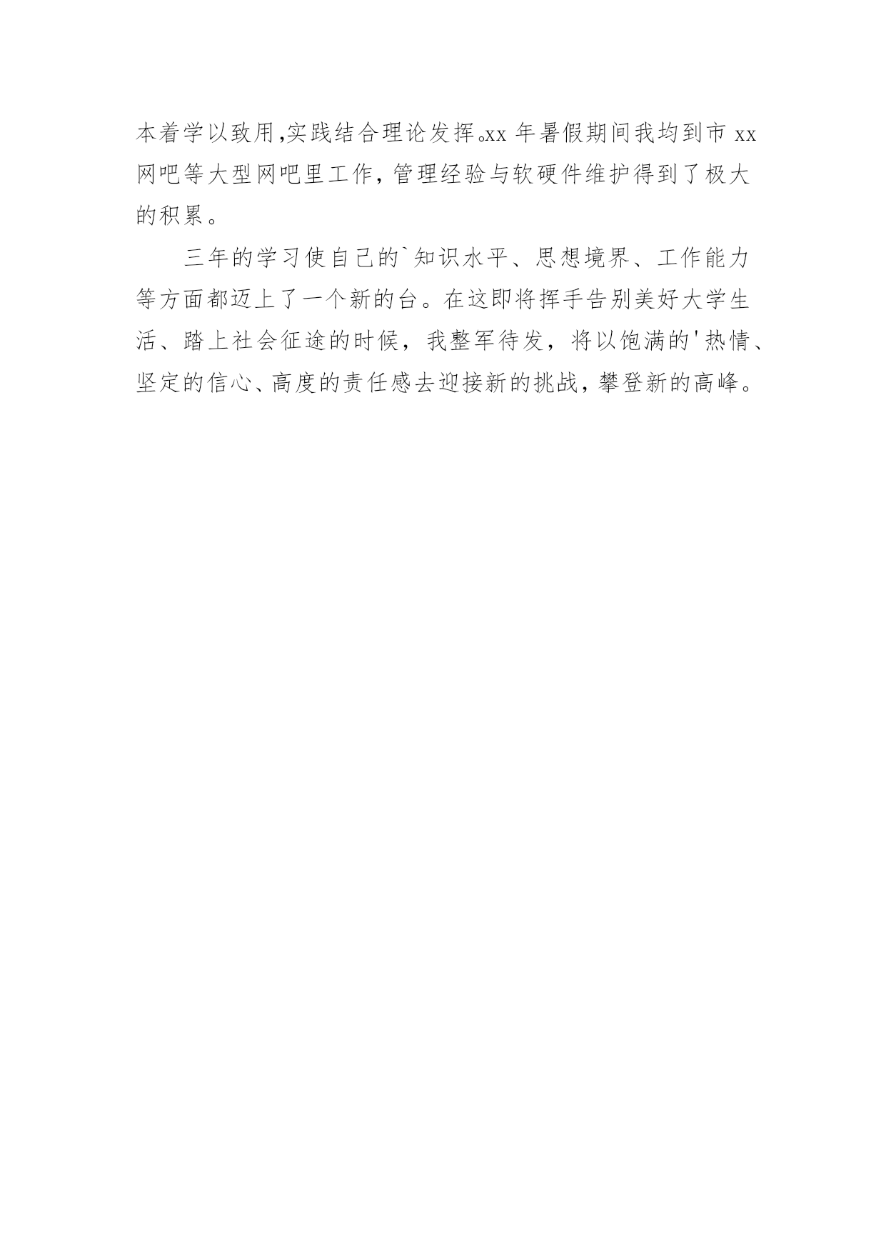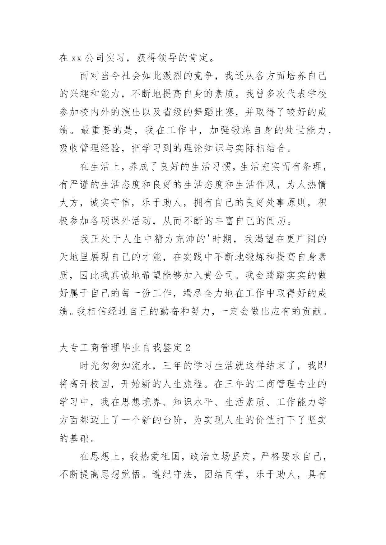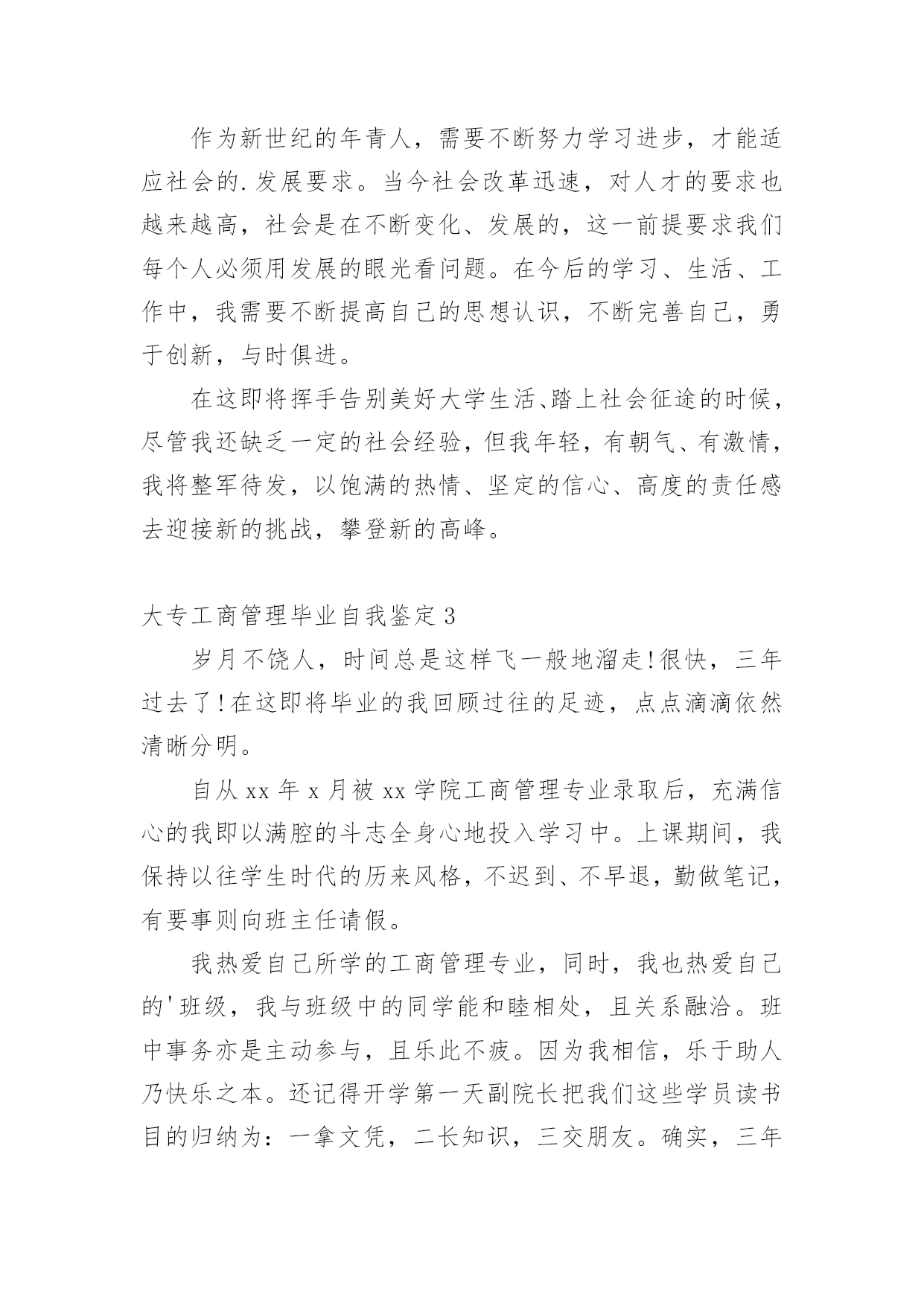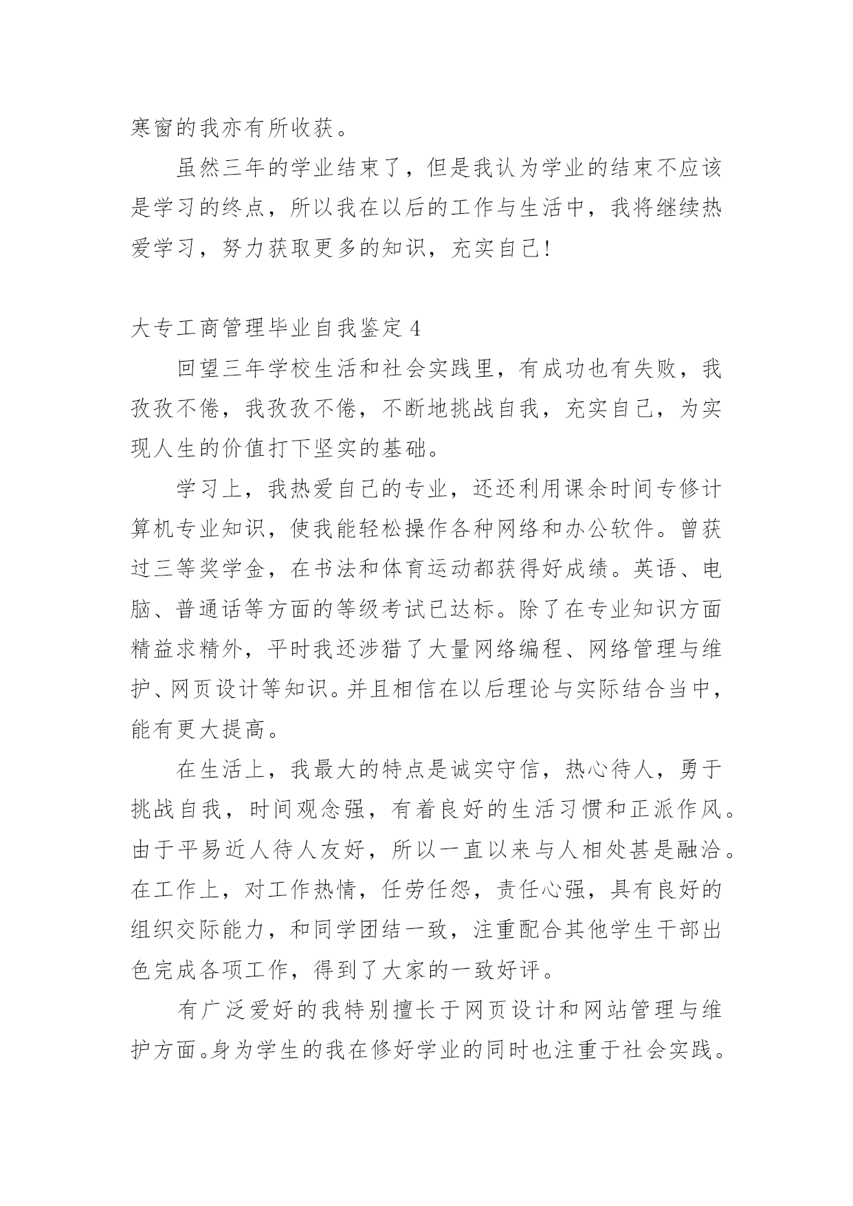 大专工商管理毕业自我鉴定大专工商管理毕业自我鉴定(集锦4篇)自我鉴定就是把一个时间段的个人情况进行一次全面系统的总结,自我鉴定可以使我们更加明确目标,不妨坐下来好好写写自我鉴定吧。自我鉴定怎么写才是正确的呢?以下是小编为大家收集的大专工商管理毕业自我鉴定,仅供参考,大家一起来看看吧。大专工商管理毕业自我鉴定1时间一晃而过,转眼间大学三年已接近尾声。这是我人生中弥足珍贵的经历,也给我留下了精彩而美好的回忆。我叫xx,是xx学院作为一名工商管理专业的大学生,我热爱我的专业并为其投入了巨大的热情和精力。在三年的学习生活中,我学习并掌握了一定的管理学知识。我一直把学习当作自己的首要任务,不仅学习科学理论知识,同时坚持学以致用,注意加强综合素质的培养。对人力资源管理、生产运作管理、市场营销、财务会计以及金融等方面都有了一定的认识和理解。我的学习成绩良好,一直名列班级前十名,并获得学校的奖学金。除了系统学习理论知识外,还把理论知识运用到实践中去,我性格比较外向,喜欢思考,洞察力较强,不怕吃苦,大学期间,我多次参加过社会实践活动,经过学校的安排,在xx公司实习,获得领导的肯定。面对当今社会如此激烈的竞争,我还从各方面培养自己的兴趣和能力,不断地提高自身的素质。我曾多次代表学校参加校内外的演出以及省级的舞蹈比赛,并取得了较好的成绩。最重要的是,我在工作中,加强锻炼自身的处世能力,吸收管理经验,把学习到的理论知识与实际相结合。在生活上,养成了良好的生活习惯,生活充实而有条理,有严谨的生活态度和良好的生活态度和生活作风,为人热情大方,诚实守信,乐于助人,拥有自己的良好处事原则,积极参加各项课外活动,从而不断的丰富自己的阅历。我正处于人生中精力充沛的'时期,我渴望在更广阔的天地里展现自己的才能,在实践中不断地锻炼和提高自身素质,因此我真诚地希望能够加入贵公司。我会踏踏实实的做好属于自己的每一份工作,竭尽全力地在工作中取得好的成绩。我相信经过自己的勤奋和努力,一定会做出应有的贡献。大专工商管理毕业自我鉴定2时光匆匆如流水,三年的学习生活就这样结束了,我即将离开校园,开始新的人生旅程。在三年的工商管理专业的学习中,我在思想境界、知识水平、生活素质、工作能力等方面都迈上了一个新的台阶,为实现人生的价值打下了坚实的基础。在思想上,我热爱祖国,政治立场坚定,严格要求自己,不断提高思想觉悟。遵纪守法,团结同学,乐于助人,具有良好的服务意识和奉献精神。勇于批评与自我批评,树立了正确的人生观和价值观。在学习上,我热爱自己的专业,学习刻苦认真,态度端正,专业基础扎实。我吸收了丰富的专业知识,在所有的专业知识方面都有了基本的概念性知识,在课余时间我也阅读了很多有关专业领域的书籍,并在校以及实习期间进行了许多实际的操作和运用,丰富了自己的专业修养。因而,我相信在实践中,我能更好的把理论联系到实践中去。此外,我还不断拓展自己的知识储备,广泛的涉猎其他学科的知识,充分利用课余时努力学习计算机专业知识,使我能够熟练地操作各种办公软件,从而提高了自身的思想文化素质。也曾积极参加学校和班级组织的各种活动,得到了充分的锻炼,学到了许多和团队合作的方法。并积极投身于社会实践,曾在多家公司任职,积累了比较丰富的社会经验。在生活上,养成了良好的生活习惯,生活充实而有条理,有严谨的生活态度和良好的生活作风。有积极向上的生活态度和广泛的兴趣爱好,崇尚质朴的生活。性格活泼开朗,亲和力强,待人诚恳,有较强的沟通能力和协调能力。在心理层面上,拥有坚强的意志品质和健康人格,能够克服各种心理障碍,有较强的社会适应能力。在工作上,对工作热情,责任心强,并具有良好的组织交际能力。工作踏实认真,能够吃苦耐劳,作风沉稳务实,能够出色地完成工作任务。能够团结同事、顾全大局,具有良好的协作能力、团队精神和全局意识。作为新世纪的年青人,需要不断努力学习进步,才能适应社会的.发展要求。当今社会改革迅速,对人才的要求也越来越高,社会是在不断变化、发展的,这一前提要求我们每个人必须用发展的眼光看问题。在今后的学习、生活、工作中,我需要不断提高自己的思想认识,不断完善自己,勇于创新,与时俱进。在这即将挥手告别美好大学生活、踏上社会征途的时候,尽管我还缺乏一定的社会经验,但我年轻,有朝气、有激情,我将整军待发,以饱满的热情、坚定的信心、高度的责任感去迎接新的挑战,攀登新的高峰。大专工商管理毕业自我鉴定3岁月不饶人,时间总是这样飞一般地溜走!很快,三年过去了!在这即将毕业的我回顾过往的足迹,点点滴滴依然清晰分明。自从xx年x月被xx学院工商管理专业录取后,充满信心的我即以满腔的斗志全身心地投入学习中。上课期间,我保持以往学生时代的历来风格,不迟到、不早退,勤做笔记,有要事则向班主任请假。我热爱自己所学的工商管理专业,同时,