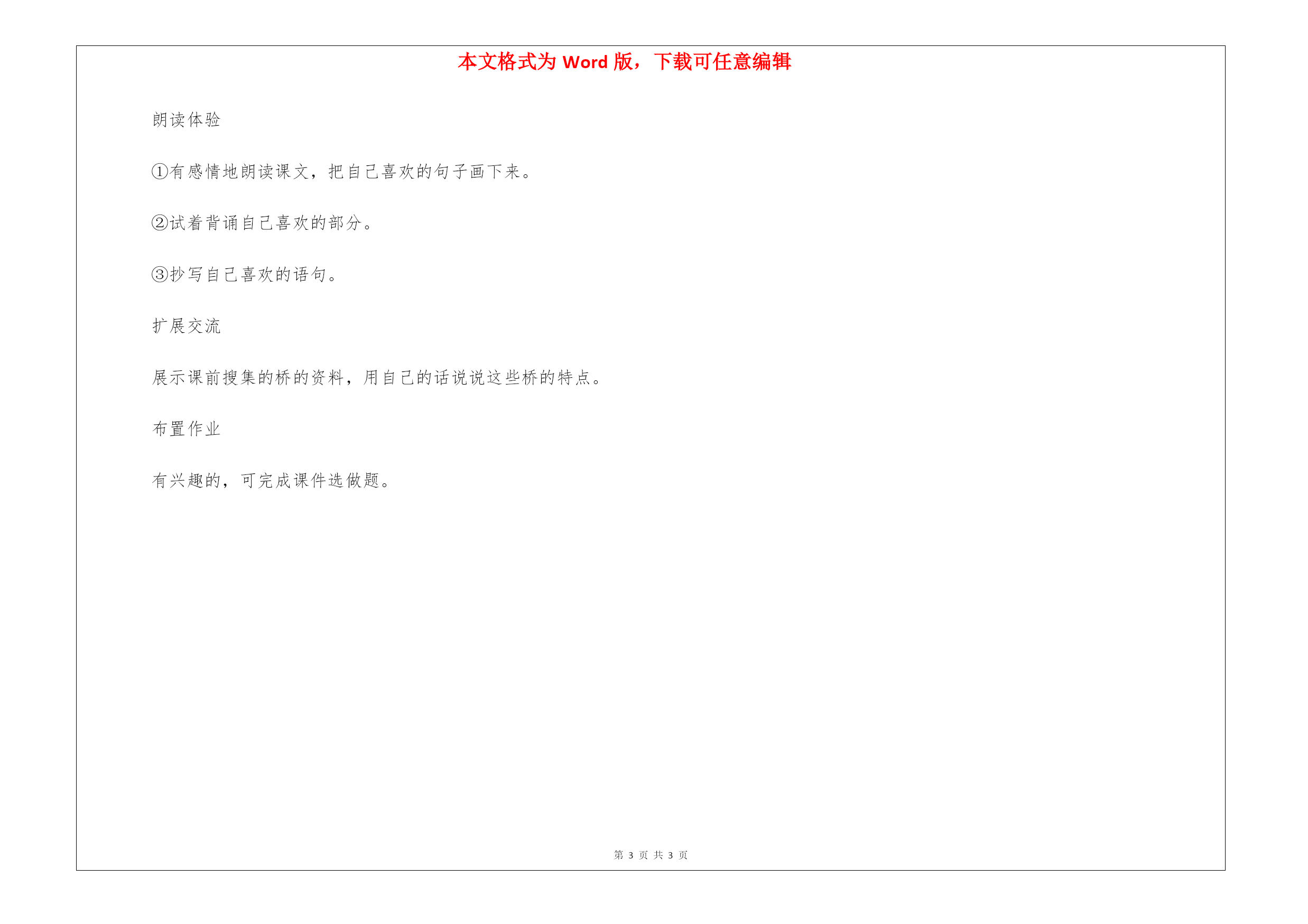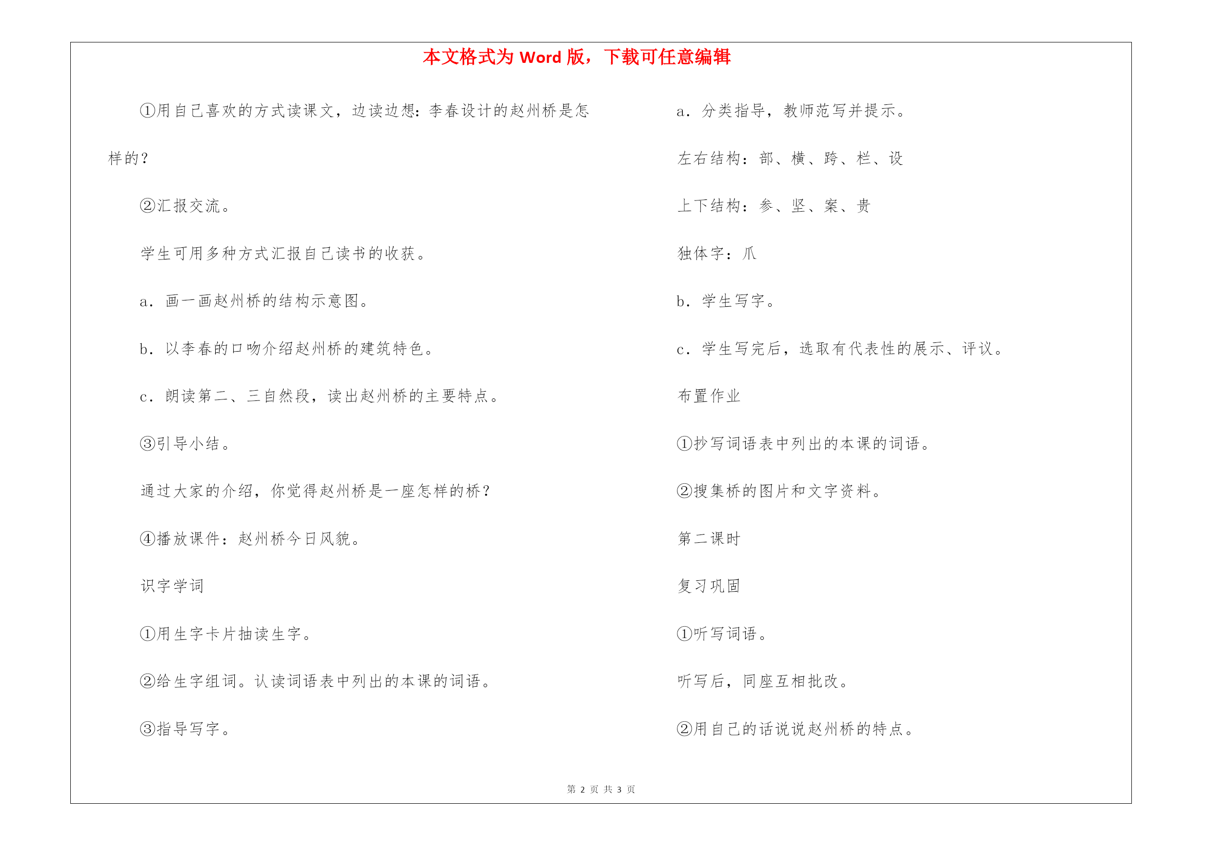 本文格式为Word版,下载可任意编辑第PAGE\*MERGEFORMAT3页共NUMPAGES\*MERGEFORMAT3页《赵州桥》教学设计学习目标①认识县、济、匠等10个生字。会写县、设等14个字。能正确读写设计、参加、雄伟等23个词语。②正确、流利、有感情地朗读课文,背诵自己喜欢的段落。③了解赵州桥的结构特点和建筑特色,感受我国古代劳动人民的智慧和才干,增强民族自豪感。课前准备①多媒体课件。②生字生词卡片。③搜集反映我国古代劳动人民智慧和才能的资料及有关桥梁的资料。A案第一课时情境导入①播放课件:昔日的洨河风光。②谈话导入。洨河两岸景色优美,可阻碍了两岸文化的交流、经济的发展,官府决定在这里建一座桥梁。造一座怎样的桥呢?官座决定向社会公开招标,石匠李春设计了方案被采用了。想知道李春的设计方案吗?读读课文就清楚了。③板书课题。齐读课题。初读感知①学生自讯课文,画出生字词,结合注意多读几遍。②采用自读、同座互读的形式练读课文,把课文读正确、读通顺。③教师检查。用生字卡片抽读生字词,再让学生选读自己读得最好的语句和段落。自主感悟①用自己喜欢的方式读课文,边读边想:李春设计的赵州桥是怎样的?②汇报交流。学生可用多种方式汇报自己读书的收获。a.画一画赵州桥的结构示意图。b.以李春的口吻介绍赵州桥的建筑特色。c.朗读第二、三自然段,读出赵州桥的主要特点。③引导小结。通过大家的介绍,你觉得赵州桥是一座怎样的桥?④播放课件:赵州桥今日风貌。识字学词①用生字卡片抽读生字。②给生字组词。认读词语表中列出的本课的词语。③指导写字。a.分类指导,教师范写并提示。左右结构:部、横、跨、栏、设上下结构:参、坚、案、贵独体字:爪b.学生写字。c.学生写完后,选取有代表性的展示、评议。布置作业①抄写词语表中列出的本课的词语。②搜集桥的图片和文字资料。第二课时复习巩固①听写词语。听写后,同座互相批改。②用自己的话说说赵州桥的特点。朗读体验①有感情地朗读课文,把自己喜欢的句子画下来。②试着背诵自己喜欢的部分。③抄写自己喜欢的语句。扩展交流展示课前搜集的桥的资料,用自己的话说说这些桥的特点。布置作业有兴趣的,可完成课件选做题。