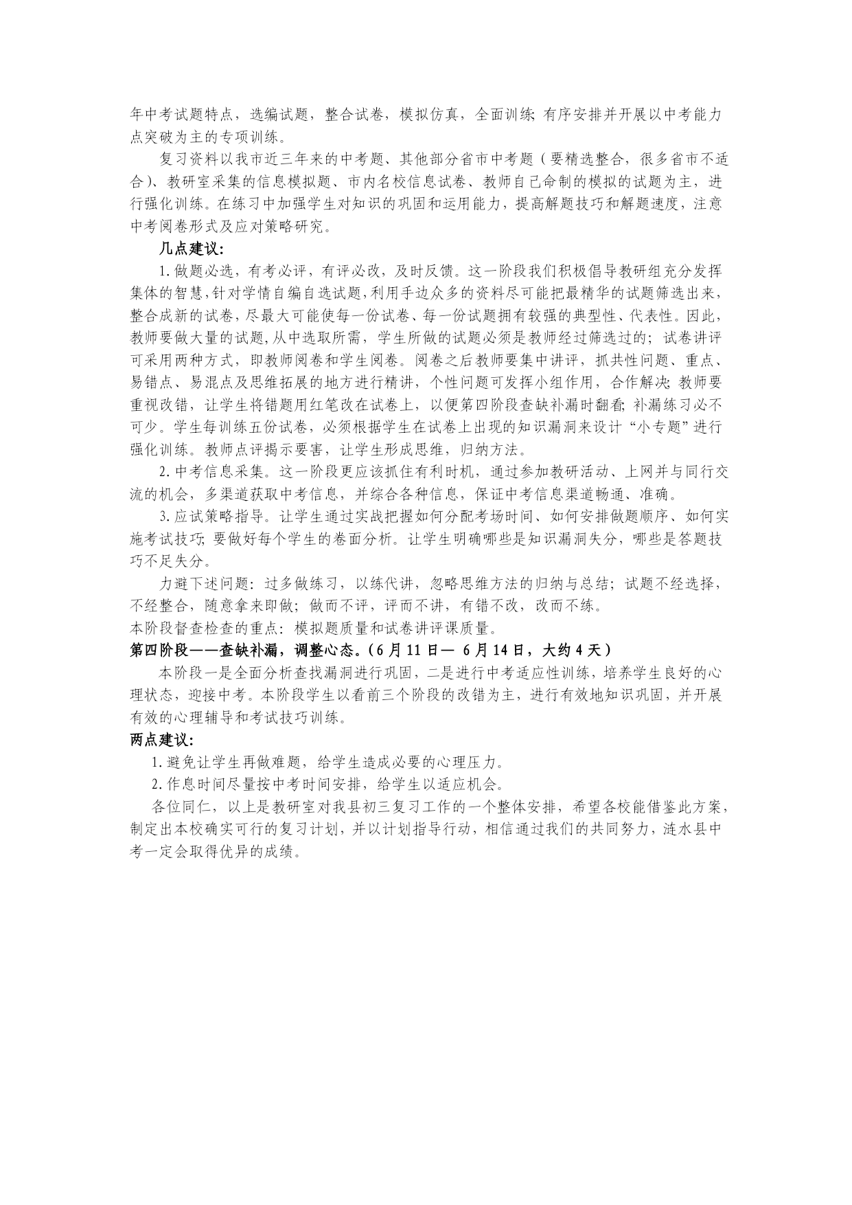 中考化学复习指导意见为了科学、有序地安排我县中考复习备考工作,教研室特提出2013—2014学年度第二学期化学学科中考复习指导意见。一、指导思想以《新课程标准》为依据,以《中考导学》为导向,以提高复习效率为中心,加强化学复习备考的过程管理,力争使我县中考化学成绩再上一个新的台阶。二、中考复习备考意见今年的中考化学复习备考工作分四阶段进行。第一阶段——梳理教材,夯实基础。(4月初—5月中旬左右,大约45天。)任务一:课本复习结束;任务二:用一轮资料和导学,帮助学生建立知识网络;任务二:有序安排并开展选择题和11题训练,必须保证每周三次的训练量及效果。复习建议:1.研究中考命题方向。所有初三教师在复习工作开始前一定要研究近三年淮安中考试卷,学习《中考导学》(有新方向),以明确第一轮复习和中考考点的关系。2.出台第一轮复习方案。复习方案应结合集体智慧,定时、定人、定内容、定进度、定安排。既要统揽全局,又不能放过细节,确保第一轮复习的实际效果。3.注意提高课堂效率。一是教学观念改变,力避“满堂灌”方式,教师一讲到底,课堂效率低下;二备课要充分,克服复习课堂的随意性,要求复习课必须有教案。4.必须保证复习练习质量。学案(练习)要关注“三头”——复习内容、考情和生情,不可课堂图省事“拿来资料就用”,实效性差。督查重点:本阶段复习计划的拟定、复习备课特别是二次备课的效果、学案(练习)的质量。第二阶段——专题突破,提升能力。(5月中旬——5月底)这一阶段是对整个初中阶段重难点知识的深化和综合,是解题能力全面提升的阶段。(用导学)任务一:按计划完成专题训练,帮助学生形成知识网络;任务二:重点是考点复习和热点题型的研究,要针对每一种题型探讨解题思路和方法,总结规律,提升能力;任务三:有序开展小题目(可以是选择题和第11-19题中的1-2个大题目)训练,保证每周几次的训练量及效果。复习建议:1、构建知识网络。活用《淮安市中考导学》,建议在导学的基础上做细(删减或者扩充),帮助学生形成相对完整的知识网络,以考点为中心梳理解题方法,以答题技巧为重点训练表达规范。重在方法指导和规律揭示,注意学生思维拓展,关注学生表达障碍。2、提倡深度备课。将第一轮复习中学生呈现的双基短板,进行适当整合,形成实用性、针对性强的“小专题”。只要具有小切口、可操作的特点,一定会起到事半功倍之效。本阶段备课检查的重点仍是本轮复习的计划、教案质量、学案(练习)的质量。第三阶段——模拟仿真,综合训练。(5月底—6月10日,大约10天)这一阶段的复习是知识、能力深化巩固的阶段,本阶段要多方搜集信息,结合我市近三年中考试题特点,选编试题,整合试卷,模拟仿真,全面训练;有序安排并开展以中考能力点突破为主的专项训练。复习资料以我市近三年来的中考题、其他部分省市中考题(要精选整合,很多省市不适合)、教研室采集的信息模拟题、市内名校信息试卷、教师自己命制的模拟的试题为主,进行强化训练。在练习中加强学生对知识的巩固和运用能力,提高解题技巧和解题速度,注意中考阅卷形式及应对策略研究。几点建议:做题必选,有考必评,有评必改,及时反馈。这一阶段我们积极倡导教研组充分发挥集体的智慧,针对学情自编自选试题,利用手边众多的资料尽可能把最精华的试题筛选出来,整合成新的试卷,尽最大可能使每一份试卷、每一份试题拥有较强的典型性、代表性。因此,教师要做大量的试题,从中选取所需,学生所做的试题必须是教师经过筛选过的;试卷讲评可采用两种方式,即教师阅卷和学生阅卷。阅卷之后教师要集中讲评,抓共性问题、重点、易错点、易混点及思维拓展的地方进行精讲,个性问题可发挥小组作用,合作解决;教师要重视改错,让学生将错题用红笔改在试卷上,以便第四阶段查缺补漏时翻看;补漏练习必不可少。学生每训练五份试卷,必须根据学生在试卷上出现的知识漏洞来设计“小专题”进行强化训练。教师点评揭示要害,让学生形成思维,归纳方法。2.中考信息采集。这一阶段更应该抓住有利时机,通过参加教研活动、上网并与同行交流的机会,多渠道获取中考信息,并综合各种信息,保证中考信息渠道畅通、准确。3.应试策略指导。让学生通过实战把握如何分配考场时间、如何安排做题顺序、如何实施考试技巧;要做好每个学生的卷面分析。让学生明确哪些是知识漏洞失分,哪些是答题技巧不足失分。力避下述问题:过多做练习,以练代讲,忽略思维方法的归纳与总结;试题不经选择,不经整合,随意拿来即做;做而不评,评而不讲,有错不改,改而不练。本阶段督查检查的重点:模拟题质量和试卷讲评课质量。第四阶段——查缺补漏,调整心态。(6月11日—6月14日,大约4天)本阶段一是全面分析查找漏洞进行巩固,二是进行中考适应性训练,培养学生良好的心