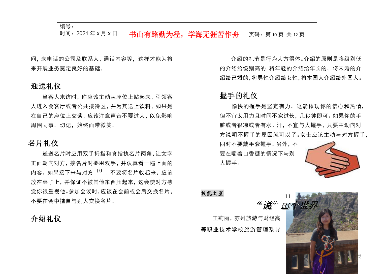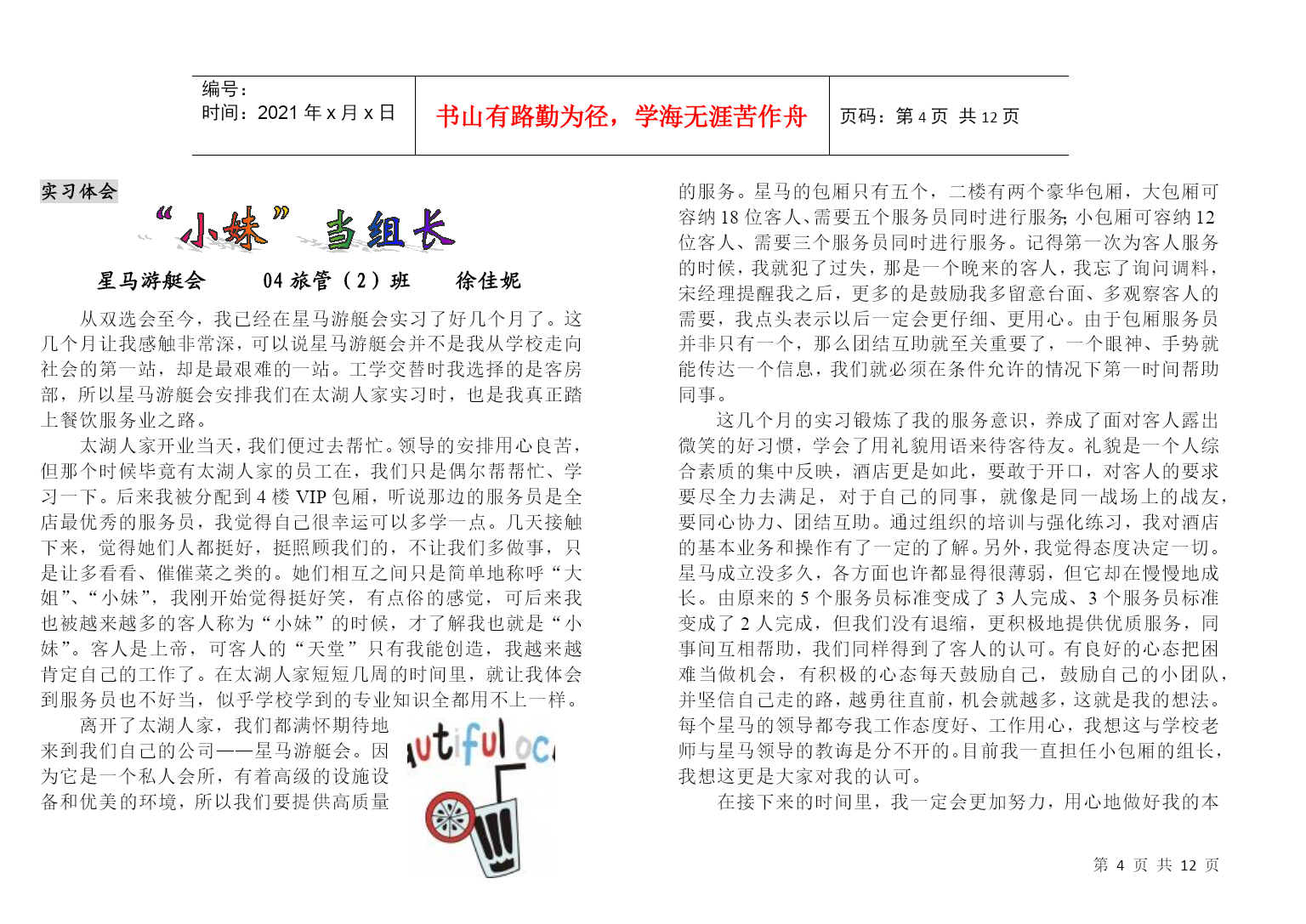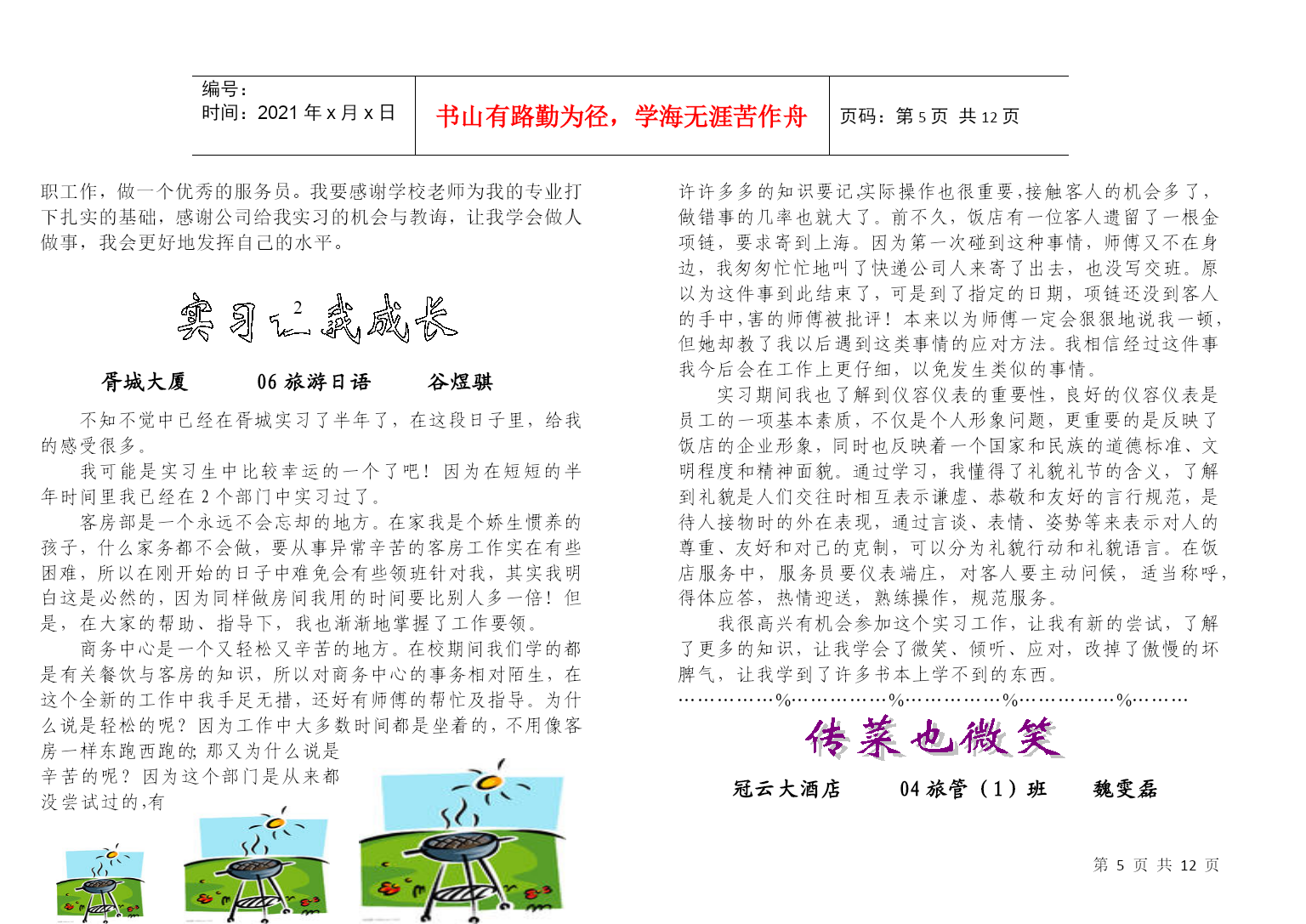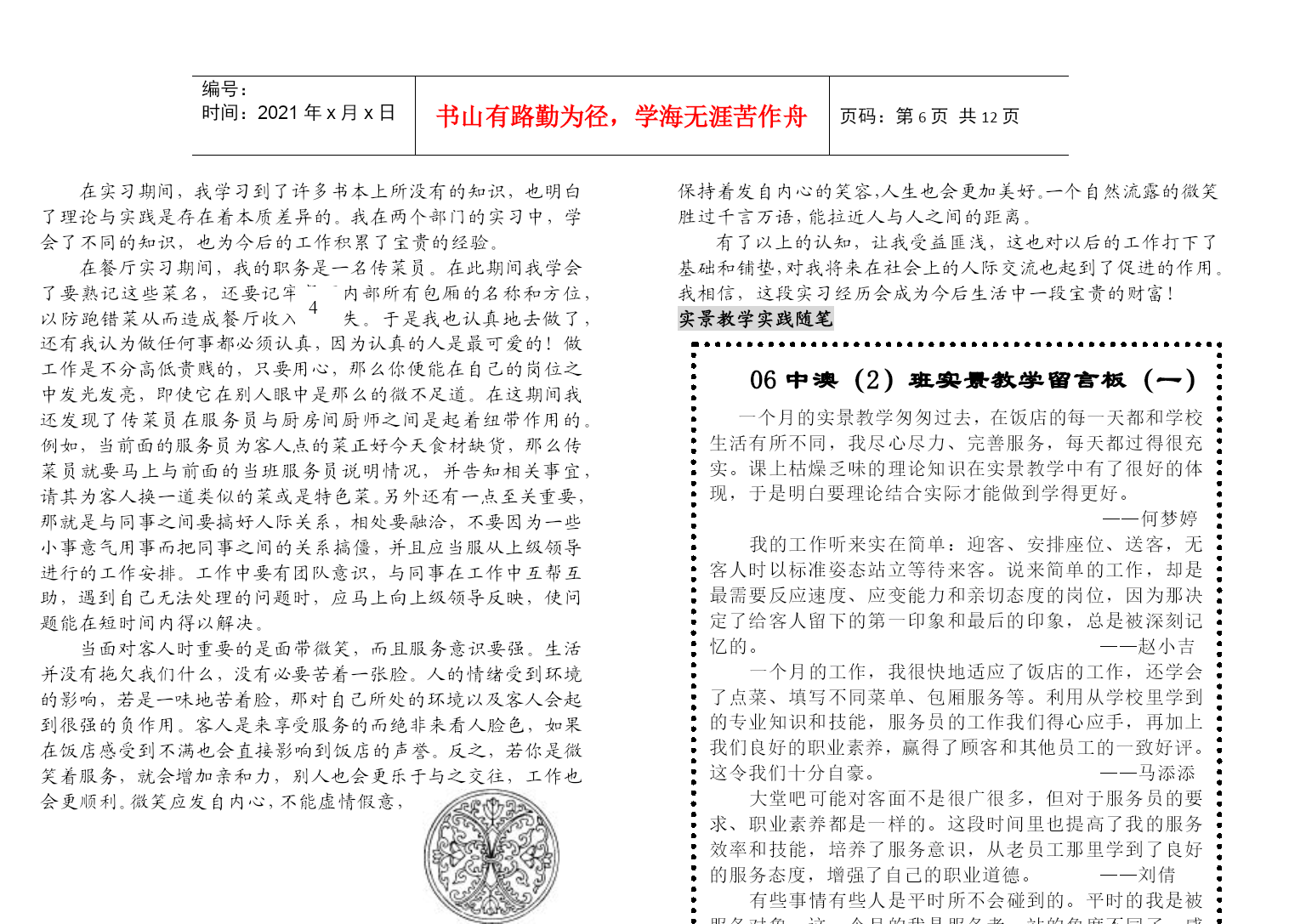 编号:时间:2021年x月x日书山有路勤为径,学海无涯苦作舟页码:第PAGE12页共NUMPAGES12页第PAGE\*MERGEFORMAT12页共NUMPAGES\*MERGEFORMAT12页HYPERLINK""名誉主编:张容邹燕主编:徐芳冯立梅编委:张树新孙嘉希孙凌云沙昌瑛王震东胡岚汝浩杰李昕白旅游管理系2009年4月第四期理论脱离实践是最大的不幸。——达·芬奇(意)一定是实践和实际的人生经验教给了他这么些高深的理论。——莎士比亚(英)任何理论都不如现实具体。——沈从文(中)心中醒,口中说,纸上作,不从身上习过,皆无用也。——颜元(清)实践,是个伟大的揭发者,它暴露一切欺人和自欺。——车尔尼雪夫斯基(俄)讲得一事,即行一事,行得一事,即知一事,所谓真知矣。徒讲而不行,则遇事终有眩惑。——王廷相(明)目录实习体会“小妹”当组长…………………04旅管(2)班徐佳妮(1)实习让我成长………………………06旅游日语谷煜骐(3)传菜也微笑………………………04旅管(1)班魏雯磊(4)实景教学实践心得06中澳(2)班实景教学留言板……………………………(6)就业园地制作好简历的七个黄金法则………………………………(7)礼仪小常识新鲜职场人的办公室礼仪………………………………(10)技能之星…………………………………………………(12)实习基地介绍……………………………………(14)实习体会星马游艇会04旅管(2)班徐佳妮从双选会至今,我已经在星马游艇会实习了好几个月了。这几个月让我感触非常深,可以说星马游艇会并不是我从学校走向社会的第一站,却是最艰难的一站。工学交替时我选择的是客房部,所以星马游艇会安排我们在太湖人家实习时,也是我真正踏上餐饮服务业之路。太湖人家开业当天,我们便过去帮忙。领导的安排用心良苦,但那个时候毕竟有太湖人家的员工在,我们只是偶尔帮帮忙、学习一下。后来我被分配到4楼VIP包厢,听说那边的服务员是全店最优秀的服务员,我觉得自己很幸运可以多学一点。几天接触下来,觉得她们人都挺好,挺照顾我们的,不让我们多做事,只是让多看看、催催菜之类的。她们相互之间只是简单地称呼“大姐”、“小妹”,我刚开始觉得挺好笑,有点俗的感觉,可后来我也被越来越多的客人称为“小妹”的时候,才了解我也就是“小妹”。客人是上帝,可客人的“天堂”只有我能创造,我越来越肯定自己的工作了。在太湖人家短短几周的时间里,就让我体会到服务员也不好当,似乎学校学到的专业知识全都用不上一样。离开了太湖人家,我们都满怀期待地来到我们自己的公司——星马游艇会。因为它是一个私人会所,有着高级的设施设备和优美的环境,所以我们要提供高质量的服务。星马的包厢只有五个,二楼有两个豪华包厢,大包厢可容纳18位客人、需要五个服务员同时进行服务;小包厢可容纳12位客人、需要三个服务员同时进行服务。记得第一次为客人服务的时候,我就犯了过失,那是一个晚来的客人,我忘了询问调料,宋经理提醒我之后,更多的是鼓励我多留意台面、多观察客人的需要,我点头表示以后一定会更仔细、更用心。由于包厢服务员并非只有一个,那么团结互助就至关重要了,一个眼神、手势就能传达一个信息,我们就必须在条件允许的情况下第一时间帮助同事。这几个月的实习锻炼了我的服务意识,养成了面对客人露出微笑的好习惯,学会了用礼貌用语来待客待友。礼貌是一个人综合素质的集中反映,酒店更是如此,要敢于开口,对客人的要求要尽全力去满足,对于自己的同事,就像是同一战场上的战友,要同心协力、团结互助。通过组织的培训与强化练习,我对酒店的基本业务和操作有了一定的了解。另外,我觉得态度决定一切。星马成立没多久,各方面也许都显得很薄弱,但它却在慢慢地成长。由原来的5个服务员标准变成了3人完成、3个服务员标准变成了2人完成,但我们没有退缩,更积极地提供优质服务,同事间互相帮助,我们同样得到了客人的认可。有良好的心态把困难当做机会,有积极的心态每天鼓励自己,鼓励自己的小团队,并坚信自己走的路,越勇往直前,机会就越多,这就是我的想法。每个星马的领导都夸我工作态度好、工作用心,我想这与学校老师与星马领导的教诲是分不开的。目前我一直担任小包厢的组长,我想这更是大家对我的认可。在接下来的时间里,我一定会更加努力,用心地做好我的本职工作,做一个优秀的服务员。我要感谢学校老师为我的专业打下扎实的基础,感谢公司给我实习的机会与教诲,让我学会做人做事,我会更好地发挥自己的水平。12胥城大厦06旅游日语谷煜骐不知不觉中已经在胥城实习了半年了,在这段日子里,给我的感受很多。我可能是