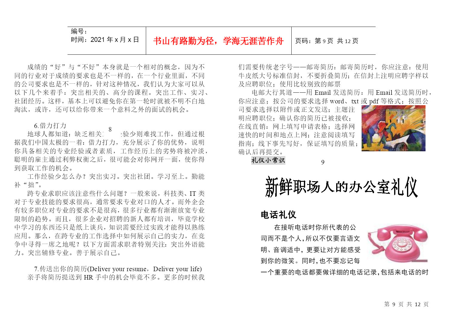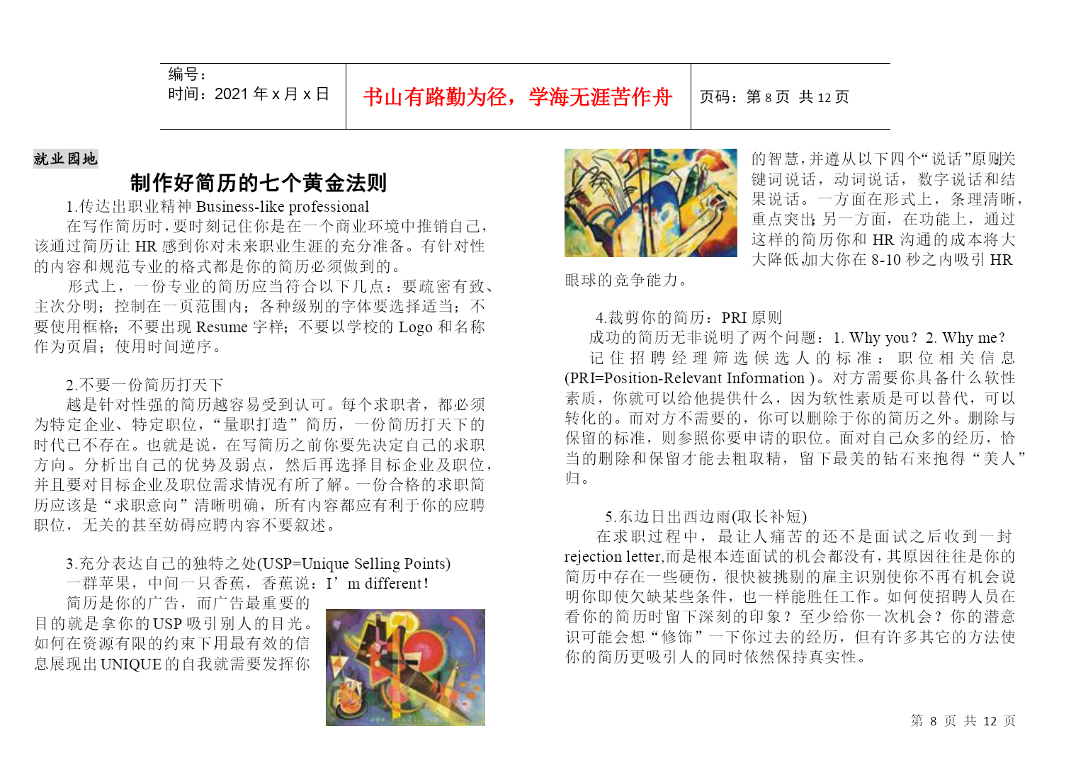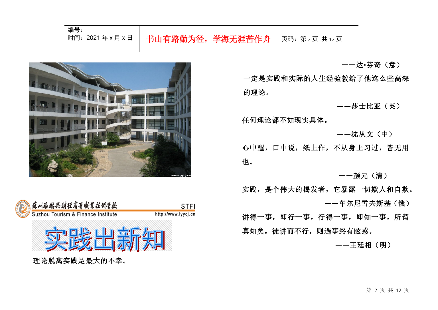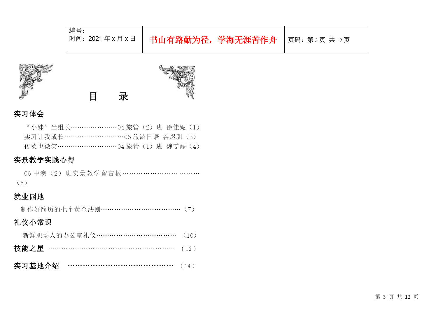 编号:时间:2021年x月x日书山有路勤为径,学海无涯苦作舟页码:第PAGE12页共NUMPAGES12页第PAGE\*MERGEFORMAT12页共NUMPAGES\*MERGEFORMAT12页HYPERLINK""名誉主编:张容邹燕主编:徐芳冯立梅编委:张树新孙嘉希孙凌云沙昌瑛王震东胡岚汝浩杰李昕白旅游管理系2009年4月第四期理论脱离实践是最大的不幸。——达·芬奇(意)一定是实践和实际的人生经验教给了他这么些高深的理论。——莎士比亚(英)任何理论都不如现实具体。——沈从文(中)心中醒,口中说,纸上作,不从身上习过,皆无用也。——颜元(清)实践,是个伟大的揭发者,它暴露一切欺人和自欺。——车尔尼雪夫斯基(俄)讲得一事,即行一事,行得一事,即知一事,所谓真知矣。徒讲而不行,则遇事终有眩惑。——王廷相(明)目录实习体会“小妹”当组长…………………04旅管(2)班徐佳妮(1)实习让我成长………………………06旅游日语谷煜骐(3)传菜也微笑………………………04旅管(1)班魏雯磊(4)实景教学实践心得06中澳(2)班实景教学留言板……………………………(6)就业园地制作好简历的七个黄金法则………………………………(7)礼仪小常识新鲜职场人的办公室礼仪………………………………(10)技能之星…………………………………………………(12)实习基地介绍……………………………………(14)实习体会星马游艇会04旅管(2)班徐佳妮从双选会至今,我已经在星马游艇会实习了好几个月了。这几个月让我感触非常深,可以说星马游艇会并不是我从学校走向社会的第一站,却是最艰难的一站。工学交替时我选择的是客房部,所以星马游艇会安排我们在太湖人家实习时,也是我真正踏上餐饮服务业之路。太湖人家开业当天,我们便过去帮忙。领导的安排用心良苦,但那个时候毕竟有太湖人家的员工在,我们只是偶尔帮帮忙、学习一下。后来我被分配到4楼VIP包厢,听说那边的服务员是全店最优秀的服务员,我觉得自己很幸运可以多学一点。几天接触下来,觉得她们人都挺好,挺照顾我们的,不让我们多做事,只是让多看看、催催菜之类的。她们相互之间只是简单地称呼“大姐”、“小妹”,我刚开始觉得挺好笑,有点俗的感觉,可后来我也被越来越多的客人称为“小妹”的时候,才了解我也就是“小妹”。客人是上帝,可客人的“天堂”只有我能创造,我越来越肯定自己的工作了。在太湖人家短短几周的时间里,就让我体会到服务员也不好当,似乎学校学到的专业知识全都用不上一样。离开了太湖人家,我们都满怀期待地来到我们自己的公司——星马游艇会。因为它是一个私人会所,有着高级的设施设备和优美的环境,所以我们要提供高质量的服务。星马的包厢只有五个,二楼有两个豪华包厢,大包厢可容纳18位客人、需要五个服务员同时进行服务;小包厢可容纳12位客人、需要三个服务员同时进行服务。记得第一次为客人服务的时候,我就犯了过失,那是一个晚来的客人,我忘了询问调料,宋经理提醒我之后,更多的是鼓励我多留意台面、多观察客人的需要,我点头表示以后一定会更仔细、更用心。由于包厢服务员并非只有一个,那么团结互助就至关重要了,一个眼神、手势就能传达一个信息,我们就必须在条件允许的情况下第一时间帮助同事。这几个月的实习锻炼了我的服务意识,养成了面对客人露出微笑的好习惯,学会了用礼貌用语来待客待友。礼貌是一个人综合素质的集中反映,酒店更是如此,要敢于开口,对客人的要求要尽全力去满足,对于自己的同事,就像是同一战场上的战友,要同心协力、团结互助。通过组织的培训与强化练习,我对酒店的基本业务和操作有了一定的了解。另外,我觉得态度决定一切。星马成立没多久,各方面也许都显得很薄弱,但它却在慢慢地成长。由原来的5个服务员标准变成了3人完成、3个服务员标准变成了2人完成,但我们没有退缩,更积极地提供优质服务,同事间互相帮助,我们同样得到了客人的认可。有良好的心态把困难当做机会,有积极的心态每天鼓励自己,鼓励自己的小团队,并坚信自己走的路,越勇往直前,机会就越多,这就是我的想法。每个星马的领导都夸我工作态度好、工作用心,我想这与学校老师与星马领导的教诲是分不开的。目前我一直担任小包厢的组长,我想这更是大家对我的认可。在接下来的时间里,我一定会更加努力,用心地做好我的本职工作,做一个优秀的服务员。我要感谢学校老师为我的专业打下扎实的基础,感谢公司给我实习的机会与教诲,让我学会做人做事,我会更好地发挥自己的水平。12胥城大厦06旅游日语谷煜骐不知不觉中已经在胥城实习了半年了,在这段日子里,给我的感受很多。我可能是