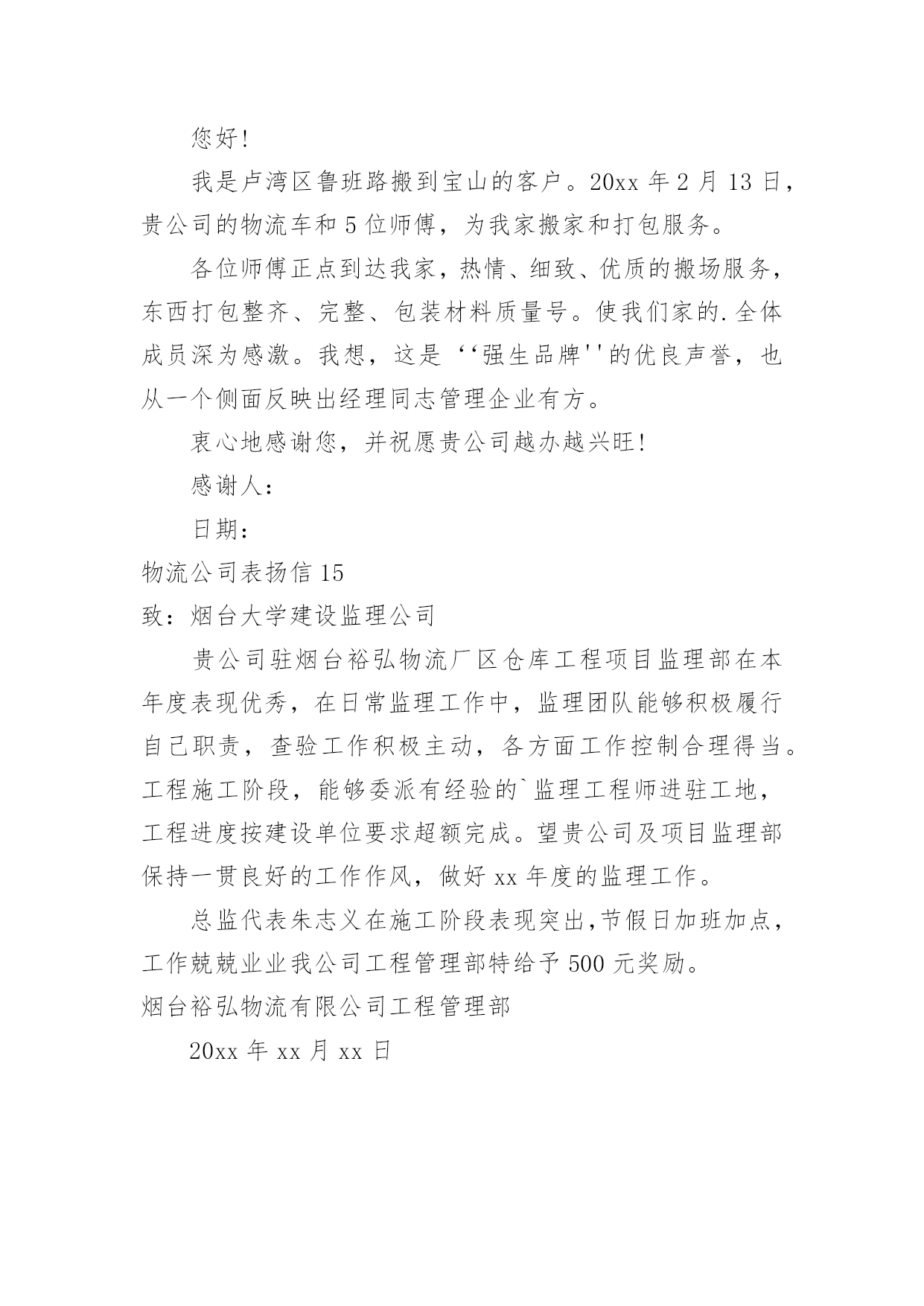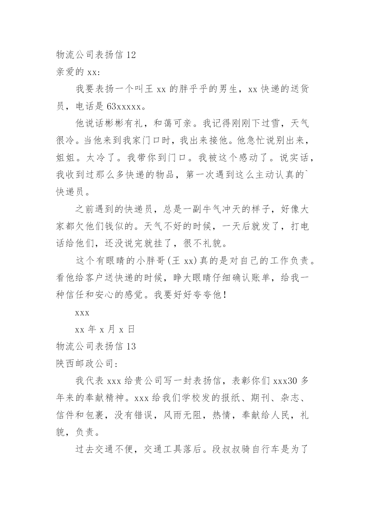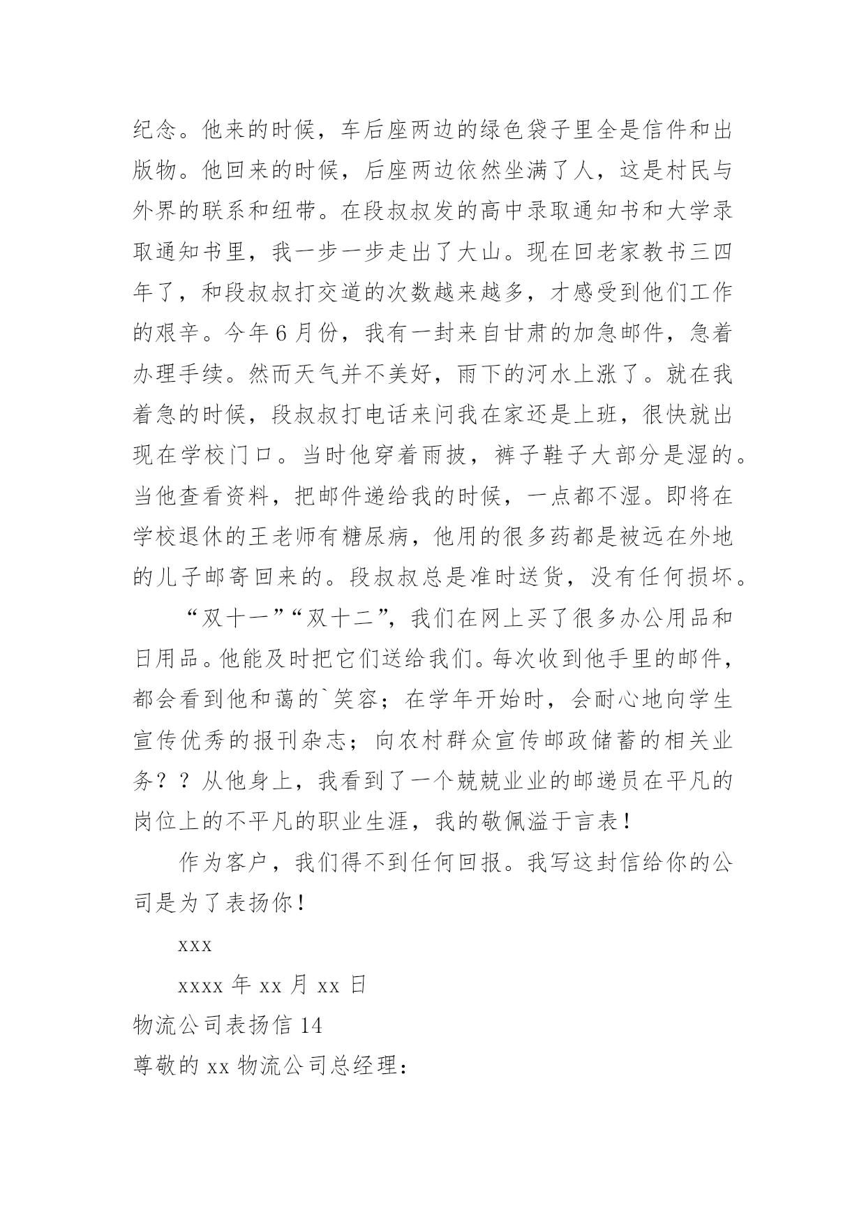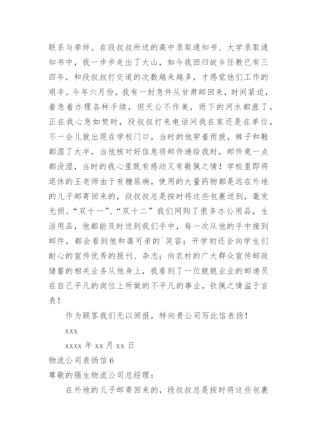 物流公司表扬信物流公司表扬信在快速变化和不断变革的新时代,很多地方都会使用到表扬信,表扬信一般均有感谢的成分,尤其是表扬的事迹同写信人有关时,更要在表扬信中表达出自己的谢意。你写表扬信时总是没有新意?以下是小编收集整理的物流公司表扬信,仅供参考,希望能够帮助到大家。物流公司表扬信1尊敬的XX:我要表扬XX快递XX的送货员王XX电话是63XXXXX的一位胖乎乎的小伙子。他说话礼貌而且很亲切,记得那天刚刚下完雪天气很冷,他到我家门口时我出来接件,他连忙说:“不用出来了姐,天太冷了,我给你送门口去。”我听了很感动,说实话接过这么多快递件,第一次遇见这么积极认真工作的快递员。我以前遇见的快递员总是一副牛气哄哄的样子,就好像谁都欠他们钱似的,一到天气不好了,就晚一天再送,打电话给他们,还没等说完话就挂电话了,很不礼貌。就这个带眼睛的'小胖哥(王XX)真的是对工作很负责,看着他把快件送到客户手中时,睁大眼睛认真仔细的确认货单,给我一种很信任很放心的感觉,我要好好的表扬他!XXXxx年xx月xx日物流公司表扬信2各位领导:贵公司于洪物流厂3号仓库项目监理部今年表现不错。在日常监管工作中,监管小组能够积极履行职责,主动参与检查工作,合理恰当地控制各方面。在施工阶段,可派有经验的监理工程师到施工现场,根据施工单位的要求,超额完成工程进度。希望贵公司和项目监理部保持一贯良好的.工作作风,在20xx做好监理工作。董事代表朱志毅在施工阶段表现突出,节假日加班,工作认真,我公司工程管理部给予500元特别奖励。xxxxxxx年xx月xx日物流公司表扬信3XXXX:贵公司驻XX物流厂区3#仓库工程项目监理部在本年度表现优秀,在日常监理工作中,监理团队能够积极履行自己职责,查验工作积极主动,各方面工作控制合理得当。工程施工阶段,能够委派有经验的`监理工程师进驻工地,工程进度按建设单位要求超额完成。望贵公司及项目监理部保持一贯良好的工作作风,做好xx年度的监理工作。总监代表朱XX在施工阶段表现突出,节假日加班加点,工作兢兢业业我公司工程管理部特给予500元奖励。XX物流有限公司工程管理部xx年X月X日物流公司表扬信4尊敬的xx物流公司总经理:您好!我是一个从卢湾区鲁班路搬到宝山的.客户。xx,xx,xx,20xx日,你们公司的物流车和五个师傅搬过来给我家打包。所有的师傅都准时到了我家,热情、细致、优质的搬家服务。一切包装整齐完整,包装材料质量有编号。让我们全家人都深深感激。我觉得这是xx品牌的优秀口碑,也从一个方面体现了经理同志对企业的管理有方。我真诚地感谢你,祝你的公司越来越繁荣!xxxxxxx年xx月xx日物流公司表扬信5xx邮政公司:我代表xxx,对贵公司xxx三十余年如一日的敬业精神向贵公司写表扬信。xxx为我校所送报纸、刊物、杂志、信件和包裹等从无错漏,风雨无阻,态度热情,一心一意为人民办事,礼貌待人,认真负责。以前,交通不便,交通工具落后,记忆中的段叔叔骑着一辆自行车,来时车后座两边的绿包里是鼓鼓囊囊的信件、刊物等,归去时后座两边依然饱饱的,装是村民们与外界的联系与牵绊。在段叔叔所送的高中录取通知书、大学录取通知书中,我一步步走出了大山,如今我回归故乡任教已有三四年,和段叔叔打交道的次数越来越多,才感觉他们工作的艰辛。今年六月份,我有一封急件从甘肃邮回来,时间紧迫,着急着办理各种手续,但天公不作美,雨下的河水都涨了,正在我心急如焚时,段叔叔打来电话问我在家还是在单位,不一会儿就出现在学校门口,当时的他穿着雨披,裤子和鞋都湿了大半,当他核对好信息将邮件递给我时,邮件竟一点都没湿,当时的我心里既有感动又有敬佩之情!学校里即将退休的王老师由于有糖尿病,使用的大量药物都是远在外地的儿子邮寄回来的,段叔叔总是按时将这些包裹送到,毫发无损。“双十一”、“双十二”我们网购了很多办公用品,生活用品,他都能及时送到我们手中,每一次从他的手中接到邮件,都会看到他和蔼可亲的`笑容;开学初还会向学生们耐心的宣传优秀的报刊、杂志;向农村的广大群众宣传邮政储蓄的相关业务从他身上,我看到了一位兢兢业业的邮递员在自己平凡的岗位上所做的不平凡的事业,钦佩之情溢于言表!作为顾客我们无以回报,特向贵公司写此信表扬!xxxxxxx年xx月xx日物流公司表扬信6尊敬的强生物流公司总经理:在外地的儿子邮寄回来的,段叔叔总是按时将这些包裹送到,毫发无损。“双十一”、“双十二”我们网购了很多办公用品,生活用品,他都能及时送到我们手中,每一次从他的手中接到邮件,都会看到他和蔼可亲的笑容;开学初还会向学生们耐心的宣传优秀的报刊、杂志;向农村的广大群众宣传邮政储蓄的相关业务从他身上,我看到了一位兢兢业业的邮递员在自己平凡的.岗位上所做的不平凡的事业,钦佩之情溢于言表!作为顾客我们无以回报,特向贵公