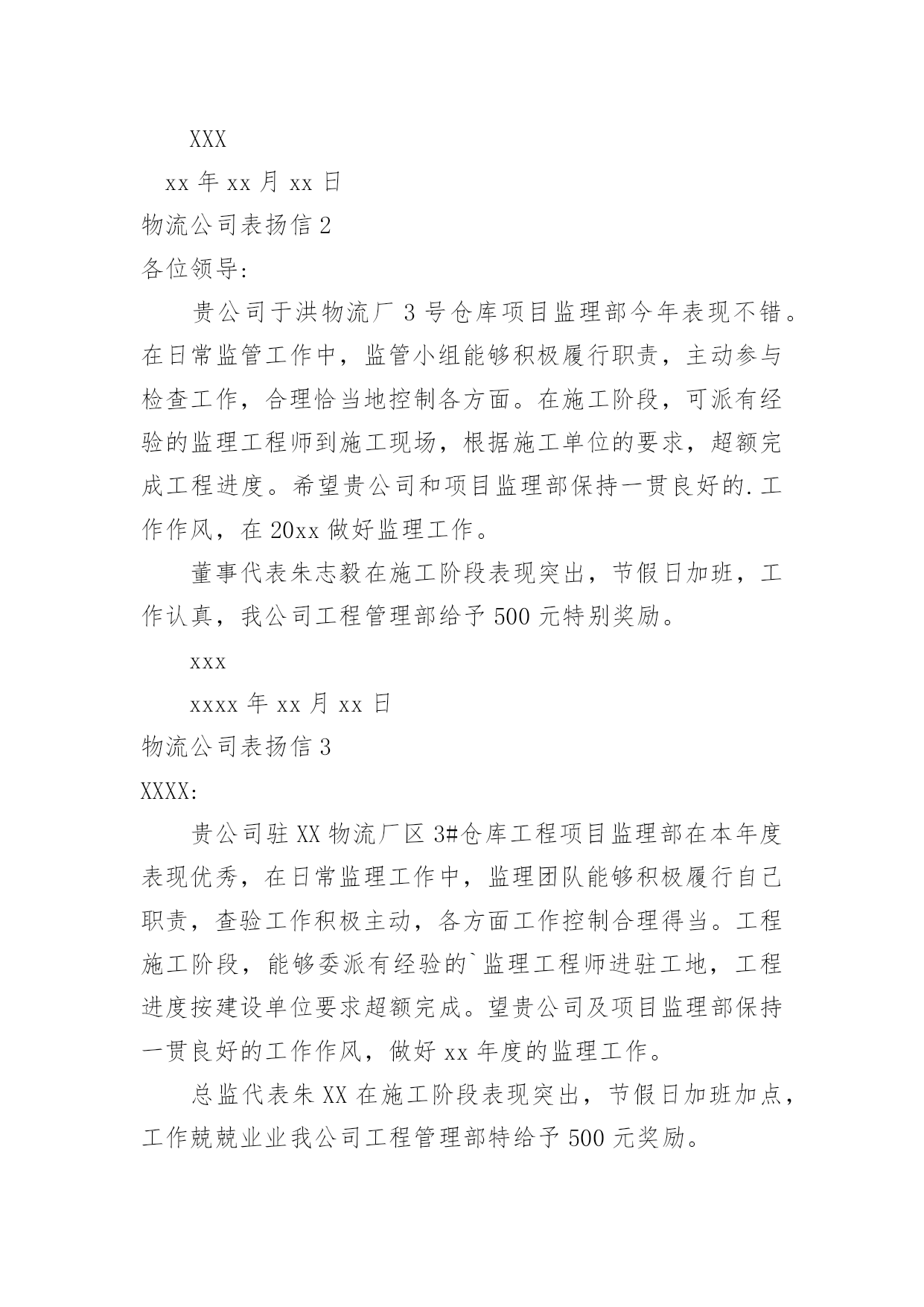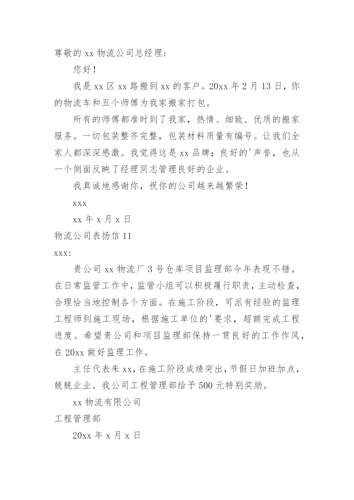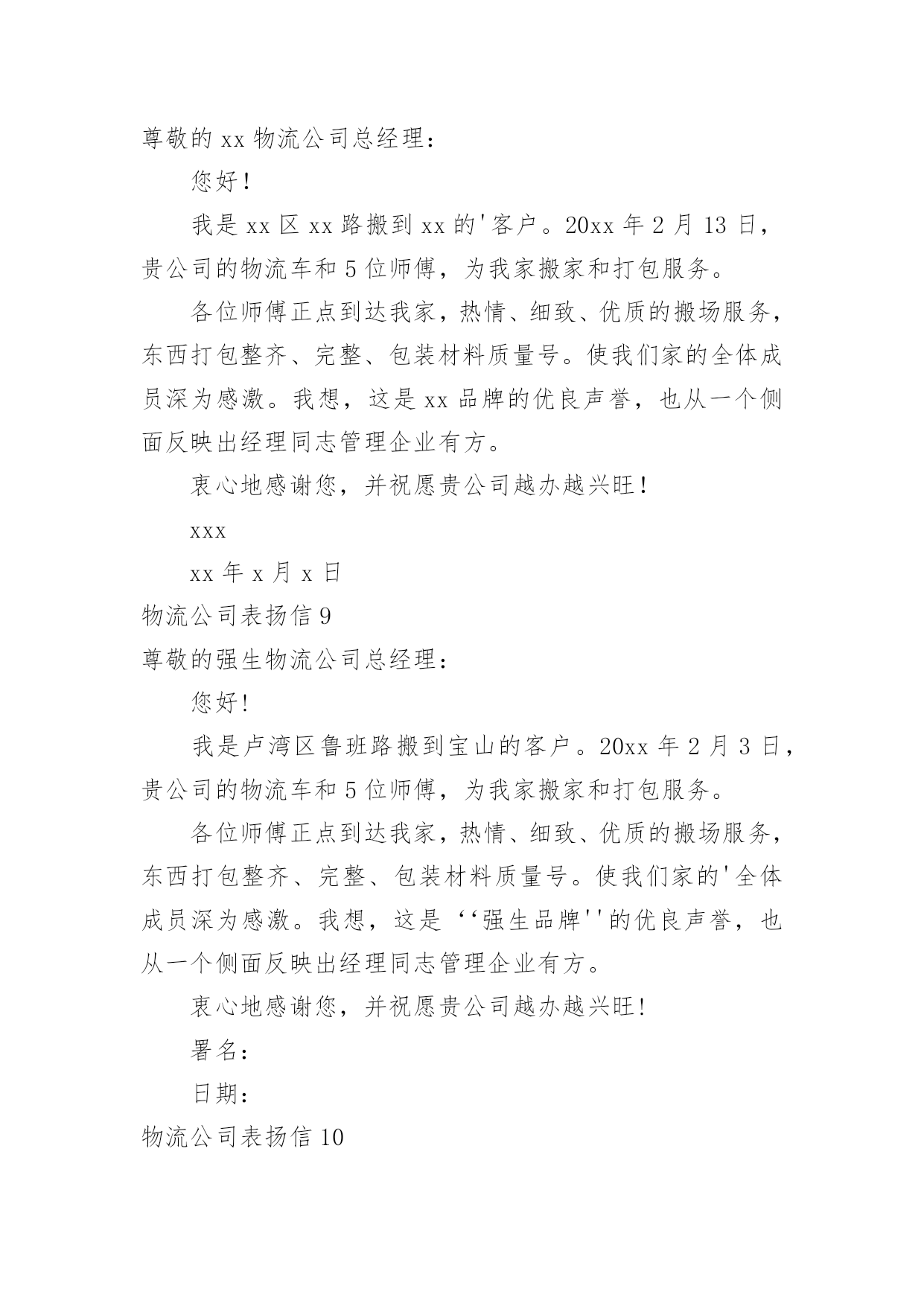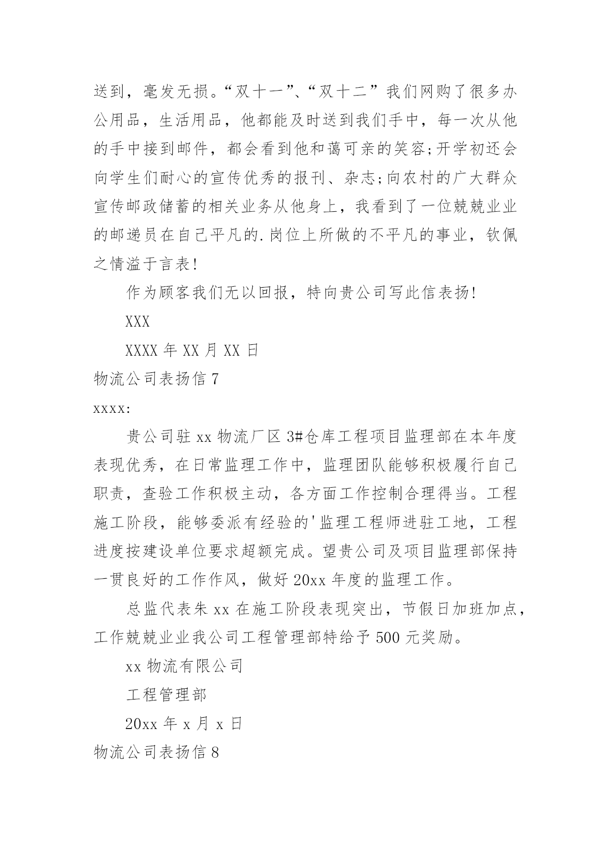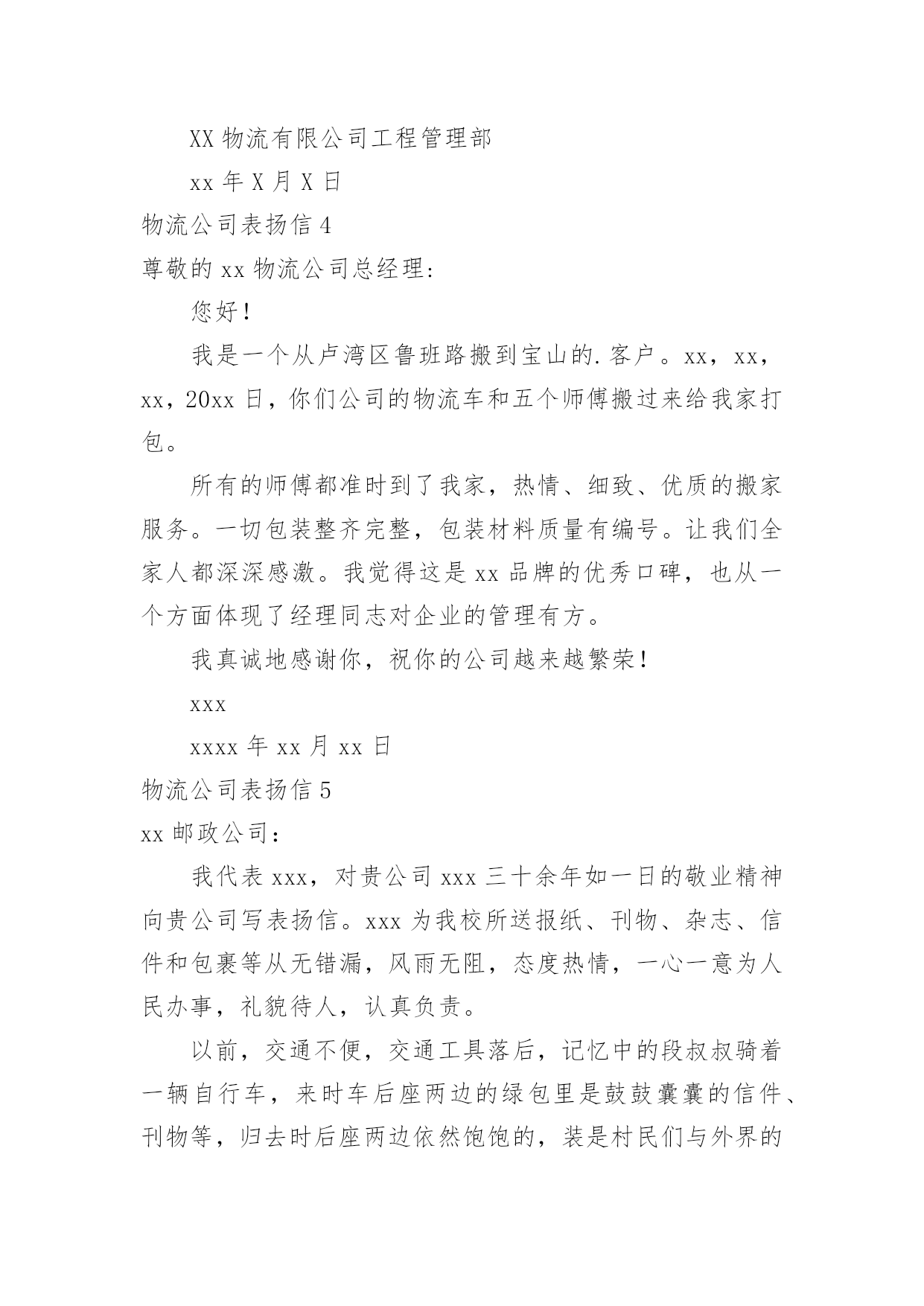 物流公司表扬信物流公司表扬信在快速变化和不断变革的新时代,很多地方都会使用到表扬信,表扬信一般均有感谢的成分,尤其是表扬的事迹同写信人有关时,更要在表扬信中表达出自己的谢意。你写表扬信时总是没有新意?以下是小编收集整理的物流公司表扬信,仅供参考,希望能够帮助到大家。物流公司表扬信1尊敬的XX:我要表扬XX快递XX的送货员王XX电话是63XXXXX的一位胖乎乎的小伙子。他说话礼貌而且很亲切,记得那天刚刚下完雪天气很冷,他到我家门口时我出来接件,他连忙说:“不用出来了姐,天太冷了,我给你送门口去。”我听了很感动,说实话接过这么多快递件,第一次遇见这么积极认真工作的快递员。我以前遇见的快递员总是一副牛气哄哄的样子,就好像谁都欠他们钱似的,一到天气不好了,就晚一天再送,打电话给他们,还没等说完话就挂电话了,很不礼貌。就这个带眼睛的'小胖哥(王XX)真的是对工作很负责,看着他把快件送到客户手中时,睁大眼睛认真仔细的确认货单,给我一种很信任很放心的感觉,我要好好的表扬他!XXXxx年xx月xx日物流公司表扬信2各位领导:贵公司于洪物流厂3号仓库项目监理部今年表现不错。在日常监管工作中,监管小组能够积极履行职责,主动参与检查工作,合理恰当地控制各方面。在施工阶段,可派有经验的监理工程师到施工现场,根据施工单位的要求,超额完成工程进度。希望贵公司和项目监理部保持一贯良好的.工作作风,在20xx做好监理工作。董事代表朱志毅在施工阶段表现突出,节假日加班,工作认真,我公司工程管理部给予500元特别奖励。xxxxxxx年xx月xx日物流公司表扬信3XXXX:贵公司驻XX物流厂区3#仓库工程项目监理部在本年度表现优秀,在日常监理工作中,监理团队能够积极履行自己职责,查验工作积极主动,各方面工作控制合理得当。工程施工阶段,能够委派有经验的`监理工程师进驻工地,工程进度按建设单位要求超额完成。望贵公司及项目监理部保持一贯良好的工作作风,做好xx年度的监理工作。总监代表朱XX在施工阶段表现突出,节假日加班加点,工作兢兢业业我公司工程管理部特给予500元奖励。XX物流有限公司工程管理部xx年X月X日物流公司表扬信4尊敬的xx物流公司总经理:您好!我是一个从卢湾区鲁班路搬到宝山的.客户。xx,xx,xx,20xx日,你们公司的物流车和五个师傅搬过来给我家打包。所有的师傅都准时到了我家,热情、细致、优质的搬家服务。一切包装整齐完整,包装材料质量有编号。让我们全家人都深深感激。我觉得这是xx品牌的优秀口碑,也从一个方面体现了经理同志对企业的管理有方。我真诚地感谢你,祝你的公司越来越繁荣!xxxxxxx年xx月xx日物流公司表扬信5xx邮政公司:我代表xxx,对贵公司xxx三十余年如一日的敬业精神向贵公司写表扬信。xxx为我校所送报纸、刊物、杂志、信件和包裹等从无错漏,风雨无阻,态度热情,一心一意为人民办事,礼貌待人,认真负责。以前,交通不便,交通工具落后,记忆中的段叔叔骑着一辆自行车,来时车后座两边的绿包里是鼓鼓囊囊的信件、刊物等,归去时后座两边依然饱饱的,装是村民们与外界的联系与牵绊。在段叔叔所送的高中录取通知书、大学录取通知书中,我一步步走出了大山,如今我回归故乡任教已有三四年,和段叔叔打交道的次数越来越多,才感觉他们工作的艰辛。今年六月份,我有一封急件从甘肃邮回来,时间紧迫,着急着办理各种手续,但天公不作美,雨下的河水都涨了,正在我心急如焚时,段叔叔打来电话问我在家还是在单位,不一会儿就出现在学校门口,当时的他穿着雨披,裤子和鞋都湿了大半,当他核对好信息将邮件递给我时,邮件竟一点都没湿,当时的我心里既有感动又有敬佩之情!学校里即将退休的王老师由于有糖尿病,使用的大量药物都是远在外地的儿子邮寄回来的,段叔叔总是按时将这些包裹送到,毫发无损。“双十一”、“双十二”我们网购了很多办公用品,生活用品,他都能及时送到我们手中,每一次从他的手中接到邮件,都会看到他和蔼可亲的`笑容;开学初还会向学生们耐心的宣传优秀的报刊、杂志;向农村的广大群众宣传邮政储蓄的相关业务从他身上,我看到了一位兢兢业业的邮递员在自己平凡的岗位上所做的不平凡的事业,钦佩之情溢于言表!作为顾客我们无以回报,特向贵公司写此信表扬!xxxxxxx年xx月xx日物流公司表扬信6尊敬的强生物流公司总经理:在外地的儿子邮寄回来的,段叔叔总是按时将这些包裹送到,毫发无损。“双十一”、“双十二”我们网购了很多办公用品,生活用品,他都能及时送到我们手中,每一次从他的手中接到邮件,都会看到他和蔼可亲的笑容;开学初还会向学生们耐心的宣传优秀的报刊、杂志;向农村的广大群众宣传邮政储蓄的相关业务从他身上,我看到了一位兢兢业业的邮递员在自己平凡的.岗位上所做的不平凡的事业,钦佩之情溢于言表!作为顾客我们无以回报,特向贵公