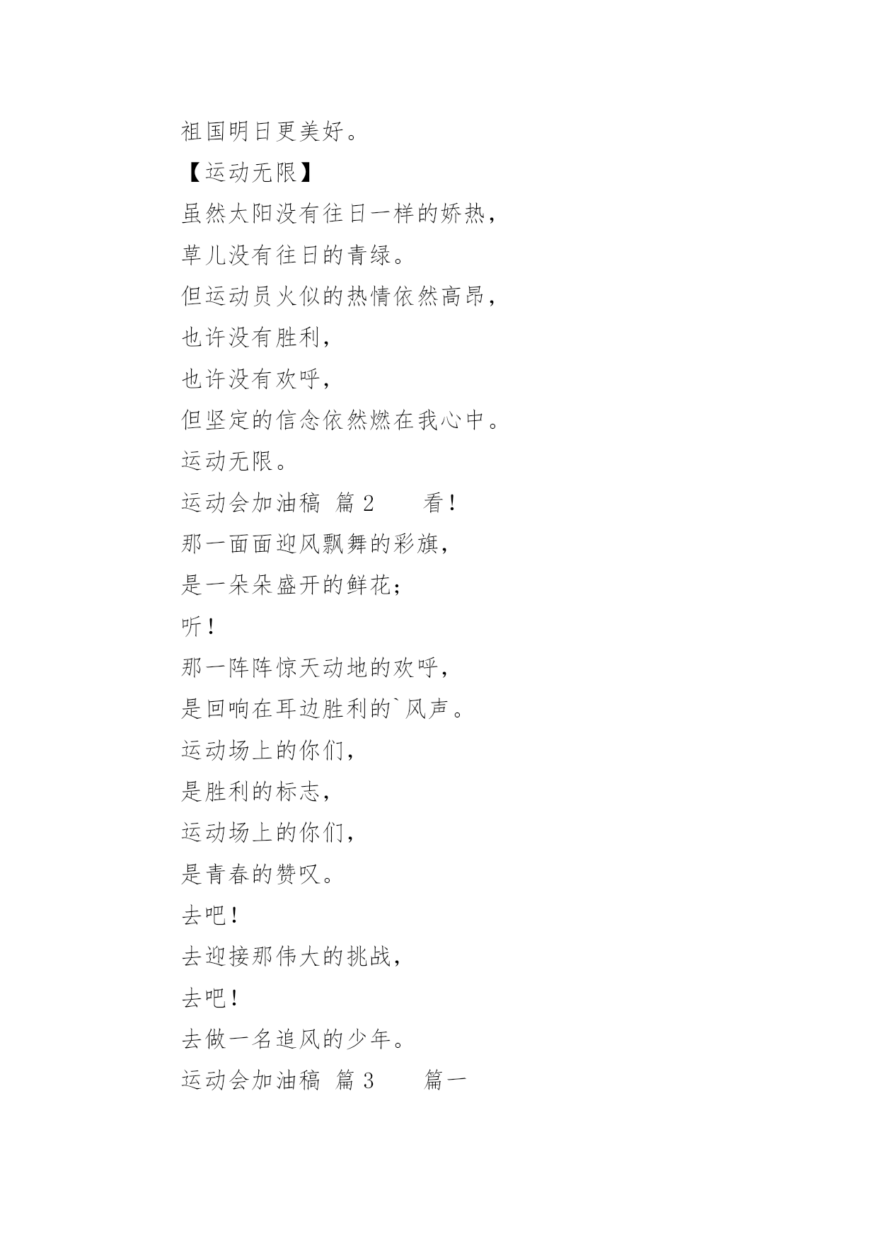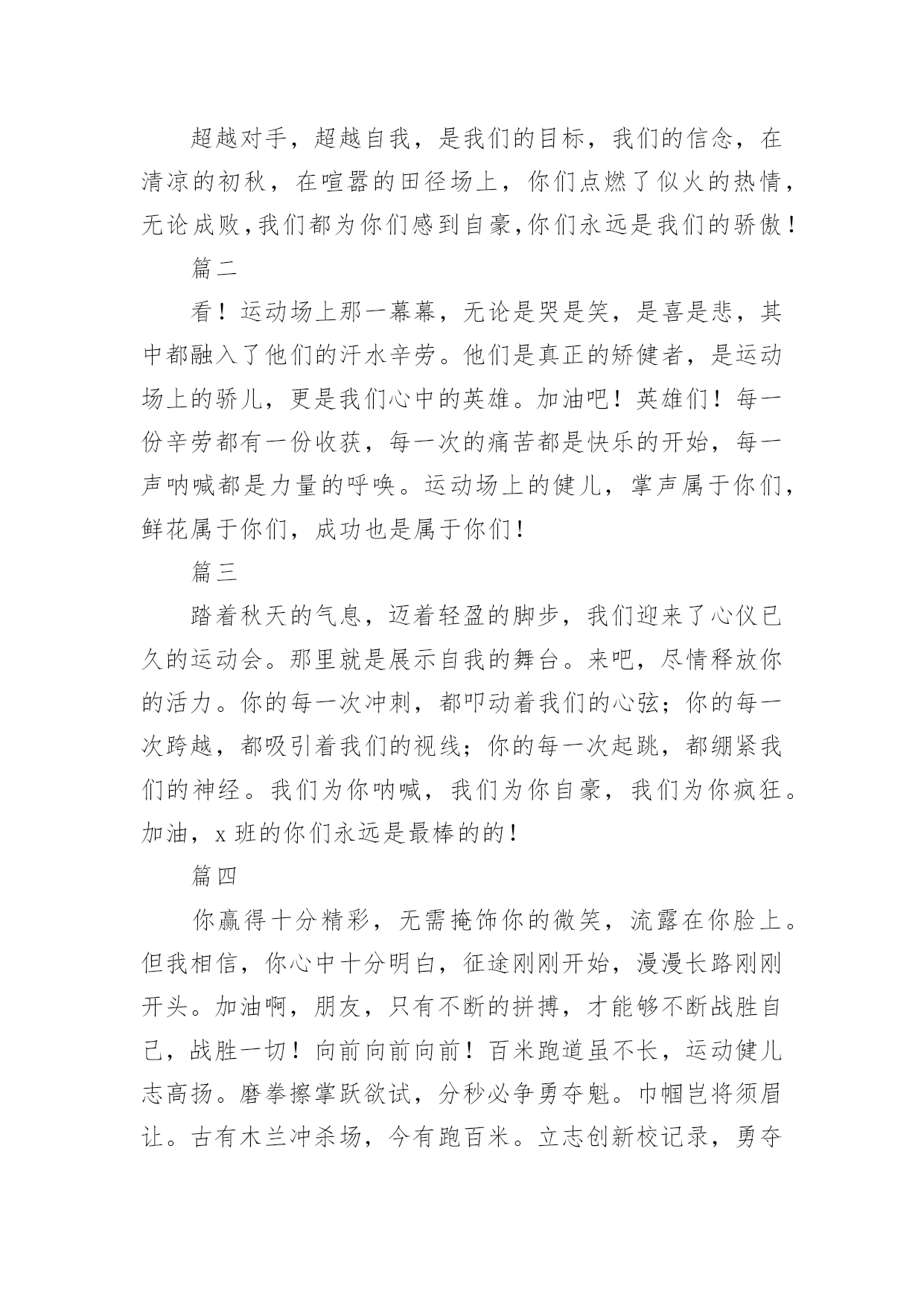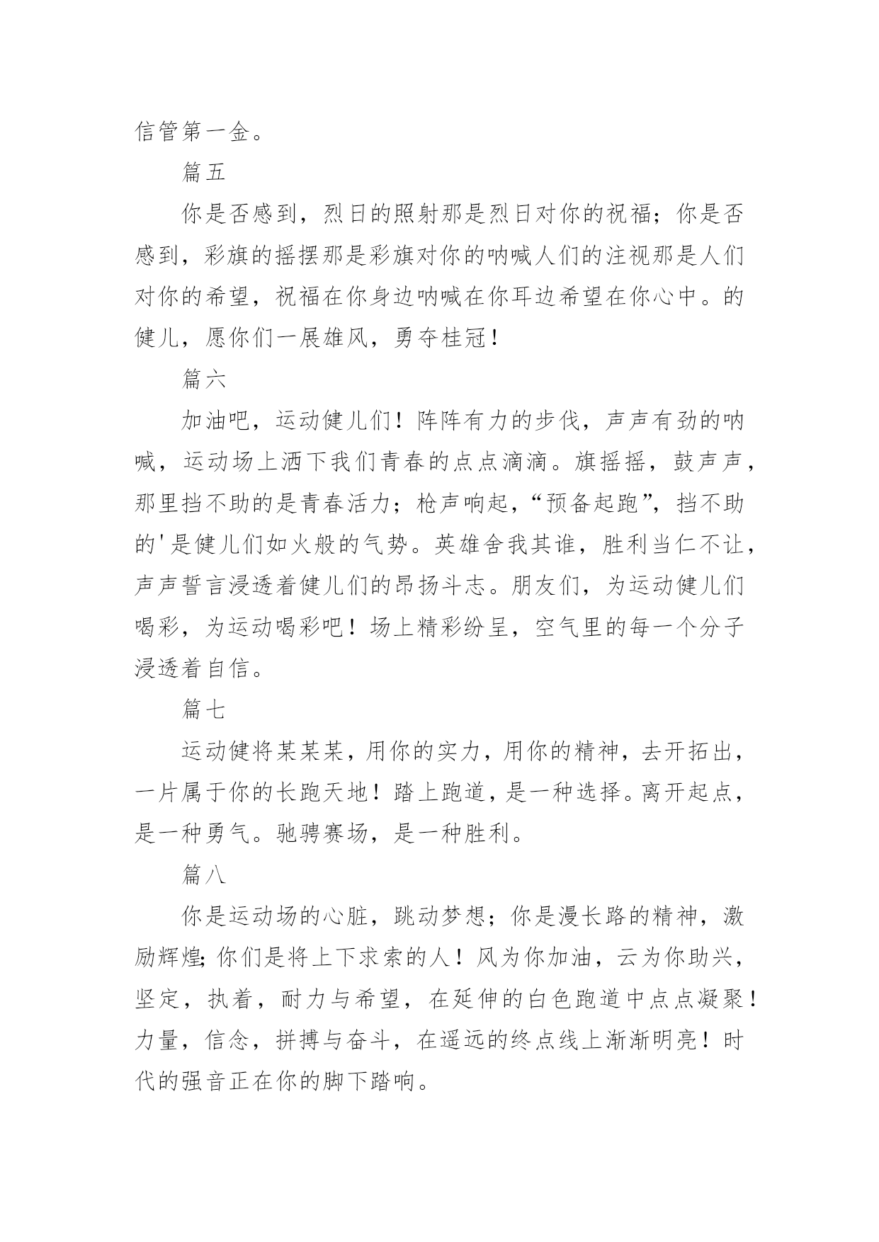 运动会加油稿(荐)运动会加油稿14篇在现在社会,接触并使用加油稿的人越来越多,借助加油稿可以激励他人的士气。大家知道加油稿怎么写才正确吗?下面是小编帮大家整理的运动会加油稿,欢迎阅读,希望大家能够喜欢。运动会加油稿篇1【致100米短跑运动员】你——一颗耀眼的流星划过尘土扬起的跑道急快仿佛风暴!潮湿的衬衫潮湿的眼角——-我们大声的呼号赢得最后的骄傲!【致1500米运动员】你是否感到,烈日的照射那是烈日对你的祝福你是否感到,彩旗的摇摆那是彩旗对你的呐喊人们的注视那是人们对你的希望祝福在你身边呐喊在你耳边希望在你心中【失败的心声】悄悄的,我退居一旁避开所有的'掌声和目光远离胜利者的灿烂和辉煌如果说生命也是一场竞争我参与也曾把竞争的滋味品尝【起点之美】在红与白相交织的起点浮动着紧张的空气起点之美在于鱼翔浅底的静默起点之美在于瞬间爆发的激情【运动无限】虽然太阳没有往日一样的娇热,草儿没有往日的青绿。但运动员火似的热情依然高昂,也许没有胜利,也许没有欢呼,但坚定的信念依然燃在我心中。运动无限。【如歌的校园】当小号吹醒黎明,校园揉着惺松的眼睛,赛场上的呐喊声声,如一多多美丽的蝴蝶,轻轻碰落在花坛草尖上。每天的赛事很精彩,一只只雄鹰,在碧空翱翔,我们,为你加油!【我们】我们是朝阳,充满希望。我们是春天,散发芬芳。我们热爱生命,因为以后的路还很长。我们热爱运动,因为我们要通过运动散发活力。我们比泉水还清,我们比猛虎更有力。我们,我们【零星一点白】在绿草,红色跑道间零星一点白,那是最骄傲最让人激动的点————领奖台,国旗也微笑俯视一切水天,草地间零星一点白这是最耀眼最有生命力的点瞬间的闪烁让人有些嫉妒【誓言】曾惊秋肃临天下,敢遣春温梦翱翔。秋雨哀怨挥手去,金风萧瑟志激昂。百年梦圆不眠夜,化作赛场斗志扬。五环旗下誓言在,更高更快更顽强。【致跑步运动员】起点上你摩拳擦掌跑道上你奋力争强终点线上你青春飞扬领奖台上我们为你鼓掌努力吧体育健儿更高更快更强!【百米】一生的奋斗影缩成百米眼中只有终点身是一把弓紧的弦朝着目标一枚离弦的箭【跳高】轻轻一跃把身体交给浮云四米长的足竿载决着微笑和泪水标枪冲掷飞出的不仅仅是标枪还有渴望【致运动会】秋季气爽彩旗飘,运动健儿逞英豪。千呼万喊齐加油,场上场下都骄傲。今日练出好身体,志为四化立功劳。德智体美齐发展,祖国明日更美好。【运动无限】虽然太阳没有往日一样的娇热,草儿没有往日的青绿。但运动员火似的热情依然高昂,也许没有胜利,也许没有欢呼,但坚定的信念依然燃在我心中。运动无限。运动会加油稿篇2看!那一面面迎风飘舞的彩旗,是一朵朵盛开的鲜花;听!那一阵阵惊天动地的欢呼,是回响在耳边胜利的`风声。运动场上的你们,是胜利的标志,运动场上的你们,是青春的赞叹。去吧!去迎接那伟大的挑战,去吧!去做一名追风的少年。运动会加油稿篇3篇一超越对手,超越自我,是我们的目标,我们的信念,在清凉的初秋,在喧嚣的田径场上,你们点燃了似火的热情,无论成败,我们都为你们感到自豪,你们永远是我们的骄傲!篇二看!运动场上那一幕幕,无论是哭是笑,是喜是悲,其中都融入了他们的汗水辛劳。他们是真正的矫健者,是运动场上的骄儿,更是我们心中的英雄。加油吧!英雄们!每一份辛劳都有一份收获,每一次的痛苦都是快乐的开始,每一声呐喊都是力量的呼唤。运动场上的健儿,掌声属于你们,鲜花属于你们,成功也是属于你们!篇三踏着秋天的气息,迈着轻盈的脚步,我们迎来了心仪已久的运动会。那里就是展示自我的舞台。来吧,尽情释放你的活力。你的每一次冲刺,都叩动着我们的心弦;你的每一次跨越,都吸引着我们的视线;你的每一次起跳,都绷紧我们的神经。我们为你呐喊,我们为你自豪,我们为你疯狂。加油,x班的你们永远是最棒的的!篇四你赢得十分精彩,无需掩饰你的微笑,流露在你脸上。但我相信,你心中十分明白,征途刚刚开始,漫漫长路刚刚开头。加油啊,朋友,只有不断的拼搏,才能够不断战胜自己,战胜一切!向前向前向前!百米跑道虽不长,运动健儿志高扬。磨拳擦掌跃欲试,分秒必争勇夺魁。巾帼岂将须眉让。古有木兰冲杀场,今有跑百米。立志创新校记录,勇夺信管第一金。篇五你是否感到,烈日的照射那是烈日对你的祝福;你是否感到,彩旗的摇摆那是彩旗对你的呐喊人们的注视那是人们对你的希望,祝福在你身边呐喊在你耳边希望在你心中。的健儿,愿你们一展雄风,勇夺桂冠!篇六加油吧,运动健儿们!阵阵有力的步伐,声声有劲的呐喊,运动场上洒下我们青春的点点滴滴。旗摇摇,鼓声声,那里挡不助的是青春活力;枪声响起,“预备起跑”,挡不助的'是健儿们如火般的气势。英雄舍我其谁,胜利当仁不让,声声誓言浸透着健儿们的昂扬斗志。朋友们,为运动健儿们喝彩,为运动喝彩吧!场上精彩纷呈,空气里的每一个分子浸透着自信。篇七运动健将某某某,用你的实力,用你的精神,去开拓出