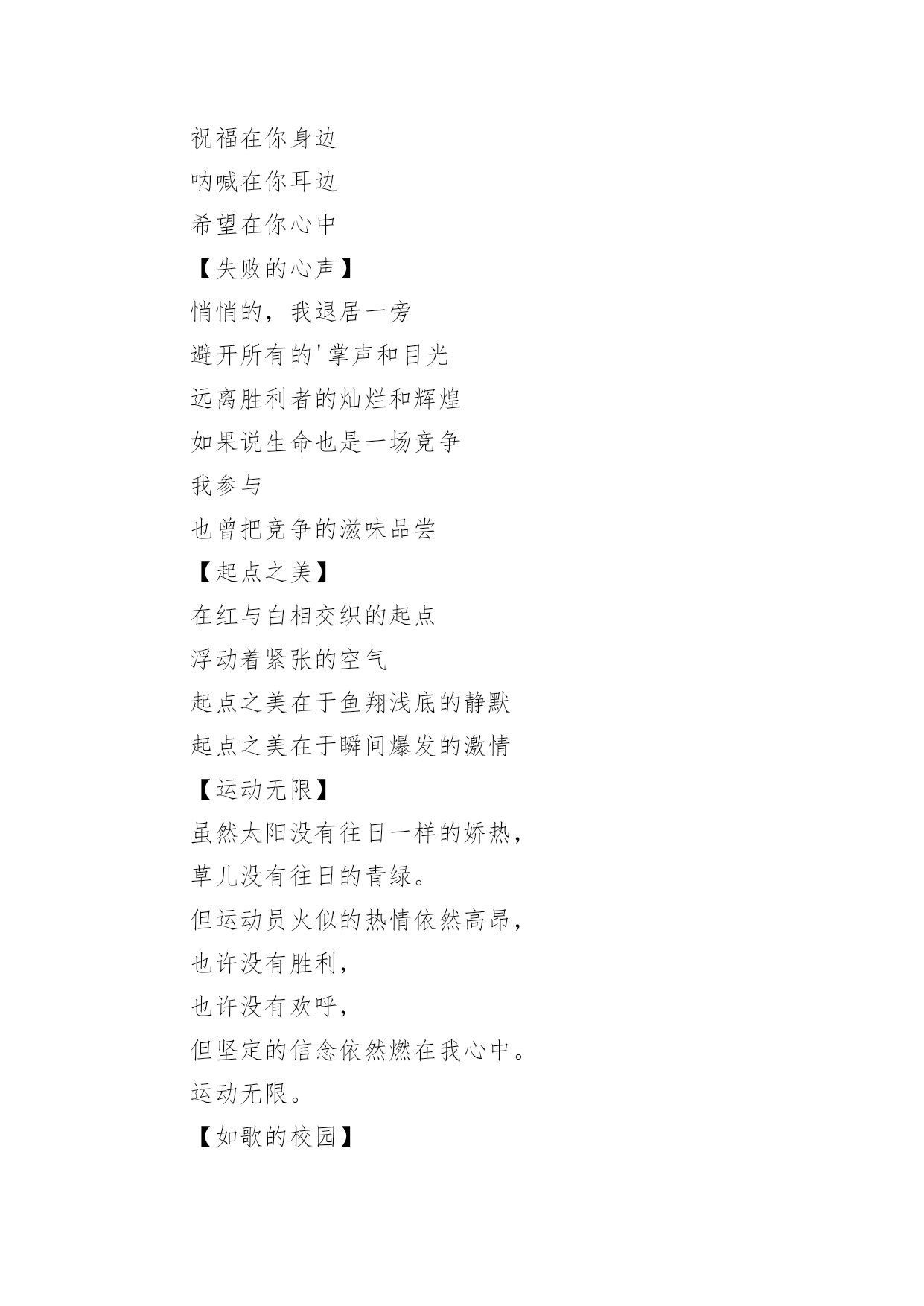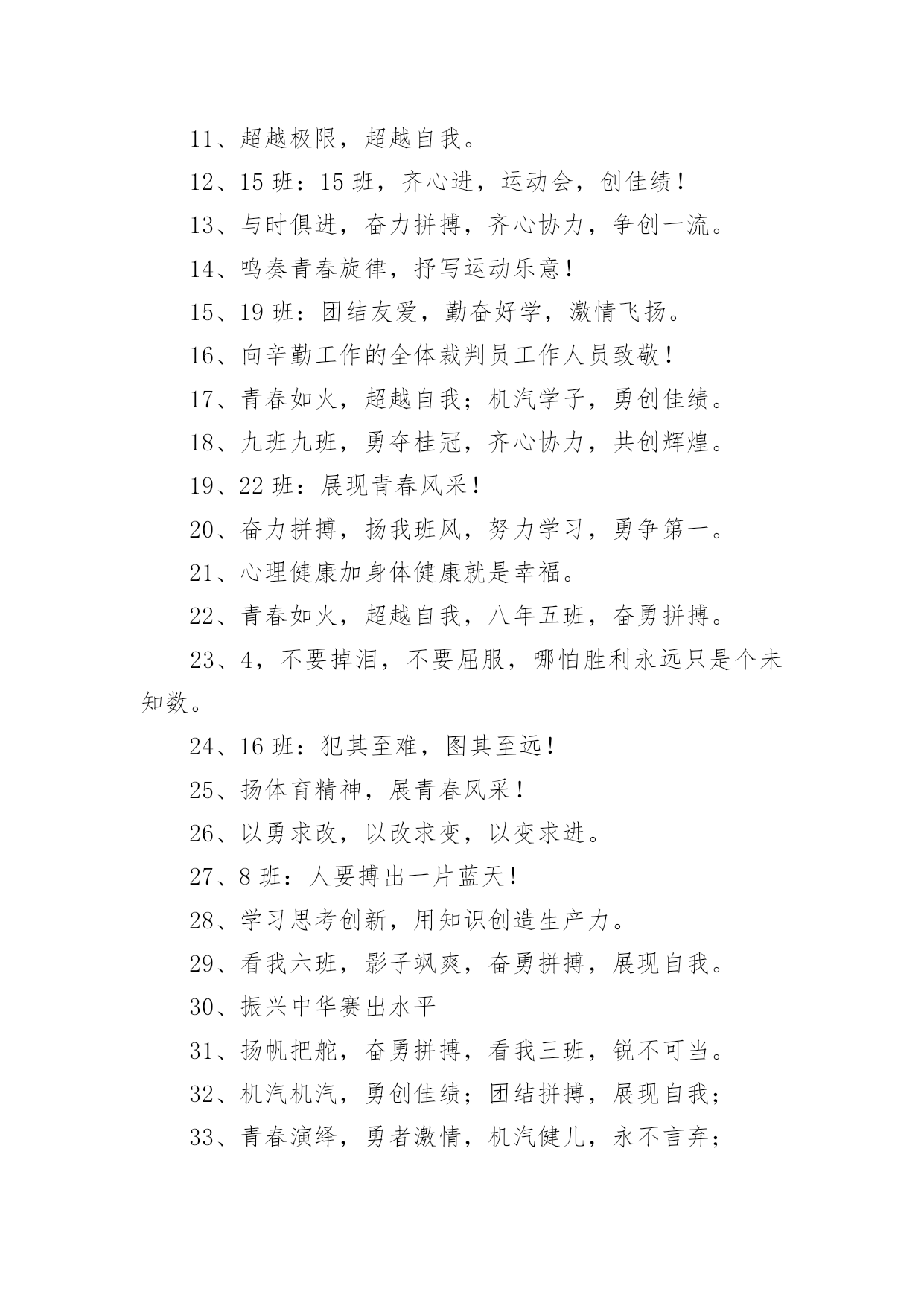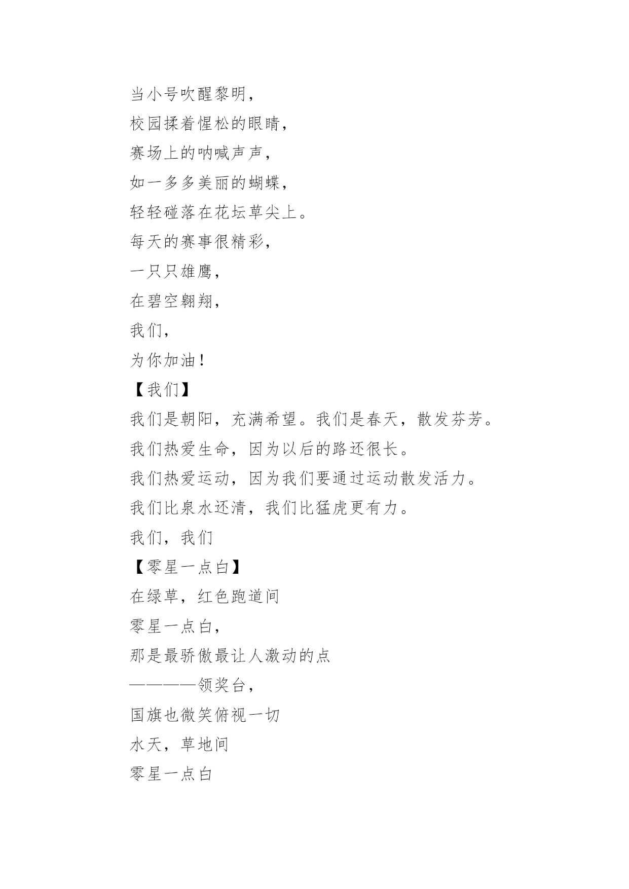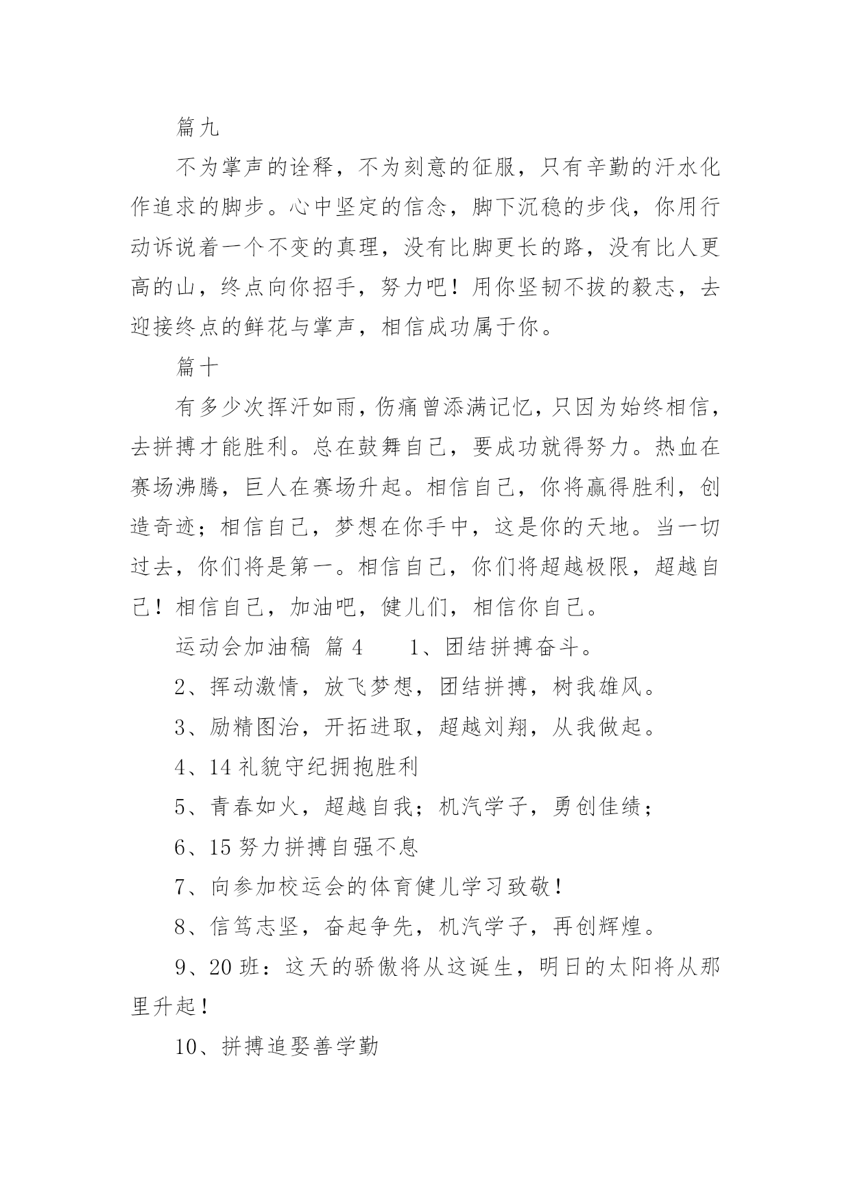 运动会加油稿(荐)运动会加油稿14篇在现在社会,接触并使用加油稿的人越来越多,借助加油稿可以激励他人的士气。大家知道加油稿怎么写才正确吗?下面是小编帮大家整理的运动会加油稿,欢迎阅读,希望大家能够喜欢。运动会加油稿篇1【致100米短跑运动员】你——一颗耀眼的流星划过尘土扬起的跑道急快仿佛风暴!潮湿的衬衫潮湿的眼角——-我们大声的呼号赢得最后的骄傲!【致1500米运动员】你是否感到,烈日的照射那是烈日对你的祝福你是否感到,彩旗的摇摆那是彩旗对你的呐喊人们的注视那是人们对你的希望祝福在你身边呐喊在你耳边希望在你心中【失败的心声】悄悄的,我退居一旁避开所有的'掌声和目光远离胜利者的灿烂和辉煌如果说生命也是一场竞争我参与也曾把竞争的滋味品尝【起点之美】在红与白相交织的起点浮动着紧张的空气起点之美在于鱼翔浅底的静默起点之美在于瞬间爆发的激情【运动无限】虽然太阳没有往日一样的娇热,草儿没有往日的青绿。但运动员火似的热情依然高昂,也许没有胜利,也许没有欢呼,但坚定的信念依然燃在我心中。运动无限。【如歌的校园】当小号吹醒黎明,校园揉着惺松的眼睛,赛场上的呐喊声声,如一多多美丽的蝴蝶,轻轻碰落在花坛草尖上。每天的赛事很精彩,一只只雄鹰,在碧空翱翔,我们,为你加油!【我们】我们是朝阳,充满希望。我们是春天,散发芬芳。我们热爱生命,因为以后的路还很长。我们热爱运动,因为我们要通过运动散发活力。我们比泉水还清,我们比猛虎更有力。我们,我们【零星一点白】在绿草,红色跑道间零星一点白,那是最骄傲最让人激动的点————领奖台,国旗也微笑俯视一切水天,草地间零星一点白这是最耀眼最有生命力的点瞬间的闪烁让人有些嫉妒【誓言】曾惊秋肃临天下,敢遣春温梦翱翔。秋雨哀怨挥手去,金风萧瑟志激昂。百年梦圆不眠夜,化作赛场斗志扬。五环旗下誓言在,更高更快更顽强。【致跑步运动员】起点上你摩拳擦掌跑道上你奋力争强终点线上你青春飞扬领奖台上我们为你鼓掌努力吧体育健儿更高更快更强!【百米】一生的奋斗影缩成百米眼中只有终点身是一把弓紧的弦朝着目标一枚离弦的箭【跳高】轻轻一跃把身体交给浮云四米长的足竿载决着微笑和泪水标枪冲掷飞出的不仅仅是标枪还有渴望【致运动会】秋季气爽彩旗飘,运动健儿逞英豪。千呼万喊齐加油,场上场下都骄傲。今日练出好身体,志为四化立功劳。德智体美齐发展,祖国明日更美好。【运动无限】虽然太阳没有往日一样的娇热,草儿没有往日的青绿。但运动员火似的热情依然高昂,也许没有胜利,也许没有欢呼,但坚定的信念依然燃在我心中。运动无限。运动会加油稿篇2看!那一面面迎风飘舞的彩旗,是一朵朵盛开的鲜花;听!那一阵阵惊天动地的欢呼,是回响在耳边胜利的`风声。运动场上的你们,是胜利的标志,运动场上的你们,是青春的赞叹。去吧!去迎接那伟大的挑战,去吧!去做一名追风的少年。运动会加油稿篇3篇一超越对手,超越自我,是我们的目标,我们的信念,在清凉的初秋,在喧嚣的田径场上,你们点燃了似火的热情,无论成败,我们都为你们感到自豪,你们永远是我们的骄傲!篇二看!运动场上那一幕幕,无论是哭是笑,是喜是悲,其中都融入了他们的汗水辛劳。他们是真正的矫健者,是运动场上的骄儿,更是我们心中的英雄。加油吧!英雄们!每一份辛劳都有一份收获,每一次的痛苦都是快乐的开始,每一声呐喊都是力量的呼唤。运动场上的健儿,掌声属于你们,鲜花属于你们,成功也是属于你们!篇三踏着秋天的气息,迈着轻盈的脚步,我们迎来了心仪已久的运动会。那里就是展示自我的舞台。来吧,尽情释放你的活力。你的每一次冲刺,都叩动着我们的心弦;你的每一次跨越,都吸引着我们的视线;你的每一次起跳,都绷紧我们的神经。我们为你呐喊,我们为你自豪,我们为你疯狂。加油,x班的你们永远是最棒的的!篇四你赢得十分精彩,无需掩饰你的微笑,流露在你脸上。但我相信,你心中十分明白,征途刚刚开始,漫漫长路刚刚开头。加油啊,朋友,只有不断的拼搏,才能够不断战胜自己,战胜一切!向前向前向前!百米跑道虽不长,运动健儿志高扬。磨拳擦掌跃欲试,分秒必争勇夺魁。巾帼岂将须眉让。古有木兰冲杀场,今有跑百米。立志创新校记录,勇夺信管第一金。篇五你是否感到,烈日的照射那是烈日对你的祝福;你是否感到,彩旗的摇摆那是彩旗对你的呐喊人们的注视那是人们对你的希望,祝福在你身边呐喊在你耳边希望在你心中。的健儿,愿你们一展雄风,勇夺桂冠!篇六加油吧,运动健儿们!阵阵有力的步伐,声声有劲的呐喊,运动场上洒下我们青春的点点滴滴。旗摇摇,鼓声声,那里挡不助的是青春活力;枪声响起,“预备起跑”,挡不助的'是健儿们如火般的气势。英雄舍我其谁,胜利当仁不让,声声誓言浸透着健儿们的昂扬斗志。朋友们,为运动健儿们喝彩,为运动喝彩吧!场上精彩纷呈,空气里的每一个分子浸透着自信。篇七运动健将某某某,用你的实力,用你的精神,去开拓出
