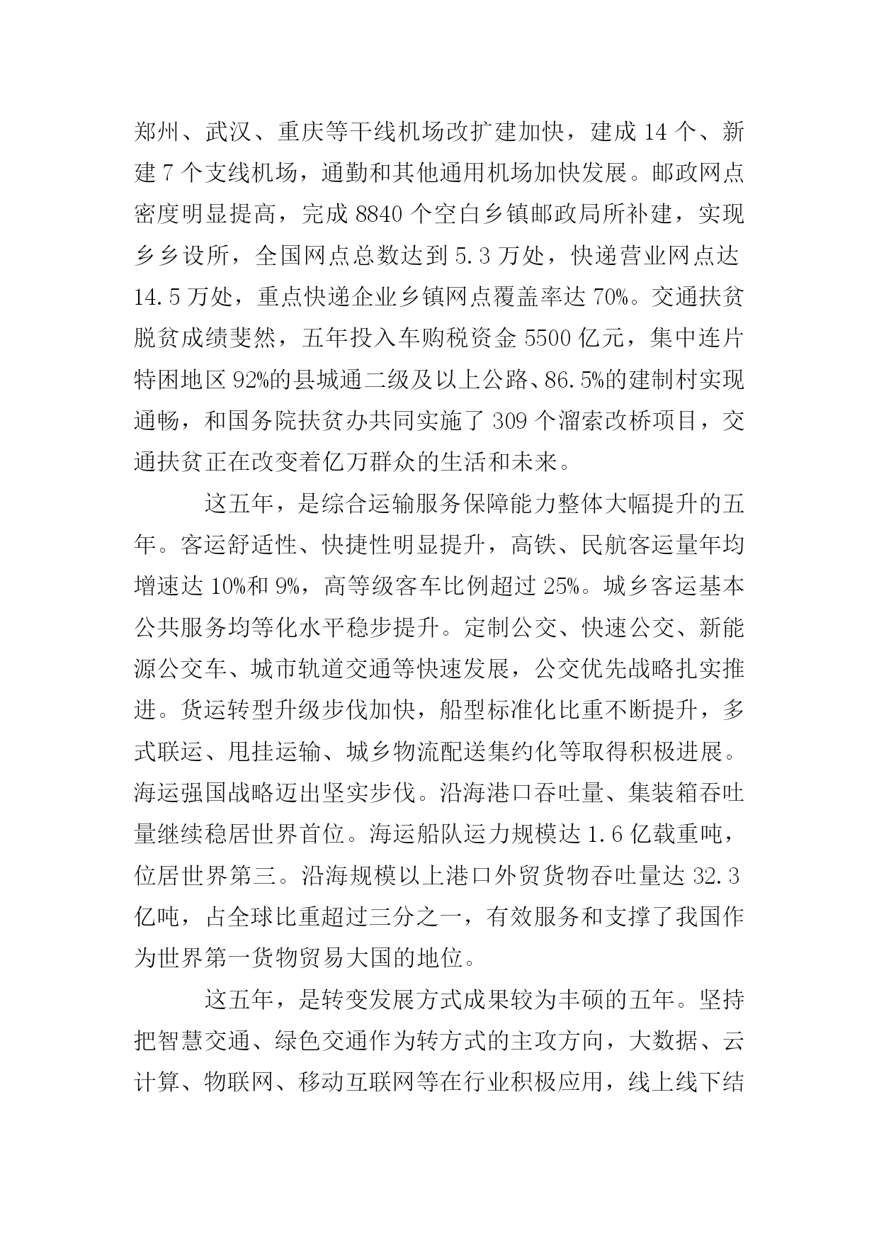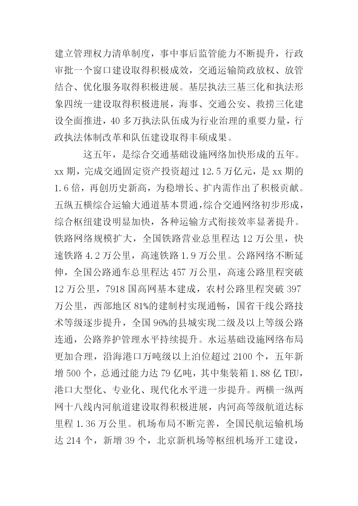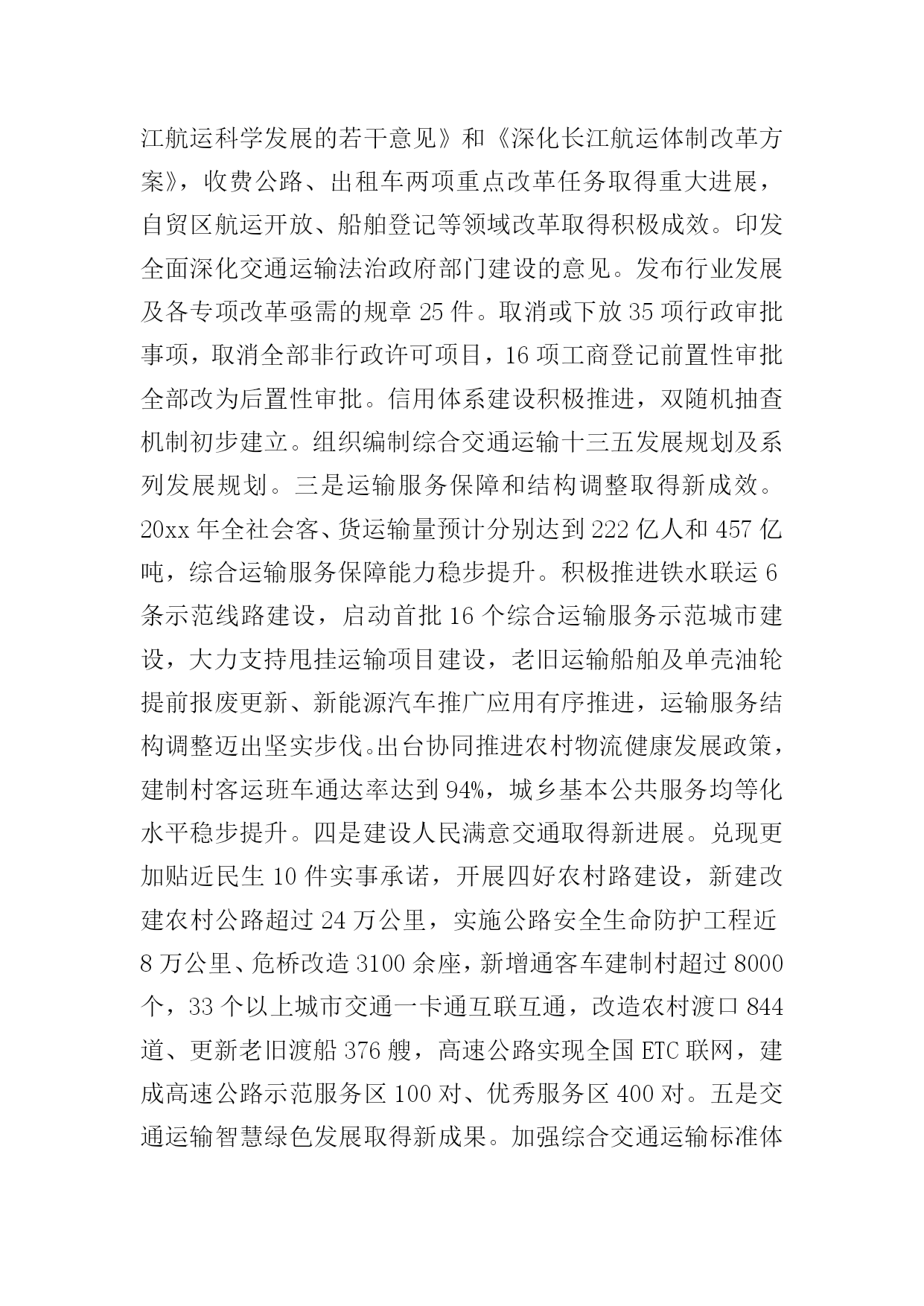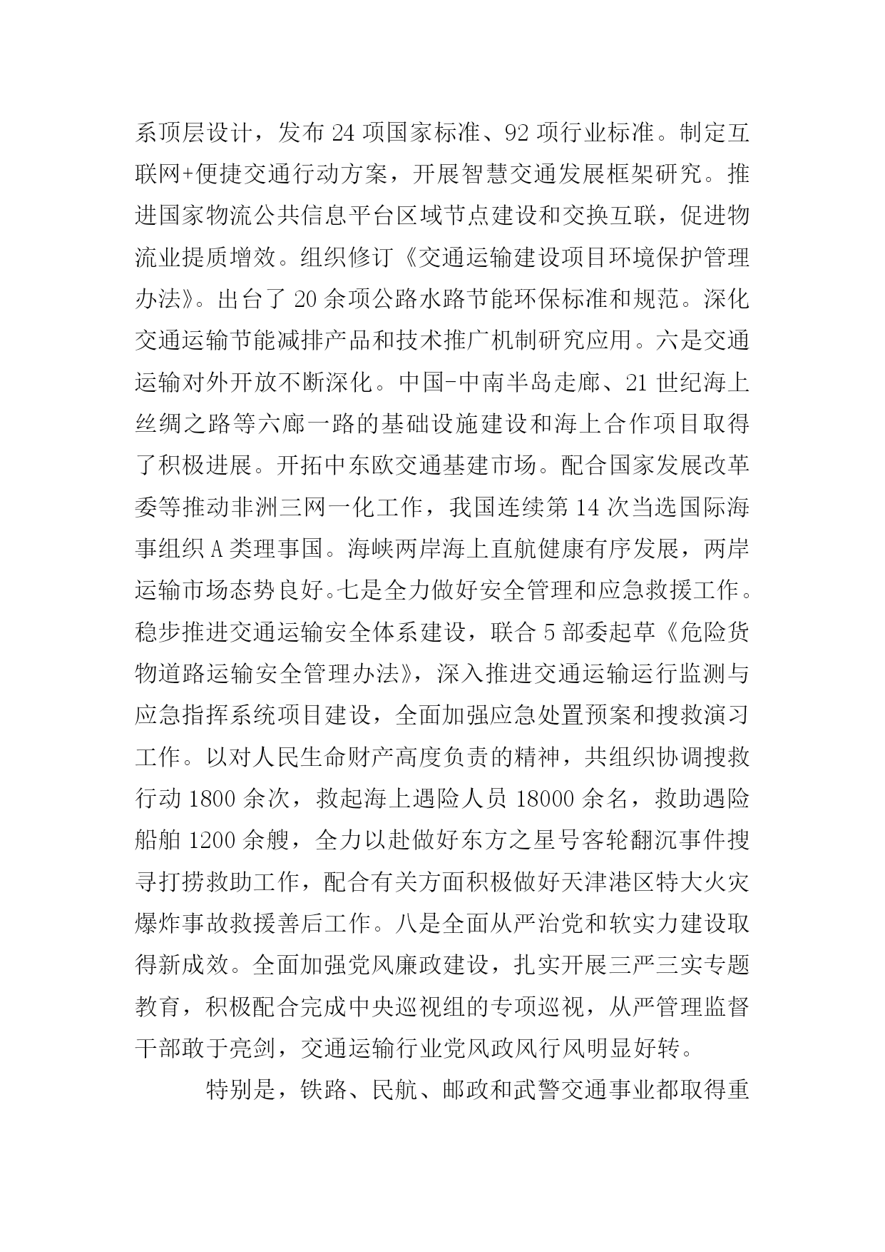 交通工作会议演讲词交通工作会议演讲词篇【1】同志们:这次会议的主要任务是:全面贯彻党的和xx届三中、四中、五中全会精神,深入贯彻系列重要讲话精神,按照中央经济工作会议部署,总结xx交通运输工作,分析形势,研究十三五交通运输发展总体思路,部署20xx年重点工作,更好适应、把握、引领经济发展新常态,推进结构性改革,为全面建成小康社会当好先行。下面,我讲三个方面的问题。一、xx时期交通运输发展的回顾xx时期是我国交通运输发展进程中极不平凡的五年。在党中央、国务院正确领导下,全行业以科学发展为主题,以调整结构、转变发展方式为主线,加快四个交通建设,全力当好发展先行官,圆满完成了xx规划目标任务,实现了交通运输发展阶段由总体缓解向基本适应的重大跃升,为我国由交通大国迈向交通强国奠定了坚实基础。这五年,是交通运输发展理念不断提升、支撑发展全局作用更加凸显的五年。党中央、国务院高度重视、强化交通运输发展。、多次对交通运输工作作出重要指示批示,先行官成为引领行业发展的新旗帜,三个服务四个交通三个转变五化工程管理等发展现代交通运输业理念成为行业共识。服务国家三大战略迈出坚实的步伐,制定《落实一带一路战略规划实施方案》,出台了加快交通基础设施互联互通、促进国际运输便利化、推动交通运输走出去等一系列具体措施,中欧货运班列横跨万里,成为连结欧亚大陆的贸易纽带。联合国家发展改革委编制完成《京津冀协同发展交通一体化规划》,出台实施方案及政策创新意见,推出了基础设施网络化、运输市场一体化和运输服务便捷化等改革举措。会同国家发展改革委制定了《长江经济带发展规划纲要》,联合编制了《长江经济带综合立体交通走廊规划》,大力推进长江经济带综合立体交通走廊建设进程。国务院发布《国家公路网规划》《物流业发展中长期规划》,出台促进铁路建设、普通公路、民航业、快递业健康发展等意见,海运强国公交优先等上升为国家战略,交通运输在国民经济和社会发展全局中的地位进一步提升。这五年,是综合交通运输改革和法治建设取得重大进展的五年。在国家层面建立综合交通运输管理体制,综合交通运输改革向前迈进一大步。直属海事系统政事分开,行政机构全面纳入公务员管理。公路建设养护、长江航运、界河航道、救助打捞、武警交通等体制改革稳步推进,交通运输综合改革、区域港口一体化、综合行政执法等改革试点扎实推进。大幅减少行政事业性收费,降低港航经营服务性收费,极大激发市场活力。法治政府部门建设不断深化。《航道法》《邮政法(修订)》颁布施行,《铁路安全管理条例》《公路安全保护条例》《国内水路运输管理条例》等完成制修订,新出台部门规章92件,综合交通运输法规体系框架基本形成。建立管理权力清单制度,事中事后监管能力不断提升,行政审批一个窗口建设取得积极成效,交通运输简政放权、放管结合、优化服务取得积极进展。基层执法三基三化和执法形象四统一建设取得积极进展,海事、交通公安、救捞三化建设全面推进,40多万执法队伍成为行业治理的重要力量,行政执法体制改革和队伍建设取得丰硕成果。这五年,是综合交通基础设施网络加快形成的五年。xx期,完成交通固定资产投资超过12.5万亿元,是xx期的1.6倍,再创历史新高,为稳增长、扩内需作出了积极贡献。五纵五横综合运输大通道基本贯通,综合交通网络初步形成,综合枢纽建设明显加快,各种运输方式衔接效率显著提升。铁路网络规模扩大,全国铁路营业总里程达12万公里,快速铁路4.2万公里,高速铁路1.9万公里。公路网络不断延伸,全国公路通车总里程达457万公里,高速公路里程突破12万公里,7918国高网基本建成,农村公路里程突破397万公里,西部地区81%的建制村实现通畅,国省干线公路技术等级逐步提升,全国96%的县城实现二级及以上等级公路连通,公路养护管理水平持续提升。水运基础设施网络布局更加合理,沿海港口万吨级以上泊位超过2100个,五年新增500个,总通过能力达79亿吨,其中集装箱1.88亿TEU,港口大型化、专业化、现代化水平进一步提升。两横一纵两网十八线内河航道建设取得积极进展,内河高等级航道达标里程1.36万公里。机场布局不断完善,全国民航运输机场达214个,新增39个,北京新机场等枢纽机场开工建设,郑州、武汉、重庆等干线机场改扩建加快,建成14个、新建7个支线机场,通勤和其他通用机场加快发展。邮政网点密度明显提高,完成8840个空白乡镇邮政局所补建,实现乡乡设所,全国网点总数达到5.3万处,快递营业网点达14.5万处,重点快递企业乡镇网点覆盖率达70%。交通扶贫脱贫成绩斐然,五年投入车购税资金5500亿元,集中连片特困地区92%的县城通二级及以上公路、86.5%的建制村实现通畅,和国务院扶贫办共同实施了309个溜索改桥项目,交通扶贫正在改变着亿万群众的生活