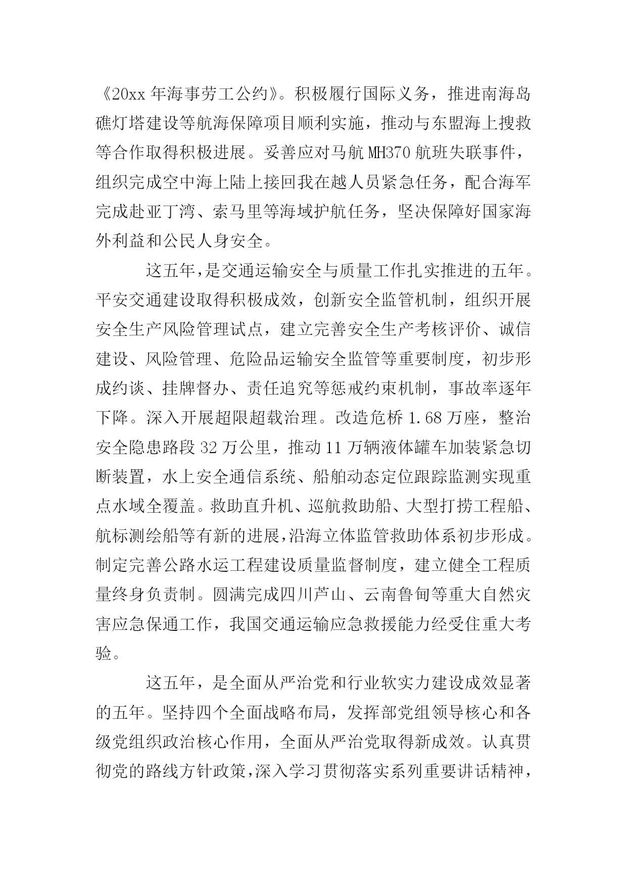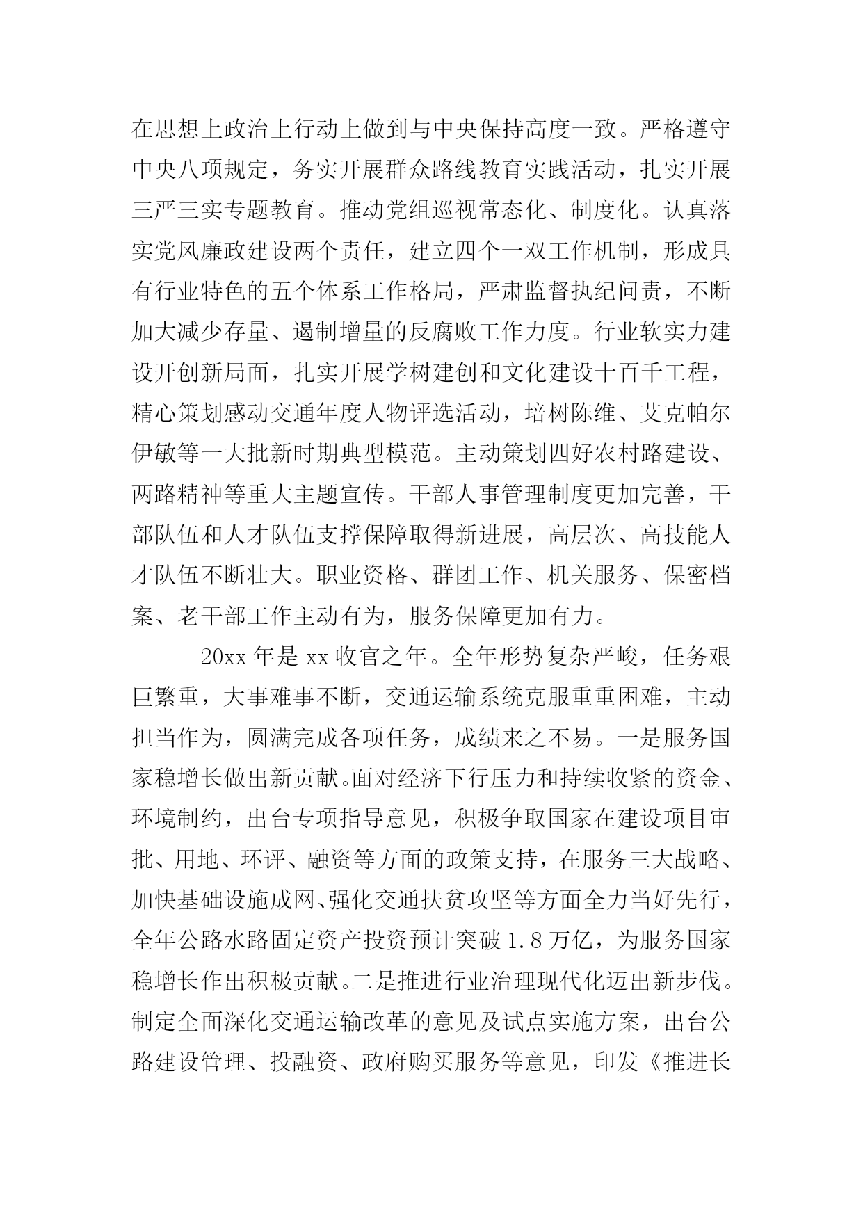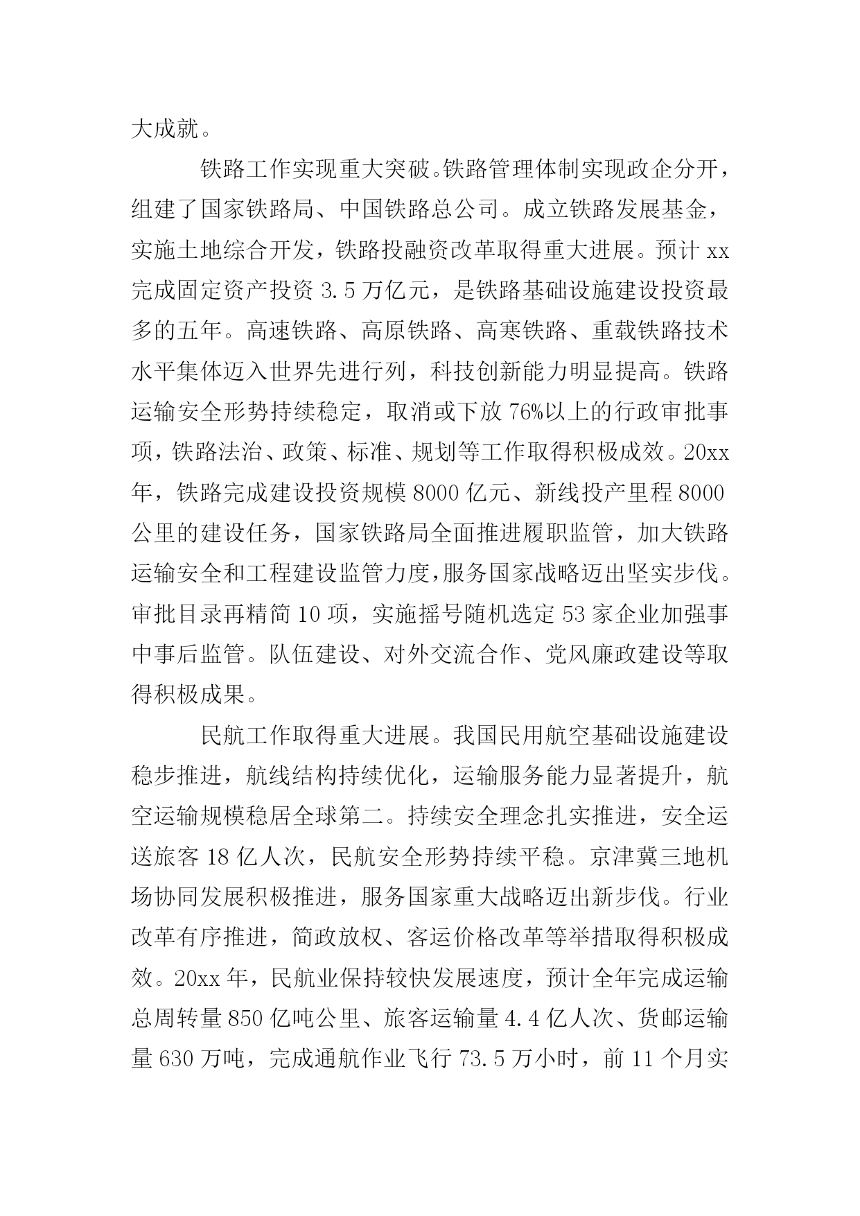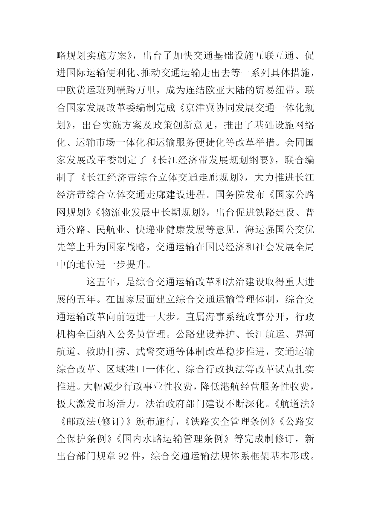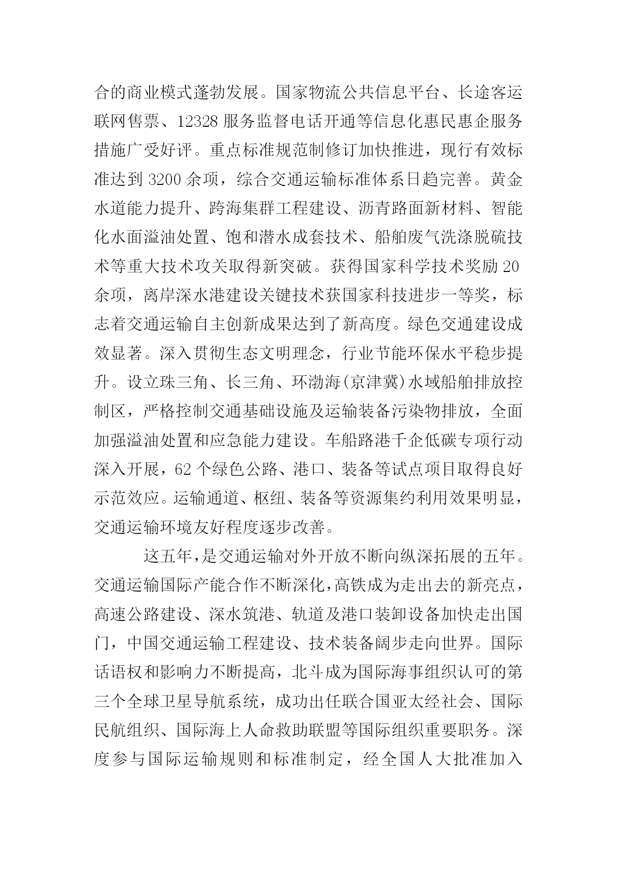 交通工作会议演讲词交通工作会议演讲词篇【1】同志们:这次会议的主要任务是:全面贯彻党的和xx届三中、四中、五中全会精神,深入贯彻系列重要讲话精神,按照中央经济工作会议部署,总结xx交通运输工作,分析形势,研究十三五交通运输发展总体思路,部署20xx年重点工作,更好适应、把握、引领经济发展新常态,推进结构性改革,为全面建成小康社会当好先行。下面,我讲三个方面的问题。一、xx时期交通运输发展的回顾xx时期是我国交通运输发展进程中极不平凡的五年。在党中央、国务院正确领导下,全行业以科学发展为主题,以调整结构、转变发展方式为主线,加快四个交通建设,全力当好发展先行官,圆满完成了xx规划目标任务,实现了交通运输发展阶段由总体缓解向基本适应的重大跃升,为我国由交通大国迈向交通强国奠定了坚实基础。这五年,是交通运输发展理念不断提升、支撑发展全局作用更加凸显的五年。党中央、国务院高度重视、强化交通运输发展。、多次对交通运输工作作出重要指示批示,先行官成为引领行业发展的新旗帜,三个服务四个交通三个转变五化工程管理等发展现代交通运输业理念成为行业共识。服务国家三大战略迈出坚实的步伐,制定《落实一带一路战略规划实施方案》,出台了加快交通基础设施互联互通、促进国际运输便利化、推动交通运输走出去等一系列具体措施,中欧货运班列横跨万里,成为连结欧亚大陆的贸易纽带。联合国家发展改革委编制完成《京津冀协同发展交通一体化规划》,出台实施方案及政策创新意见,推出了基础设施网络化、运输市场一体化和运输服务便捷化等改革举措。会同国家发展改革委制定了《长江经济带发展规划纲要》,联合编制了《长江经济带综合立体交通走廊规划》,大力推进长江经济带综合立体交通走廊建设进程。国务院发布《国家公路网规划》《物流业发展中长期规划》,出台促进铁路建设、普通公路、民航业、快递业健康发展等意见,海运强国公交优先等上升为国家战略,交通运输在国民经济和社会发展全局中的地位进一步提升。这五年,是综合交通运输改革和法治建设取得重大进展的五年。在国家层面建立综合交通运输管理体制,综合交通运输改革向前迈进一大步。直属海事系统政事分开,行政机构全面纳入公务员管理。公路建设养护、长江航运、界河航道、救助打捞、武警交通等体制改革稳步推进,交通运输综合改革、区域港口一体化、综合行政执法等改革试点扎实推进。大幅减少行政事业性收费,降低港航经营服务性收费,极大激发市场活力。法治政府部门建设不断深化。《航道法》《邮政法(修订)》颁布施行,《铁路安全管理条例》《公路安全保护条例》《国内水路运输管理条例》等完成制修订,新出台部门规章92件,综合交通运输法规体系框架基本形成。建立管理权力清单制度,事中事后监管能力不断提升,行政审批一个窗口建设取得积极成效,交通运输简政放权、放管结合、优化服务取得积极进展。基层执法三基三化和执法形象四统一建设取得积极进展,海事、交通公安、救捞三化建设全面推进,40多万执法队伍成为行业治理的重要力量,行政执法体制改革和队伍建设取得丰硕成果。这五年,是综合交通基础设施网络加快形成的五年。xx期,完成交通固定资产投资超过12.5万亿元,是xx期的1.6倍,再创历史新高,为稳增长、扩内需作出了积极贡献。五纵五横综合运输大通道基本贯通,综合交通网络初步形成,综合枢纽建设明显加快,各种运输方式衔接效率显著提升。铁路网络规模扩大,全国铁路营业总里程达12万公里,快速铁路4.2万公里,高速铁路1.9万公里。公路网络不断延伸,全国公路通车总里程达457万公里,高速公路里程突破12万公里,7918国高网基本建成,农村公路里程突破397万公里,西部地区81%的建制村实现通畅,国省干线公路技术等级逐步提升,全国96%的县城实现二级及以上等级公路连通,公路养护管理水平持续提升。水运基础设施网络布局更加合理,沿海港口万吨级以上泊位超过2100个,五年新增500个,总通过能力达79亿吨,其中集装箱1.88亿TEU,港口大型化、专业化、现代化水平进一步提升。两横一纵两网十八线内河航道建设取得积极进展,内河高等级航道达标里程1.36万公里。机场布局不断完善,全国民航运输机场达214个,新增39个,北京新机场等枢纽机场开工建设,郑州、武汉、重庆等干线机场改扩建加快,建成14个、新建7个支线机场,通勤和其他通用机场加快发展。邮政网点密度明显提高,完成8840个空白乡镇邮政局所补建,实现乡乡设所,全国网点总数达到5.3万处,快递营业网点达14.5万处,重点快递企业乡镇网点覆盖率达70%。交通扶贫脱贫成绩斐然,五年投入车购税资金5500亿元,集中连片特困地区92%的县城通二级及以上公路、86.5%的建制村实现通畅,和国务院扶贫办共同实施了309个溜索改桥项目,交通扶贫正在改变着亿万群众的生活