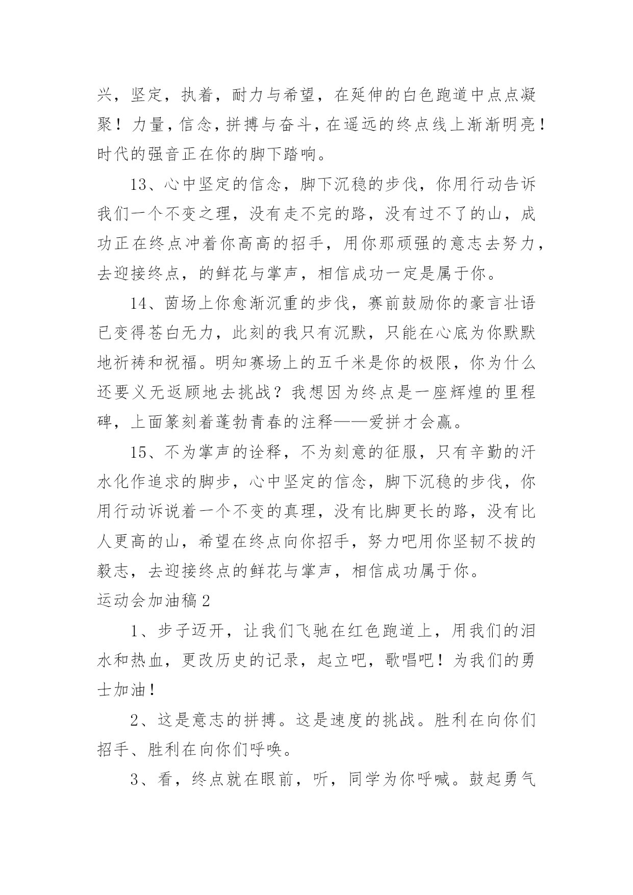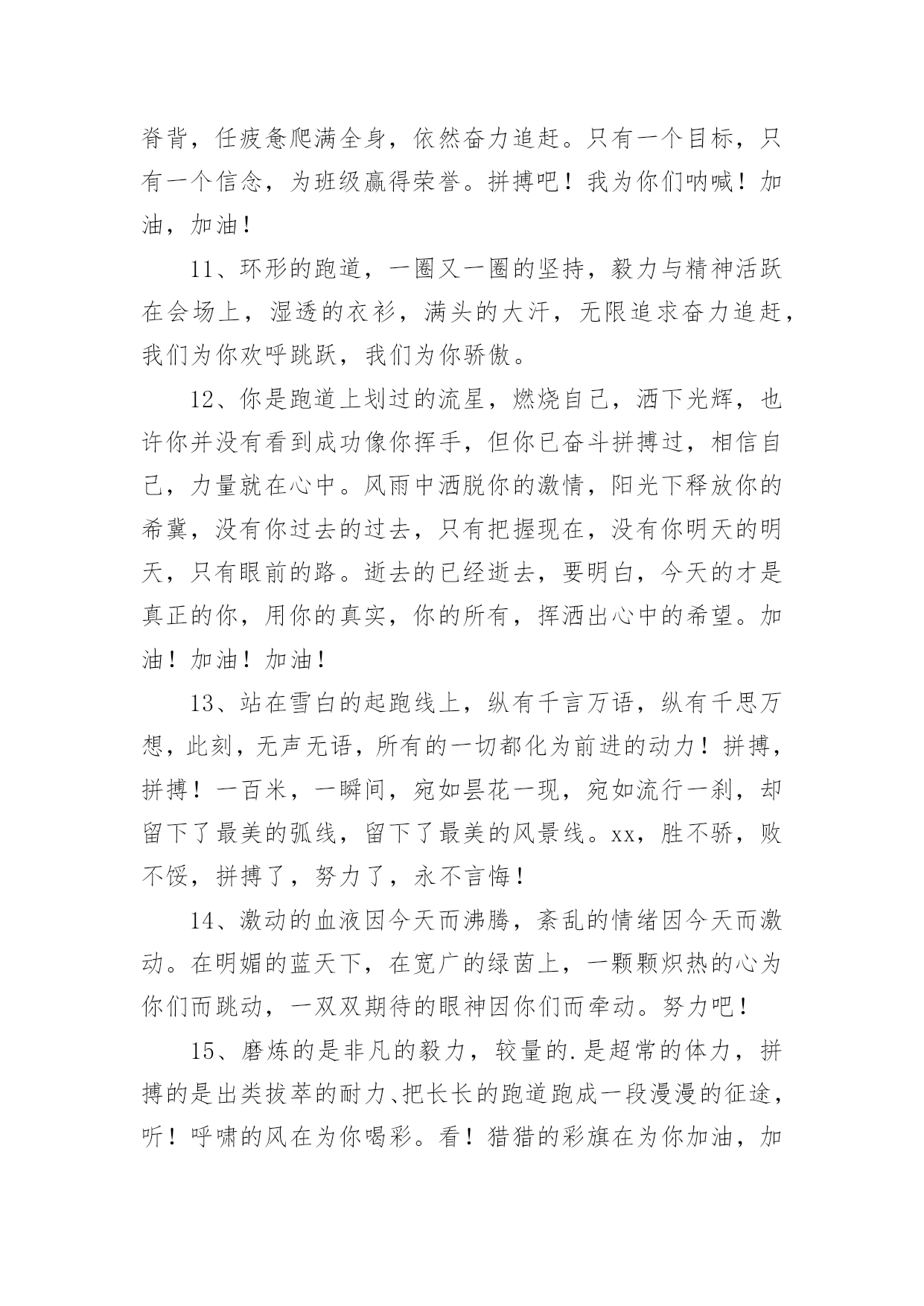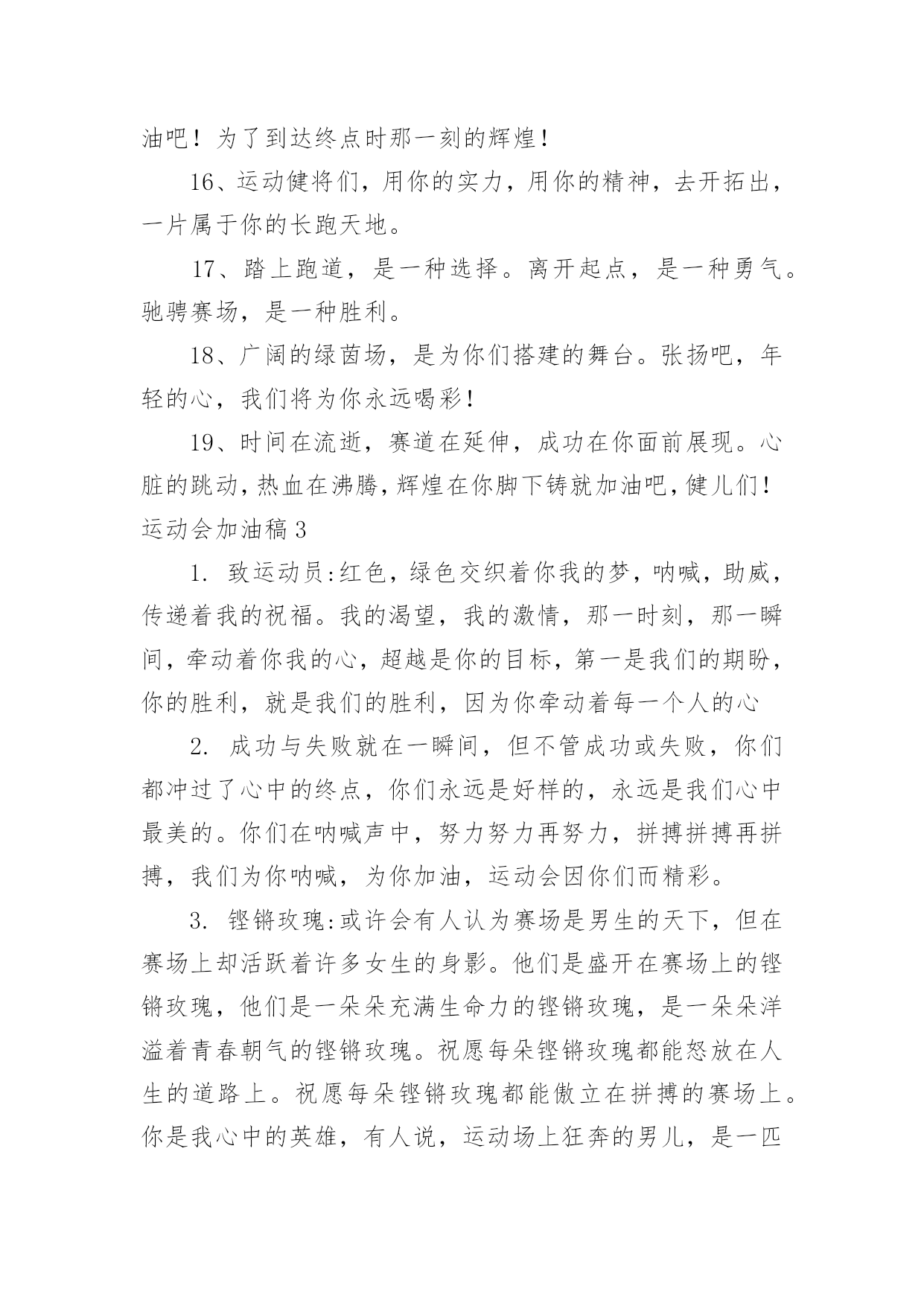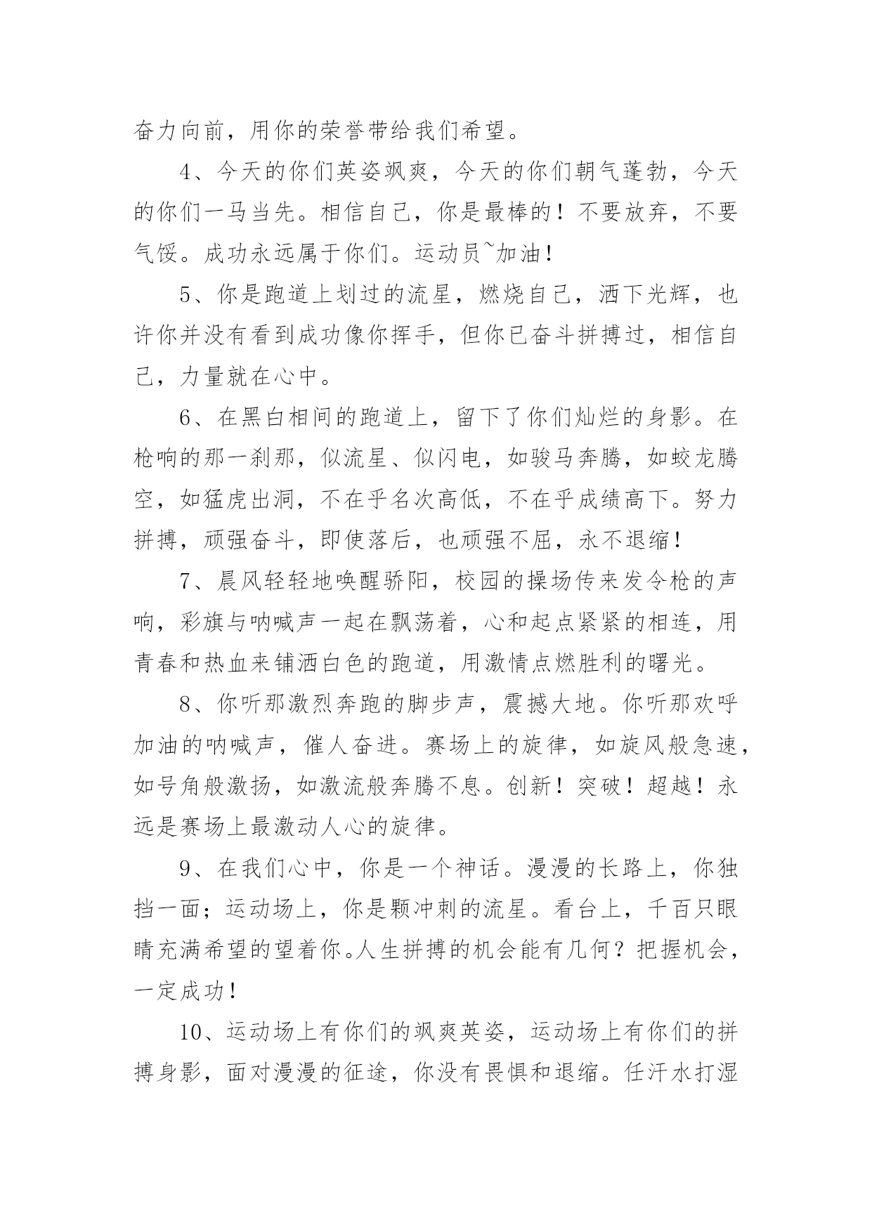 运动会加油稿(热)运动会加油稿15篇在我们平凡的日常里,用到加油稿的地方越来越多,加油稿可以激励对方更好地参加活动。那么加油稿一般是怎么写的呢?以下是小编整理的运动会加油稿,仅供参考,希望能够帮助到大家。运动会加油稿11、你脑中,有一个梦。要用努力为学校增添荣誉。茵茵运动场,谁是真的英雄?努力拼搏的你带给我们太多感动。忘记了累,也忘记_了痛,背起期望中的终点。用我们的呐喊唤起你的动力,祝福每个运动员都赛出成绩。把握竞赛中的每一秒钟,和全体同学共同努力。不经历拼搏,怎么见彩虹。没有谁能随随便便成功。努力吧,健儿们,拼搏吧,勇士们!2、运动会比赛的体育项目训练接近尾声。在第一,第二运动场上依然弥漫着浓浓的挑战与竞争气氛。望着他们依然有条不紊地继续坚持训练,心中莫名其妙地产生了对他们深深的钦佩:他们已经在精神上战胜了自我。在最后等待他们的是挑战自己的极限。3、运动场上有你们的飒爽英姿,运动场上有你们拼搏的身影,面对漫漫的征程,你没有畏惧和退缩,任汗水打湿脊背,任疲惫爬满全身,依然奋力追赶,只有一个目标,只有一个信念,为班级赢得荣誉,拼搏吧,我为你们呐喊,加油!4、在我们的花样年华中,你们磨砺锻造了自己,就是全世界的;你们不畏强敌,展示了自己,就是最勇敢最有魄力的!人不是为了失败而生,但也不是为了成功而存活,只要你有一颗不断进取的心,你就是秀的。5、拼搏者,你是赛场上最亮的点。在你的眼中,不在乎胜利的欢乐和失败的眼泪,完全只是为了展示生命跳跃的节拍。拼搏者,你是生命乐章中最响的音符。在你的心中,只有不停拼搏的信念,用自己坚实的步伐去迈开人生新的.旅程。场上的拼搏者,你是我们永远的骄傲!6、我只愿做一片落叶,去点缀金黄的秋天,我只愿做一颗恒星,去装饰耀眼的星河,我只愿做一棵,去充实五彩的世界,我只愿坐在场边,同你们分享喜悦,努力吧,拼搏吧,无论何时何地,都会有我在你的身边。7、几许真诚的鼓励,几句亲切的问候,几注深情的目光,几多支持与帮助,带给运动员的是信心,是勇气,是誓夺第一的决心和毅力。几句呐喊,几束鲜花,阵阵锣鼓,片片掌声,带给运动员的是满足,是感激,是成功后的喜悦和快意。谢谢你,我们的啦啦队!8、前一轮的准备已经结束,下一轮的激烈竞争已经开始。在我们的花样年华中,你们磨砺锻造了自己,就是全世界的;你们不畏强敌,展示了自己,就是最勇敢最有魄力的!人不是为了失败而生,但也不是为了成功而存活,只要你有一颗不断进取的心,你就是秀的。9、看!那一面面迎风飘舞的彩旗,是一朵朵盛开的鲜花;听!那一阵阵惊天动地的欢呼,是回响在耳边胜利的风声。运动场上的你们,是胜利的标志,运动场上的你们,是青春的赞叹。去吧!去迎接那伟大的挑战,去吧!去做一名追风的少年。10、温暖的阳光洒在赛场上,男子乙组标枪的比赛即将开始。赛场上,一道道优美的弧线将轻盈地划过天空。健儿们用手中的标枪向距离的权限发起一轮又一轮的挑战。标枪在空中轻盈的姿态,是健儿们强健的力量和熟练的技巧的结合。谁能在这场激烈的竞争中获胜?让我们拭目以待,让我们为他们呐喊、助威吧!只有将力量与技巧合二为一的人,才能获得胜利的桂冠!11、踏着春天的气息,迈着轻盈的脚步,我们迎来了心仪已久的运动会。这里就是展示自我的舞台。我们向往高山的坚忍不拔,我们渴望大海的博大/精深,还有,我们更痴迷于你们的速度激情。来吧,尽情释放你的活力。你的每一次冲刺,都叩动着我们的心弦;你的每一次跨越,都吸引着我们的视线;你的每一次起跳,都绷紧我们的神经。我们为你呐喊,我们为你自豪,我们为你疯狂。12、你是运动场的心脏,跳动梦想;你是漫长路的精神,激励辉煌;你们是将上下求索的人!风为你加油,云为你助兴,坚定,执着,耐力与希望,在延伸的白色跑道中点点凝聚!力量,信念,拼搏与奋斗,在遥远的终点线上渐渐明亮!时代的强音正在你的脚下踏响。13、心中坚定的信念,脚下沉稳的步伐,你用行动告诉我们一个不变之理,没有走不完的路,没有过不了的山,成功正在终点冲着你高高的招手,用你那顽强的意志去努力,去迎接终点,的鲜花与掌声,相信成功一定是属于你。14、茵场上你愈渐沉重的步伐,赛前鼓励你的豪言壮语已变得苍白无力,此刻的我只有沉默,只能在心底为你默默地祈祷和祝福。明知赛场上的五千米是你的极限,你为什么还要义无返顾地去挑战?我想因为终点是一座辉煌的里程碑,上面篆刻着蓬勃青春的注释——爱拼才会赢。15、不为掌声的诠释,不为刻意的征服,只有辛勤的汗水化作追求的脚步,心中坚定的信念,脚下沉稳的步伐,你用行动诉说着一个不变的真理,没有比脚更长的路,没有比人更高的山,希望在终点向你招手,努力吧用你坚韧不拔的毅志,去迎接终点的鲜花与掌声,相信成功属于你。运动会加油稿21、步子迈开,让我们飞驰在红色跑道上,用我们的泪水和热血,更改历史的记录,起立吧,歌唱吧!为