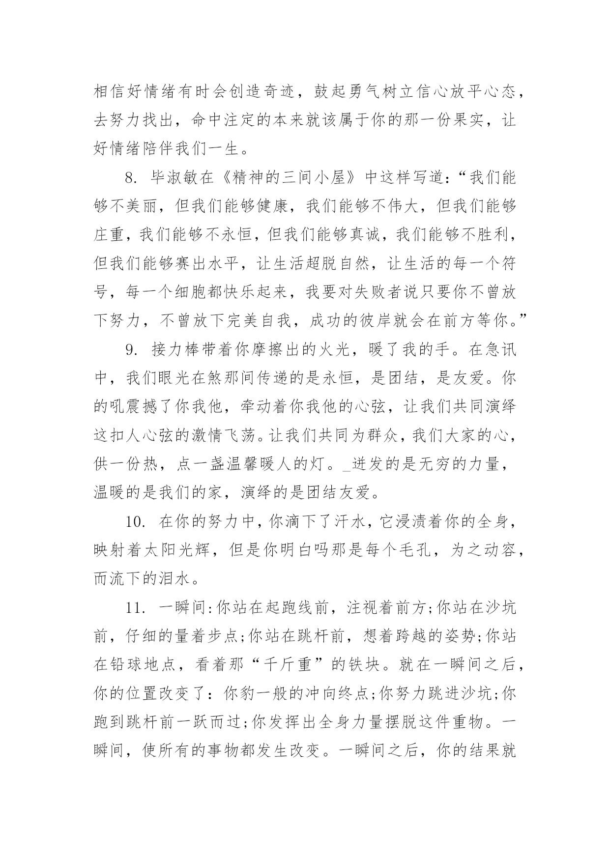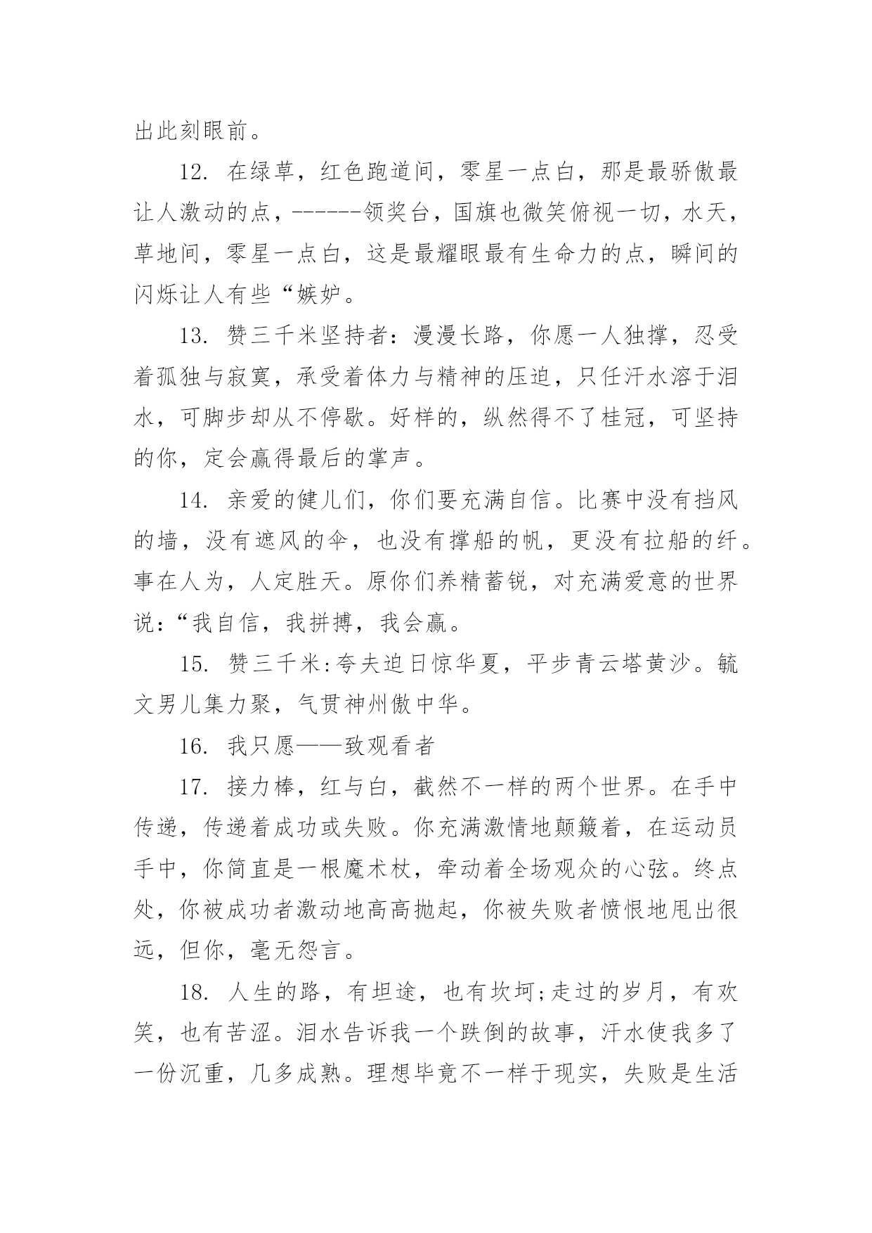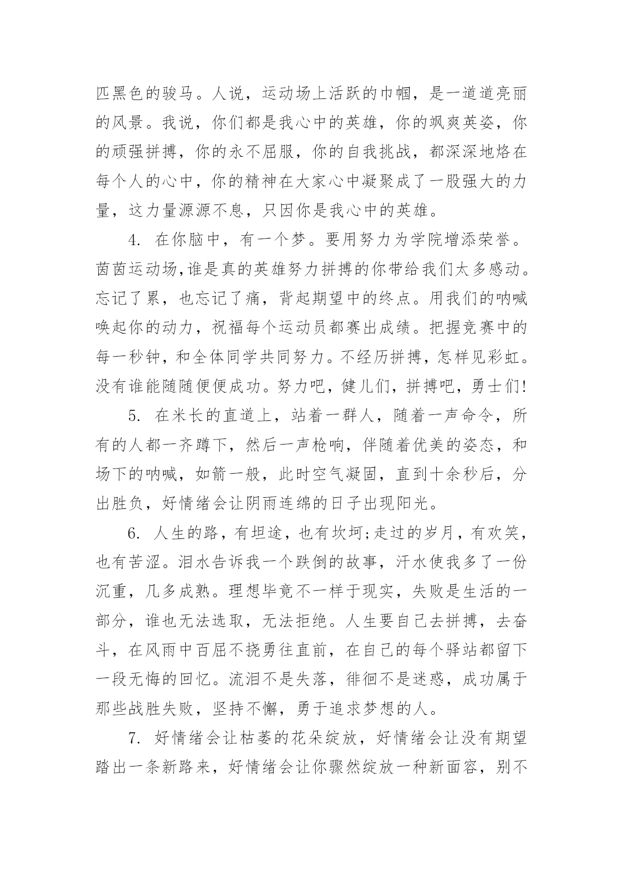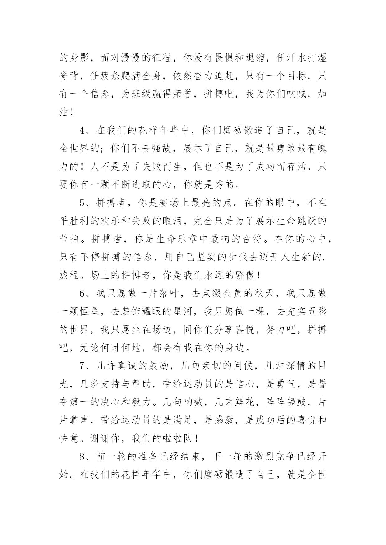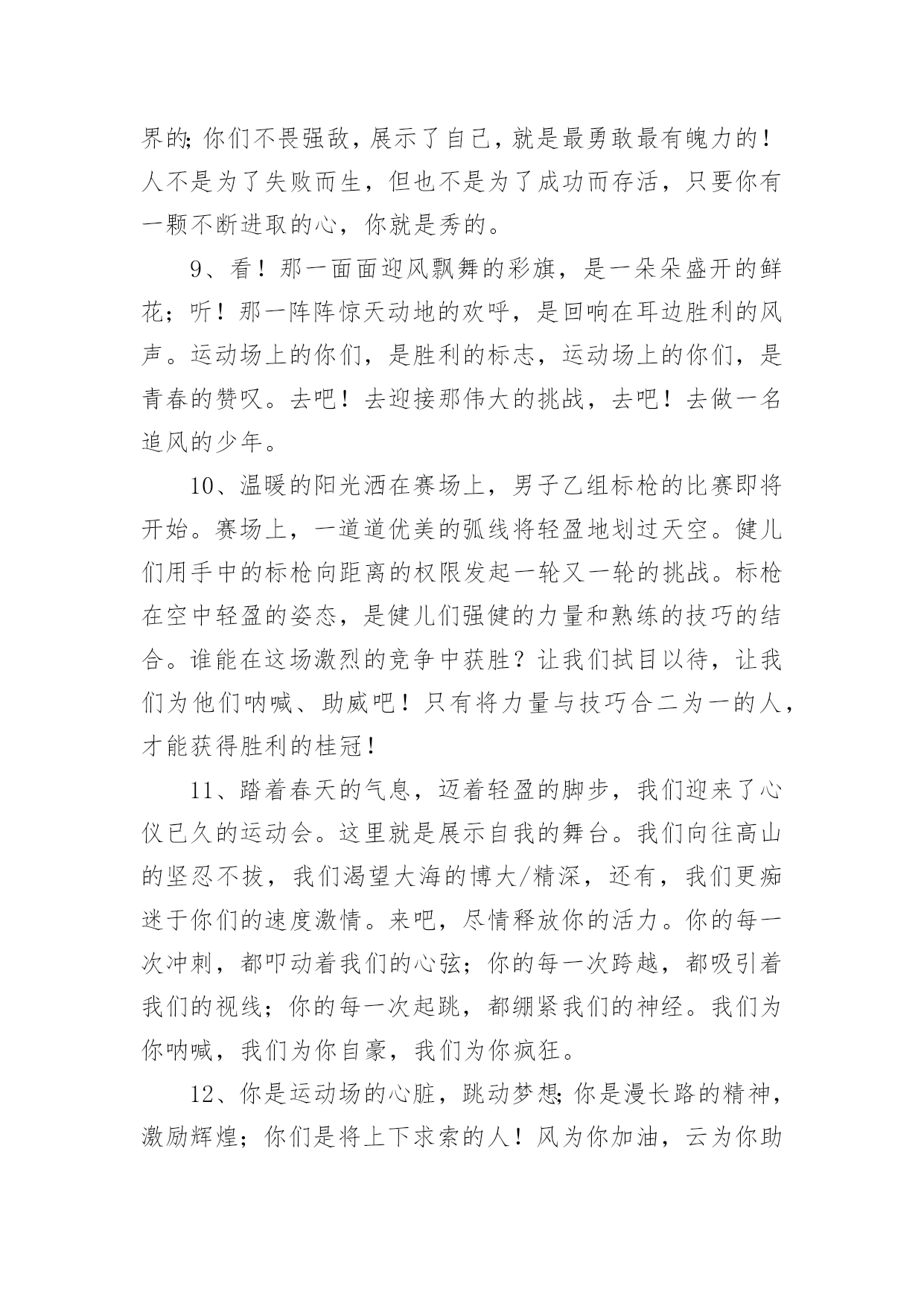运动会加油稿(热)运动会加油稿15篇在我们平凡的日常里,用到加油稿的地方越来越多,加油稿可以激励对方更好地参加活动。那么加油稿一般是怎么写的呢?以下是小编整理的运动会加油稿,仅供参考,希望能够帮助到大家。运动会加油稿11、你脑中,有一个梦。要用努力为学校增添荣誉。茵茵运动场,谁是真的英雄?努力拼搏的你带给我们太多感动。忘记了累,也忘记_了痛,背起期望中的终点。用我们的呐喊唤起你的动力,祝福每个运动员都赛出成绩。把握竞赛中的每一秒钟,和全体同学共同努力。不经历拼搏,怎么见彩虹。没有谁能随随便便成功。努力吧,健儿们,拼搏吧,勇士们!2、运动会比赛的体育项目训练接近尾声。在第一,第二运动场上依然弥漫着浓浓的挑战与竞争气氛。望着他们依然有条不紊地继续坚持训练,心中莫名其妙地产生了对他们深深的钦佩:他们已经在精神上战胜了自我。在最后等待他们的是挑战自己的极限。3、运动场上有你们的飒爽英姿,运动场上有你们拼搏的身影,面对漫漫的征程,你没有畏惧和退缩,任汗水打湿脊背,任疲惫爬满全身,依然奋力追赶,只有一个目标,只有一个信念,为班级赢得荣誉,拼搏吧,我为你们呐喊,加油!4、在我们的花样年华中,你们磨砺锻造了自己,就是全世界的;你们不畏强敌,展示了自己,就是最勇敢最有魄力的!人不是为了失败而生,但也不是为了成功而存活,只要你有一颗不断进取的心,你就是秀的。5、拼搏者,你是赛场上最亮的点。在你的眼中,不在乎胜利的欢乐和失败的眼泪,完全只是为了展示生命跳跃的节拍。拼搏者,你是生命乐章中最响的音符。在你的心中,只有不停拼搏的信念,用自己坚实的步伐去迈开人生新的.旅程。场上的拼搏者,你是我们永远的骄傲!6、我只愿做一片落叶,去点缀金黄的秋天,我只愿做一颗恒星,去装饰耀眼的星河,我只愿做一棵,去充实五彩的世界,我只愿坐在场边,同你们分享喜悦,努力吧,拼搏吧,无论何时何地,都会有我在你的身边。7、几许真诚的鼓励,几句亲切的问候,几注深情的目光,几多支持与帮助,带给运动员的是信心,是勇气,是誓夺第一的决心和毅力。几句呐喊,几束鲜花,阵阵锣鼓,片片掌声,带给运动员的是满足,是感激,是成功后的喜悦和快意。谢谢你,我们的啦啦队!8、前一轮的准备已经结束,下一轮的激烈竞争已经开始。在我们的花样年华中,你们磨砺锻造了自己,就是全世界的;你们不畏强敌,展示了自己,就是最勇敢最有魄力的!人不是为了失败而生,但也不是为了成功而存活,只要你有一颗不断进取的心,你就是秀的。9、看!那一面面迎风飘舞的彩旗,是一朵朵盛开的鲜花;听!那一阵阵惊天动地的欢呼,是回响在耳边胜利的风声。运动场上的你们,是胜利的标志,运动场上的你们,是青春的赞叹。去吧!去迎接那伟大的挑战,去吧!去做一名追风的少年。10、温暖的阳光洒在赛场上,男子乙组标枪的比赛即将开始。赛场上,一道道优美的弧线将轻盈地划过天空。健儿们用手中的标枪向距离的权限发起一轮又一轮的挑战。标枪在空中轻盈的姿态,是健儿们强健的力量和熟练的技巧的结合。谁能在这场激烈的竞争中获胜?让我们拭目以待,让我们为他们呐喊、助威吧!只有将力量与技巧合二为一的人,才能获得胜利的桂冠!11、踏着春天的气息,迈着轻盈的脚步,我们迎来了心仪已久的运动会。这里就是展示自我的舞台。我们向往高山的坚忍不拔,我们渴望大海的博大/精深,还有,我们更痴迷于你们的速度激情。来吧,尽情释放你的活力。你的每一次冲刺,都叩动着我们的心弦;你的每一次跨越,都吸引着我们的视线;你的每一次起跳,都绷紧我们的神经。我们为你呐喊,我们为你自豪,我们为你疯狂。12、你是运动场的心脏,跳动梦想;你是漫长路的精神,激励辉煌;你们是将上下求索的人!风为你加油,云为你助兴,坚定,执着,耐力与希望,在延伸的白色跑道中点点凝聚!力量,信念,拼搏与奋斗,在遥远的终点线上渐渐明亮!时代的强音正在你的脚下踏响。13、心中坚定的信念,脚下沉稳的步伐,你用行动告诉我们一个不变之理,没有走不完的路,没有过不了的山,成功正在终点冲着你高高的招手,用你那顽强的意志去努力,去迎接终点,的鲜花与掌声,相信成功一定是属于你。14、茵场上你愈渐沉重的步伐,赛前鼓励你的豪言壮语已变得苍白无力,此刻的我只有沉默,只能在心底为你默默地祈祷和祝福。明知赛场上的五千米是你的极限,你为什么还要义无返顾地去挑战?我想因为终点是一座辉煌的里程碑,上面篆刻着蓬勃青春的注释——爱拼才会赢。15、不为掌声的诠释,不为刻意的征服,只有辛勤的汗水化作追求的脚步,心中坚定的信念,脚下沉稳的步伐,你用行动诉说着一个不变的真理,没有比脚更长的路,没有比人更高的山,希望在终点向你招手,努力吧用你坚韧不拔的毅志,去迎接终点的鲜花与掌声,相信成功属于你。运动会加油稿21、步子迈开,让我们飞驰在红色跑道上,用我们的泪水和热血,更改历史的记录,起立吧,歌唱吧!为