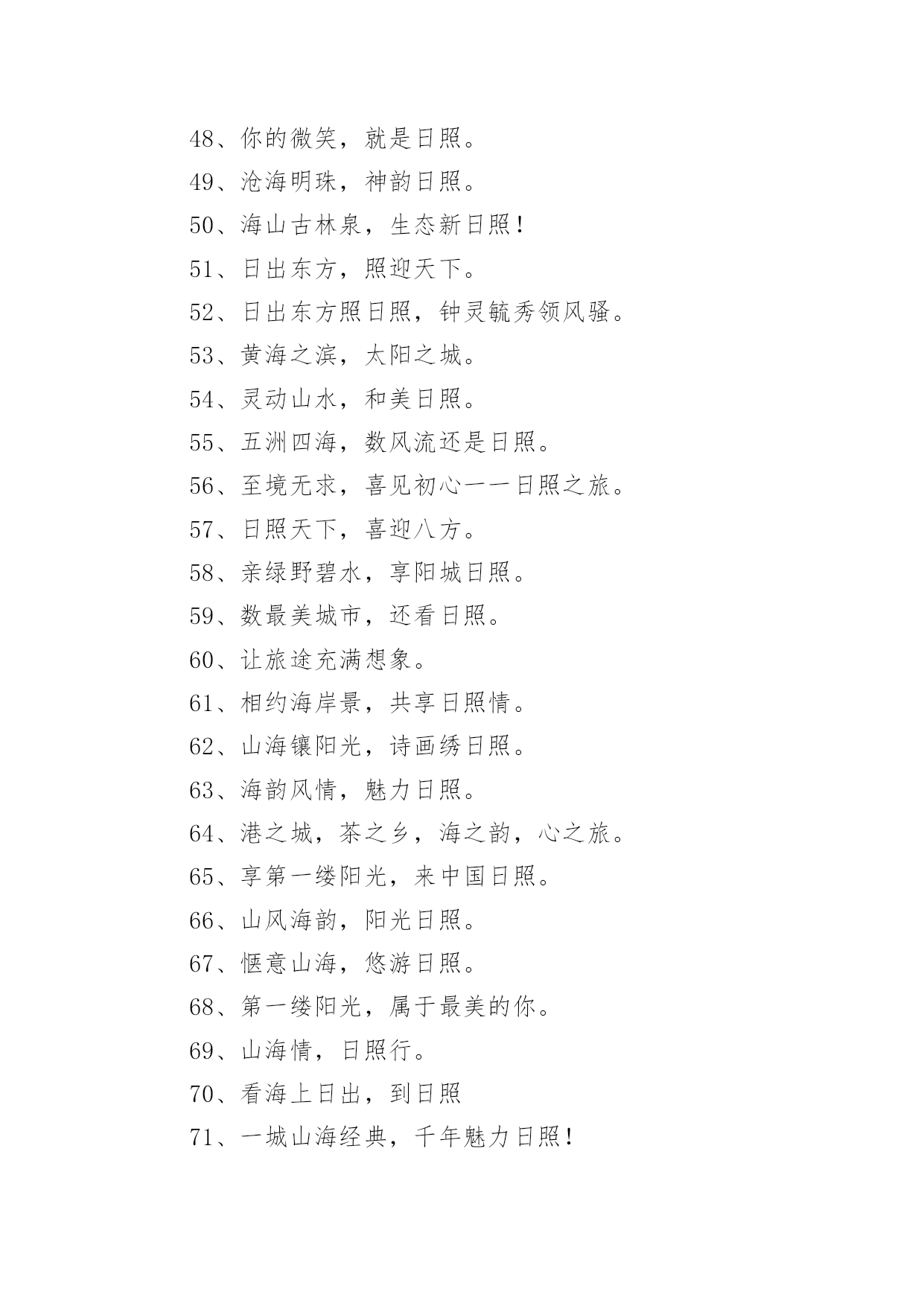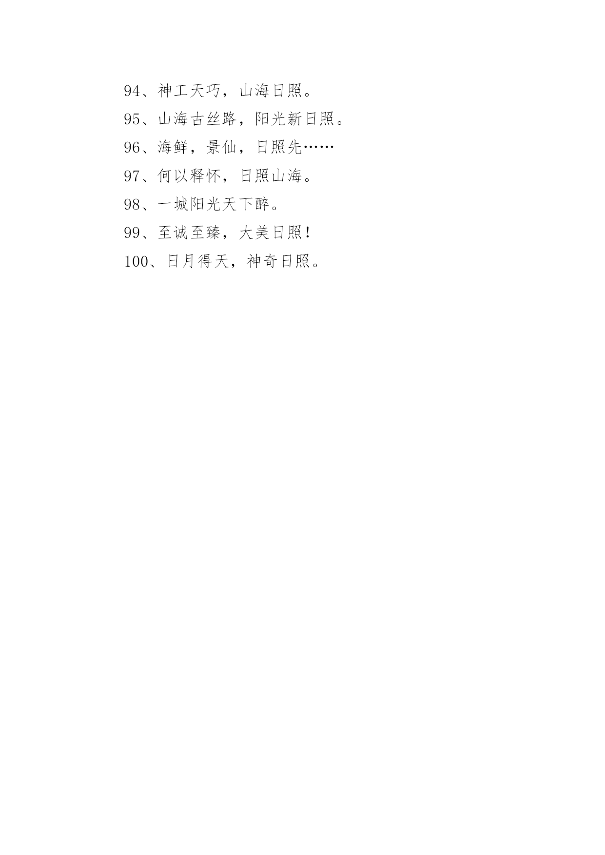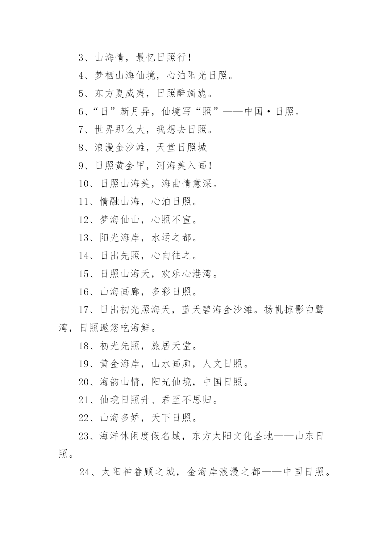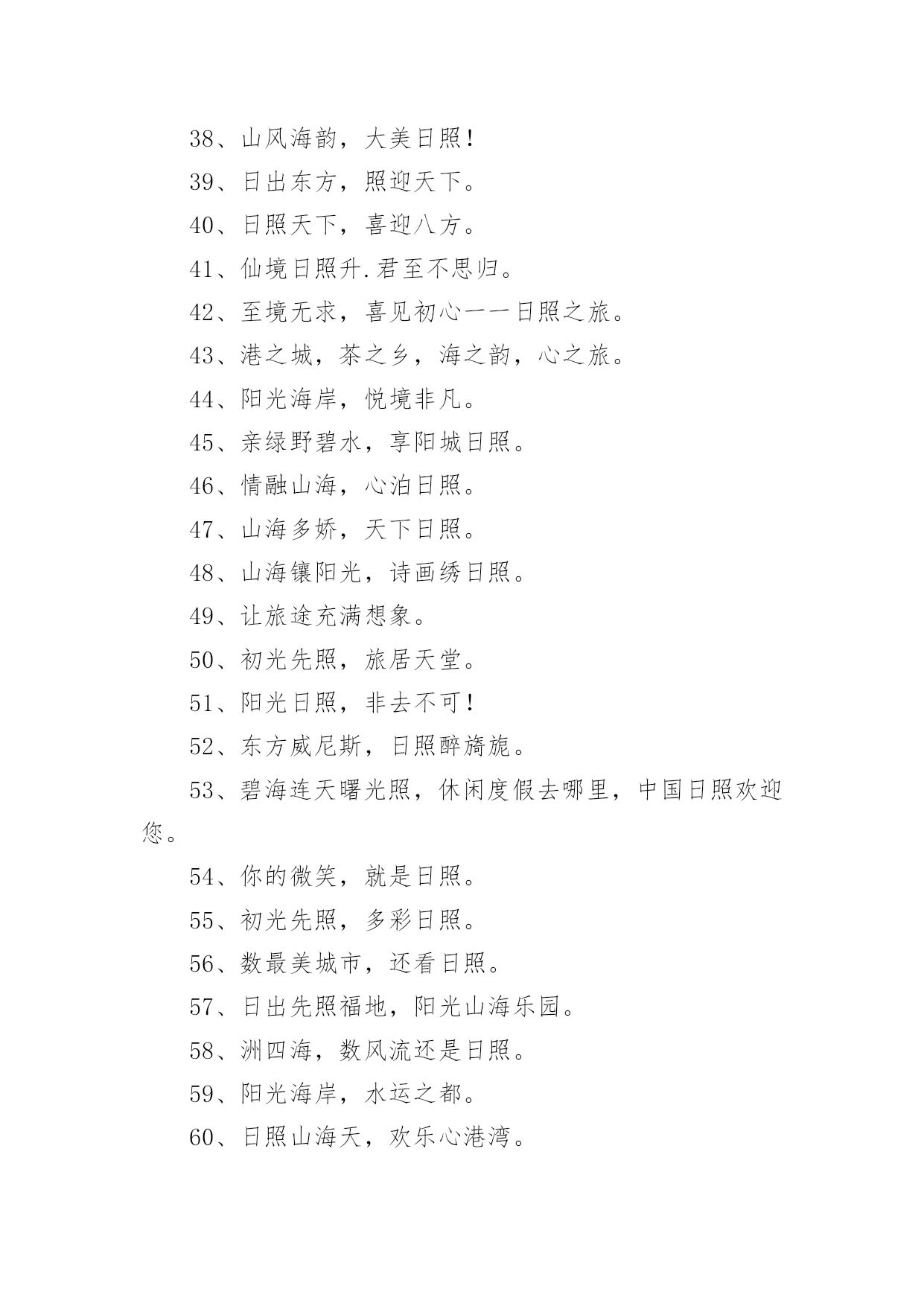 日照旅游主题口号在学习、工作乃至生活中,大家都不可避免地会接触到口号吧,通过口号可以增加团队凝聚力,起到事半功倍的效果。那么你有真正了解过口号吗?以下是小编为大家收集的日照旅游主题口号,供大家参考借鉴,希望可以帮助到有需要的朋友。日照旅游主题口号11、梦海仙山,心照不宣。2、沧海明珠,神韵日照。3、小城风情多,日照山水秀。4、世界那么大,我想去日照。5、浪漫金沙滩,天堂日照城6、海圣境,东溯日照。7、海山古林泉,生态新日照!8、日出东方,“伊人”相伴,此心安处是吾乡。9、天下瑰宝,山海日照。10、山海情,最忆日照行!11、海洋休闲度假名城,东方太阳文化圣地——山东日照。12、相约海岸景,共享日照情。13、灵动山水,和美日照。14、阳光海岸,旅居天堂。15、山海仙境,阳光日照。16、黄海之滨,太阳之城。17、日出初光照海天,蓝天碧海金沙滩。扬帆掠影白鹭湾,日照邀您吃海鲜。18、海上生红日,天涯共此时——日照。19、黄金海岸,山水画廊,人文日照。20、山水梦幻,日照无眠。21、日照黄金甲,河海美入画!22、日出先照,山海日照。23、海韵山情,阳光仙境,中国日照。24、太阳神眷顾之城,金海岸浪漫之都——中国日照。25、海韵风情,魅力日照。26、山海画廊,多彩日照。27、“日”新月异,仙境写“照”28、相约日照,天缘美妙。29、海韵港城,茶香日照。30、日照山海美,海曲情意深。31、日照河山,黄金海岸,大美日照。32、东方夏威夷,日照醉旖旎。33、仙境海岸,日光先照。34、梦栖山海仙境,心泊阳光日照。35、日出东方照日照,钟灵毓秀领风骚。36、好客山东,热情日照。37、日出先照,心向往之。38、山风海韵,大美日照!39、日出东方,照迎天下。40、日照天下,喜迎八方。41、仙境日照升.君至不思归。42、至境无求,喜见初心一一日照之旅。43、港之城,茶之乡,海之韵,心之旅。44、阳光海岸,悦境非凡。45、亲绿野碧水,享阳城日照。46、情融山海,心泊日照。47、山海多娇,天下日照。48、山海镶阳光,诗画绣日照。49、让旅途充满想象。50、初光先照,旅居天堂。51、阳光日照,非去不可!52、东方威尼斯,日照醉旖旎。53、碧海连天曙光照,休闲度假去哪里,中国日照欢迎您。54、你的微笑,就是日照。55、初光先照,多彩日照。56、数最美城市,还看日照。57、日出先照福地,阳光山海乐园。58、洲四海,数风流还是日照。59、阳光海岸,水运之都。60、日照山海天,欢乐心港湾。日照旅游主题口号21、一次海情,一生日照客。作者:卢沛2、太阳有约,日照有请。作者:卢金水3、山海日照点睛,风情原始画境。作者:李勇4、好客山东,暖暖日照。作者:杨世5、一海阳光,自在日照。作者:吉良新6、日照,谁都需要!作者:张天雪7、爱上日照,只需一个照面!作者:薛峰8、缤纷海岸,多彩海岸,惊艳海岸,阳光海岸。作者:倪祥建9、给日照一次注视,还世界一个惊喜!作者:戴秀珍10、在天地行走,为日照停留。作者:于联均11、太阳有约,日照有请。作者:卢金水12、爱在山海间,梦在日照恋。作者:李勇13、齐鲁封面山海请柬。作者:张淑芳14、山水不须墨,日照不虚行。作者:胡瑛15、来日照,自然心“晴”。作者:曾洁16、日照,“海”起来!作者:卢金水17、梦栖黄金海岸,心泊阳光日照。卢沛18、百里海岸,一城阳光日照旅游欢迎您。作者:肖艳玲19、来日照,沐浴第一缕阳光。作者:丁玲20、太阳文化圣地,东方丝路起点。作者:肖艳玲21、梦寻最美日出情醉日照山海。作者:安佰明22、千年陶文古遗址,生态魅力新日照。作者:张斌23、在天地行走,为日照停留。作者:于联均24、醉美日照游,十步九回头。作者:邓四平25、日照,阳光初恋的地方。作者:胡然26、天生(或赐)日照,地孕山海。作者:郑国栋27、走近(慢游、走进)日照,让心停靠。作者:陈国祥28、一品山海,醉美日照。作者:庄乾江29、一次海情,一生日照客。作者:卢沛30、海天未老,天下日照。作者:宋若生31、山海日照点睛,风情原始画境。作者:李勇32、一海阳光,自在日照。作者:吉良新33、好客山东,热情日照黄金海岸欢迎您。作者:倪祥建34、好客山东,暖暖日照。作者:杨世35、来日照,晒幸福。作者:刘乐锋36、逐梦阳光,赶海日照!作者:王玉婷37、把美晒在网上把爱秀给日照。作者:常金龙38、日照无双地,阳光第一缕。作者:陈桂兰日照旅游主题口号31、仙境海岸,清新非凡。2、东方威尼斯,日照醉旖旎。3、山海情,最忆日照行!4、梦栖山海仙境,心泊阳光日照。5、东方夏威夷,日照醉旖旎。6、“日”新月异,仙境写“照”——中国·日照。7、世界那么大,我想去日照。8、浪漫金沙滩,天堂日照城9、日照黄金甲,河海美入画!10、日照山海美,海曲情意深。11、情融山海,心泊日照