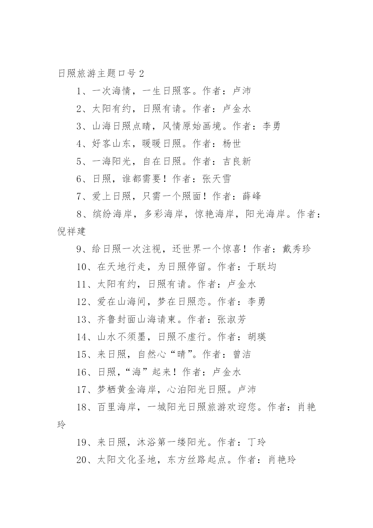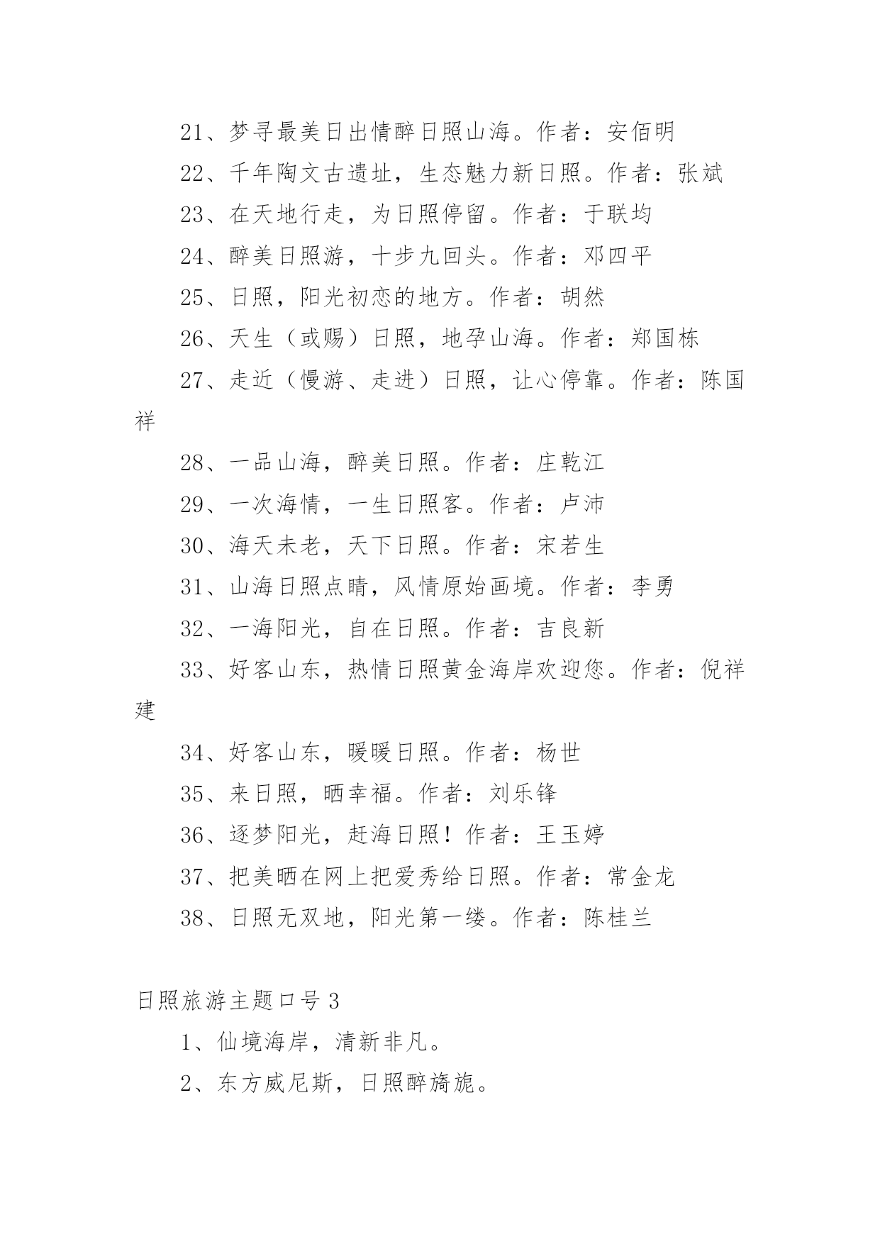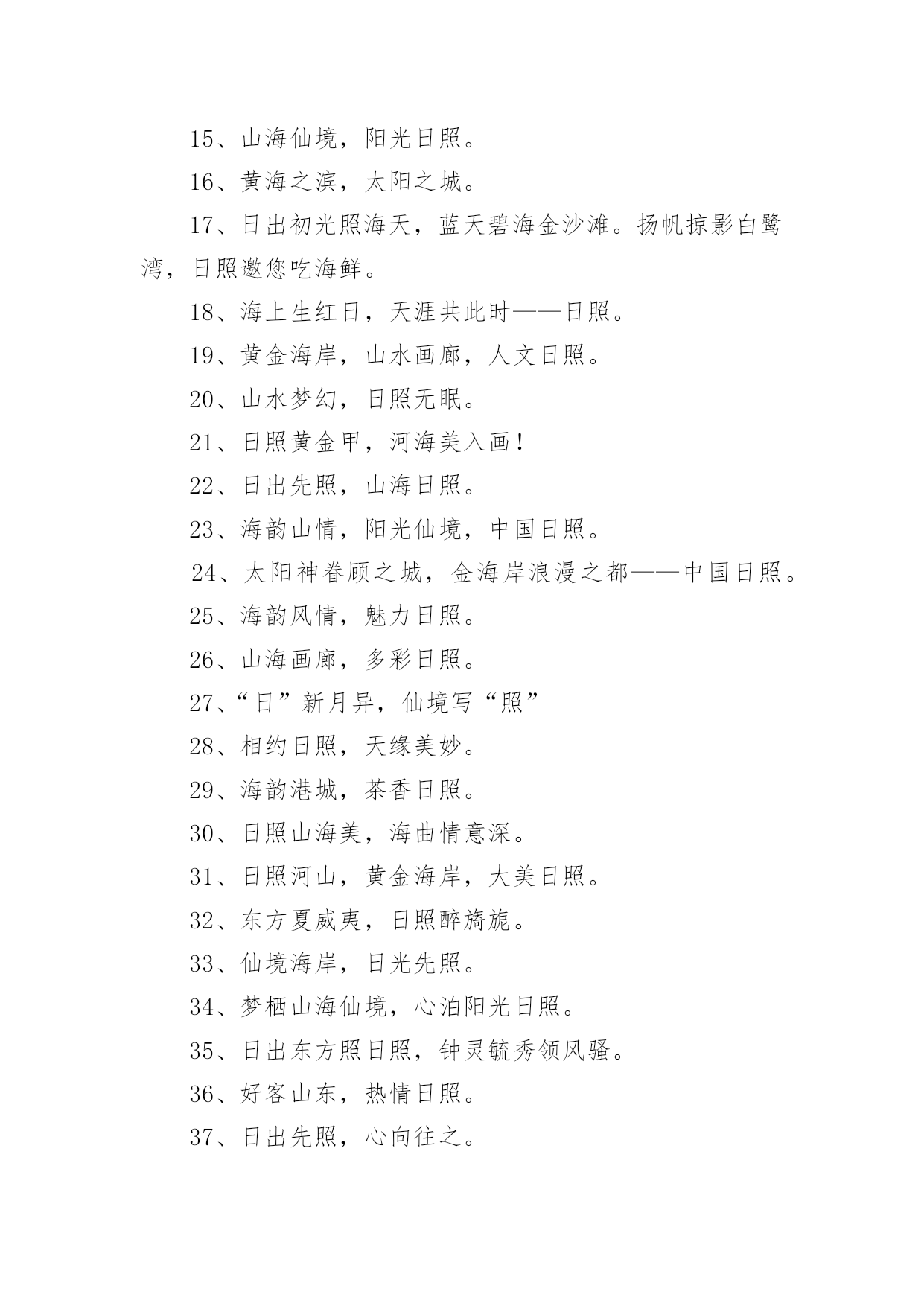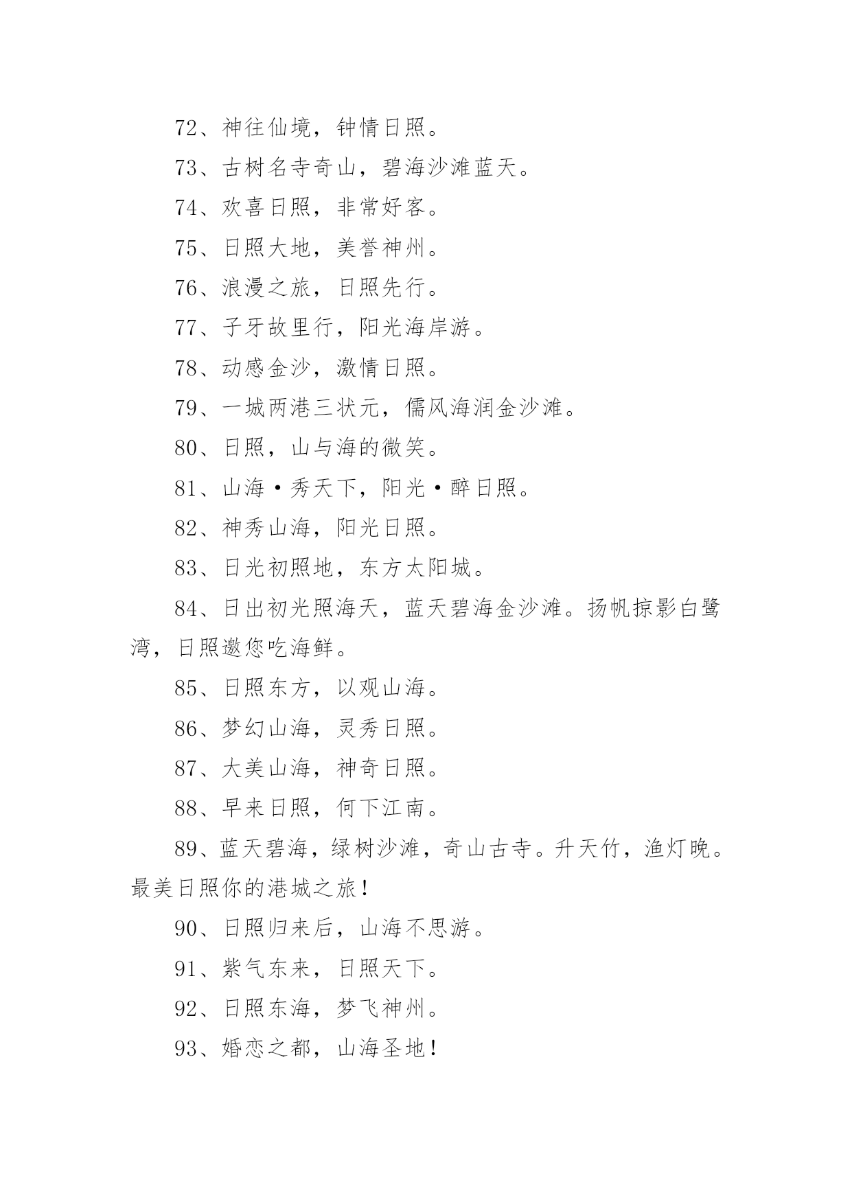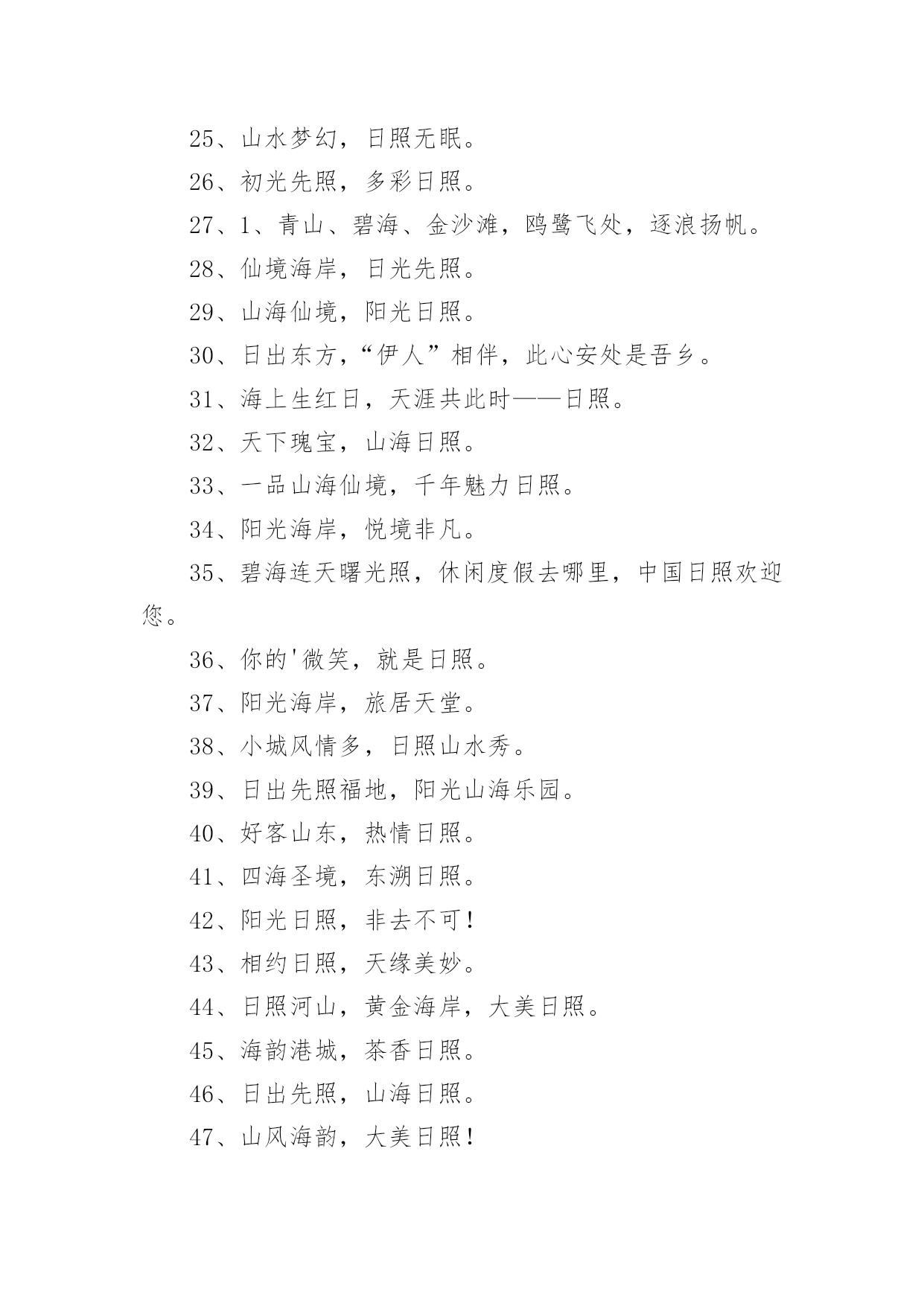 日照旅游主题口号在学习、工作乃至生活中,大家都不可避免地会接触到口号吧,通过口号可以增加团队凝聚力,起到事半功倍的效果。那么你有真正了解过口号吗?以下是小编为大家收集的日照旅游主题口号,供大家参考借鉴,希望可以帮助到有需要的朋友。日照旅游主题口号11、梦海仙山,心照不宣。2、沧海明珠,神韵日照。3、小城风情多,日照山水秀。4、世界那么大,我想去日照。5、浪漫金沙滩,天堂日照城6、海圣境,东溯日照。7、海山古林泉,生态新日照!8、日出东方,“伊人”相伴,此心安处是吾乡。9、天下瑰宝,山海日照。10、山海情,最忆日照行!11、海洋休闲度假名城,东方太阳文化圣地——山东日照。12、相约海岸景,共享日照情。13、灵动山水,和美日照。14、阳光海岸,旅居天堂。15、山海仙境,阳光日照。16、黄海之滨,太阳之城。17、日出初光照海天,蓝天碧海金沙滩。扬帆掠影白鹭湾,日照邀您吃海鲜。18、海上生红日,天涯共此时——日照。19、黄金海岸,山水画廊,人文日照。20、山水梦幻,日照无眠。21、日照黄金甲,河海美入画!22、日出先照,山海日照。23、海韵山情,阳光仙境,中国日照。24、太阳神眷顾之城,金海岸浪漫之都——中国日照。25、海韵风情,魅力日照。26、山海画廊,多彩日照。27、“日”新月异,仙境写“照”28、相约日照,天缘美妙。29、海韵港城,茶香日照。30、日照山海美,海曲情意深。31、日照河山,黄金海岸,大美日照。32、东方夏威夷,日照醉旖旎。33、仙境海岸,日光先照。34、梦栖山海仙境,心泊阳光日照。35、日出东方照日照,钟灵毓秀领风骚。36、好客山东,热情日照。37、日出先照,心向往之。38、山风海韵,大美日照!39、日出东方,照迎天下。40、日照天下,喜迎八方。41、仙境日照升.君至不思归。42、至境无求,喜见初心一一日照之旅。43、港之城,茶之乡,海之韵,心之旅。44、阳光海岸,悦境非凡。45、亲绿野碧水,享阳城日照。46、情融山海,心泊日照。47、山海多娇,天下日照。48、山海镶阳光,诗画绣日照。49、让旅途充满想象。50、初光先照,旅居天堂。51、阳光日照,非去不可!52、东方威尼斯,日照醉旖旎。53、碧海连天曙光照,休闲度假去哪里,中国日照欢迎您。54、你的微笑,就是日照。55、初光先照,多彩日照。56、数最美城市,还看日照。57、日出先照福地,阳光山海乐园。58、洲四海,数风流还是日照。59、阳光海岸,水运之都。60、日照山海天,欢乐心港湾。日照旅游主题口号21、一次海情,一生日照客。作者:卢沛2、太阳有约,日照有请。作者:卢金水3、山海日照点睛,风情原始画境。作者:李勇4、好客山东,暖暖日照。作者:杨世5、一海阳光,自在日照。作者:吉良新6、日照,谁都需要!作者:张天雪7、爱上日照,只需一个照面!作者:薛峰8、缤纷海岸,多彩海岸,惊艳海岸,阳光海岸。作者:倪祥建9、给日照一次注视,还世界一个惊喜!作者:戴秀珍10、在天地行走,为日照停留。作者:于联均11、太阳有约,日照有请。作者:卢金水12、爱在山海间,梦在日照恋。作者:李勇13、齐鲁封面山海请柬。作者:张淑芳14、山水不须墨,日照不虚行。作者:胡瑛15、来日照,自然心“晴”。作者:曾洁16、日照,“海”起来!作者:卢金水17、梦栖黄金海岸,心泊阳光日照。卢沛18、百里海岸,一城阳光日照旅游欢迎您。作者:肖艳玲19、来日照,沐浴第一缕阳光。作者:丁玲20、太阳文化圣地,东方丝路起点。作者:肖艳玲21、梦寻最美日出情醉日照山海。作者:安佰明22、千年陶文古遗址,生态魅力新日照。作者:张斌23、在天地行走,为日照停留。作者:于联均24、醉美日照游,十步九回头。作者:邓四平25、日照,阳光初恋的地方。作者:胡然26、天生(或赐)日照,地孕山海。作者:郑国栋27、走近(慢游、走进)日照,让心停靠。作者:陈国祥28、一品山海,醉美日照。作者:庄乾江29、一次海情,一生日照客。作者:卢沛30、海天未老,天下日照。作者:宋若生31、山海日照点睛,风情原始画境。作者:李勇32、一海阳光,自在日照。作者:吉良新33、好客山东,热情日照黄金海岸欢迎您。作者:倪祥建34、好客山东,暖暖日照。作者:杨世35、来日照,晒幸福。作者:刘乐锋36、逐梦阳光,赶海日照!作者:王玉婷37、把美晒在网上把爱秀给日照。作者:常金龙38、日照无双地,阳光第一缕。作者:陈桂兰日照旅游主题口号31、仙境海岸,清新非凡。2、东方威尼斯,日照醉旖旎。3、山海情,最忆日照行!4、梦栖山海仙境,心泊阳光日照。5、东方夏威夷,日照醉旖旎。6、“日”新月异,仙境写“照”——中国·日照。7、世界那么大,我想去日照。8、浪漫金沙滩,天堂日照城9、日照黄金甲,河海美入画!10、日照山海美,海曲情意深。11、情融山海,心泊日照