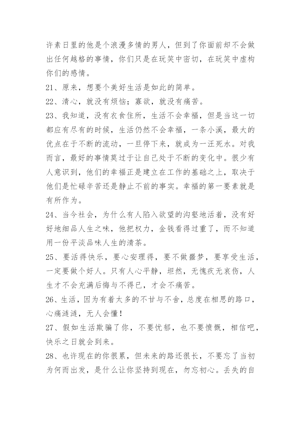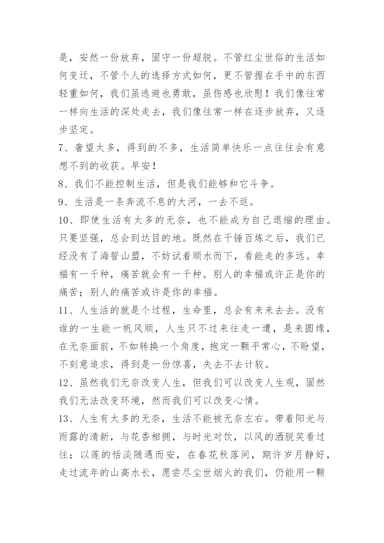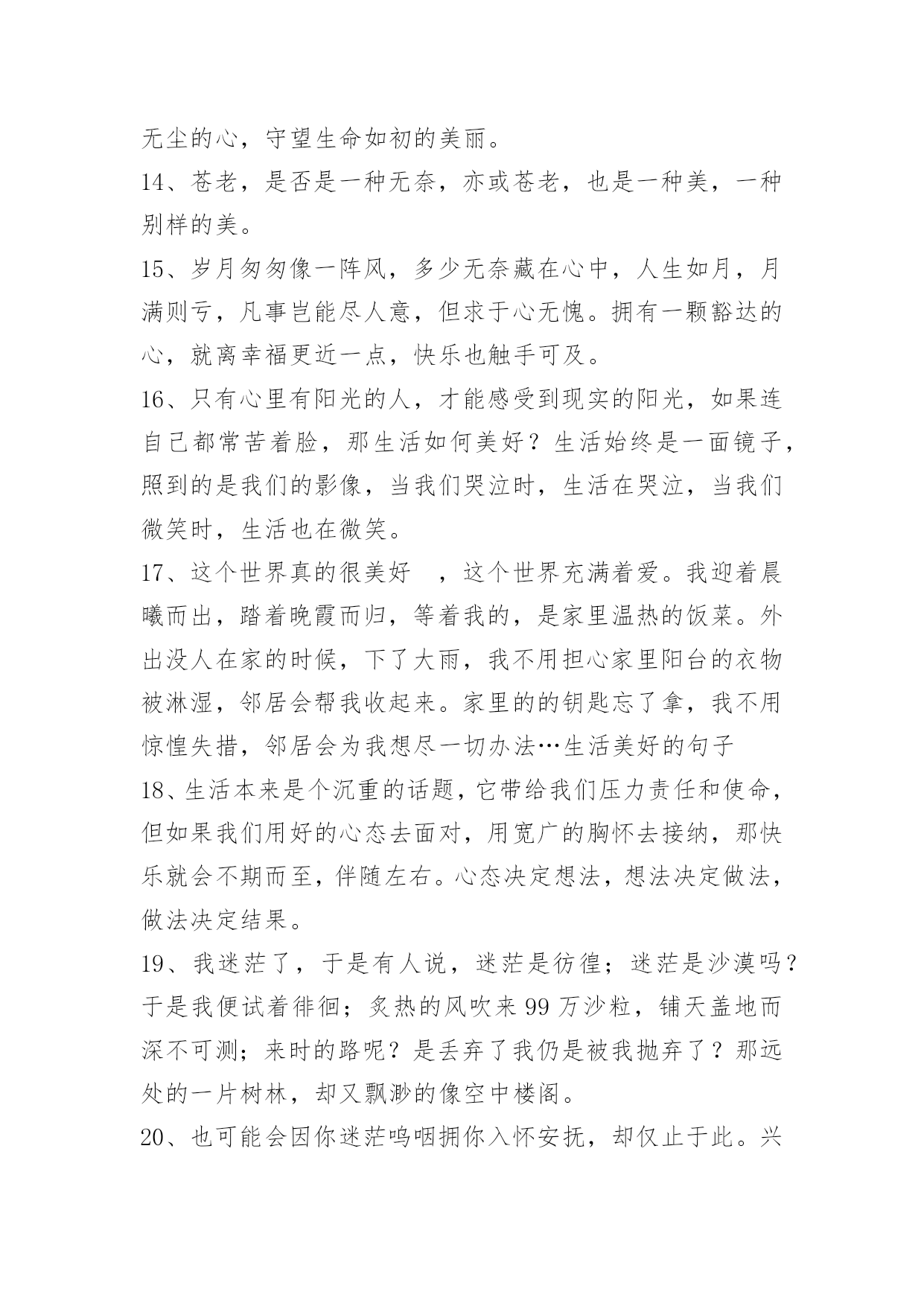 形容生活的句子经典形容生活的句子汇编31句生活是一杯水。杯子的华丽与否显示了一个人的贫与富。但杯子里的水清澈透明,无色无味,对任何人都一样。接下来,你有权利加盐加糖,只要你喜欢。以下是小编为大家准备的形容生活的句子31句,欢迎大家前来欣赏。1、简单生活才能幸福生活,人要自足常乐,宽容大度,什么事情都不能想繁杂,心灵的负荷重了,就会怨天忧人。要定期的对记忆进行一次删除,把不愉快的人和事从记忆中摈弃,人生苦短,财富地位都是附加的,生不带来死不带去,简简单单的生活,就是快快乐乐的生活。2、当你没有人可以依靠的时候,哪怕再苦,再累,再痛,都要告诉自己别放弃,要坚强。3、醉过才知酒浓,爱过才知情重;而只有体验过这种数学方法才会真切感受到生活带来的快乐、幸福。原来,想要个美好生活是如此的简单!4、那些所谓梦想的东西,被岁月打上一枚又一枚的标签。5、为了看看阳光,我们来到这世界,就让风雨当作岁月的衣裳,让心安详地徜徉,没有忧伤,没有恐惧。就算太阳会落山,那也不是结束,只是为了迎接下一个光明的到来。它,没有苦恼,没有悲哀,只为下一次向温暖的人间致意问好。追随阳光,我们的生活就会时刻充满力量。6、生命不但给了我无尽的悲哀,也给了我永远的答案。于是,安然一份放弃,固守一份超脱。不管红尘世俗的生活如何变迁,不管个人的选择方式如何,更不管握在手中的东西轻重如何,我们虽逃避也勇敢,虽伤感也欣慰!我们像往常一样向生活的深处走去,我们像往常一样在逐步放弃,又逐步坚定。7、奢望太多,得到的不多,生活简单快乐一点往往会有意想不到的收获。早安!8、我们不能控制生活,但是我们能够和它斗争。9、生活是一条奔流不息的大河,一去不返。10、即使生活有太多的无奈,也不能成为自己退缩的理由。只要坚强,总会到达目的地。既然在千锤百炼之后,我们已经没有了海誓山盟,不妨试着顺水而下,看能走的多远。幸福有一千种,痛苦就会有一千种。别人的幸福或许正是你的痛苦;别人的痛苦或许是你的幸福。11、人生活的就是个过程,生命里,总会有来来去去。没有谁的一生能一帆风顺,人生只不过来往走一遭,是来圆缘,在无奈面前,不如转换一个角度,抱定一颗平常心,不盼望,不刻意追求,得到是一份惊喜,失去不去计较。12、虽然我们无奈改变人生,但我们可以改变人生观,固然我们无法改变环境,然而我们可以改变心情。13、人生有太多的无奈,生活不能被无奈左右。带着阳光与雨露的清新,与花香相拥,与时光对饮,以风的洒脱笑看过往;以莲的恬淡随遇而安,在春花秋落间,期许岁月静好,走过流年的山高水长,愿尝尽尘世烟火的我们,仍能用一颗无尘的心,守望生命如初的美丽。14、苍老,是否是一种无奈,亦或苍老,也是一种美,一种别样的美。15、岁月匆匆像一阵风,多少无奈藏在心中,人生如月,月满则亏,凡事岂能尽人意,但求于心无愧。拥有一颗豁达的心,就离幸福更近一点,快乐也触手可及。16、只有心里有阳光的人,才能感受到现实的阳光,如果连自己都常苦着脸,那生活如何美好?生活始终是一面镜子,照到的是我们的影像,当我们哭泣时,生活在哭泣,当我们微笑时,生活也在微笑。17、这个世界真的很美好,这个世界充满着爱。我迎着晨曦而出,踏着晚霞而归,等着我的,是家里温热的饭菜。外出没人在家的时候,下了大雨,我不用担心家里阳台的衣物被淋湿,邻居会帮我收起来。家里的的钥匙忘了拿,我不用惊惶失措,邻居会为我想尽一切办法…生活美好的句子18、生活本来是个沉重的话题,它带给我们压力责任和使命,但如果我们用好的心态去面对,用宽广的胸怀去接纳,那快乐就会不期而至,伴随左右。心态决定想法,想法决定做法,做法决定结果。19、我迷茫了,于是有人说,迷茫是彷徨;迷茫是沙漠吗?于是我便试着徘徊;炙热的风吹来99万沙粒,铺天盖地而深不可测;来时的路呢?是丢弃了我仍是被我抛弃了?那远处的一片树林,却又飘渺的像空中楼阁。20、也可能会因你迷茫呜咽拥你入怀安抚,却仅止于此。兴许素日里的他是个浪漫多情的男人,但到了你面前却不会做出任何越格的事情,你们只是在玩笑中密切,在玩笑中虚构你们的感情。21、原来,想要个美好生活是如此的简单。22、清心,就没有烦恼;寡欲,就没有痛苦。23、我知道,没有衣食住所,生活不会幸福,但是当这一切都应有尽有的时候,生活仍然不会幸福,一条小溪,最大的优点在于不断的流动,一旦停下来,就成为一汪死水。对我而言,最好的事情莫过于让自己处于不断的变化中。很少有人意识到,他们的幸福正是建立在工作的基础之上,取决于他们是忙碌辛苦还是静止不前的事实。幸福的第一要素就是有所作为。24、当今社会,为什么有人陷入欲望的沟壑地活着,没有好好地细品人生之味,他把权力,金钱看得过重了,而不知道用一份平淡品味人生的清茶。25、要活得快乐,要心安理得,要不做噩梦,要享受生活,一定要做个好人。只有人心平静