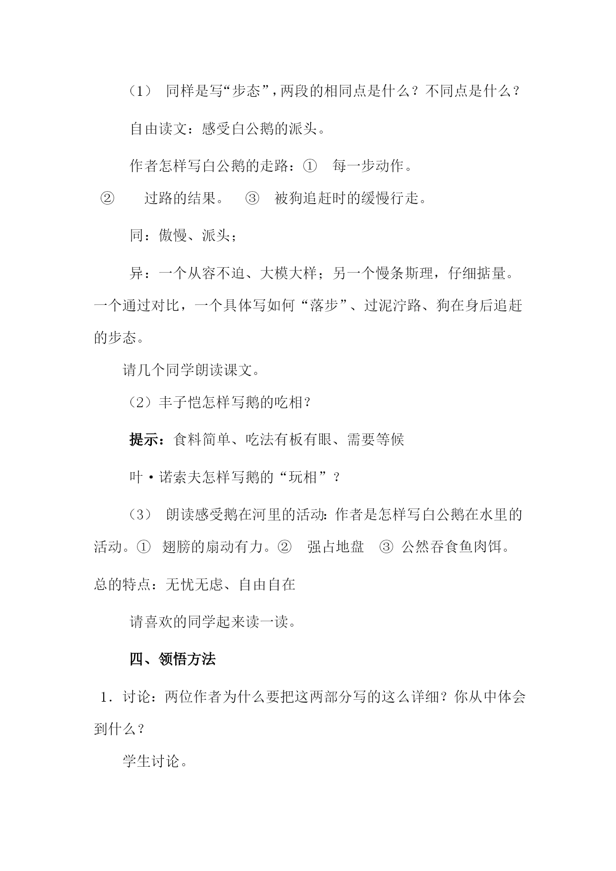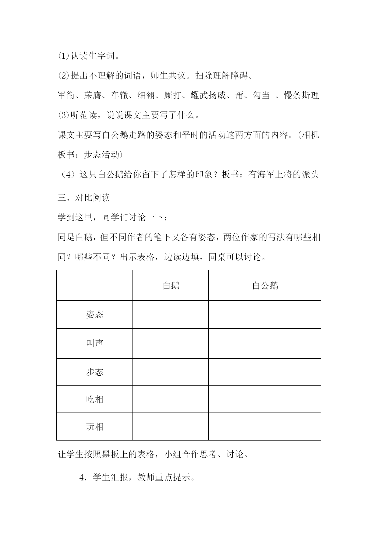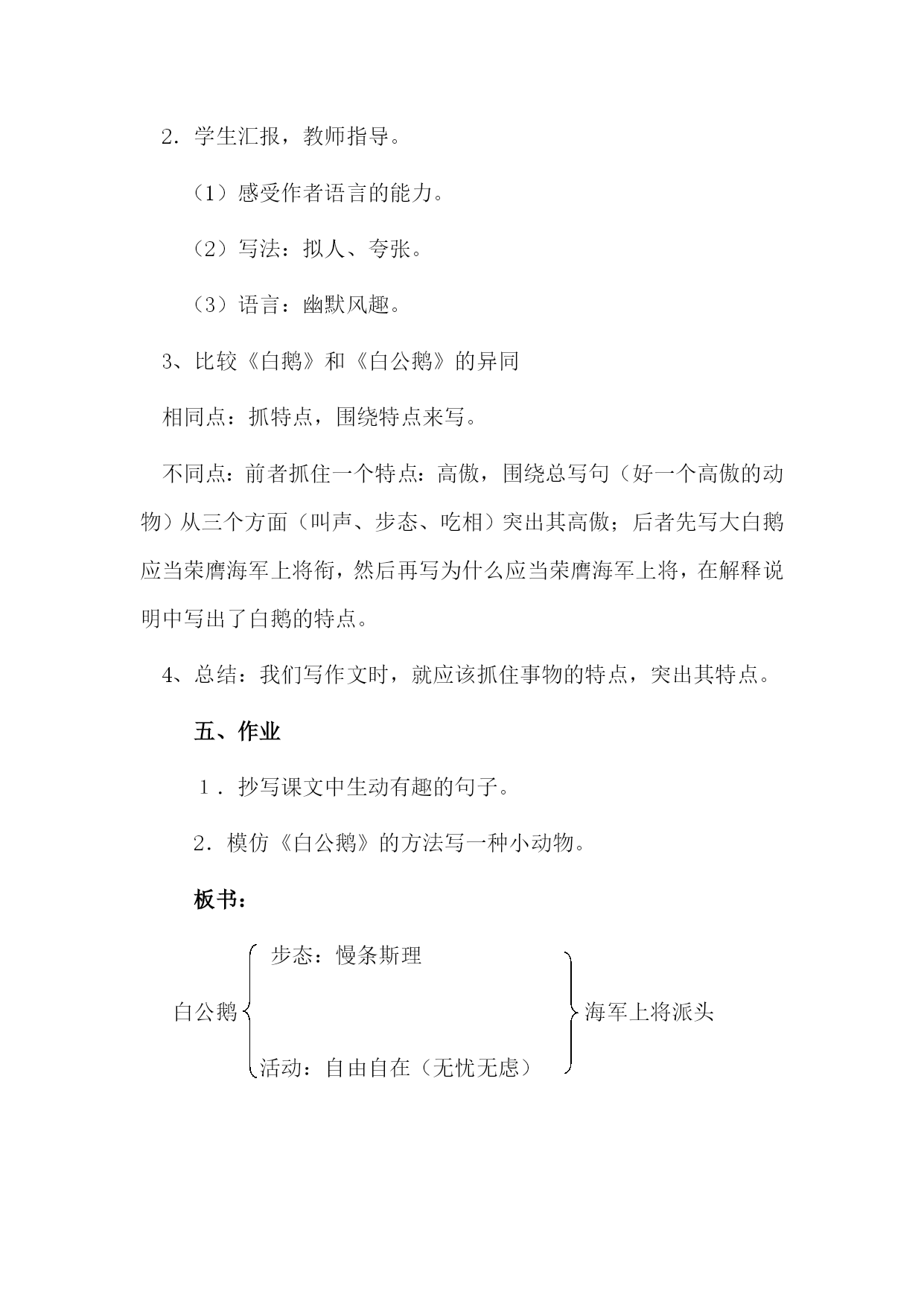 四年级上册《白公鹅》教学设计HYPERLINK"http://www.5ykj.com/Health/"\t"_blank"教学目标1、学生能以一定的速度进行默读,能够体会这只白鹅的特点。2、比较《白鹅》和《白公鹅》在表达上的异同之处,体会作者的语言特点。3、体会作者对白鹅的具体描写,唤起学生对动物的喜爱之情。教学重难点:通过作者的具体描写初步体会作者表达方式的不同。教学准备:课件字典词典作者资料教学课时:一课时。一、导入1.师:上节课我们认识了著名作家丰子恺笔下的白鹅,谁来说说它给你留下了什么样的印象?指名学生回答。2.这节课我们再来认识一只白鹅,它是俄国作家叶诺索夫写的白公鹅。交流作者资料板书:白公鹅二、初读感知1.学生自读课文。自读提示:边读边动笔,画出要求认读的字,借助课文中的拼音读准字音,标出不懂的词语,利用工具书(字典、词典)查出字、词的意思,把课文读通;初步了解课文的主要内容。2.交流初读情况:(1)认读生字词。(2)提出不理解的词语,师生共议。扫除理解障碍。军衔、荣膺、车辙、细翎、厮打、耀武扬威、甭、勾当、慢条斯理(3)听范读,说说课文主要写了什么。课文主要写白公鹅走路的姿态和平时的活动这两方面的内容。(相机板书:步态活动)(4)这只白公鹅给你留下了怎样的印象?板书:有海军上将的派头三、对比阅读学到这里,同学们讨论一下:同是白鹅,但不同作者的笔下又各有姿态,两位作家的写法有哪些相同?哪些不同?出示表格,边读边填,同桌可以讨论。白鹅白公鹅姿态叫声步态吃相玩相让学生按照黑板上的表格,小组合作思考、讨论。4.学生汇报,教师重点提示。(1)同样是写“步态”,两段的相同点是什么?不同点是什么?自由读文:感受白公鹅的派头。作者怎样写白公鹅的走路:①每一步动作。②过路的结果。③被狗追赶时的缓慢行走。同:傲慢、派头;异:一个从容不迫、大模大样;另一个慢条斯理,仔细掂量。一个通过对比,一个具体写如何“落步”、过泥泞路、狗在身后追赶的步态。请几个同学朗读课文。(2)丰子恺怎样写鹅的吃相?提示:食料简单、吃法有板有眼、需要等候叶·诺索夫怎样写鹅的“玩相”?(3)朗读感受鹅在河里的活动:作者是怎样写白公鹅在水里的活动。①翅膀的扇动有力。②强占地盘③公然吞食鱼肉饵。总的特点:无忧无虑、自由自在请喜欢的同学起来读一读。四、领悟方法1.讨论:两位作者为什么要把这两部分写的这么详细?你从中体会到什么?学生讨论。2.学生汇报,教师指导。(1)感受作者语言的能力。(2)写法:拟人、夸张。(3)语言:幽默风趣。3、比较《白鹅》和《白公鹅》的异同相同点:抓特点,围绕特点来写。不同点:前者抓住一个特点:高傲,围绕总写句(好一个高傲的动物)从三个方面(叫声、步态、吃相)突出其高傲;后者先写大白鹅应当荣膺海军上将衔,然后再写为什么应当荣膺海军上将,在解释说明中写出了白鹅的特点。4、总结:我们写作文时,就应该抓住事物的特点,突出其特点。五、作业1.抄写课文中生动有趣的句子。2.模仿《白公鹅》的方法写一种小动物。板书:步态:慢条斯理白公鹅海军上将派头活动:自由自在(无忧无虑)
