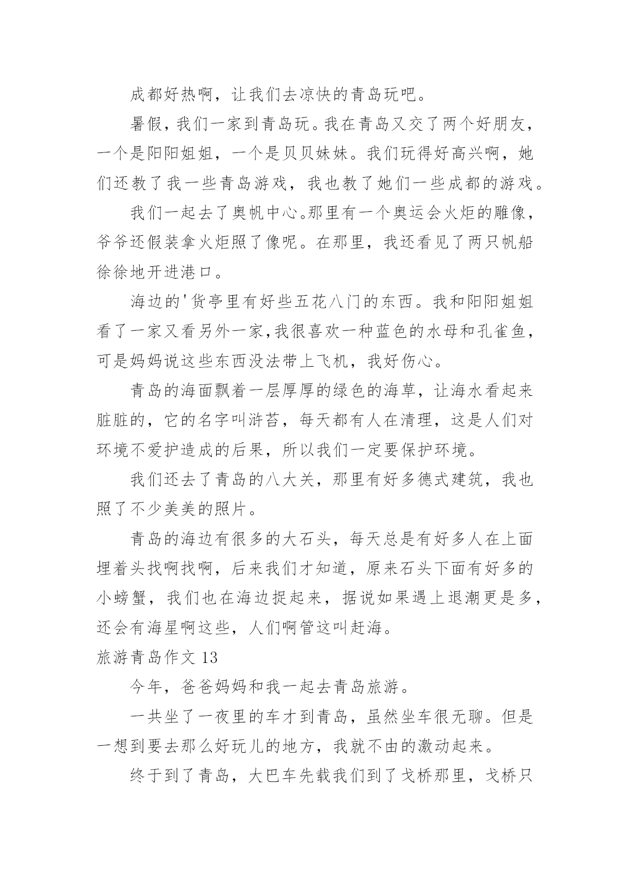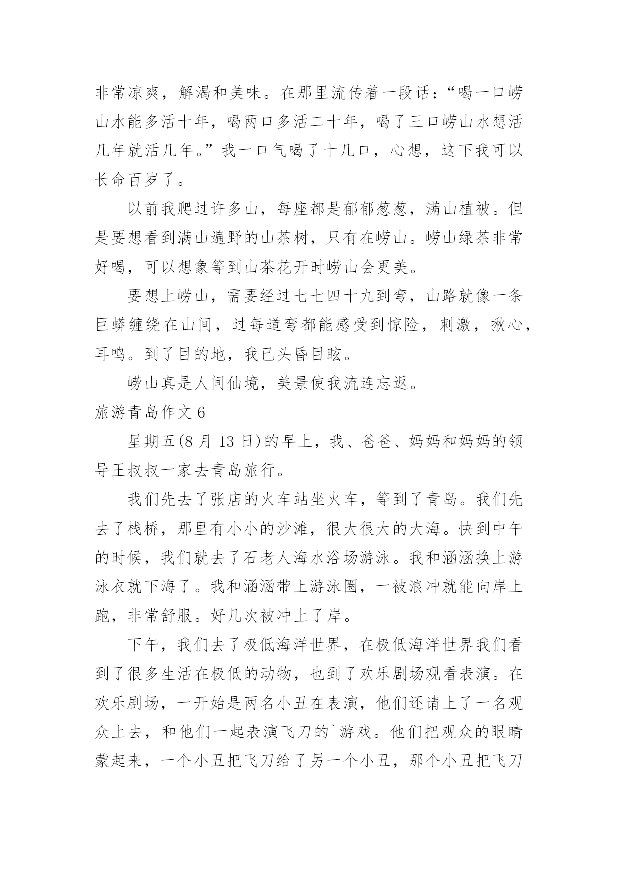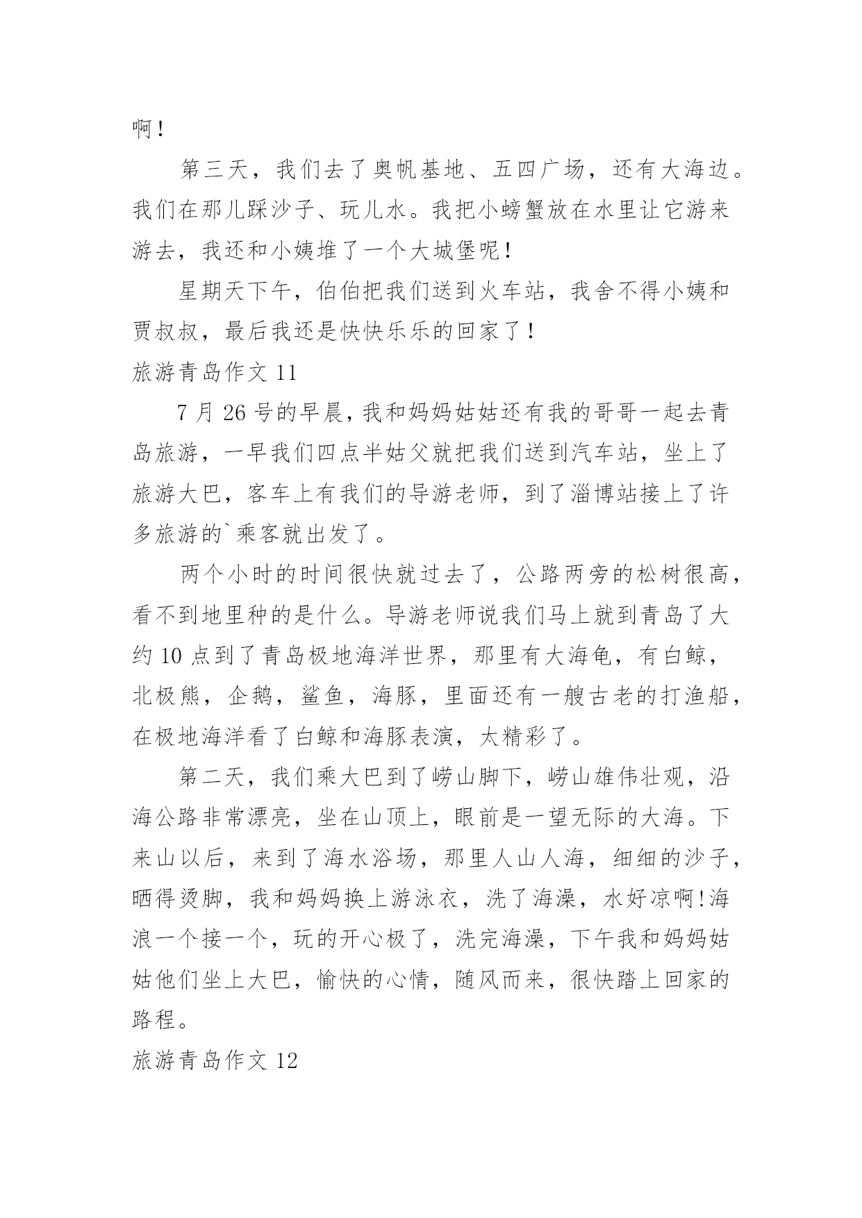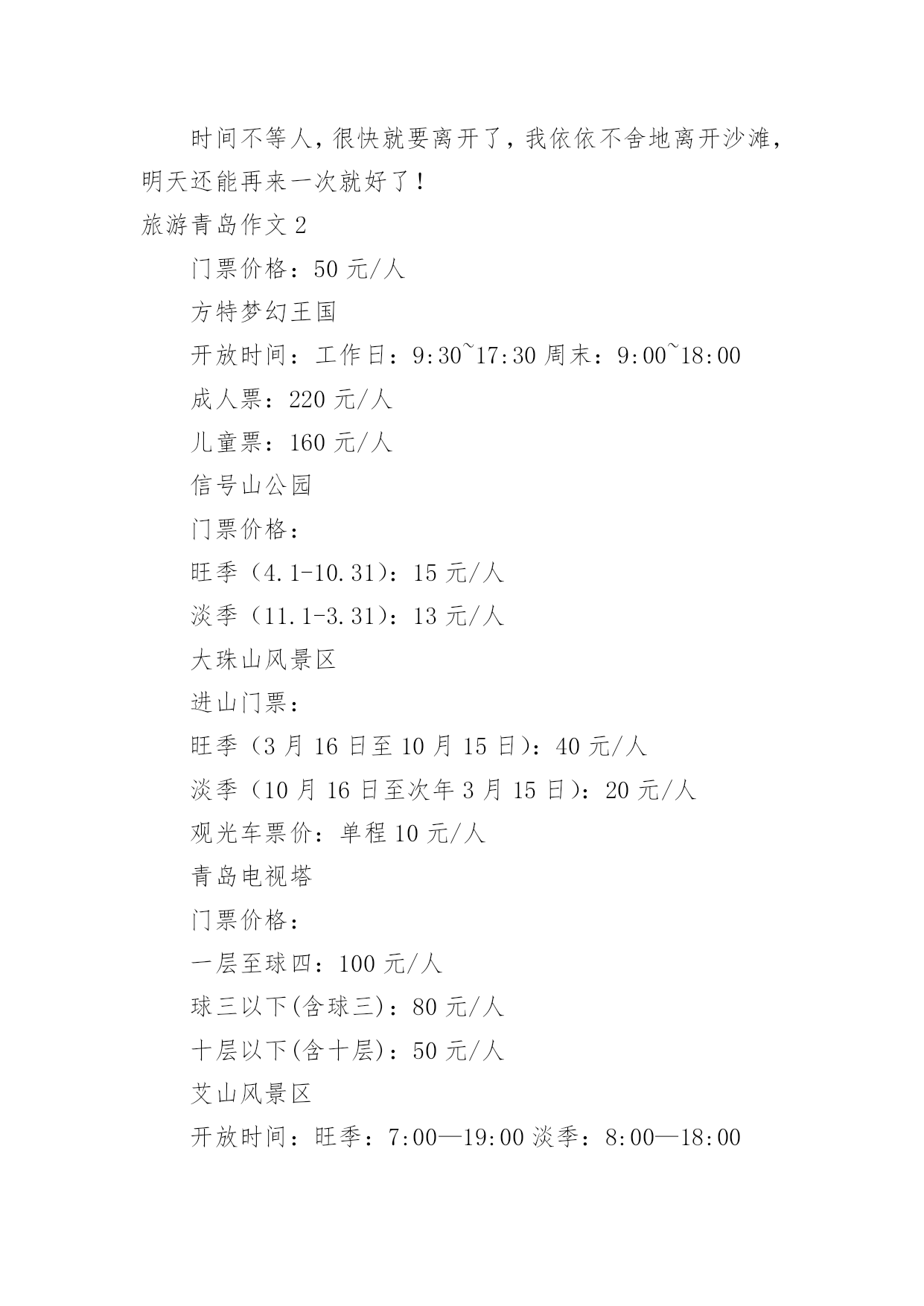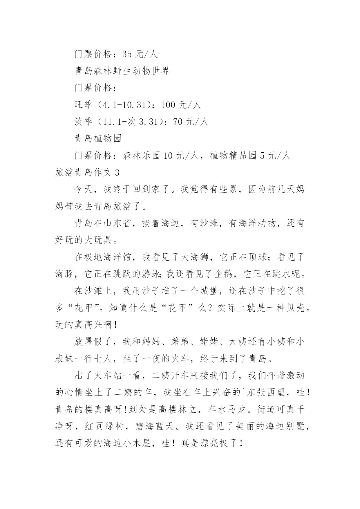 旅游青岛作文旅游青岛作文【汇总15篇】在平日的学习、工作和生活里,大家都尝试过写作文吧,作文一定要做到主题集中,围绕同一主题作深入阐述,切忌东拉西扯,主题涣散甚至无主题。如何写一篇有思想、有文采的作文呢?下面是小编整理的旅游青岛作文,仅供参考,希望能够帮助到大家。旅游青岛作文1让人激动的一天来到了,我和母亲背着包踏上青岛之途。在车上七个小时婉如七天,终于到美丽的青岛。听到浪花击打在石头上发出的.如铜彀般的声音,我非常的兴奋,不由得想让自己奔向大海,去踏浪,去吹吹海风。我到了饭店,吃好饭,打起精神向着第一站“金沙滩”出发。“金沙滩”是青岛最闻名的海水浴场,号称“亚州第一滩”,来到这里,我换上泳装冲向海边。“哇,爽,凉,冰!”我呼喊着,扑到海水里,像只鸭子一样,在海里畅游。为了珍惜第一次下海,所以要泡个够。听说海水很咸,我不由自主尝了尝,难喝,如盐水一样。我套上泳圈,在沙滩下奔跑着,踩出一个个脚印。我感觉到大海像骄傲的狮子不愿意让我踩在他金色的毛发上,一会儿,毛发便缓合了。我向着大海深处游着,突然,一阵海浪“飞”过来,我吓得双脚一滑,正好让浪花撒在身上,喝了好多海水,自作自受哪!时间不等人,很快就要离开了,我依依不舍地离开沙滩,明天还能再来一次就好了!旅游青岛作文2门票价格:50元/人方特梦幻王国开放时间:工作日:9:30~17:30周末:9:00~18:00成人票:220元/人儿童票:160元/人信号山公园门票价格:旺季(4.1-10.31):15元/人淡季(11.1-3.31):13元/人大珠山风景区进山门票:旺季(3月16日至10月15日):40元/人淡季(10月16日至次年3月15日):20元/人观光车票价:单程10元/人青岛电视塔门票价格:一层至球四:100元/人球三以下(含球三):80元/人十层以下(含十层):50元/人艾山风景区开放时间:旺季:7:00—19:00淡季:8:00—18:00门票价格:35元/人青岛森林野生动物世界门票价格:旺季(4.1-10.31):100元/人淡季(11.1-次3.31):70元/人青岛植物园门票价格:森林乐园10元/人,植物精品园5元/人旅游青岛作文3今天,我终于回到家了。我觉得有些累,因为前几天妈妈带我去青岛旅游了。青岛在山东省,挨着海边,有沙滩,有海洋动物,还有好玩的大玩具。在极地海洋馆,我看见了大海狮,它正在顶球;看见了海豚,它正在跳跃的游泳;我还看见了企鹅,它正在跳水呢。在沙滩上,我用沙子堆了一个城堡,还在沙子中挖了很多“花甲”。知道什么是“花甲”么?实际上就是一种贝壳。玩的真高兴啊!放暑假了,我和妈妈、弟弟、姥姥、大姨还有小姨和小表妹一行七人,坐了一夜的火车,终于来到了青岛。出了火车站一看,二姨开车来接我们了,我们怀着激动的心情坐上了二姨的车,我坐在车上兴奋的`东张西望,哇!青岛的楼真高呀!到处是高楼林立,车水马龙。街道可真干净呀,红瓦绿树,碧海蓝天。我还看见了美丽的海边别墅,还有可爱的海边小木屋,哇!真是漂亮极了!旅游青岛作文4我和爸爸准备去青岛旅游。我们买好了机票,坐上了飞机,很快,过了约2小时就到了目的地青岛。我们下了飞机,找了一个宾馆住了一夜。第二天,我们联系好一个司机,他带我们去爬崂山。去崂山的路上,他给我们讲讲这个,讲讲那个,很快就到了崂山。司机叔叔把我们拉到了崂山入口,我们慢慢的往上爬。途中,看到了许多美景,也看到了远处的大海,也看到了上下山的索道。当时我在底下喊:“下来吧,哥们,我接着你。”所有人都哈哈大笑,爸爸也笑着说:“他是不会下来的.。”乐了一会后,我们又继续往上爬。过了两个多小时我们终于爬到了山顶,站在山顶上极目远望,远处的美景尽收眼底,啊,那感觉真好!休息了一会,我们就下山了。下山的途中,经过一排房子的时候,两只猎狗就在路边汪汪的大叫,声音很吓人,我们都以为有一群猎狗,不敢过。最后没办法,我们只好东翻西找,找到了一根铁棍和一张破椅子,我们拿着、防范着慢慢的走过去。还好,狗没有咬我们,不过我们人人都吓出了一身冷汗,终于我们有惊无险地下了山。旅游青岛作文5我喜欢游泳,不喜欢爬山。因为我觉得高山除了陡峭的台阶,没有什么吸引我的地方。可是当我来到崂山,我发现它截然不同,我用“甜,绿,弯”三字表达了崂山的独特,我深深的.陶醉在崂山的美景中。崂山的水不是放了糖的甜,而是纯天然的甘甜,喝上去非常凉爽,解渴和美味。在那里流传着一段话:“喝一口崂山水能多活十年,喝两口多活二十年,喝了三口崂山水想活几年就活几年。”我一口气喝了十几口,心想,这下我可以长命百岁了。以前我爬过许多山,每座都是郁郁葱葱,满山植被。但是要想看到满山遍野的山茶树,只有在崂山。崂山绿茶非常好喝,可以想象等到山茶花开时崂山会更美。要想上崂山,需要经过七七四十九到弯,山路就像一条巨蟒缠绕在山间,