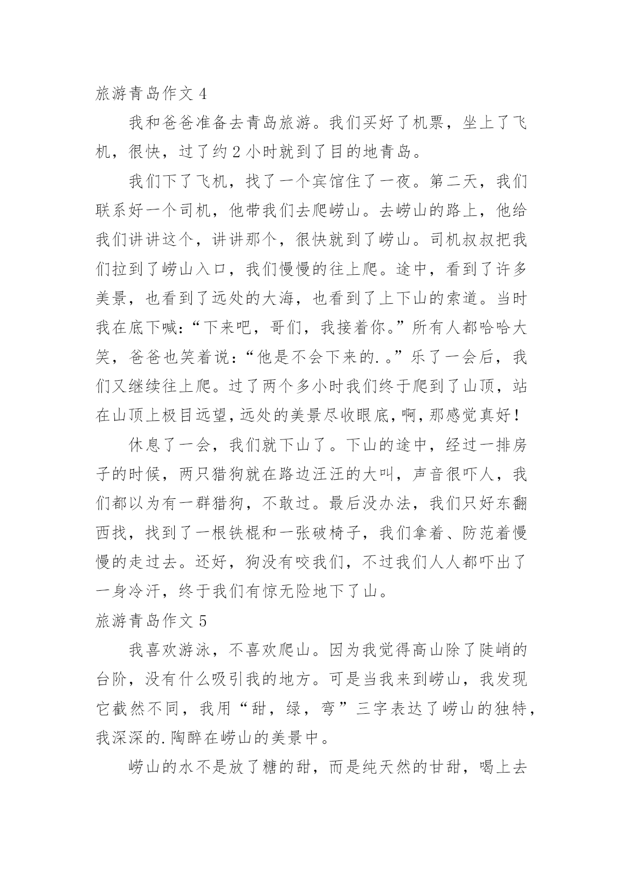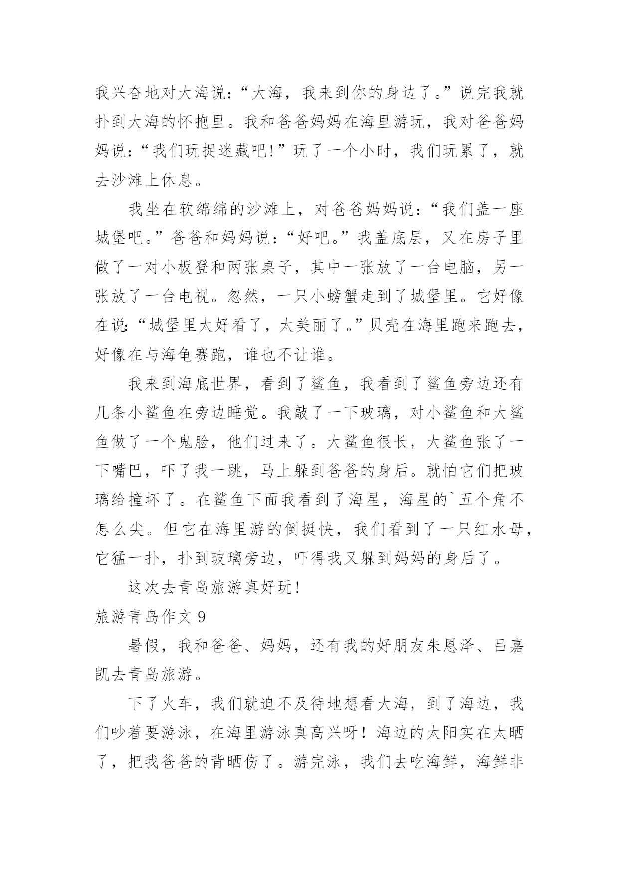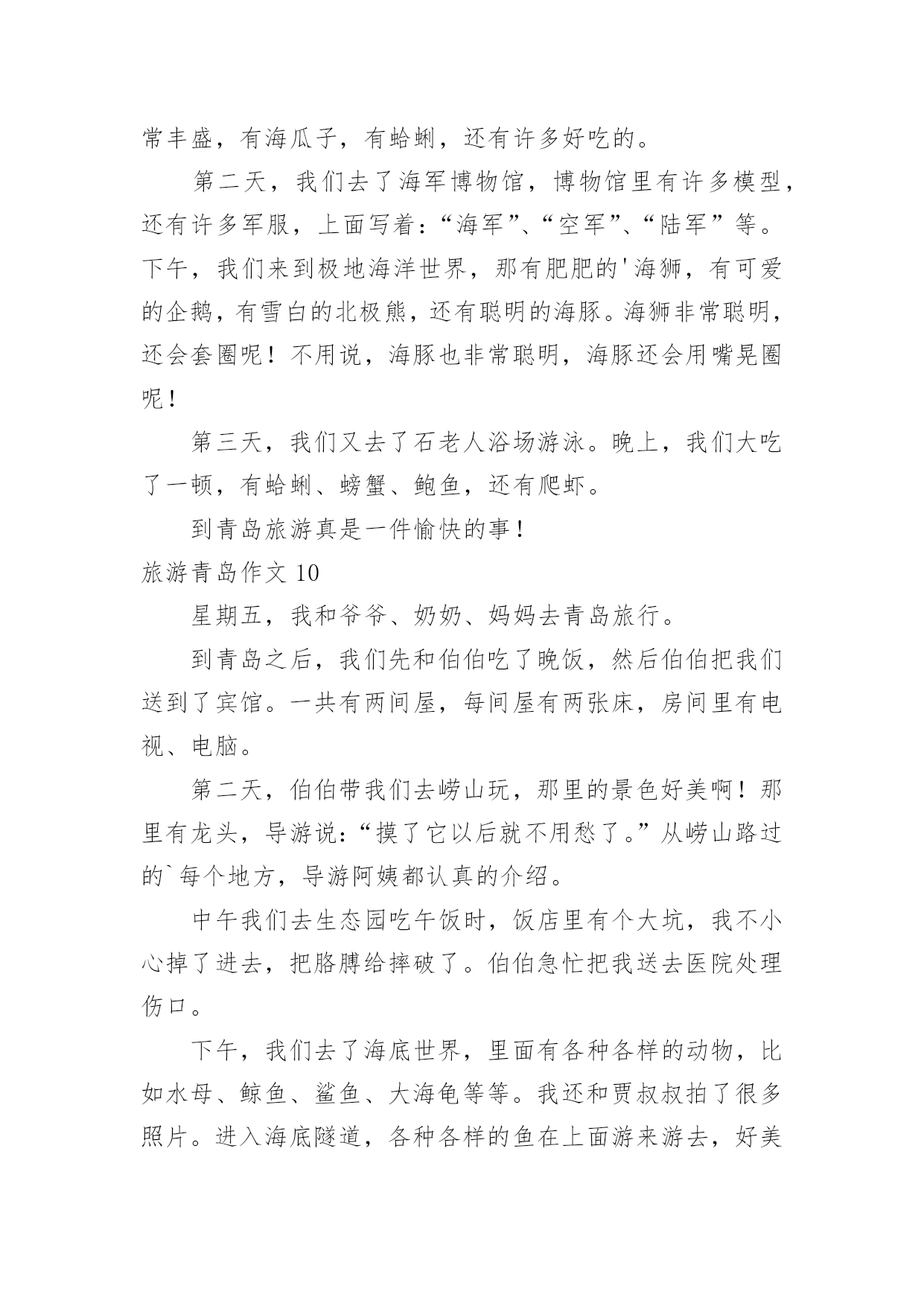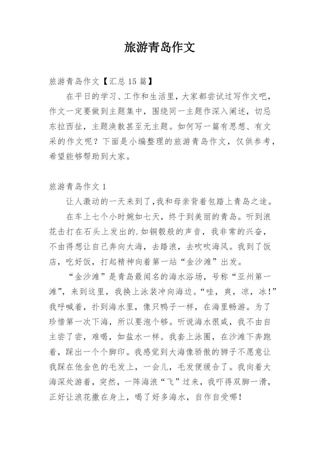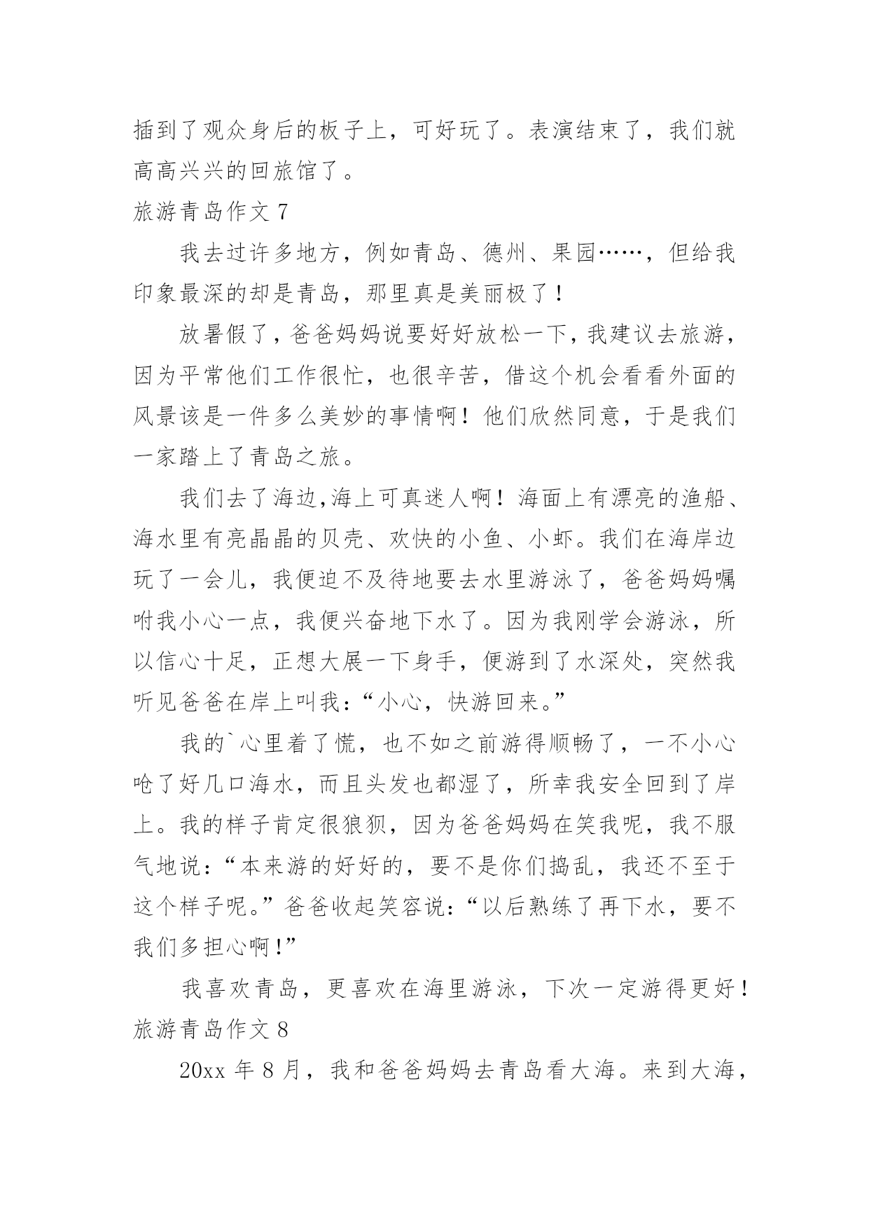 旅游青岛作文旅游青岛作文【汇总15篇】在平日的学习、工作和生活里,大家都尝试过写作文吧,作文一定要做到主题集中,围绕同一主题作深入阐述,切忌东拉西扯,主题涣散甚至无主题。如何写一篇有思想、有文采的作文呢?下面是小编整理的旅游青岛作文,仅供参考,希望能够帮助到大家。旅游青岛作文1让人激动的一天来到了,我和母亲背着包踏上青岛之途。在车上七个小时婉如七天,终于到美丽的青岛。听到浪花击打在石头上发出的.如铜彀般的声音,我非常的兴奋,不由得想让自己奔向大海,去踏浪,去吹吹海风。我到了饭店,吃好饭,打起精神向着第一站“金沙滩”出发。“金沙滩”是青岛最闻名的海水浴场,号称“亚州第一滩”,来到这里,我换上泳装冲向海边。“哇,爽,凉,冰!”我呼喊着,扑到海水里,像只鸭子一样,在海里畅游。为了珍惜第一次下海,所以要泡个够。听说海水很咸,我不由自主尝了尝,难喝,如盐水一样。我套上泳圈,在沙滩下奔跑着,踩出一个个脚印。我感觉到大海像骄傲的狮子不愿意让我踩在他金色的毛发上,一会儿,毛发便缓合了。我向着大海深处游着,突然,一阵海浪“飞”过来,我吓得双脚一滑,正好让浪花撒在身上,喝了好多海水,自作自受哪!时间不等人,很快就要离开了,我依依不舍地离开沙滩,明天还能再来一次就好了!旅游青岛作文2门票价格:50元/人方特梦幻王国开放时间:工作日:9:30~17:30周末:9:00~18:00成人票:220元/人儿童票:160元/人信号山公园门票价格:旺季(4.1-10.31):15元/人淡季(11.1-3.31):13元/人大珠山风景区进山门票:旺季(3月16日至10月15日):40元/人淡季(10月16日至次年3月15日):20元/人观光车票价:单程10元/人青岛电视塔门票价格:一层至球四:100元/人球三以下(含球三):80元/人十层以下(含十层):50元/人艾山风景区开放时间:旺季:7:00—19:00淡季:8:00—18:00门票价格:35元/人青岛森林野生动物世界门票价格:旺季(4.1-10.31):100元/人淡季(11.1-次3.31):70元/人青岛植物园门票价格:森林乐园10元/人,植物精品园5元/人旅游青岛作文3今天,我终于回到家了。我觉得有些累,因为前几天妈妈带我去青岛旅游了。青岛在山东省,挨着海边,有沙滩,有海洋动物,还有好玩的大玩具。在极地海洋馆,我看见了大海狮,它正在顶球;看见了海豚,它正在跳跃的游泳;我还看见了企鹅,它正在跳水呢。在沙滩上,我用沙子堆了一个城堡,还在沙子中挖了很多“花甲”。知道什么是“花甲”么?实际上就是一种贝壳。玩的真高兴啊!放暑假了,我和妈妈、弟弟、姥姥、大姨还有小姨和小表妹一行七人,坐了一夜的火车,终于来到了青岛。出了火车站一看,二姨开车来接我们了,我们怀着激动的心情坐上了二姨的车,我坐在车上兴奋的`东张西望,哇!青岛的楼真高呀!到处是高楼林立,车水马龙。街道可真干净呀,红瓦绿树,碧海蓝天。我还看见了美丽的海边别墅,还有可爱的海边小木屋,哇!真是漂亮极了!旅游青岛作文4我和爸爸准备去青岛旅游。我们买好了机票,坐上了飞机,很快,过了约2小时就到了目的地青岛。我们下了飞机,找了一个宾馆住了一夜。第二天,我们联系好一个司机,他带我们去爬崂山。去崂山的路上,他给我们讲讲这个,讲讲那个,很快就到了崂山。司机叔叔把我们拉到了崂山入口,我们慢慢的往上爬。途中,看到了许多美景,也看到了远处的大海,也看到了上下山的索道。当时我在底下喊:“下来吧,哥们,我接着你。”所有人都哈哈大笑,爸爸也笑着说:“他是不会下来的.。”乐了一会后,我们又继续往上爬。过了两个多小时我们终于爬到了山顶,站在山顶上极目远望,远处的美景尽收眼底,啊,那感觉真好!休息了一会,我们就下山了。下山的途中,经过一排房子的时候,两只猎狗就在路边汪汪的大叫,声音很吓人,我们都以为有一群猎狗,不敢过。最后没办法,我们只好东翻西找,找到了一根铁棍和一张破椅子,我们拿着、防范着慢慢的走过去。还好,狗没有咬我们,不过我们人人都吓出了一身冷汗,终于我们有惊无险地下了山。旅游青岛作文5我喜欢游泳,不喜欢爬山。因为我觉得高山除了陡峭的台阶,没有什么吸引我的地方。可是当我来到崂山,我发现它截然不同,我用“甜,绿,弯”三字表达了崂山的独特,我深深的.陶醉在崂山的美景中。崂山的水不是放了糖的甜,而是纯天然的甘甜,喝上去非常凉爽,解渴和美味。在那里流传着一段话:“喝一口崂山水能多活十年,喝两口多活二十年,喝了三口崂山水想活几年就活几年。”我一口气喝了十几口,心想,这下我可以长命百岁了。以前我爬过许多山,每座都是郁郁葱葱,满山植被。但是要想看到满山遍野的山茶树,只有在崂山。崂山绿茶非常好喝,可以想象等到山茶花开时崂山会更美。要想上崂山,需要经过七七四十九到弯,山路就像一条巨蟒缠绕在山间,